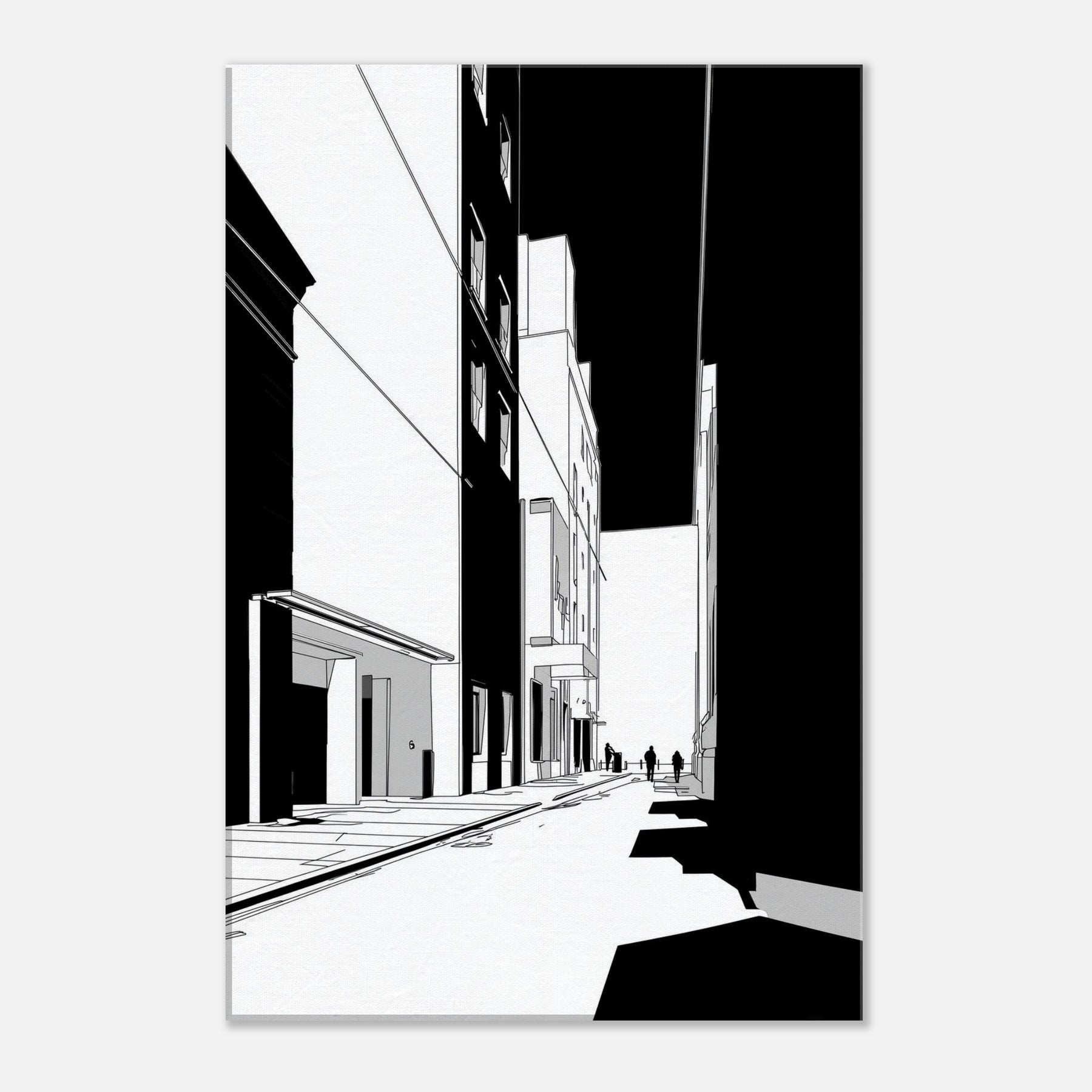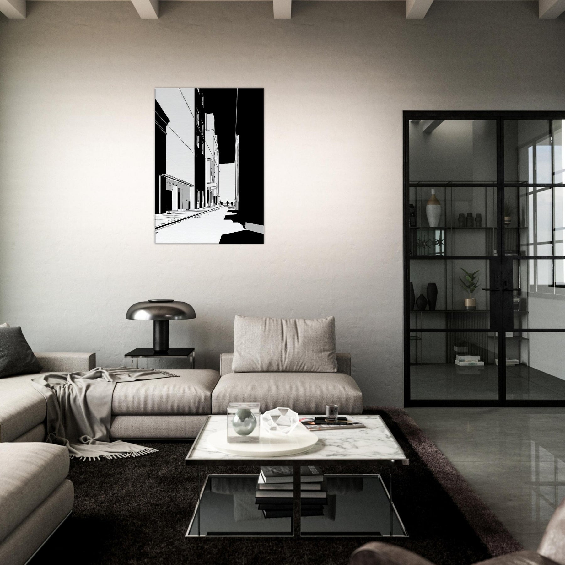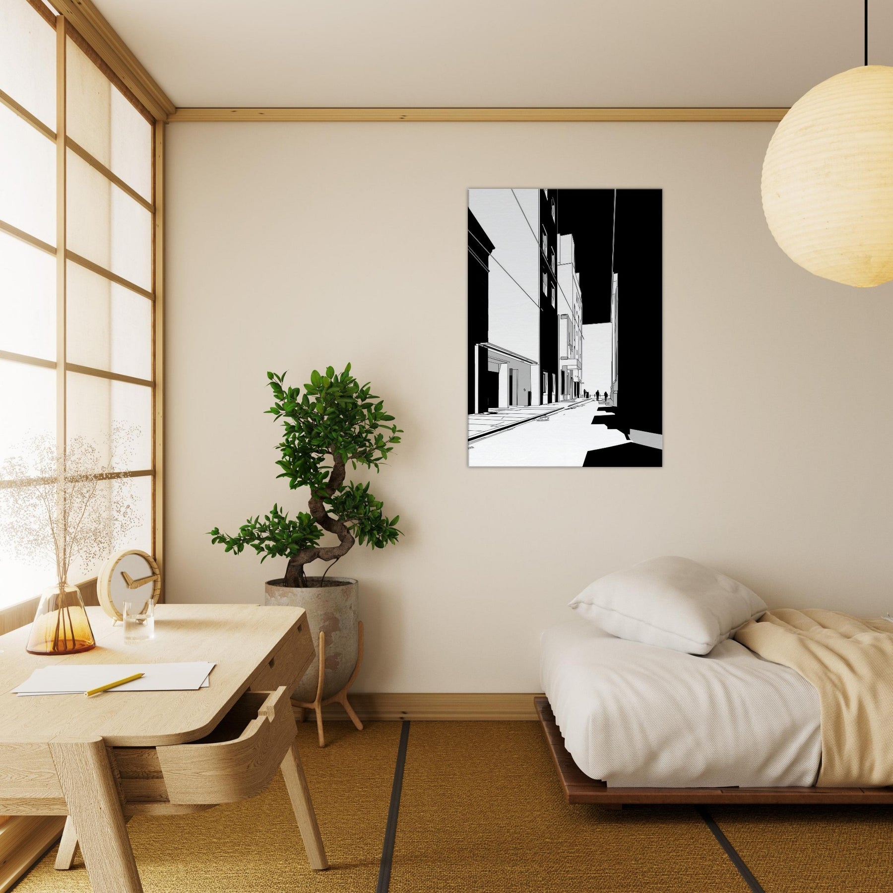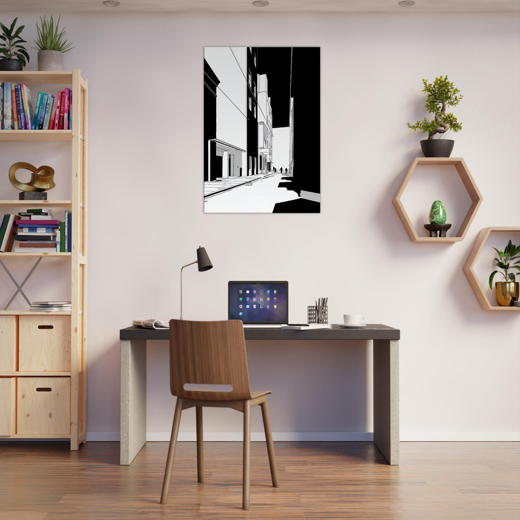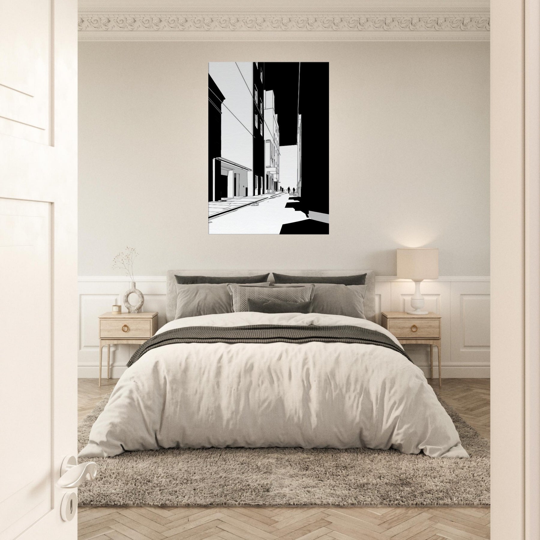 This striking Alley Perspective line drawing trims the city to its essential edges white avenues, ink dark shadows, and crisp architectural silhouettes. The bold contrasts and clean lines create a sense of quiet, spacious air that lengthens walls and invites slow, reflective moments. In a living room or hallway, the piece acts as a window to the city, coaxing light to dance along your furniture and turning everyday spaces into contemplative architectural poetry.