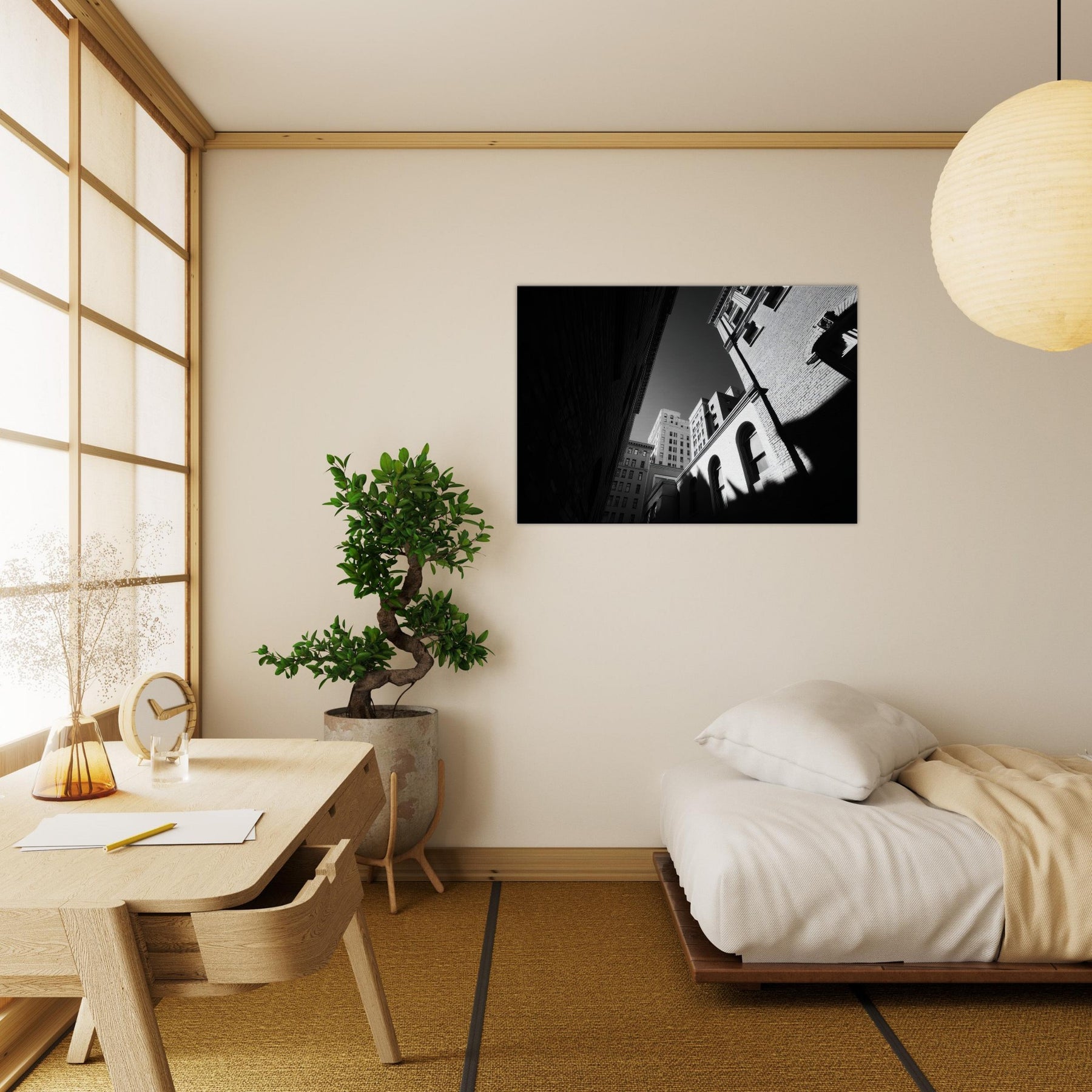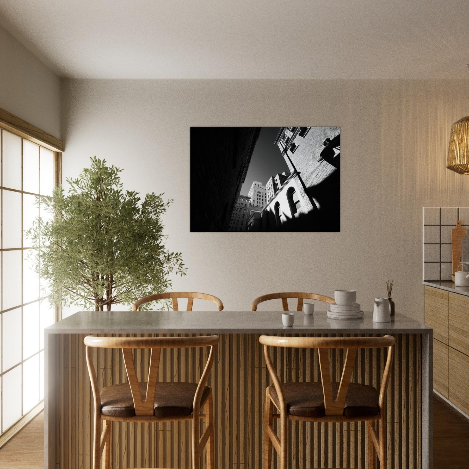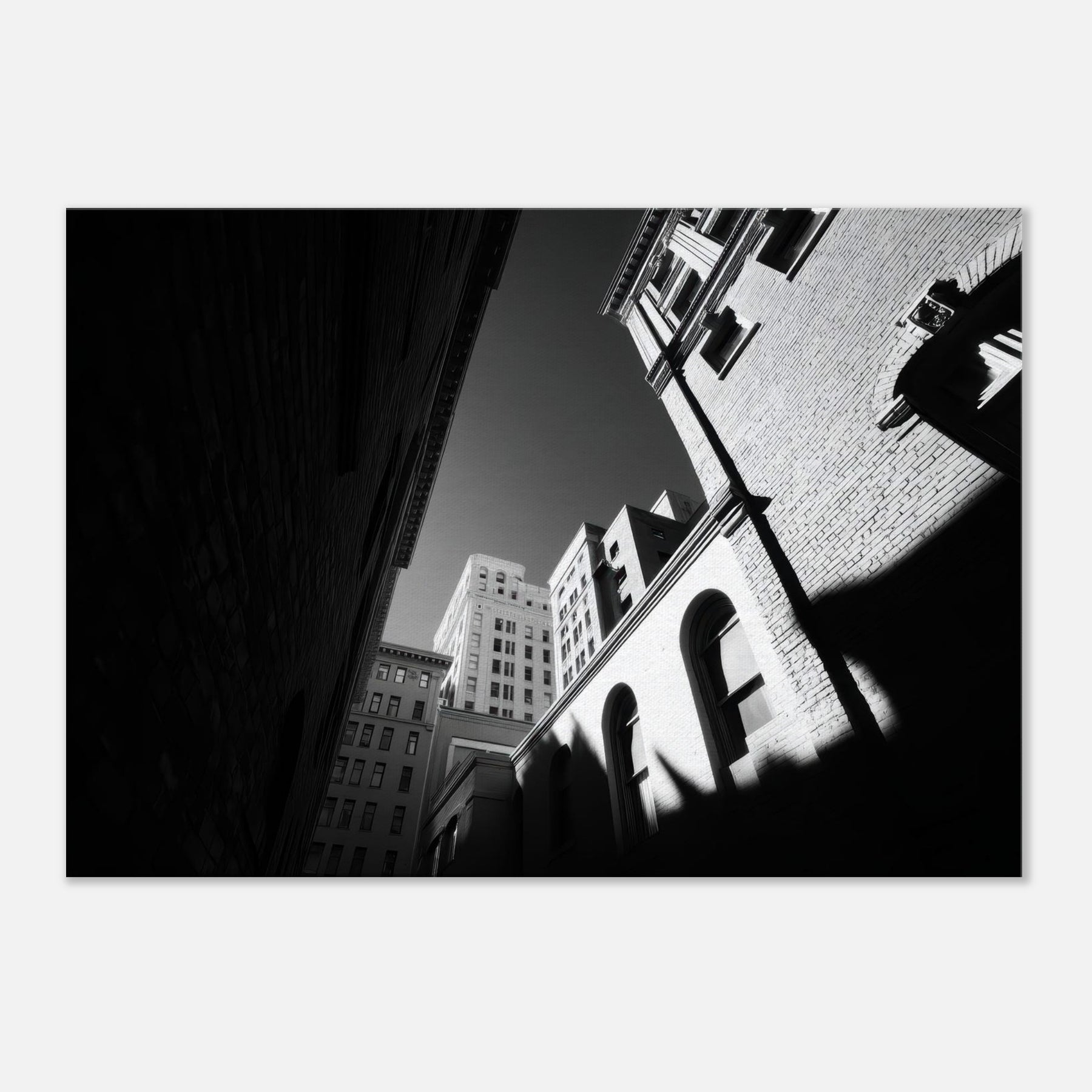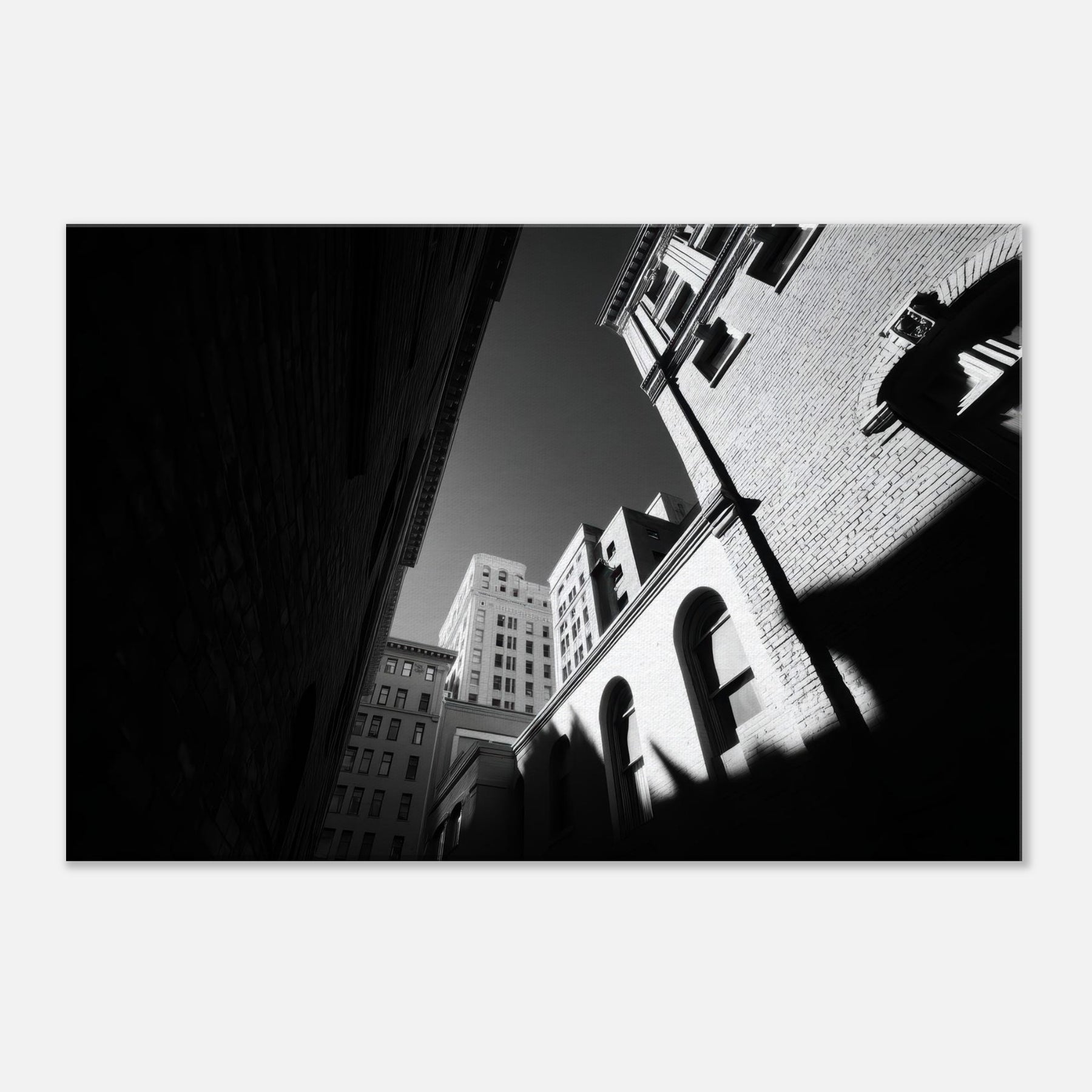 The photograph harnesses shadow and line to draw the eye from the narrow street toward a distant sky, inviting contemplation and a sense of spaciousness in a compact room. Its crisp contrast and restrained tones make a modern living space feel refined and thoughtful, turning everyday hallways or lounges into a gallery like moment of urban stillness.
