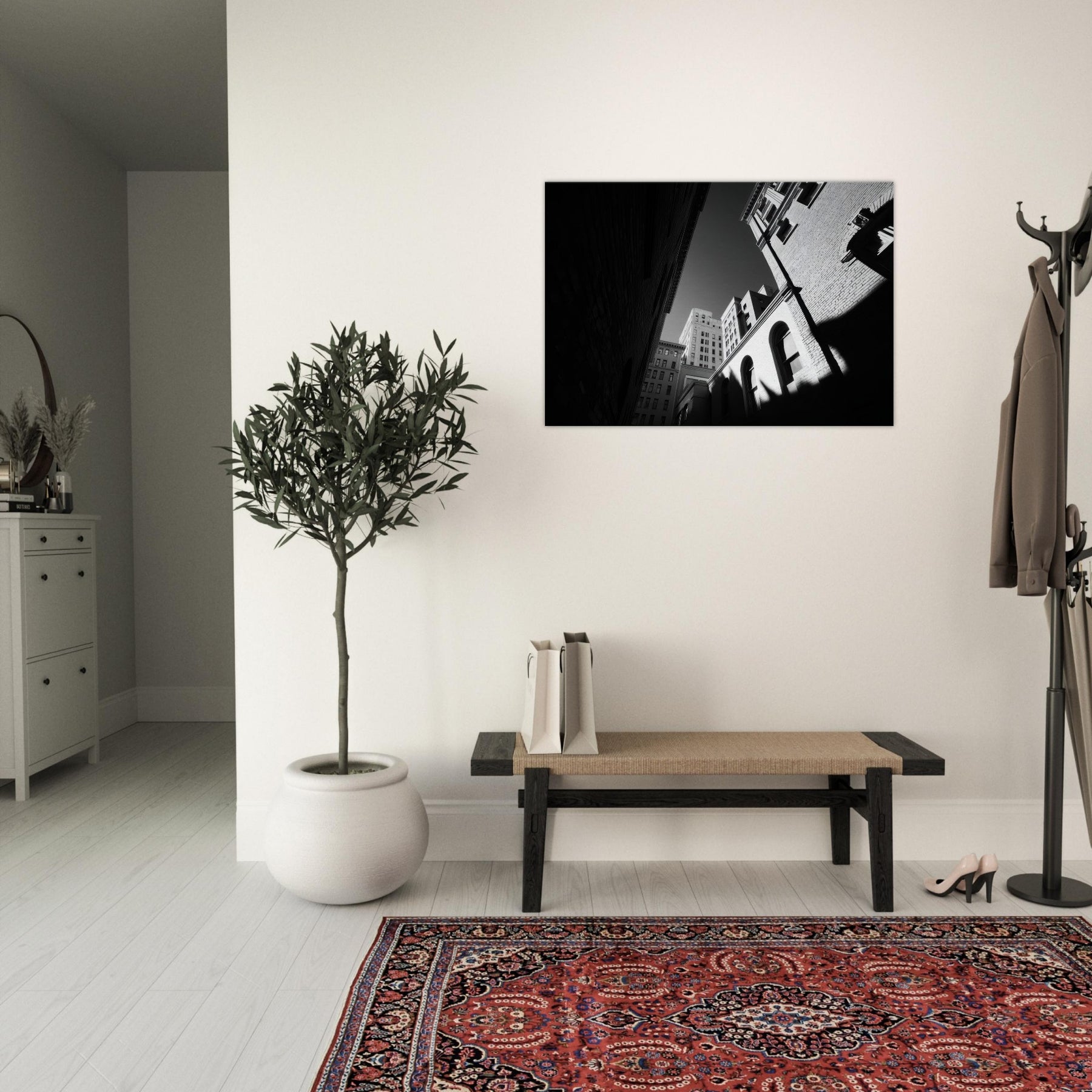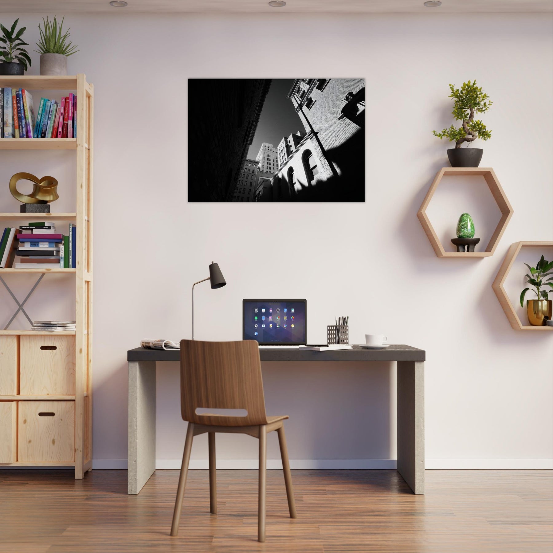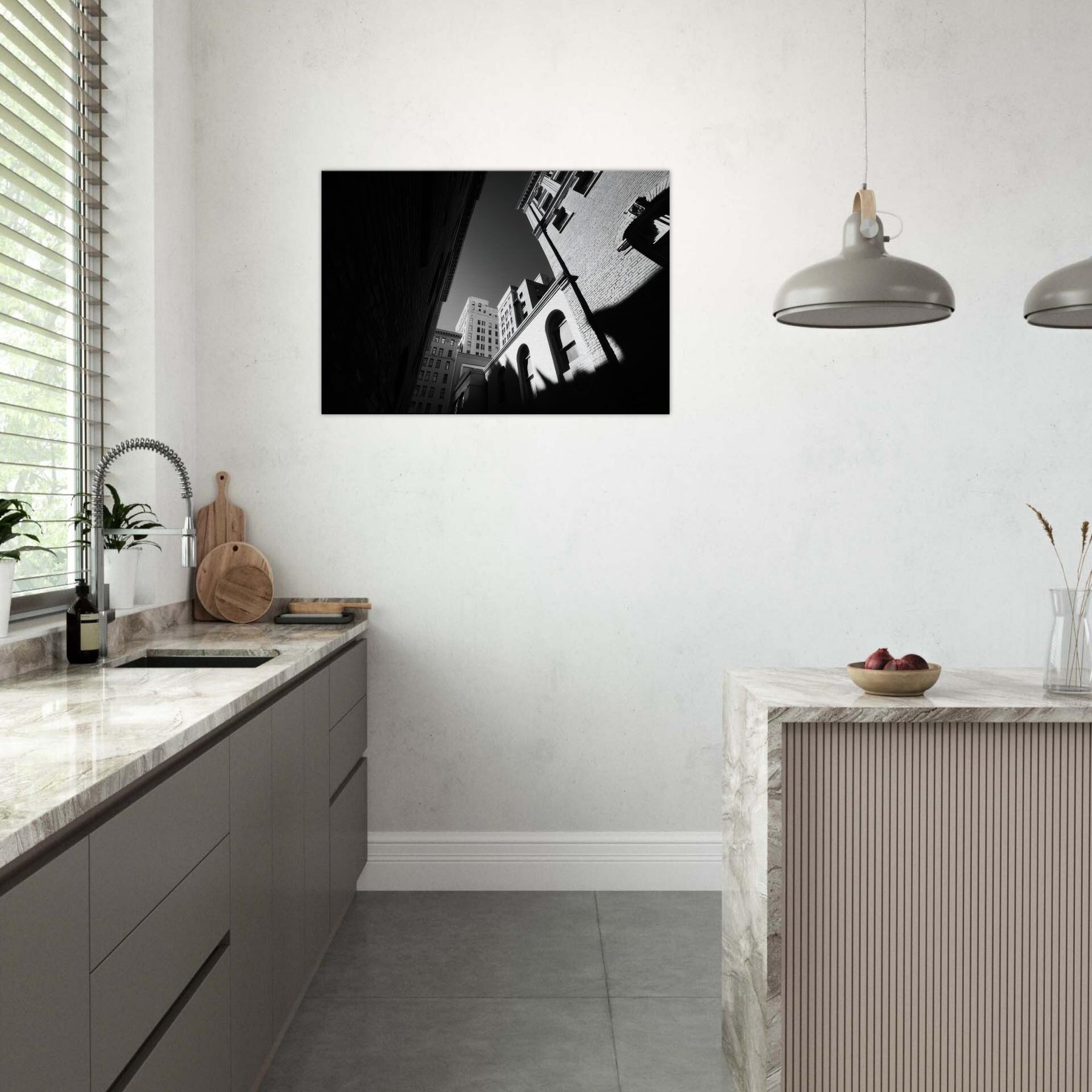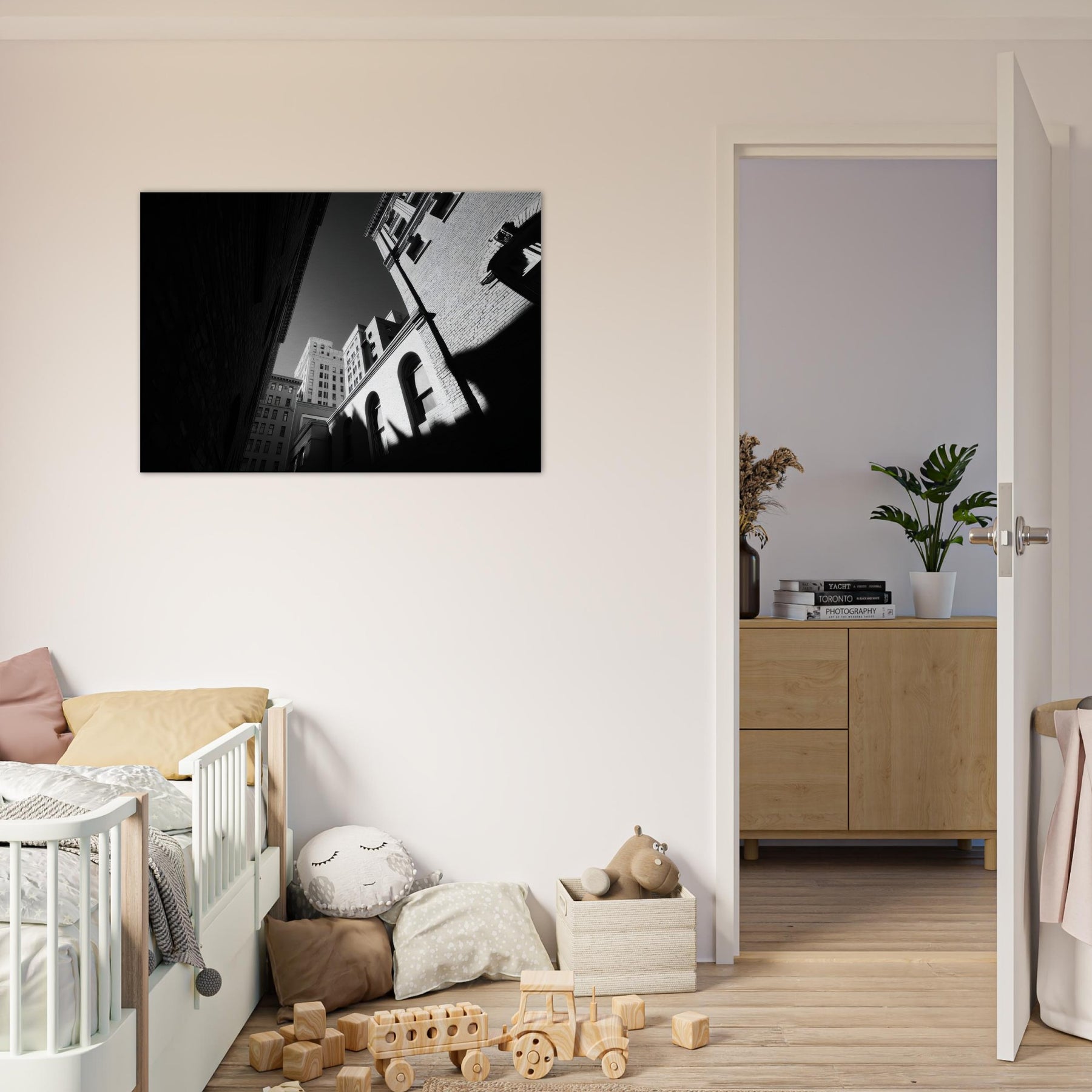 The photograph harnesses shadow and line to draw the eye from the narrow street toward a distant sky, inviting contemplation and a sense of spaciousness in a compact room. Its crisp contrast and restrained tones make a modern living space feel refined and thoughtful, turning everyday hallways or lounges into a gallery like moment of urban stillness.