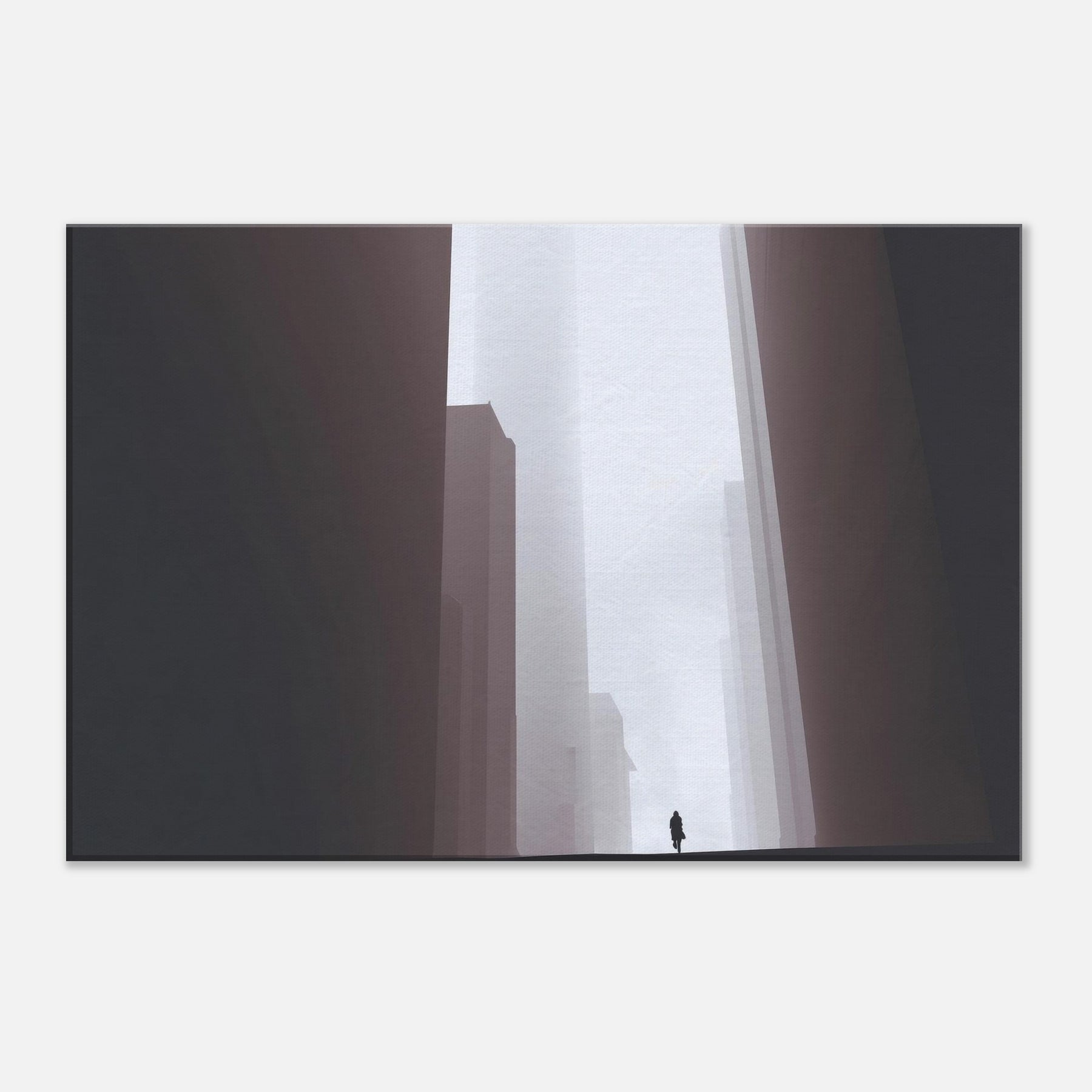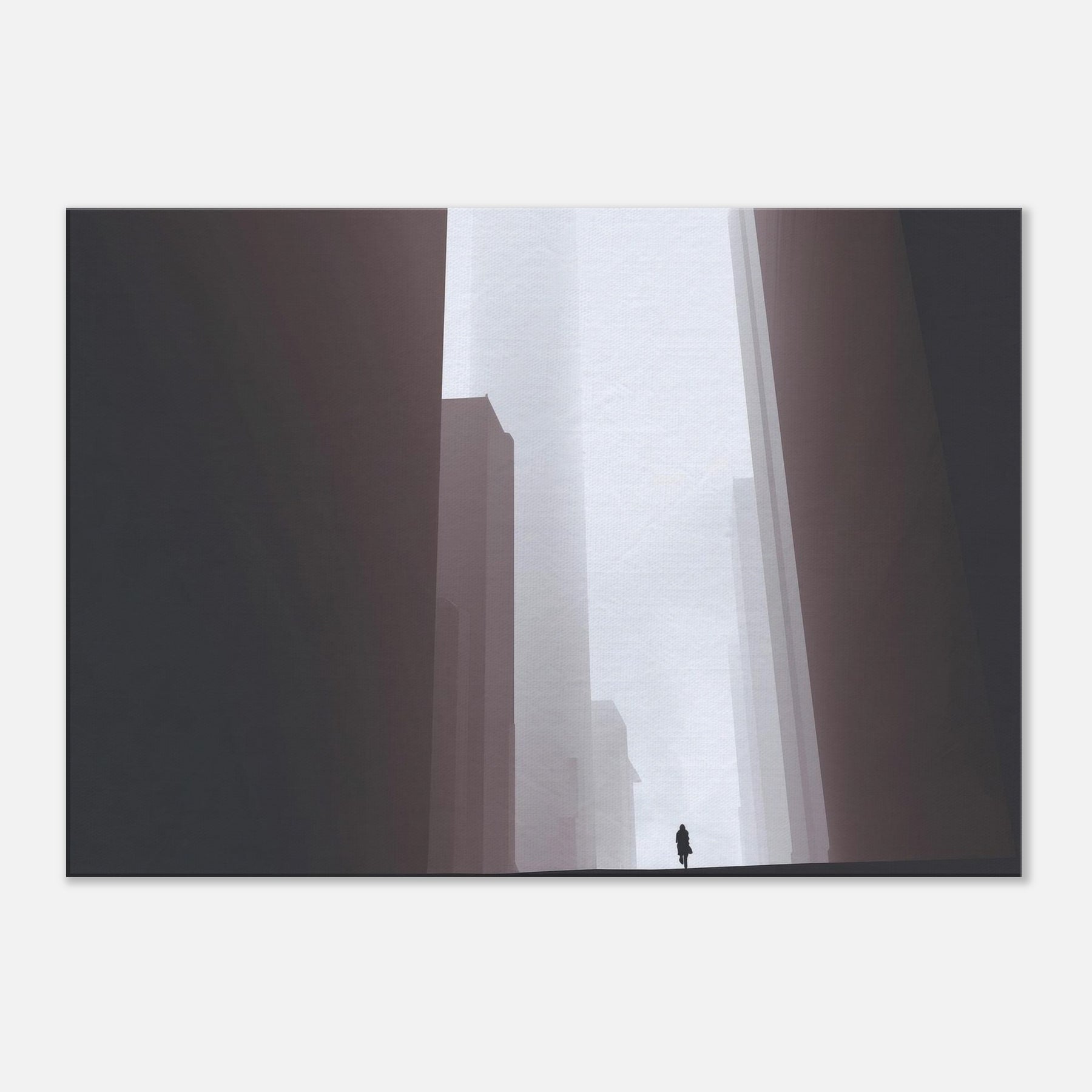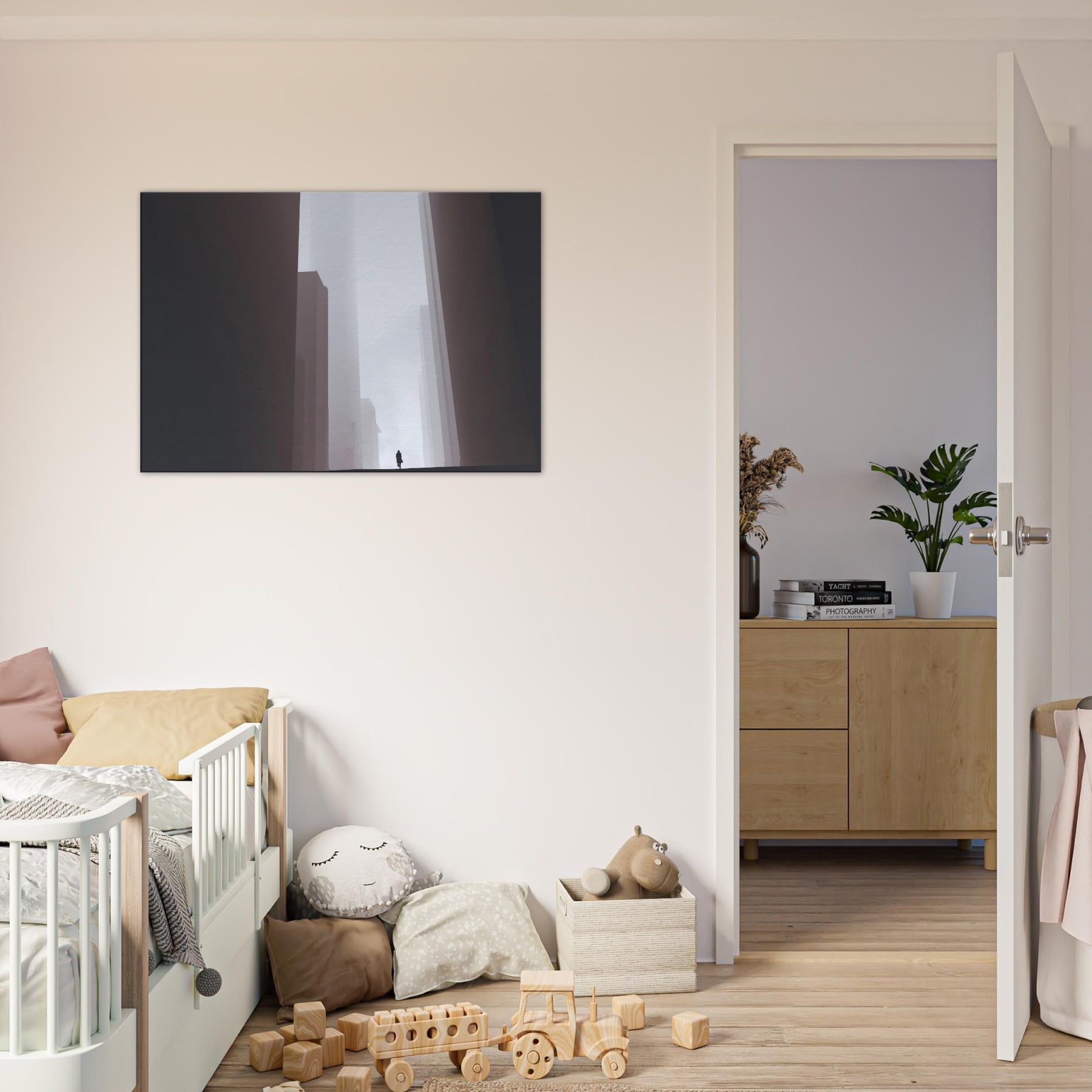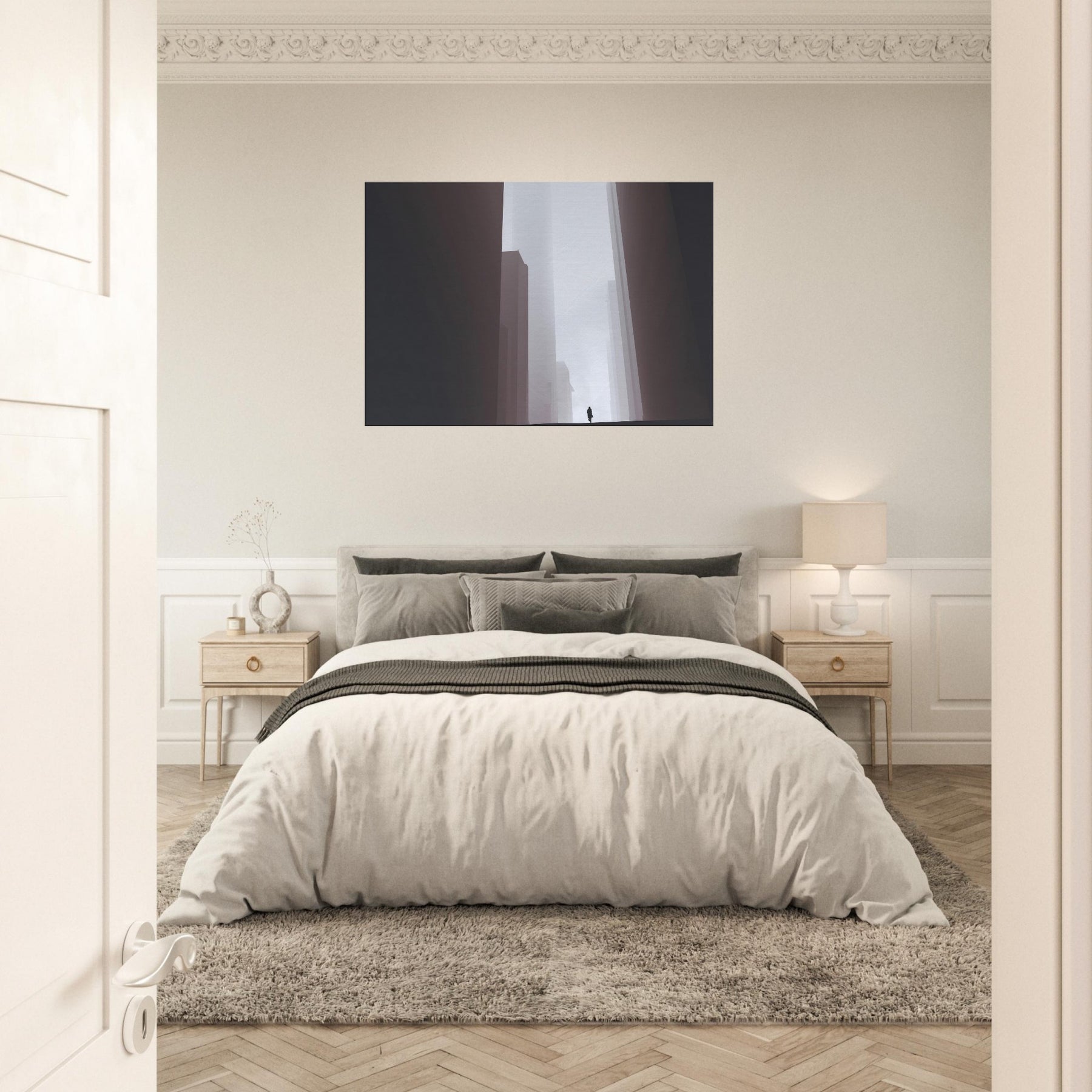 Alley Perspective invites the eye to drift through softened towers and pale light, where minimal forms become a quiet conversation between walls. The image hums with stillness: cool air, distant traffic, and a hush of dawn brushing the edges of concrete. Its generous negative space slows time, turning a hallway or living room into a contemplative courtyard of light. Printed in muted tones, it pairs gracefully with warm wood or cool metal, elevating modern spaces with urban serenity and a poetic distance that invites mindful reflection.