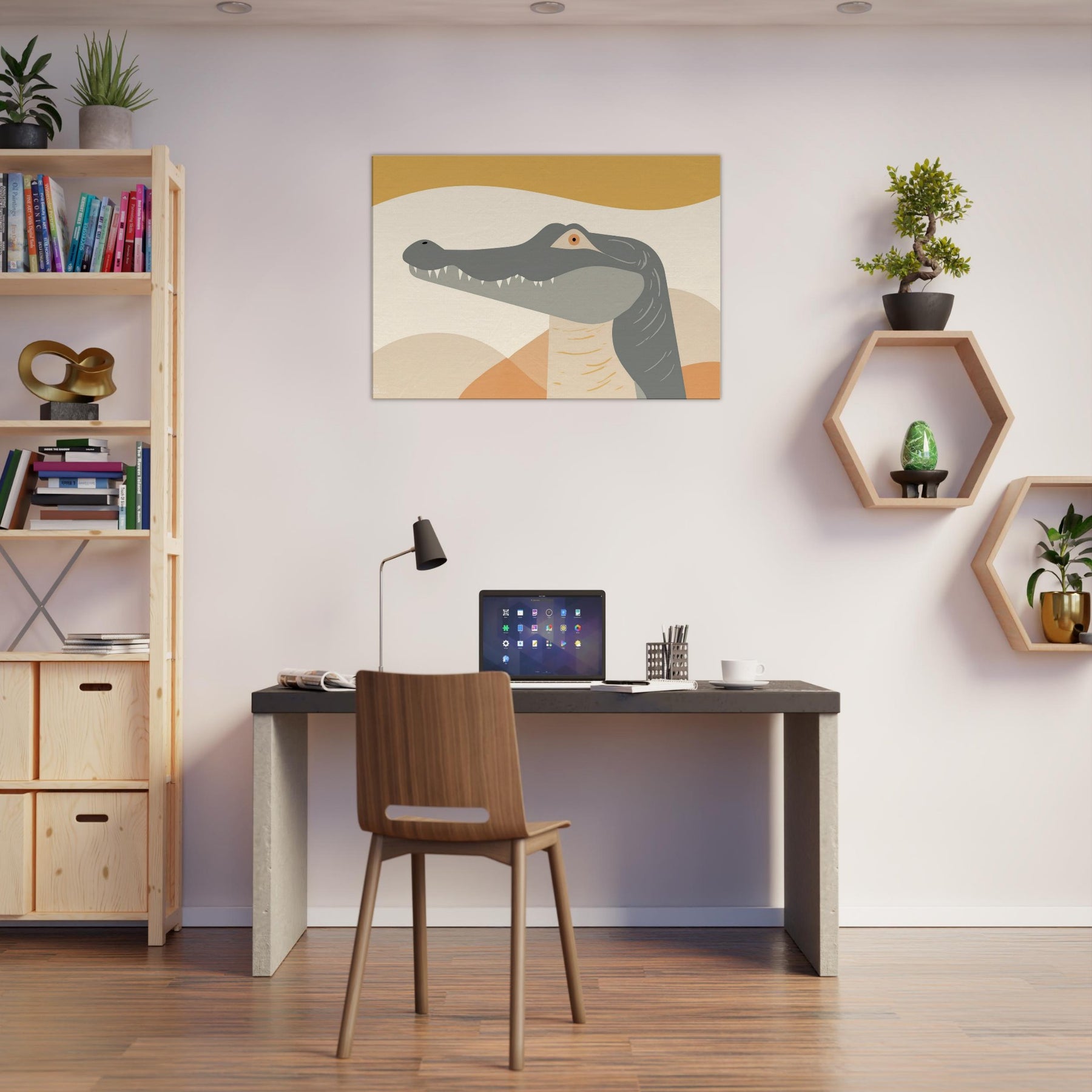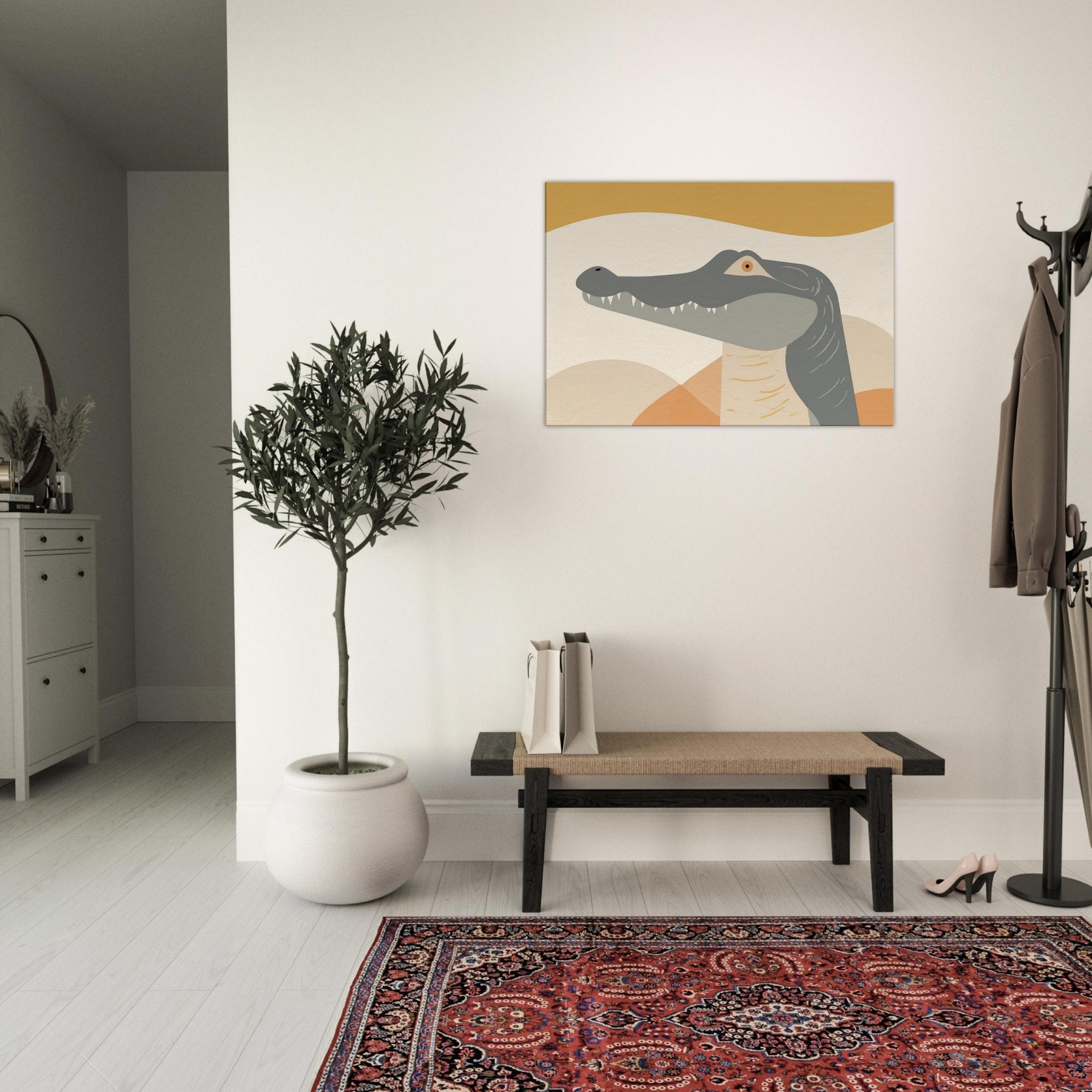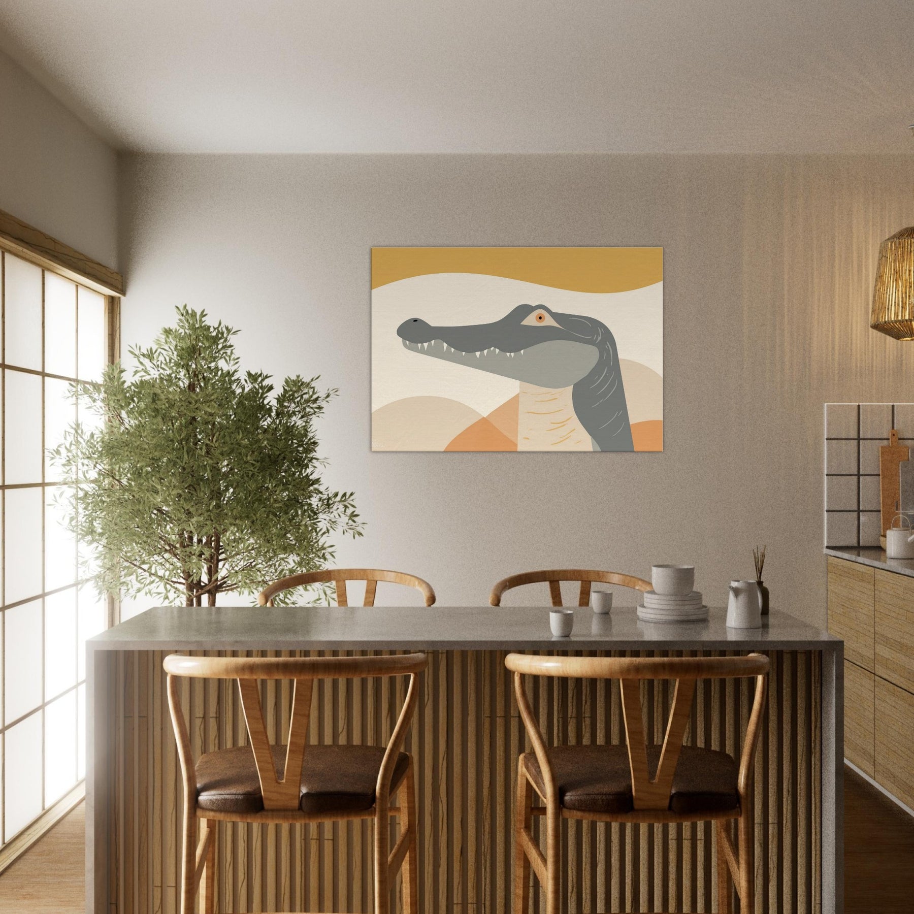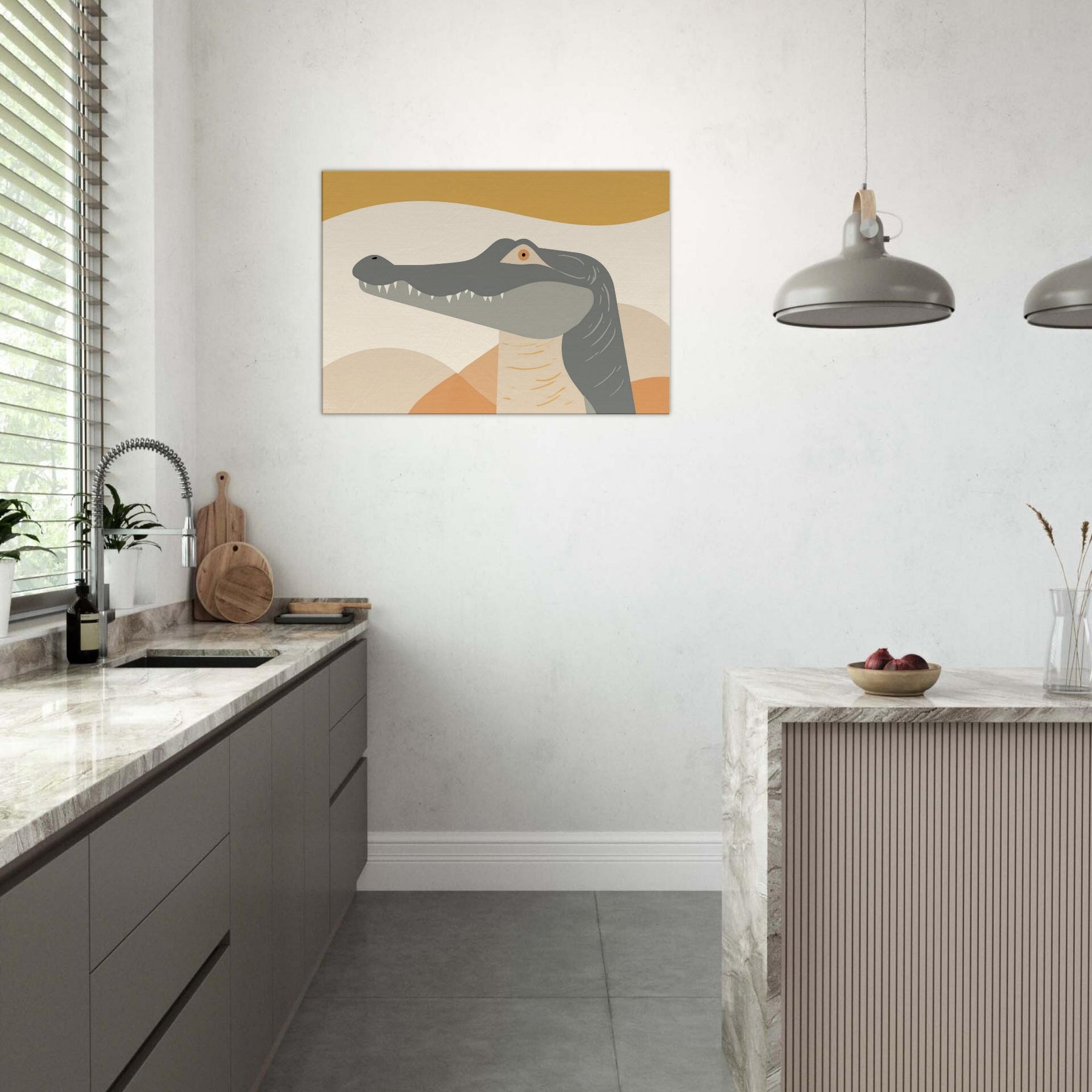Quietly confident and essential, this minimalist Alligator captures a moment of calm before the day begins. Its pared back silhouette glides across a honeyed, sunlit backdrop, inviting soft, meditative light to linger in the room. The restrained palette sand, slate, and light terracotta complements warm woods and cool neutrals alike, adding a sculptural focal point without shouting. Perfect for a living room or study, it lends a sense of poised wilderness, inviting slow admiration and a touch of playful sophistication to everyday spaces.