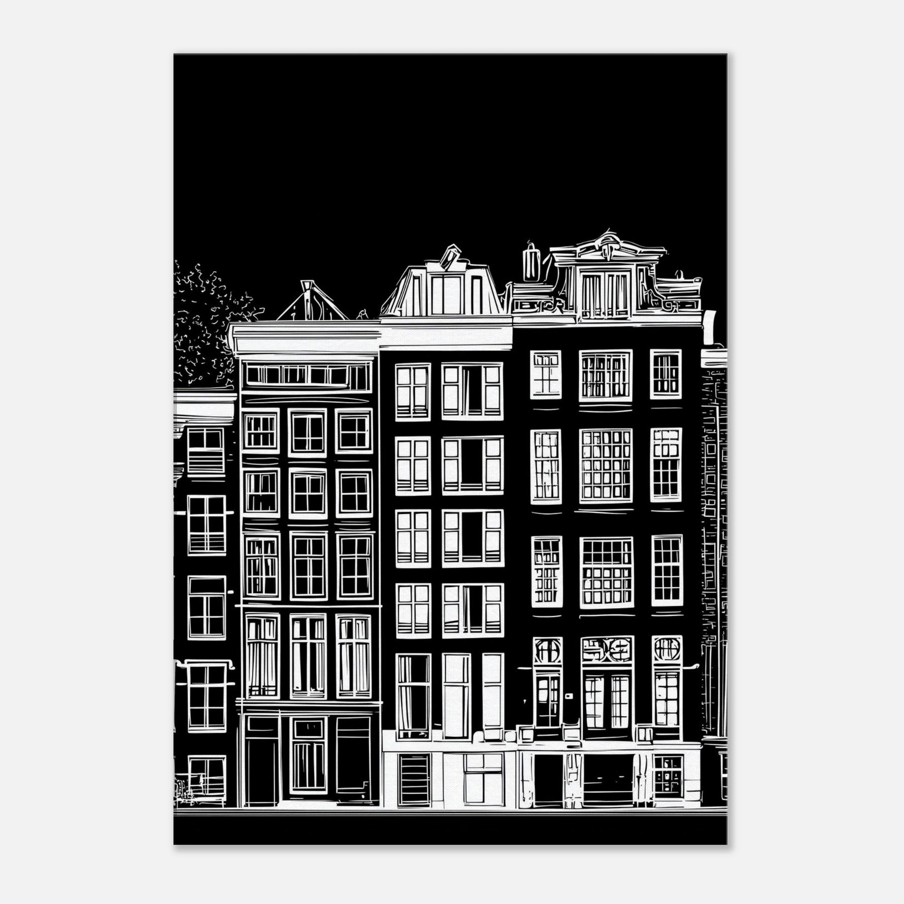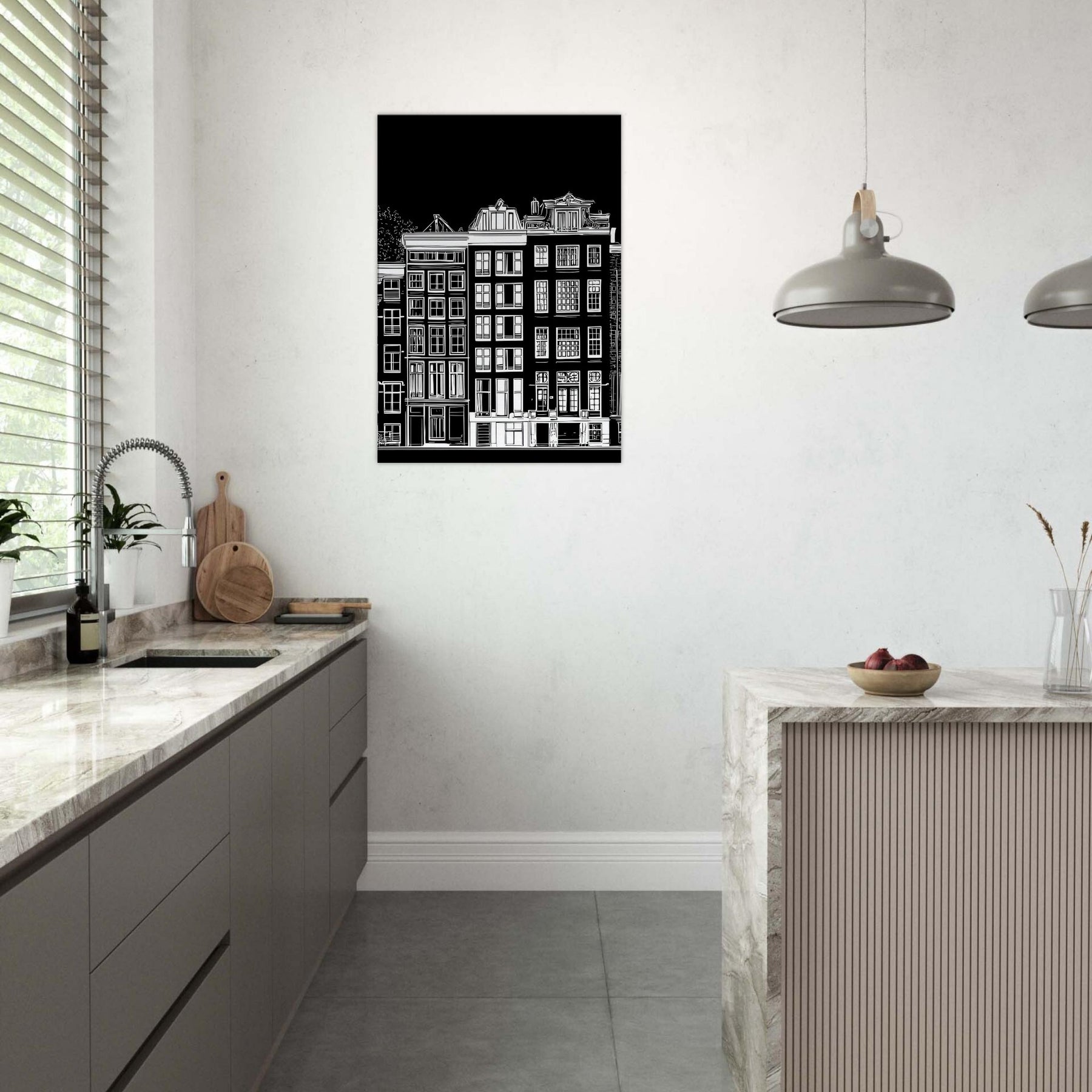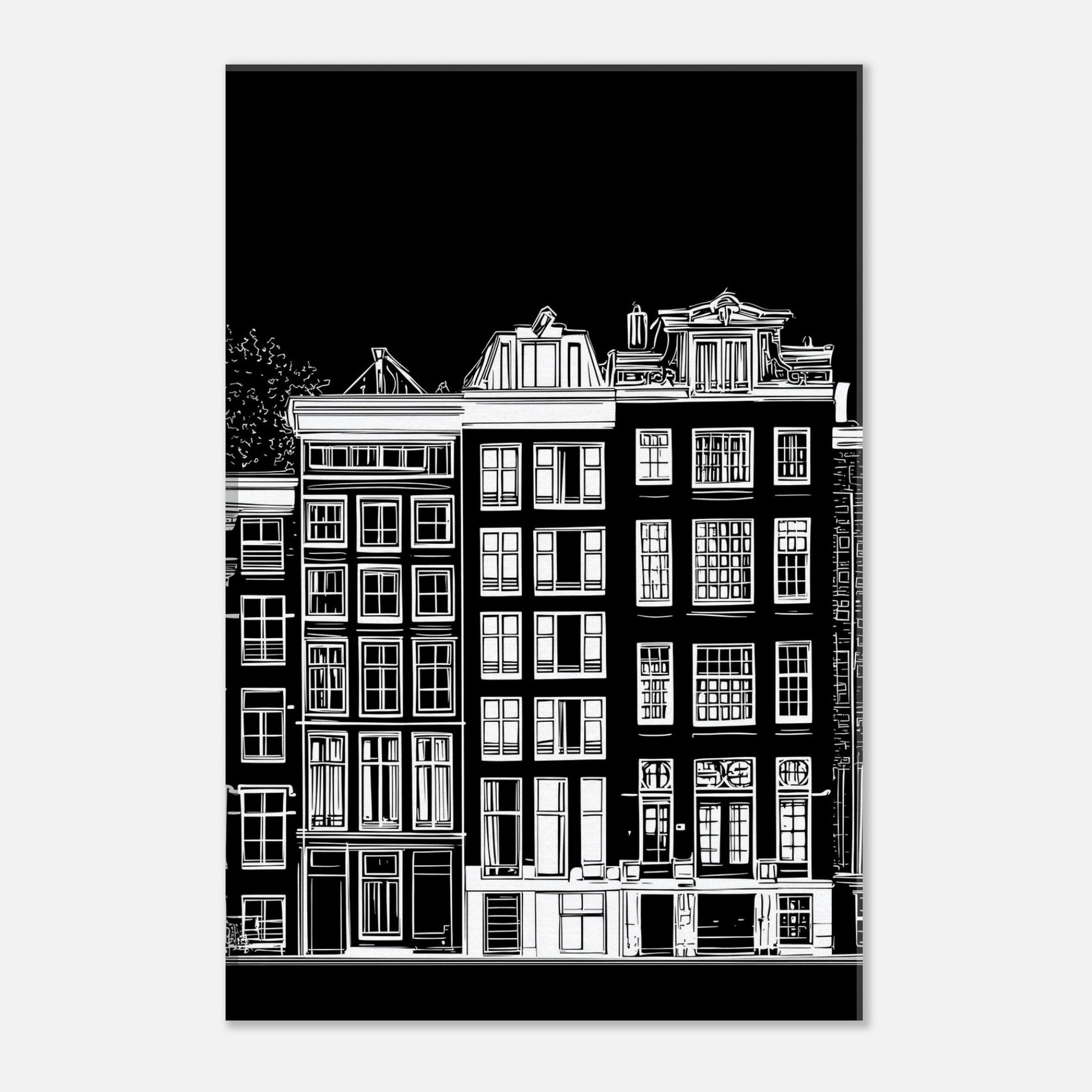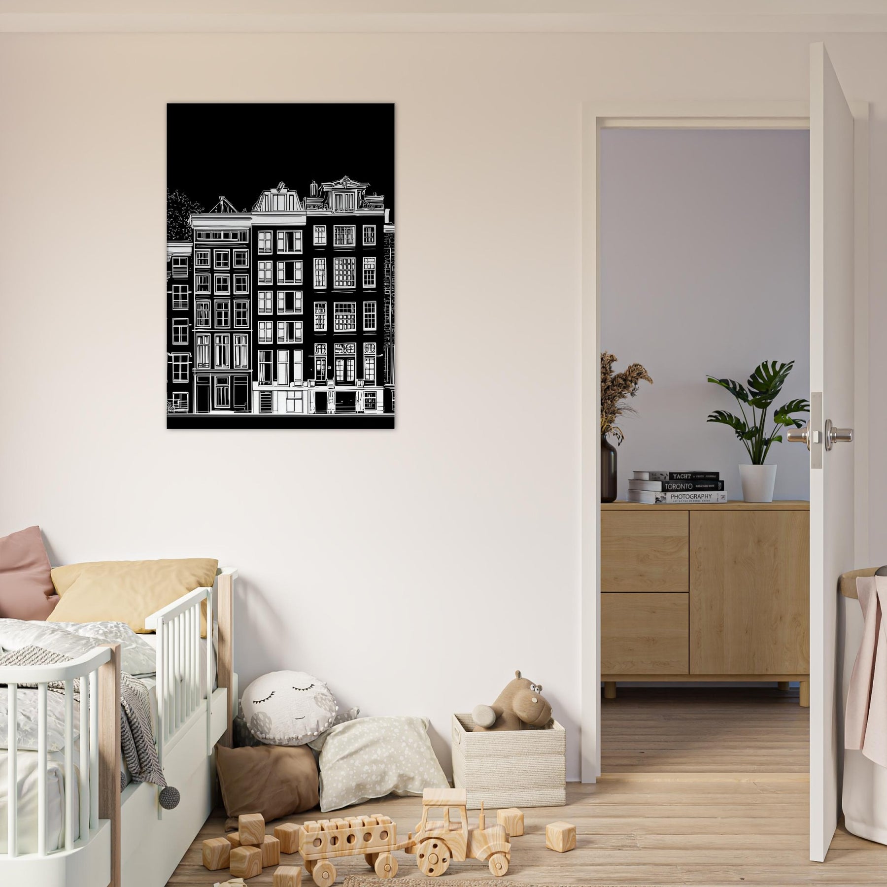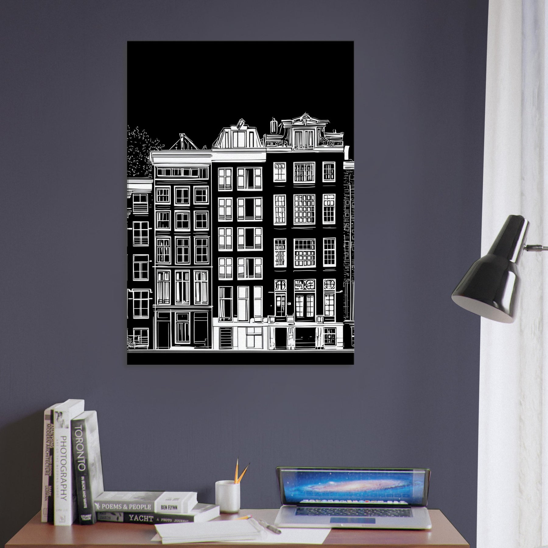 Amsterdam Silhouette invites the mind to wander through a quiet, nocturnal street. The bold white lines sketch a row of canal houses with graceful precision, turning familiar facades into a delicate chorus of light and shadow. In a living room, this piece becomes a refined silhouette that breathes calm and urban romance every glance reveals a new detail, every edge a reminder of walks along narrow bridges. Let this artwork frame your space with timeless elegance and the soft pulse of a city at rest.