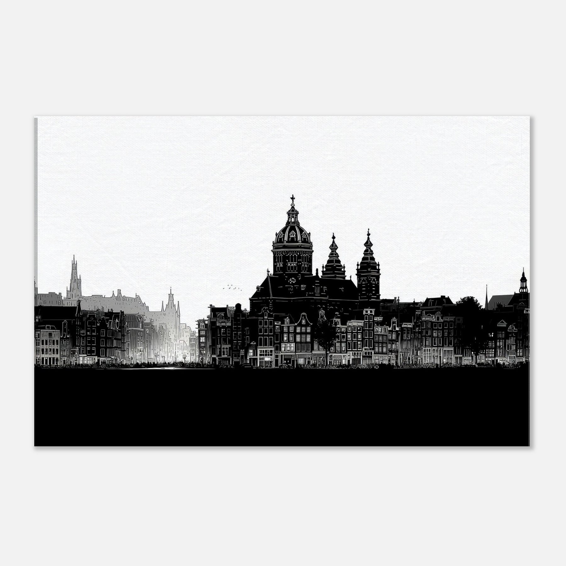 Across a quiet wall, Amsterdam stands washed in contrast, a cityscape distilled to ink and light. This black and white scene invites the eye to wander along the ornate façades, the domed silhouette rising above a sleeping street.