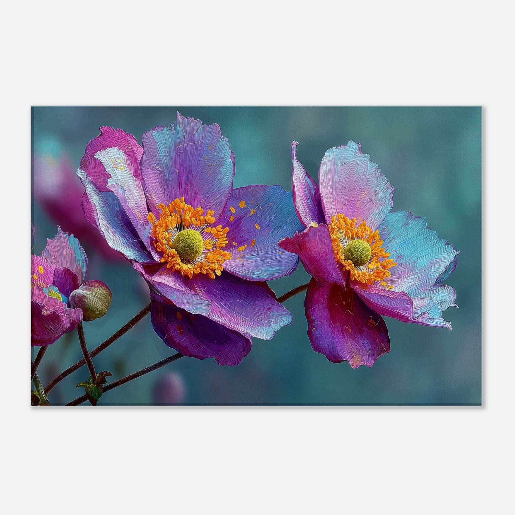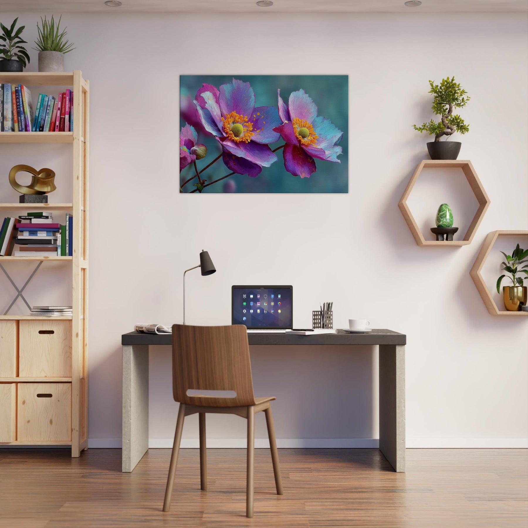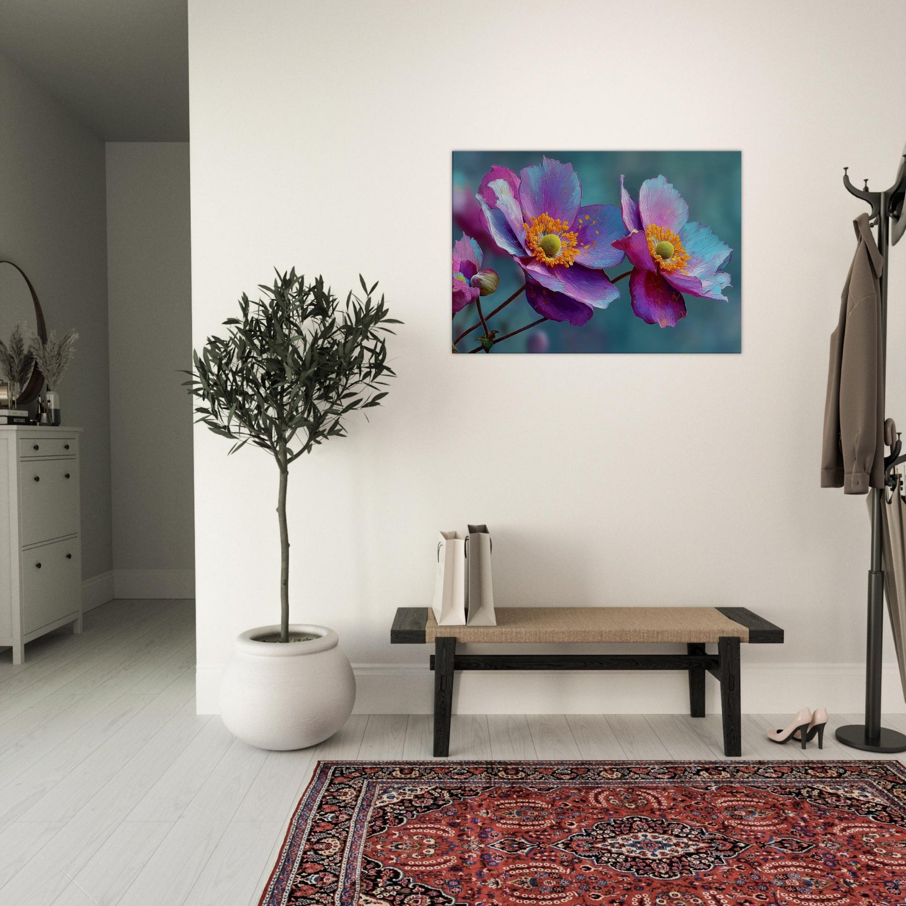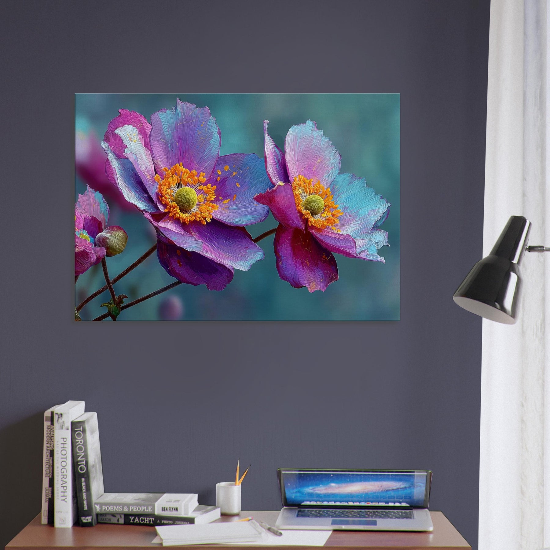 Anemone blossoms drift across a field of color in this abstract study of nature. The anemone, rendered in electric purples, teals, and gold, feels both delicate and daring as if a garden had been distilled into a single breath. The piece casts a soft, luminous glow that warms a living room or study, inviting quiet reflection while sparking conversation. Its tactile brushwork suggestion and radiant center awaken walls with atmospheric energy and graceful motion.