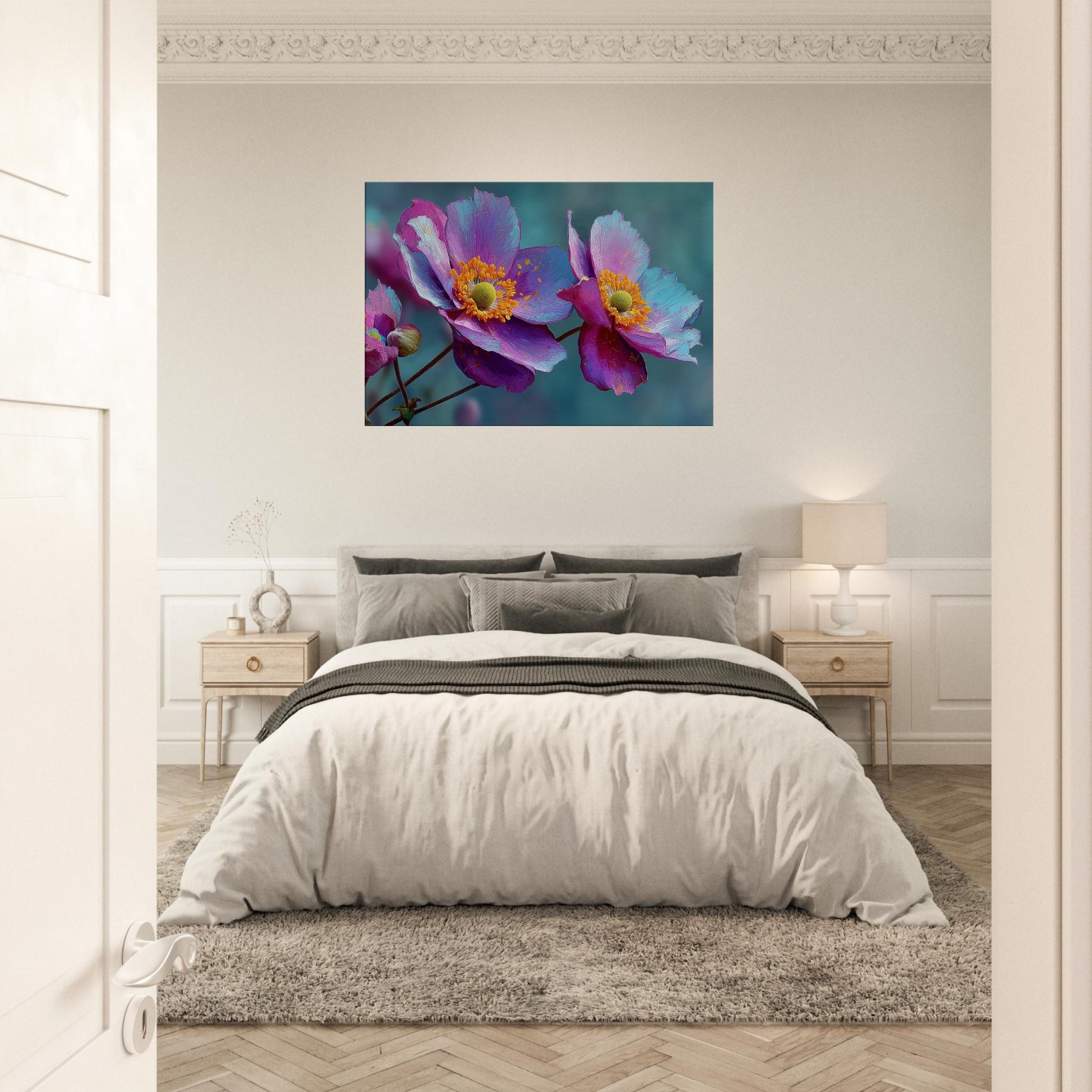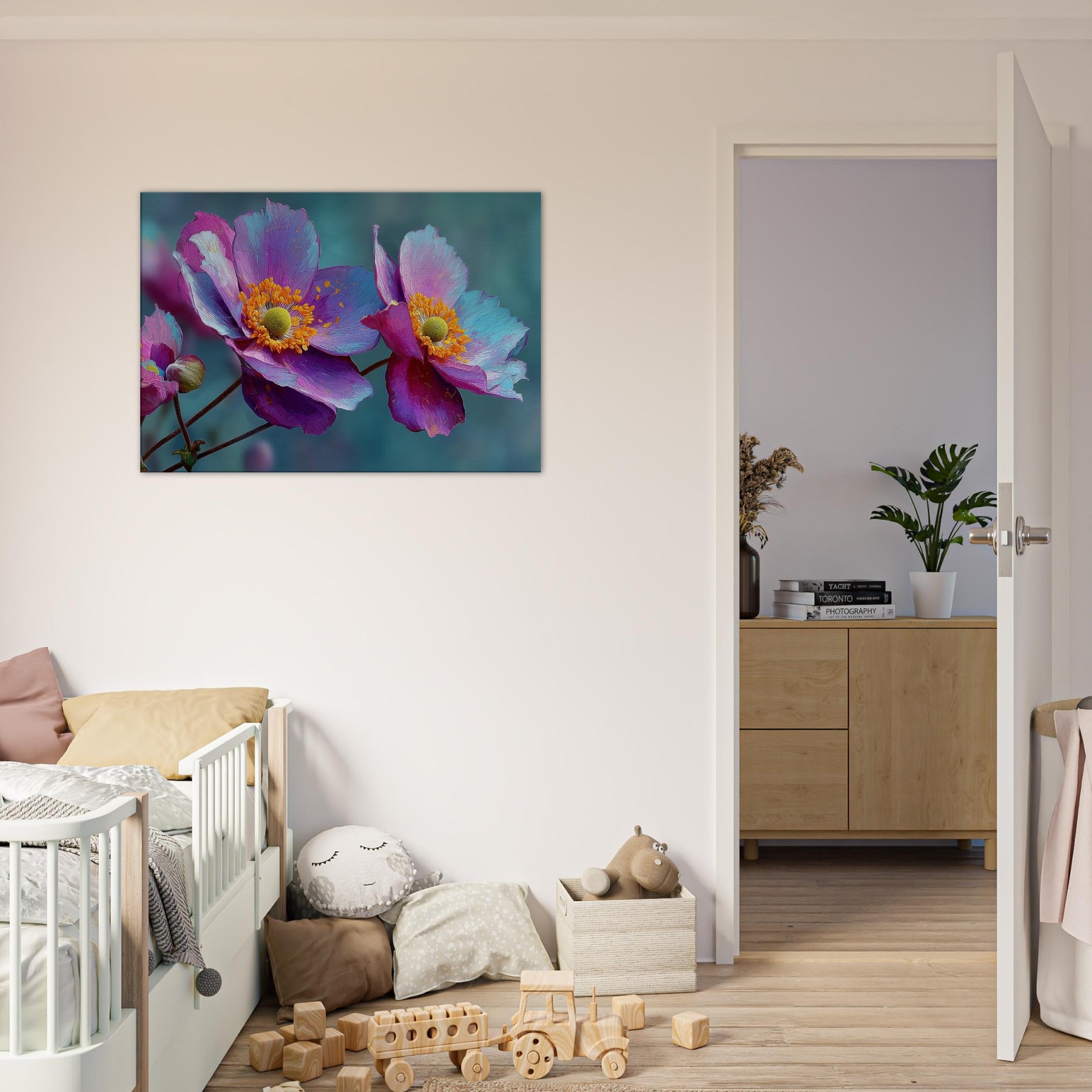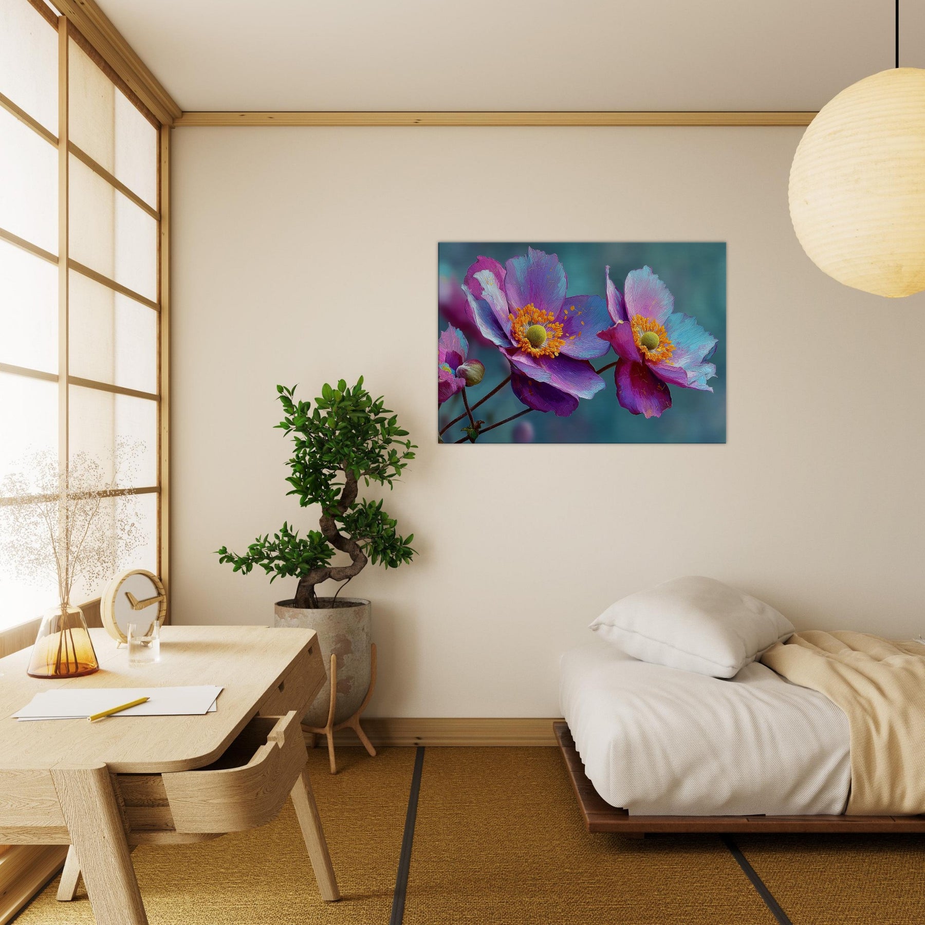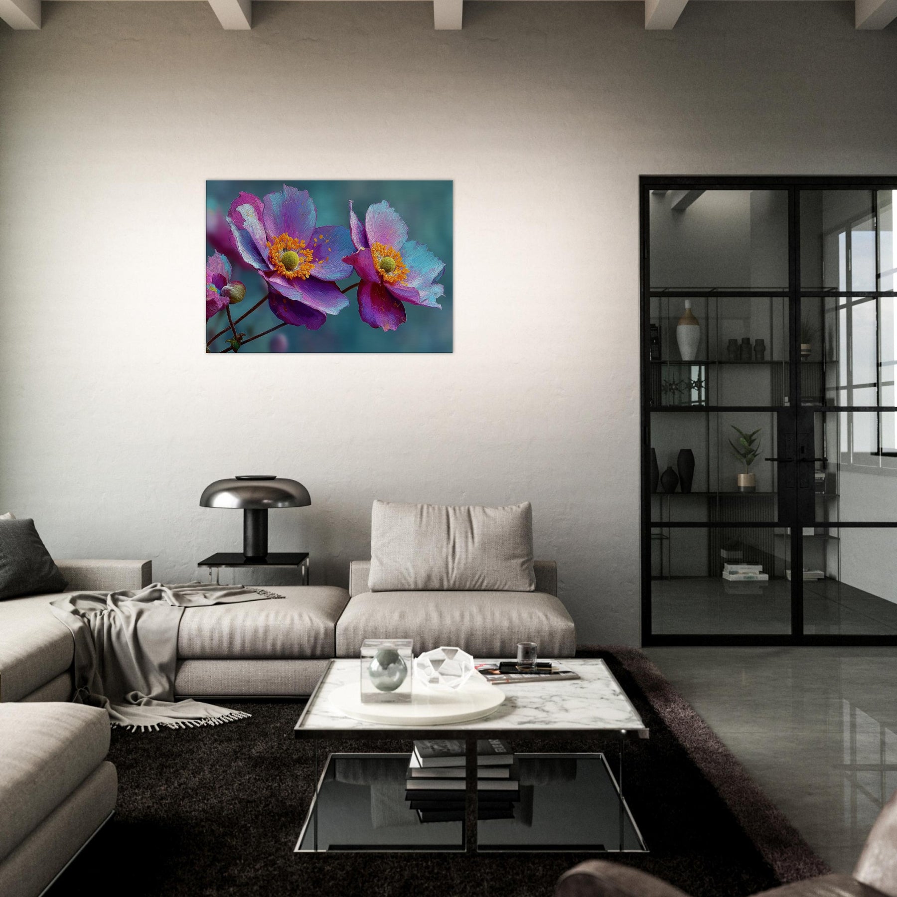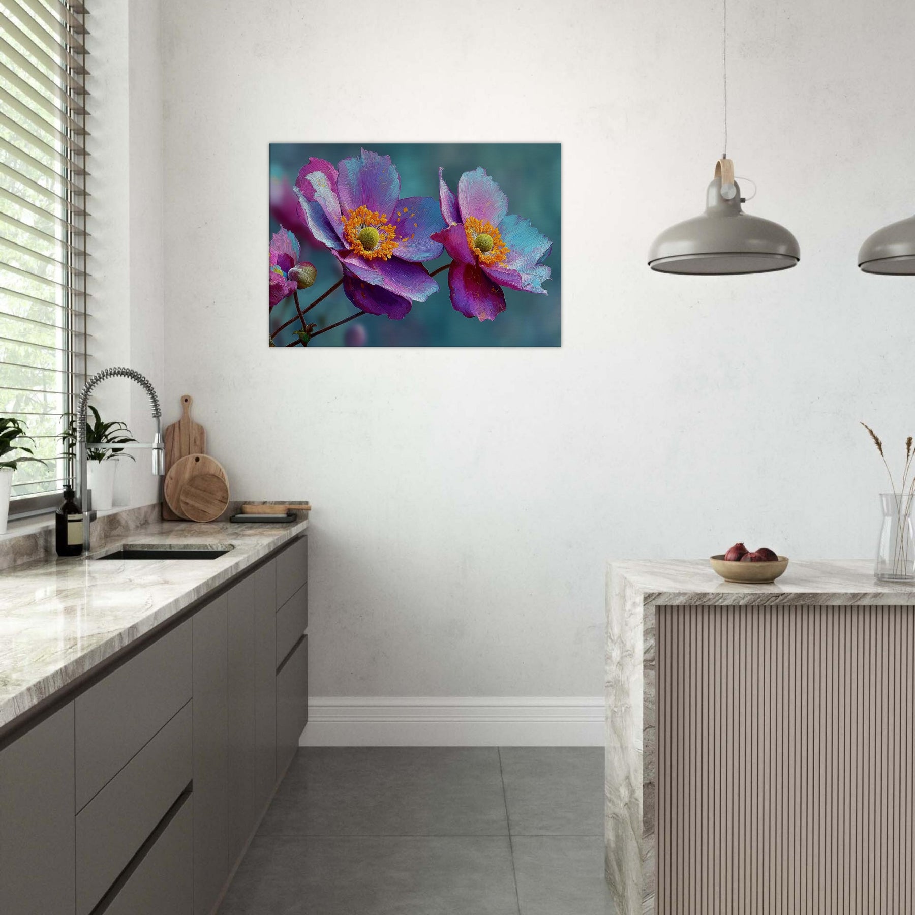 Anemone blossoms drift across a field of color in this abstract study of nature. The anemone, rendered in electric purples, teals, and gold, feels both delicate and daring as if a garden had been distilled into a single breath. The piece casts a soft, luminous glow that warms a living room or study, inviting quiet reflection while sparking conversation. Its tactile brushwork suggestion and radiant center awaken walls with atmospheric energy and graceful motion.