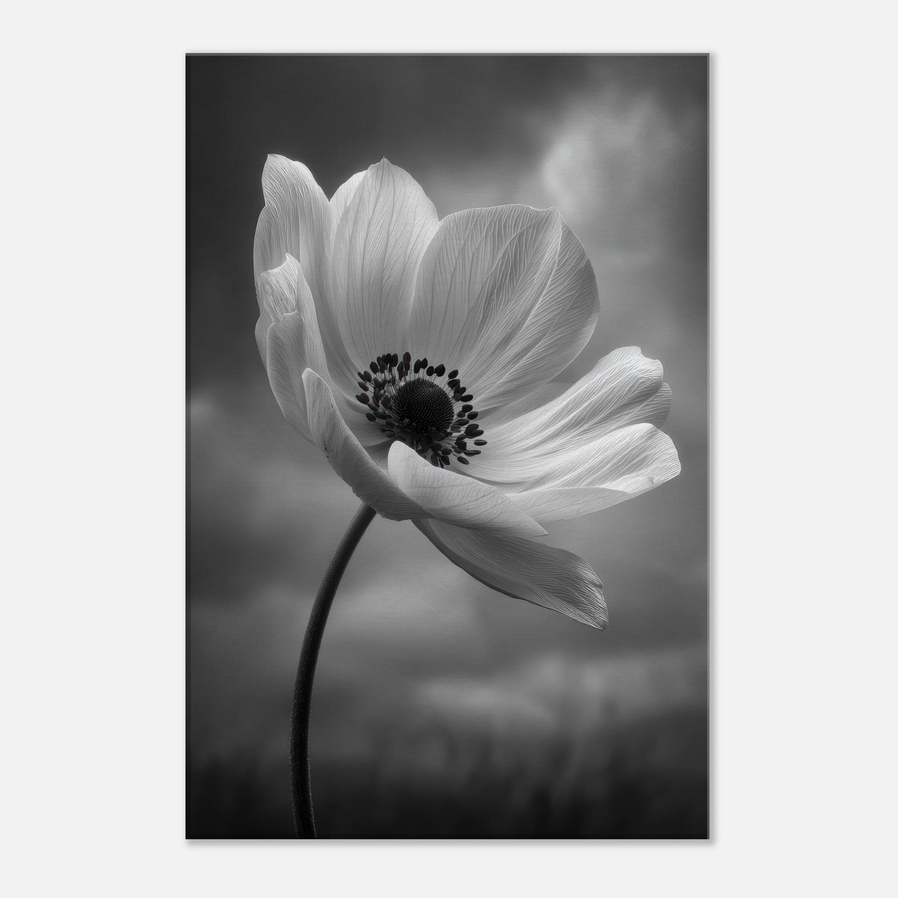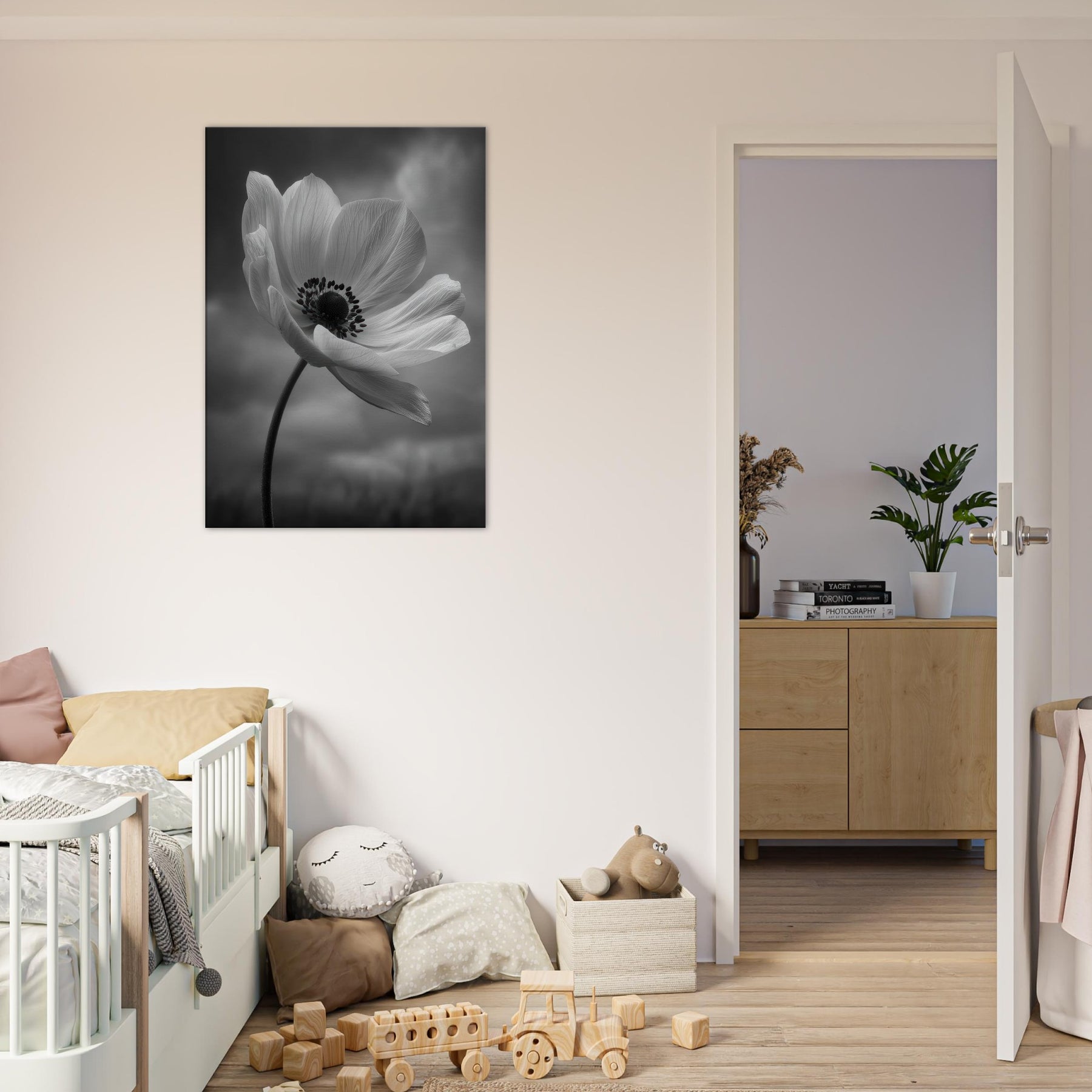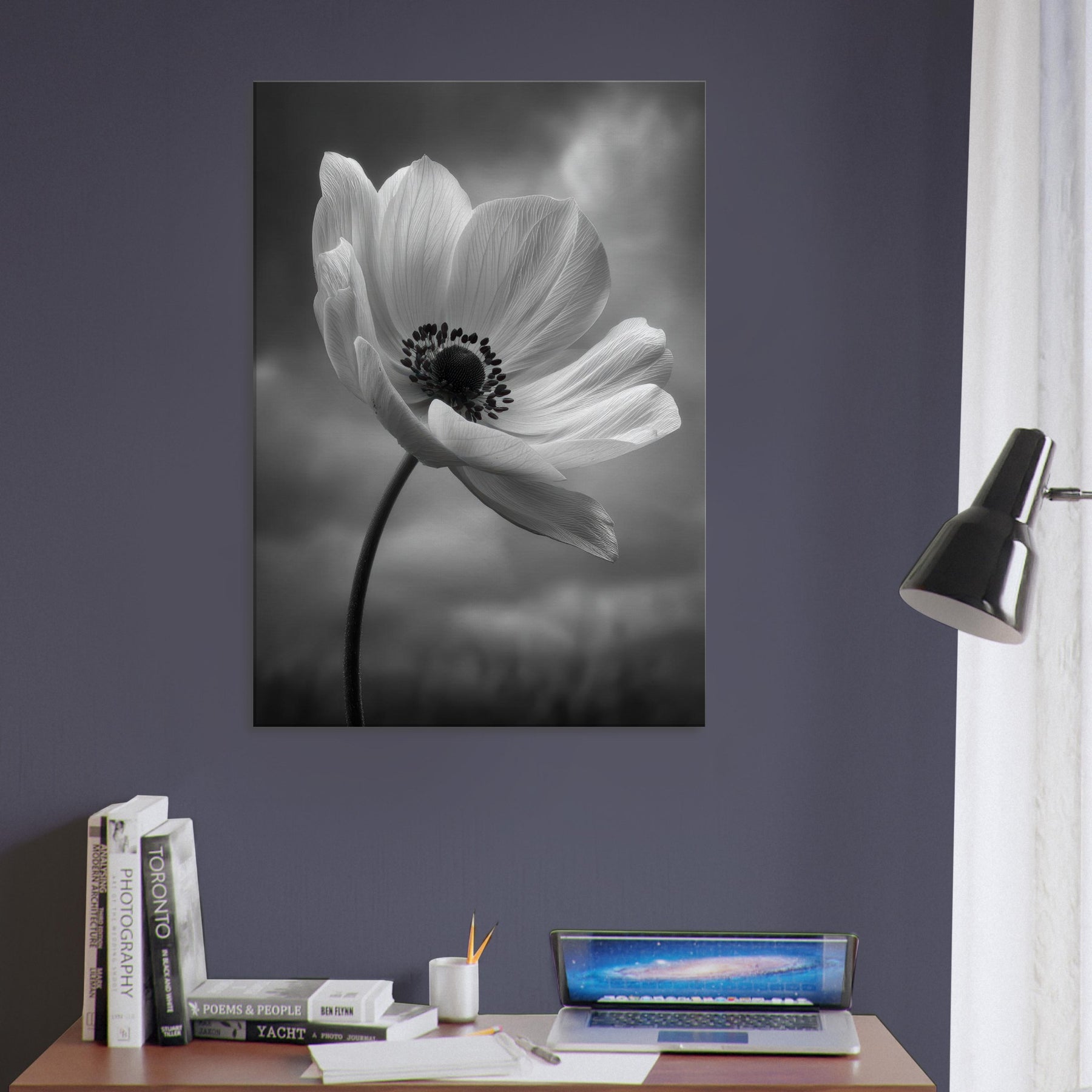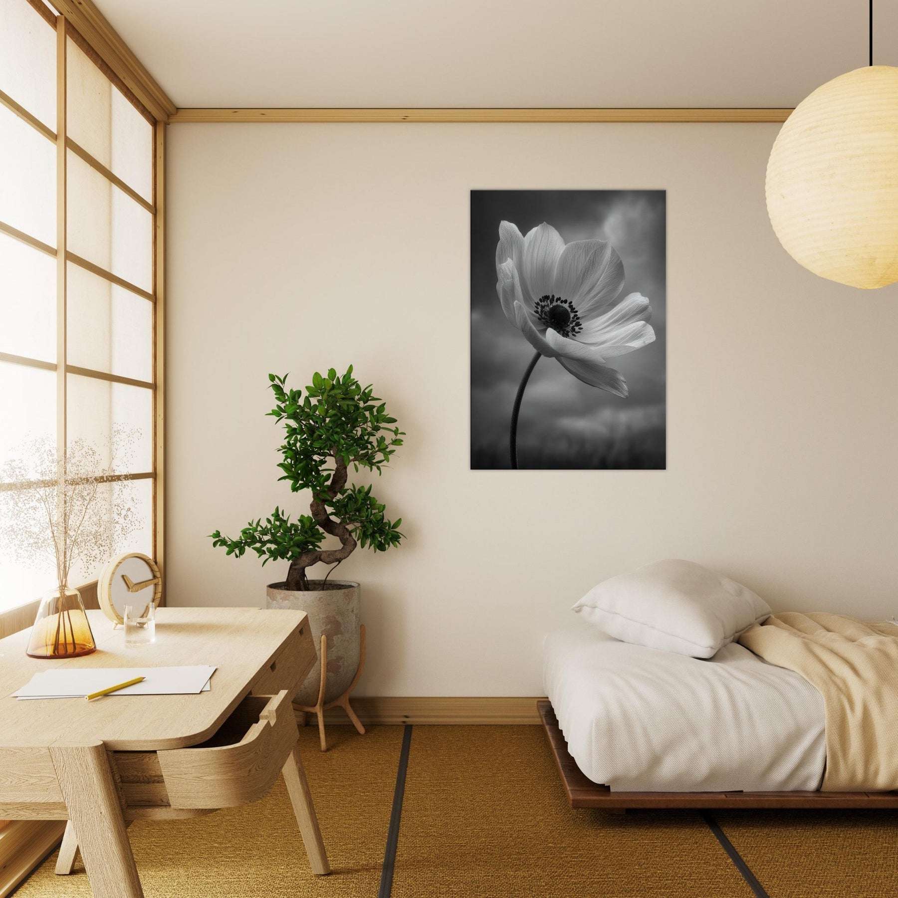 Anemone blooms in stark grayscale, its petals luminous against a moody sky. This Black And White rendition invites quiet reflection, drawing the eye along the curve of the stem to the flower's velvety center. It radiates timeless serenity, offering a focal point that feels both delicate and enduring. Perfect for a living room, entry, or bedroom, this piece lends sculptural drama and a whisper of nature to a modern space, elevating atmosphere without overpowering the room.