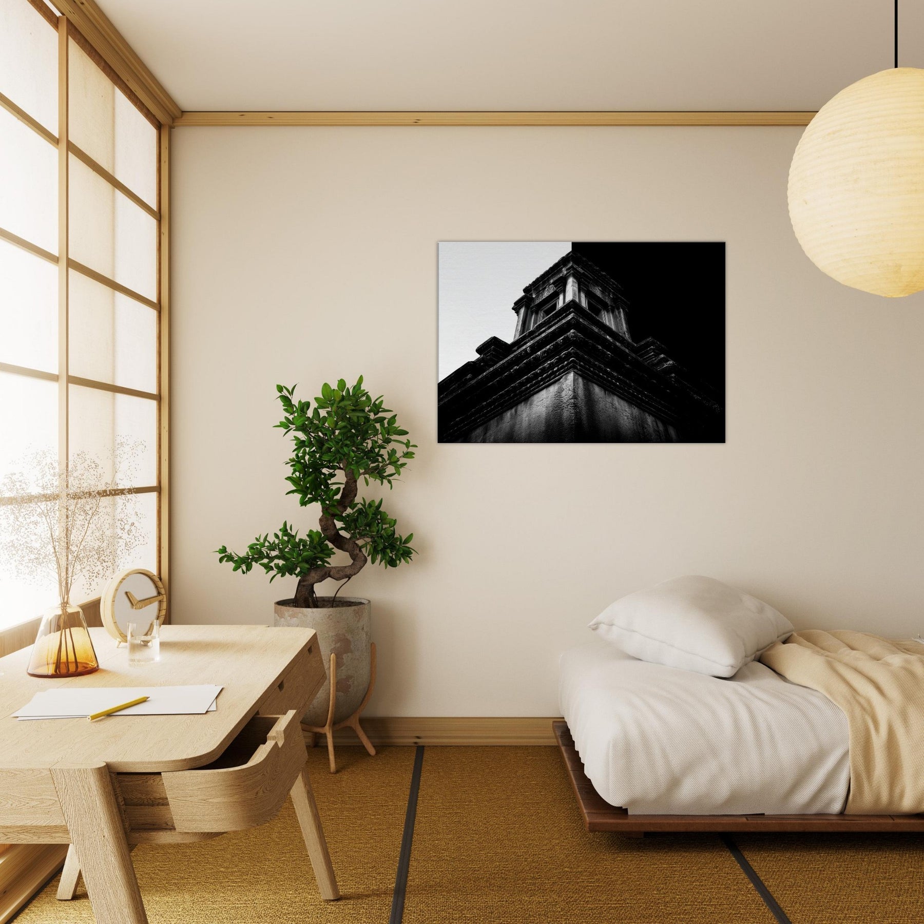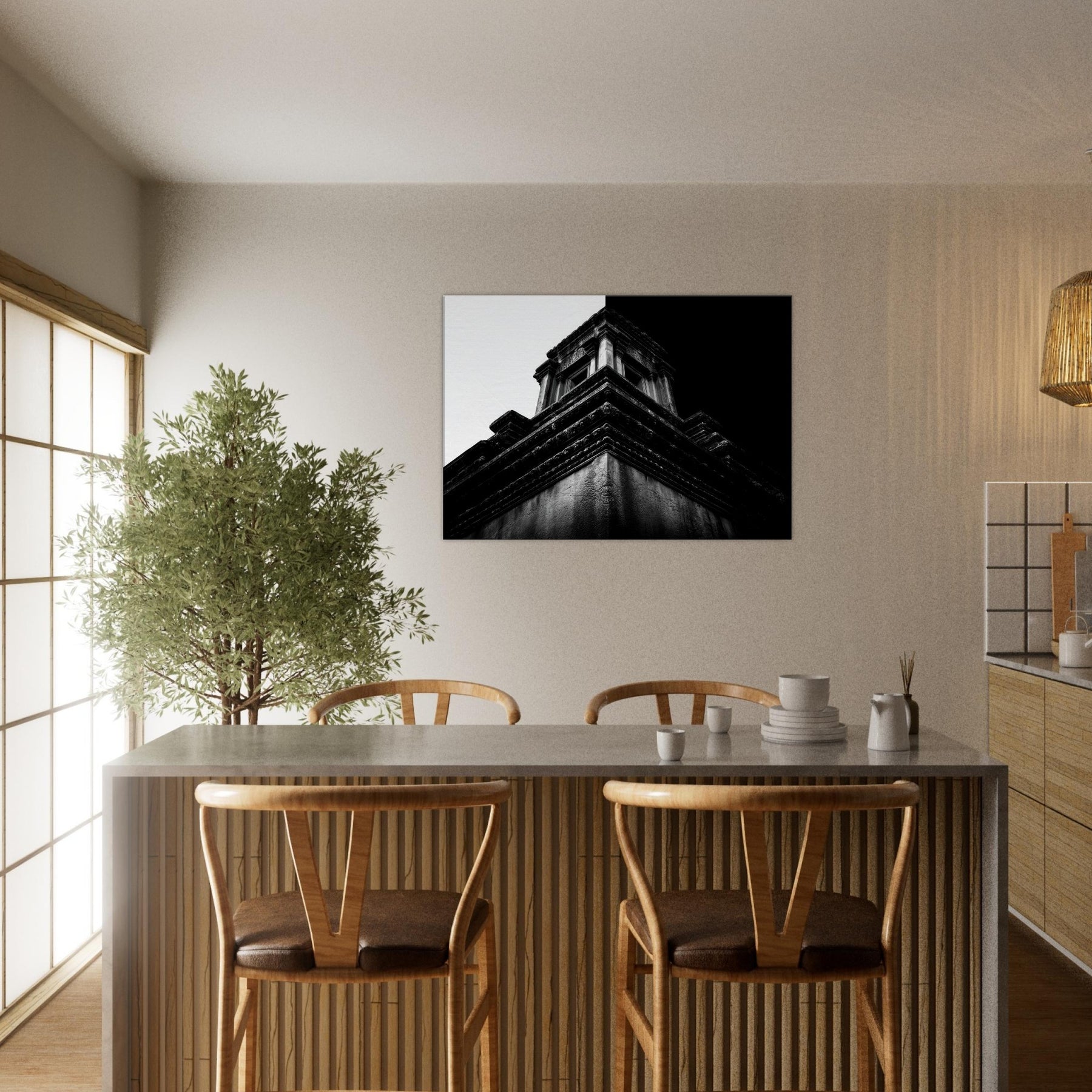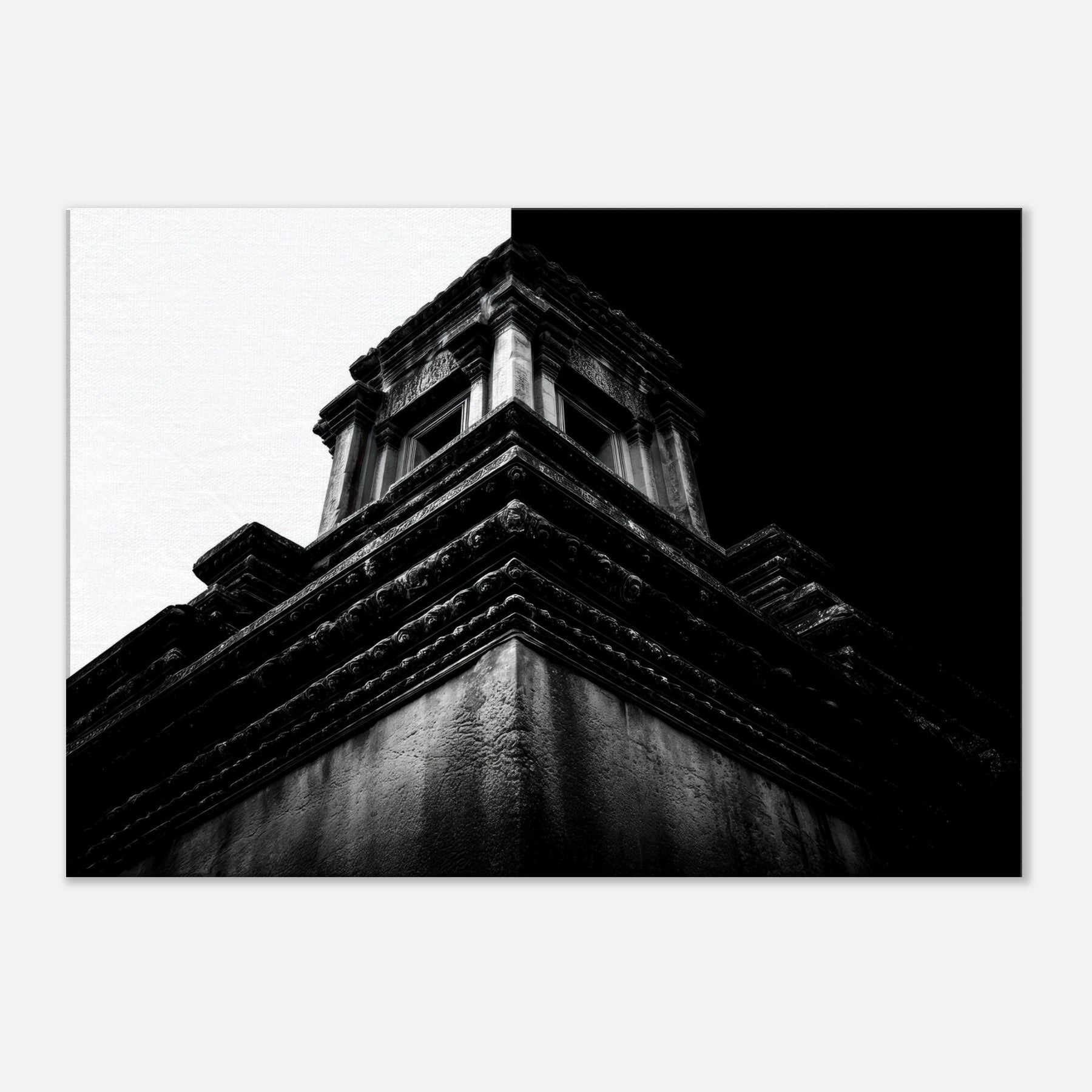 A quiet angular memory unfolds in bold contrast and intimate detail. This black and white study captures temple terraces rising like a secret staircase, where light and shadow sketch ancient stories across the wall.