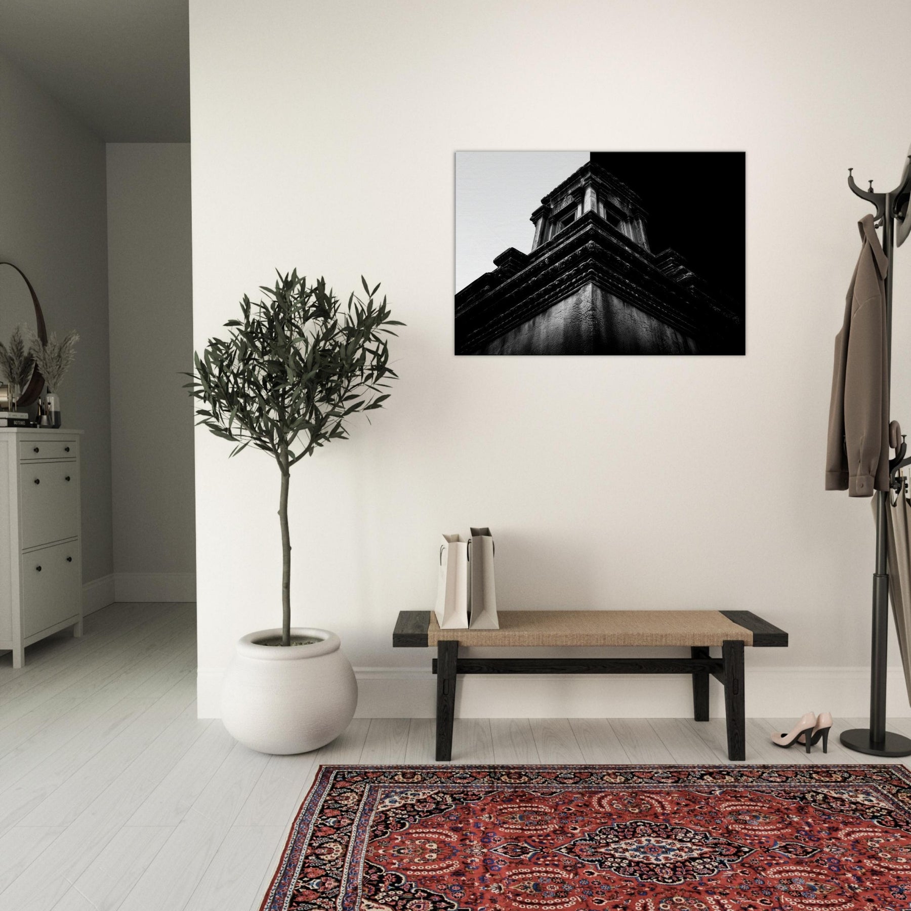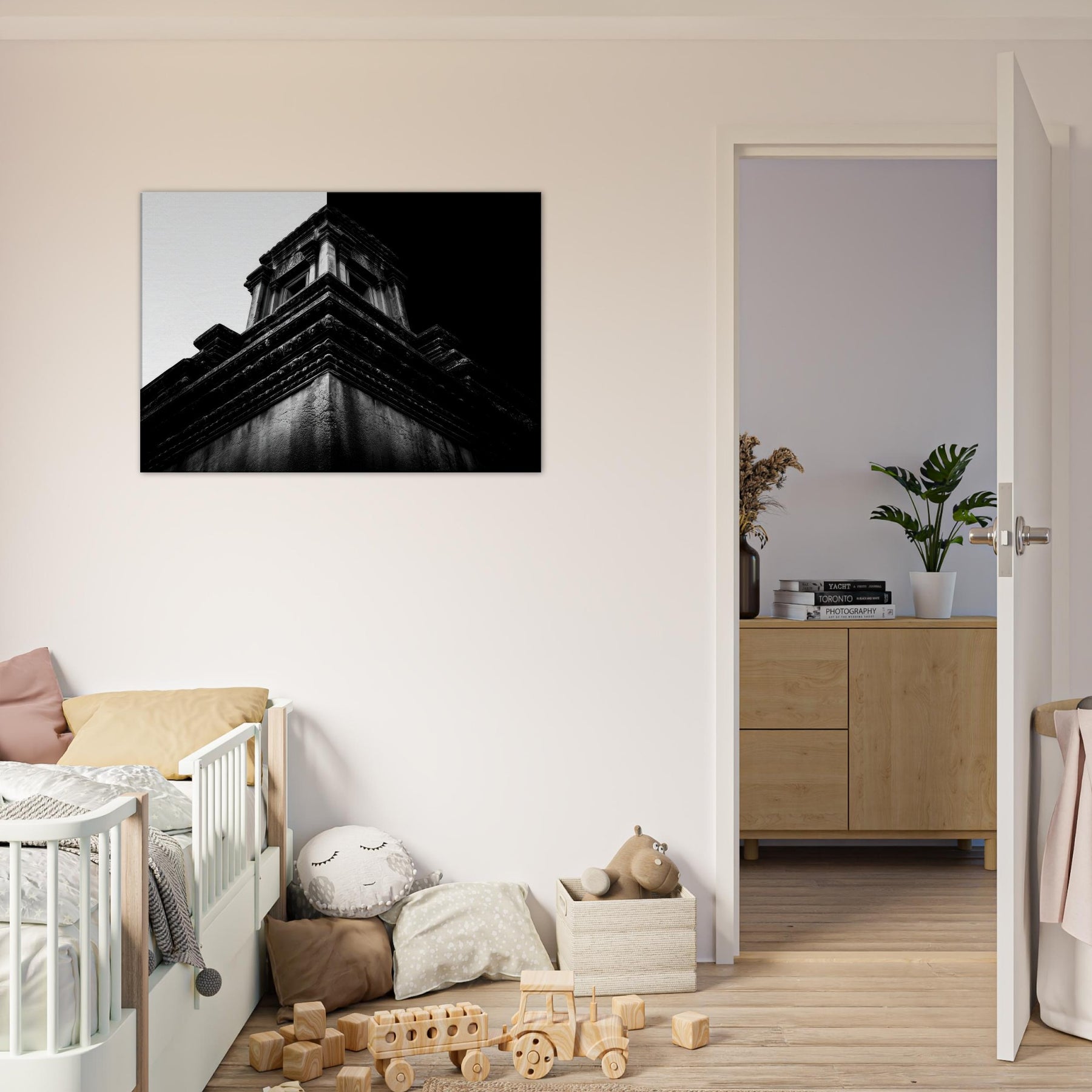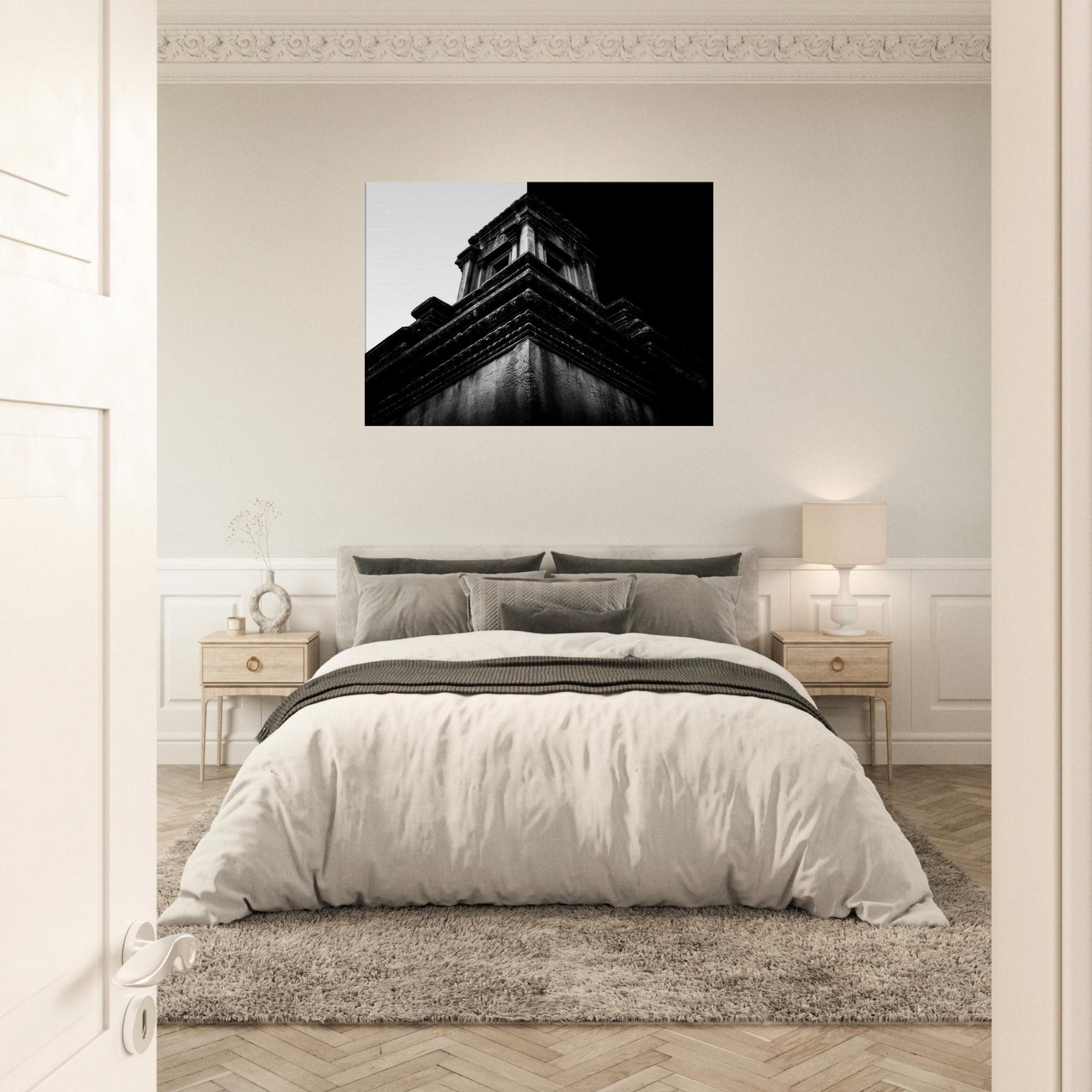 A quiet angular memory unfolds in bold contrast and intimate detail. This black and white study captures temple terraces rising like a secret staircase, where light and shadow sketch ancient stories across the wall.