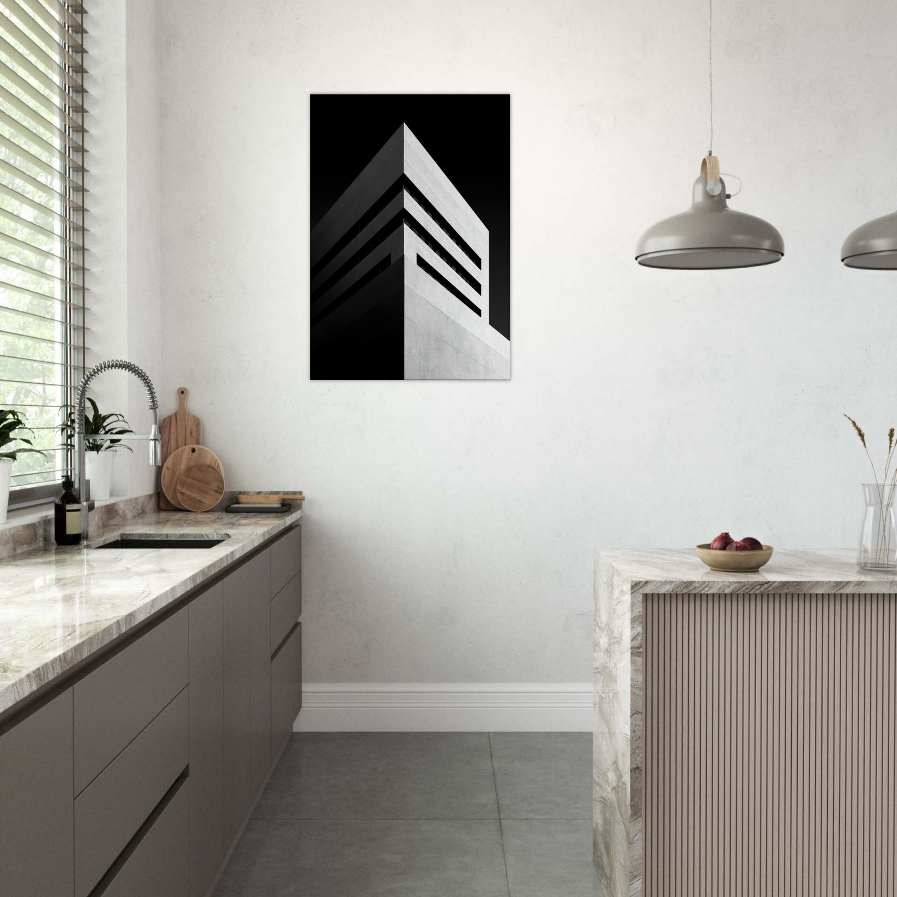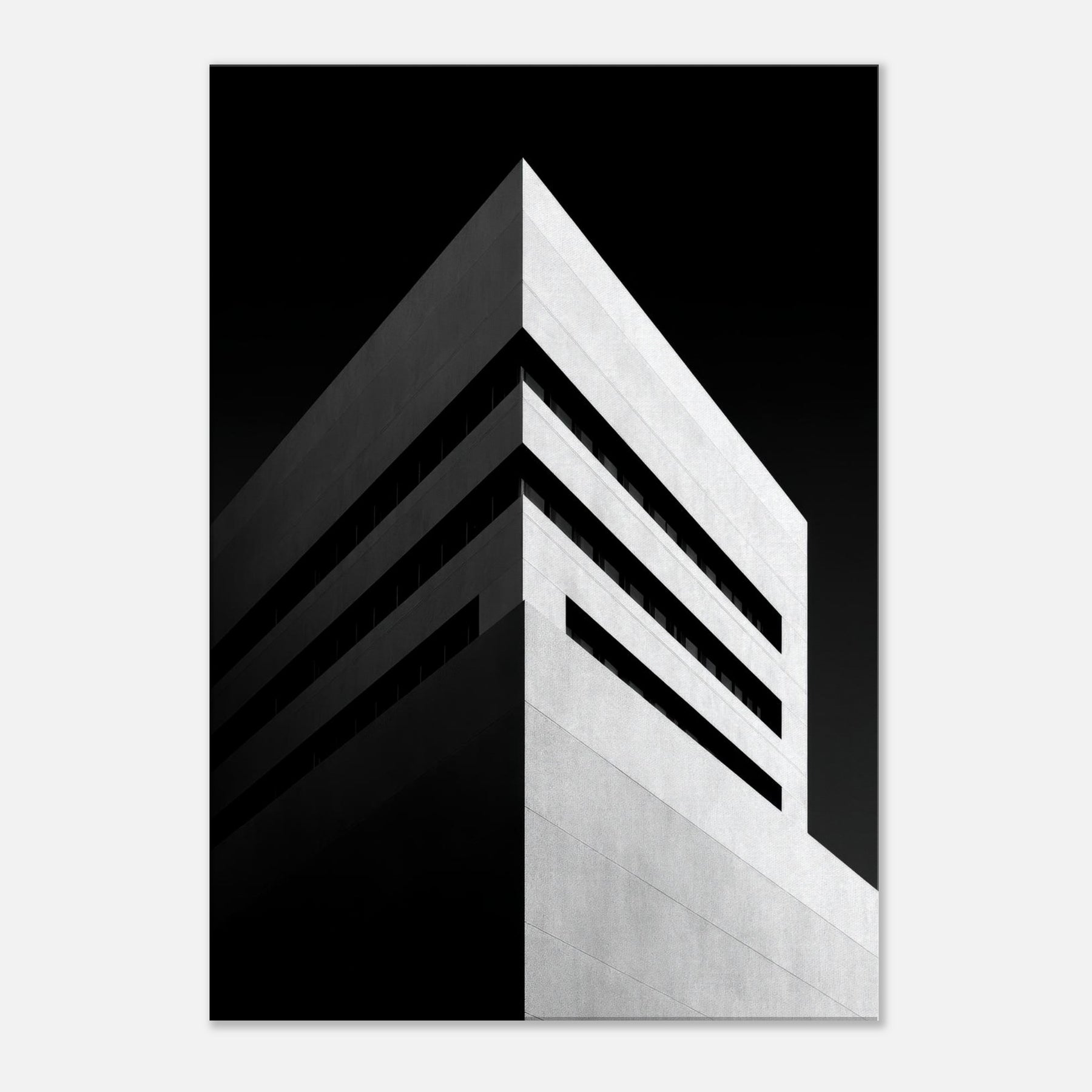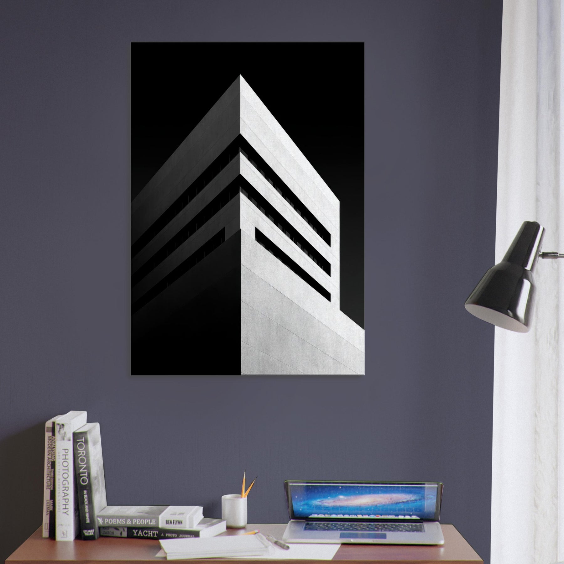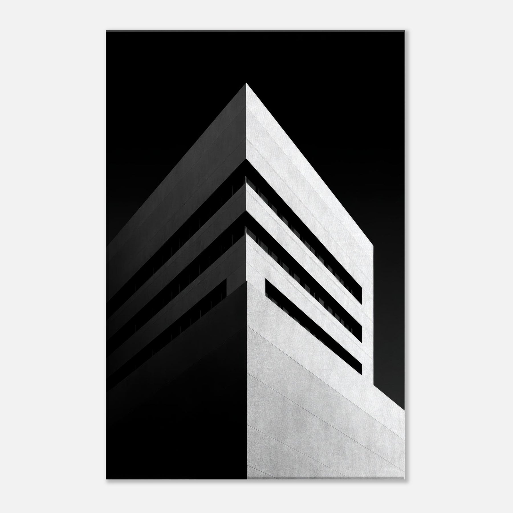 In stark monochrome, this piece distills Miami’s architectural pulse into clean lines and daring angles. The building’s sharp edge rises like a city’s heartbeat, its windows becoming breaths of rhythm and light. The absence of color invites a quiet drama, letting textures and shadows speak.