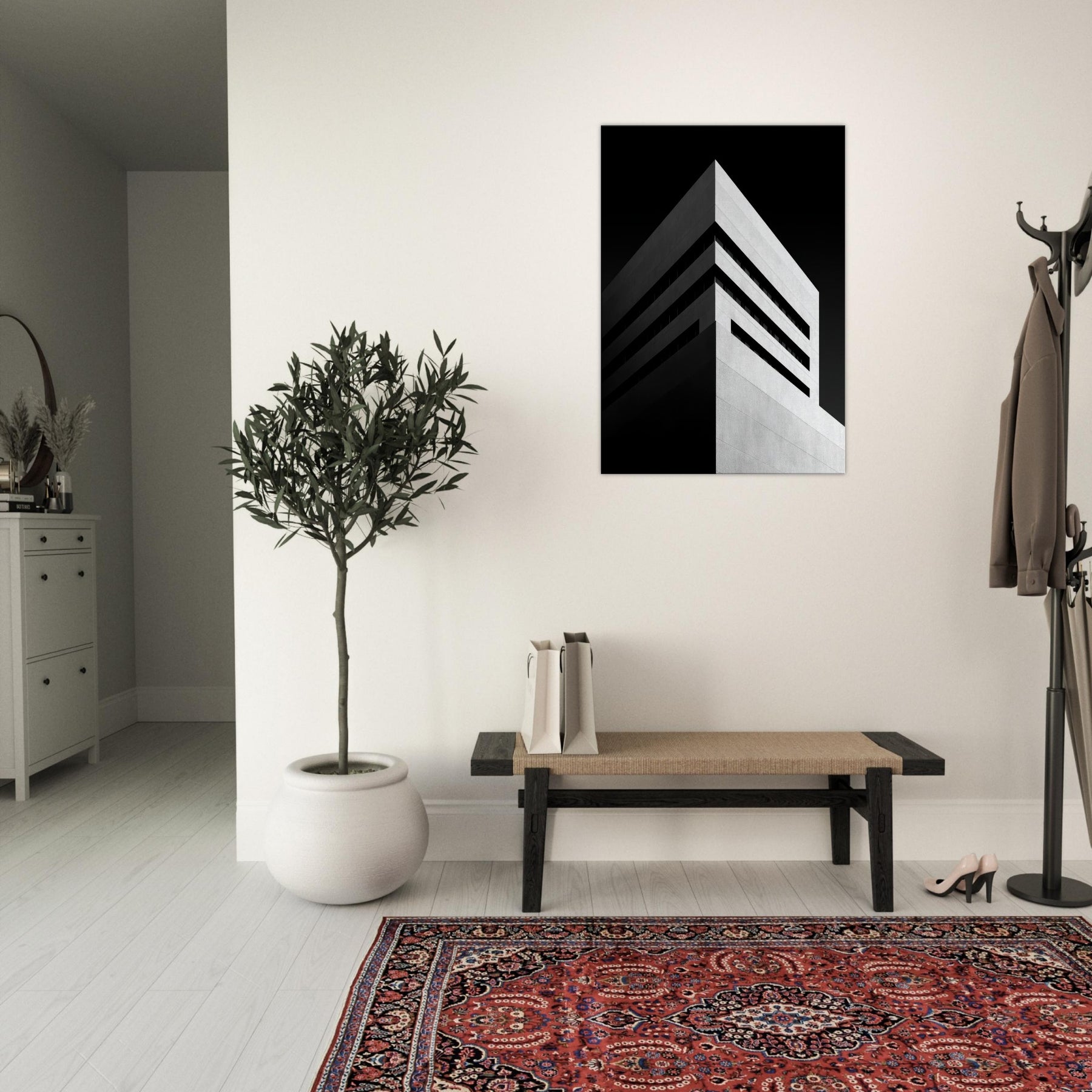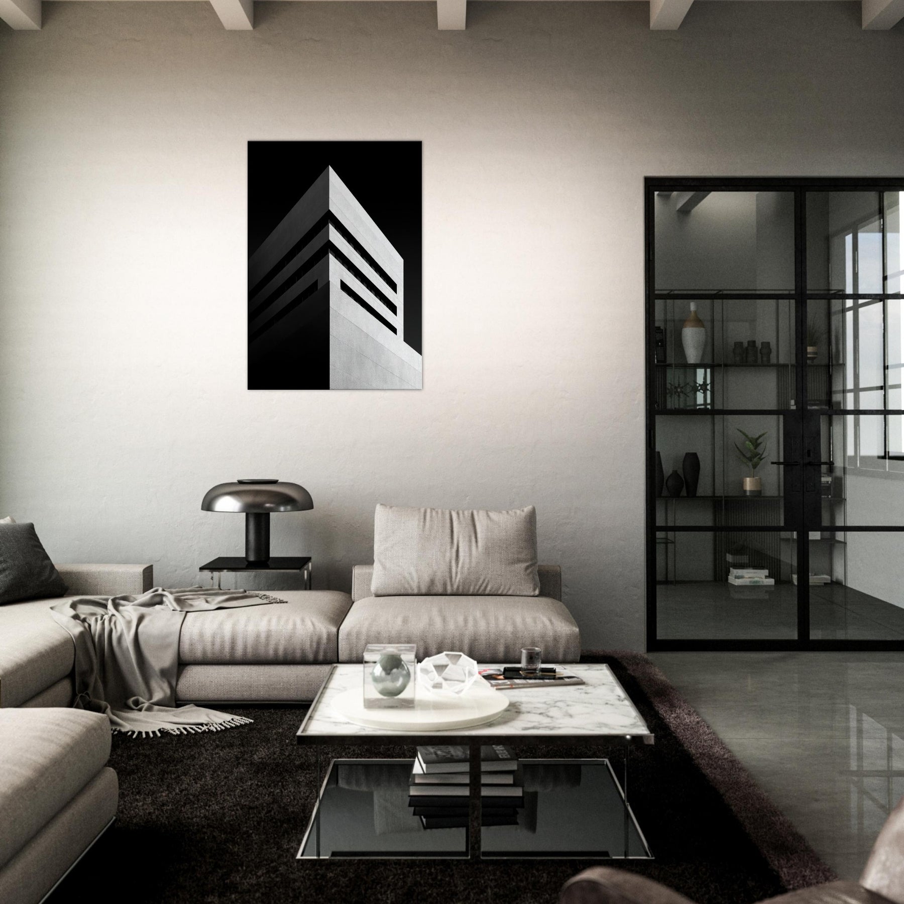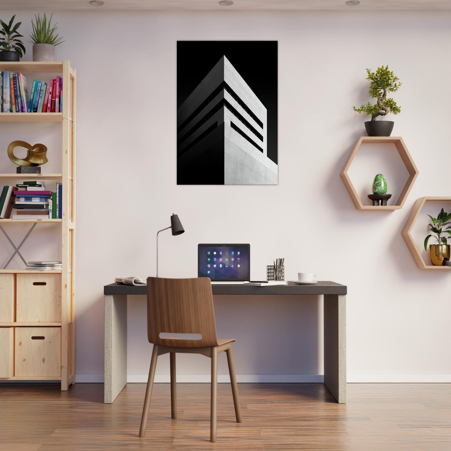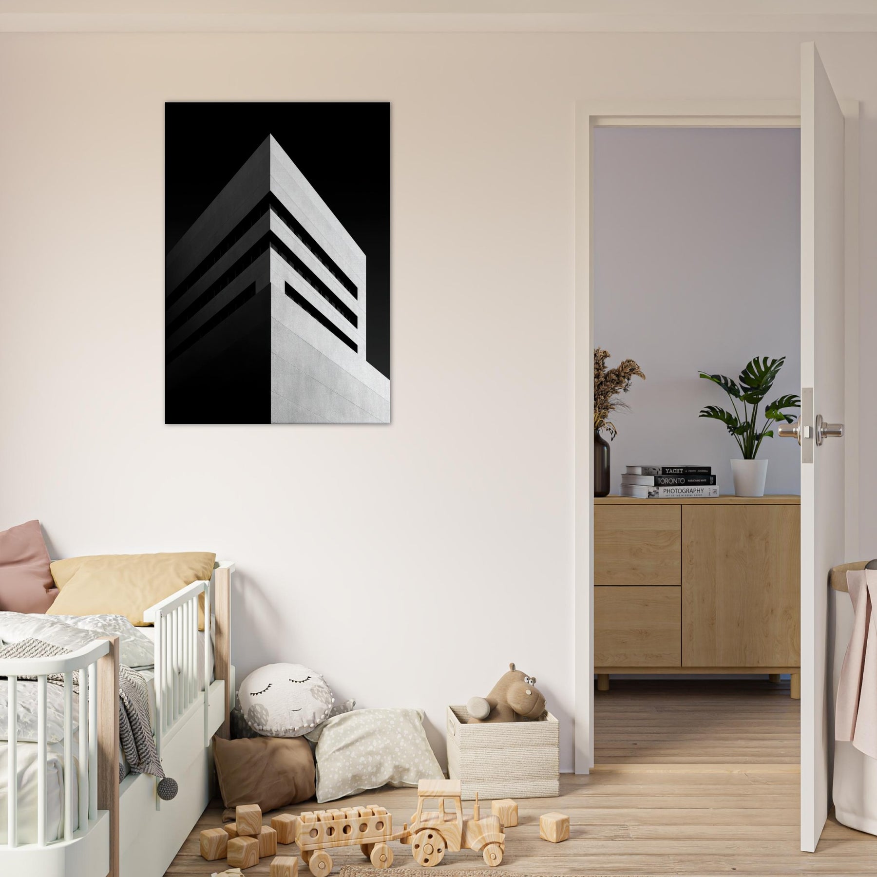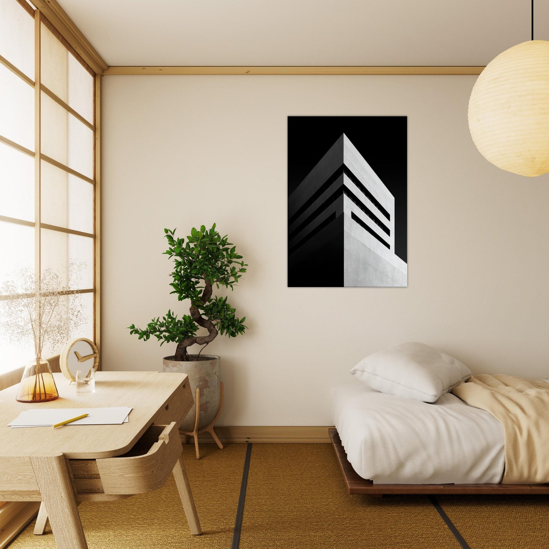 In stark monochrome, this piece distills Miami’s architectural pulse into clean lines and daring angles. The building’s sharp edge rises like a city’s heartbeat, its windows becoming breaths of rhythm and light. The absence of color invites a quiet drama, letting textures and shadows speak.
