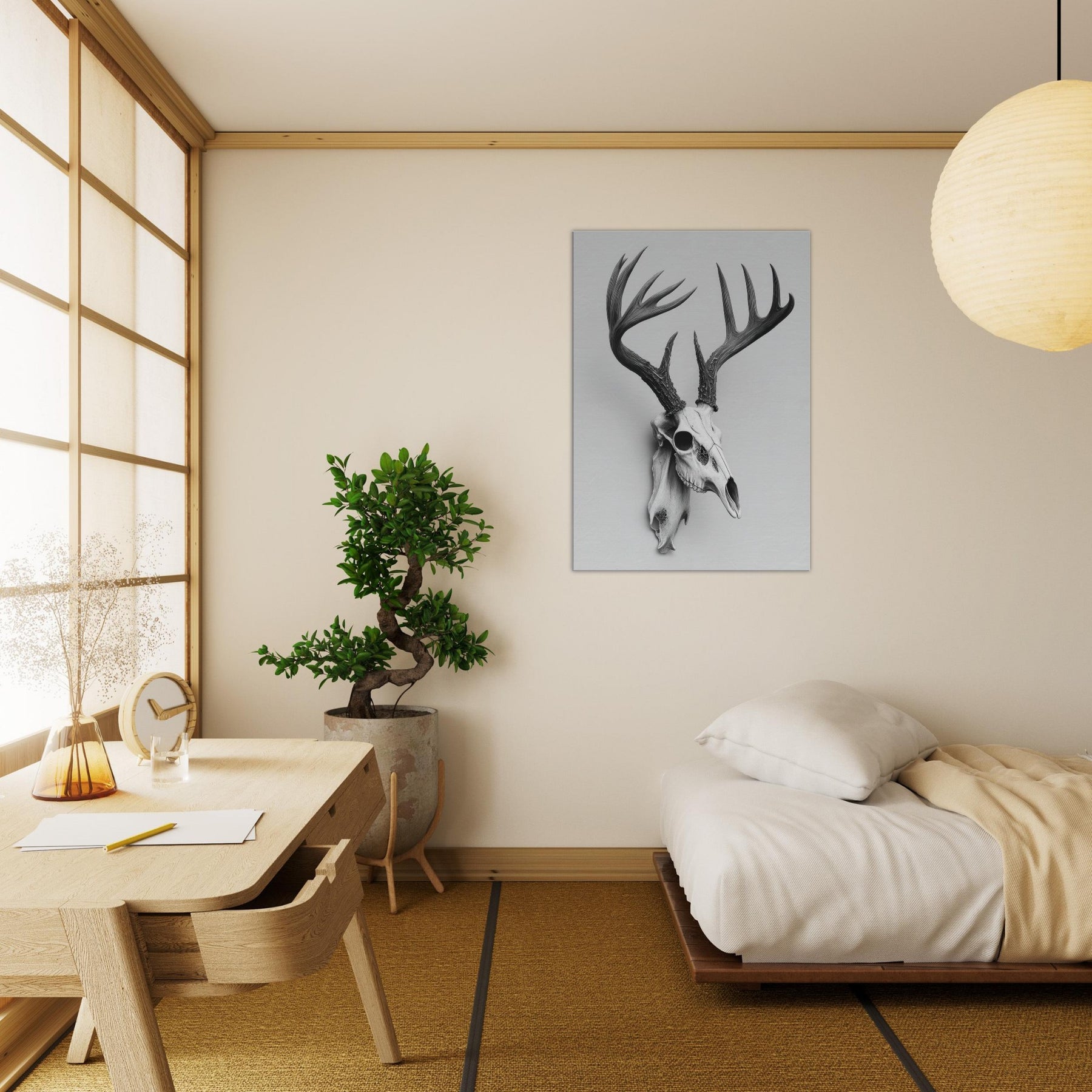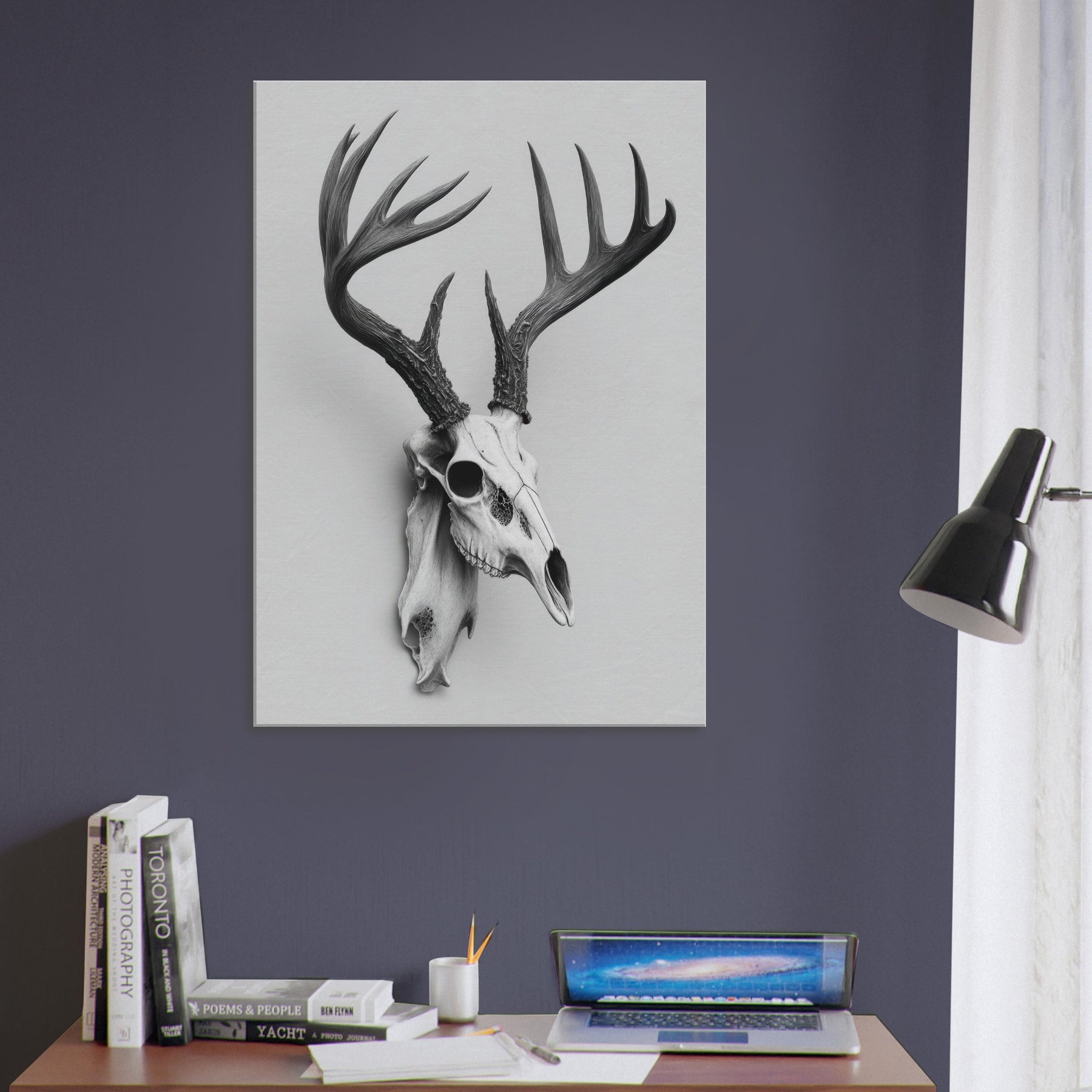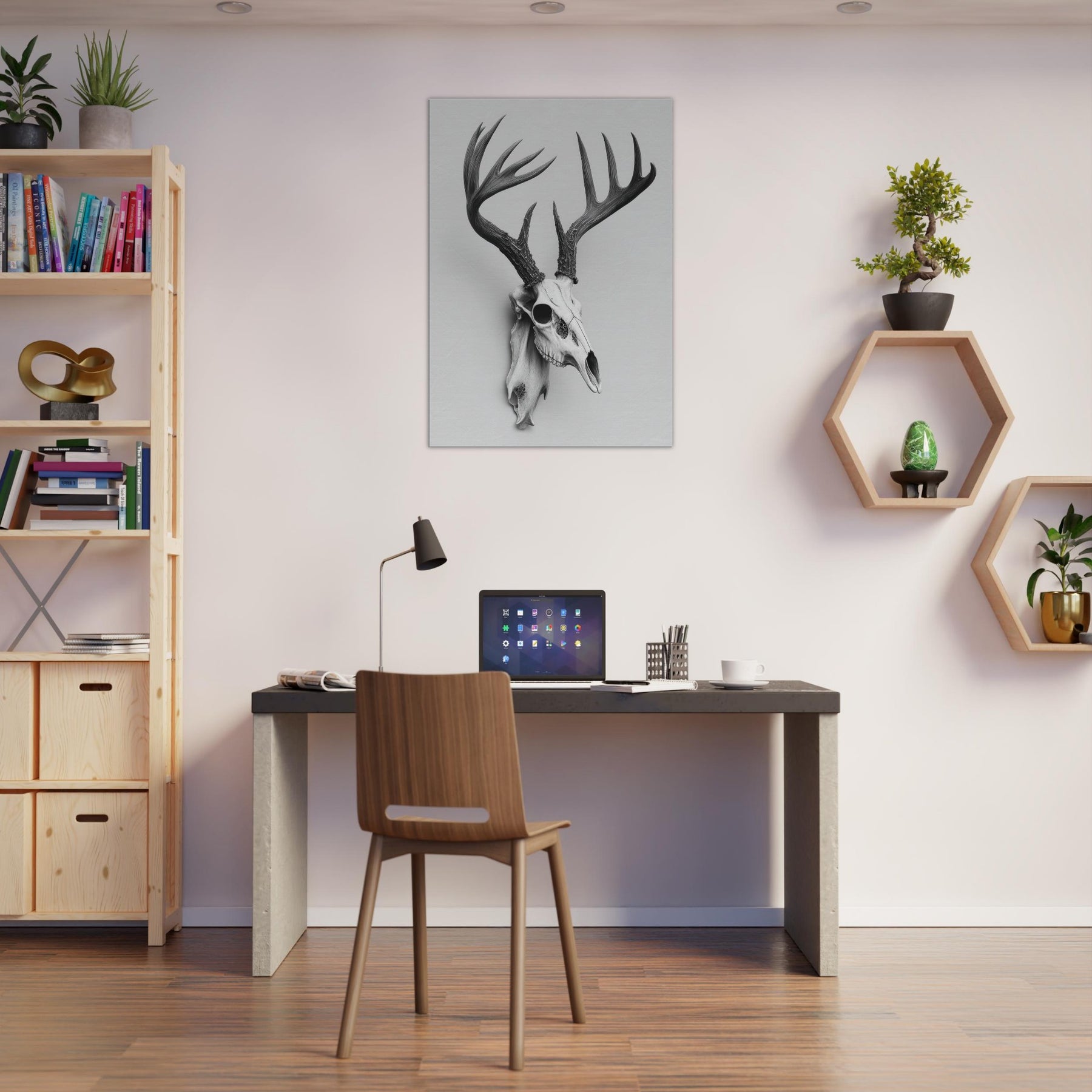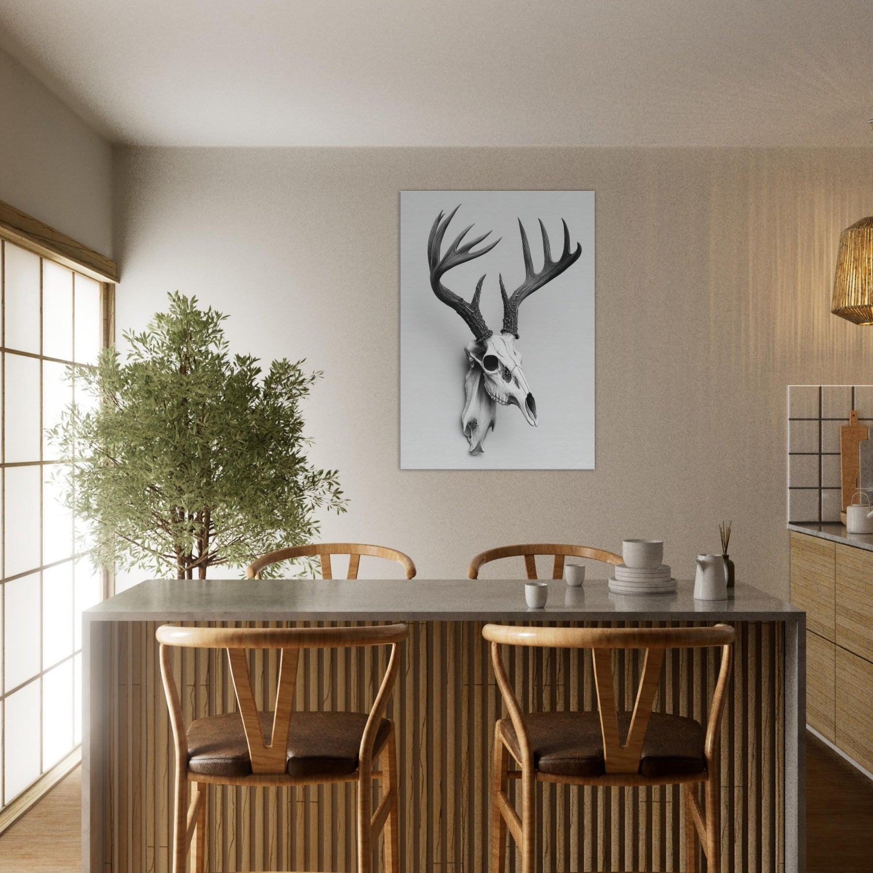 Hang it where natural light drifts across the wall, and watch the space breathe: a modern, contemplative mood for living rooms or offices, where art becomes a conversation starter and the air feels cooler, clearer, more alive. The central subject is a stag skull.