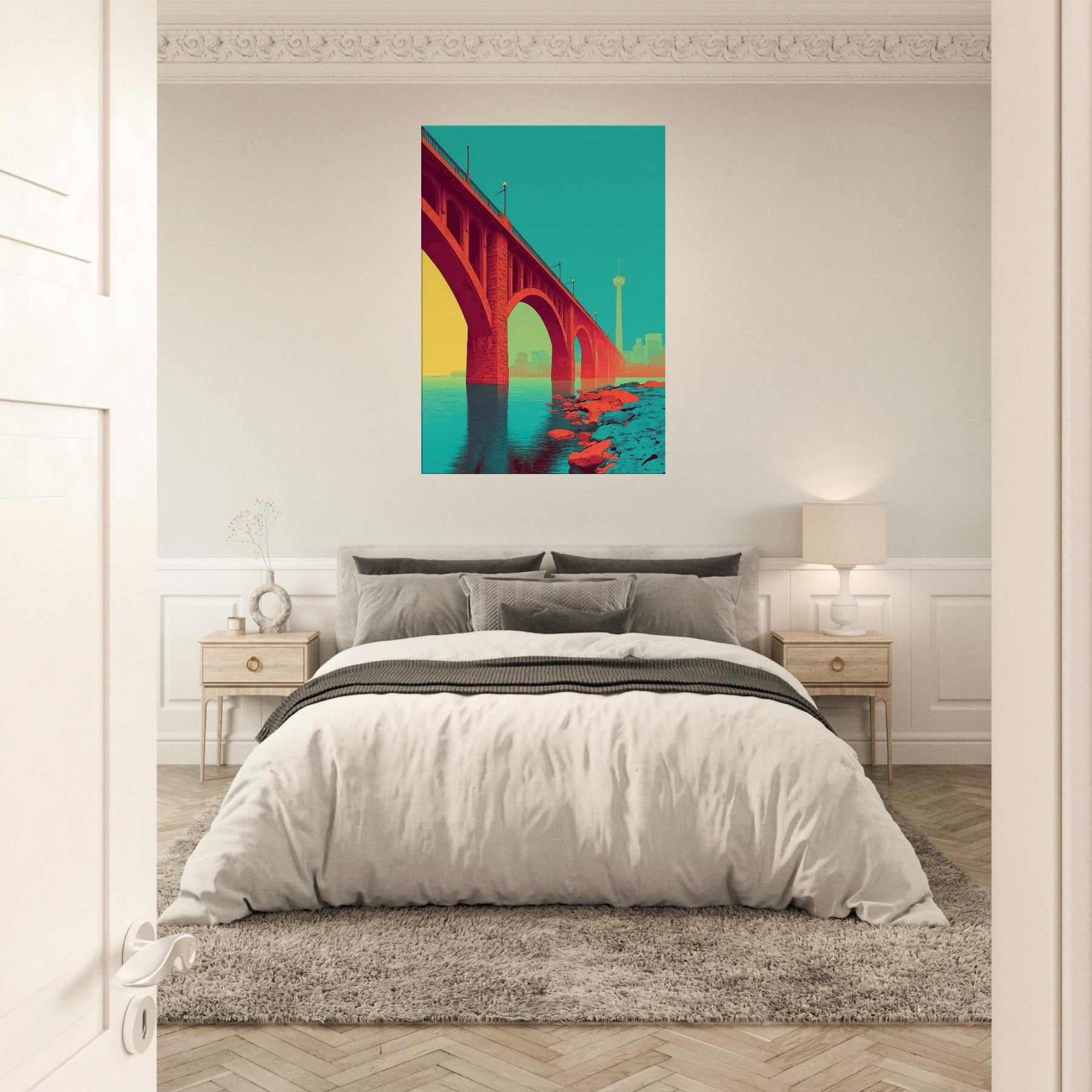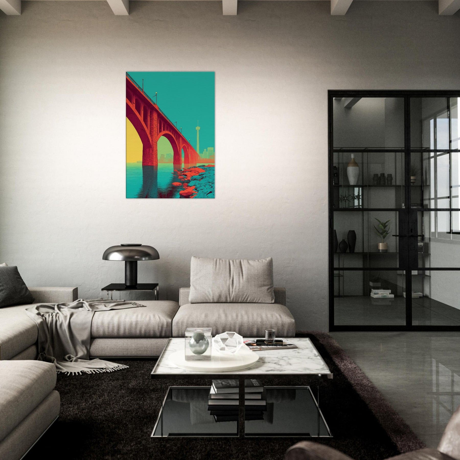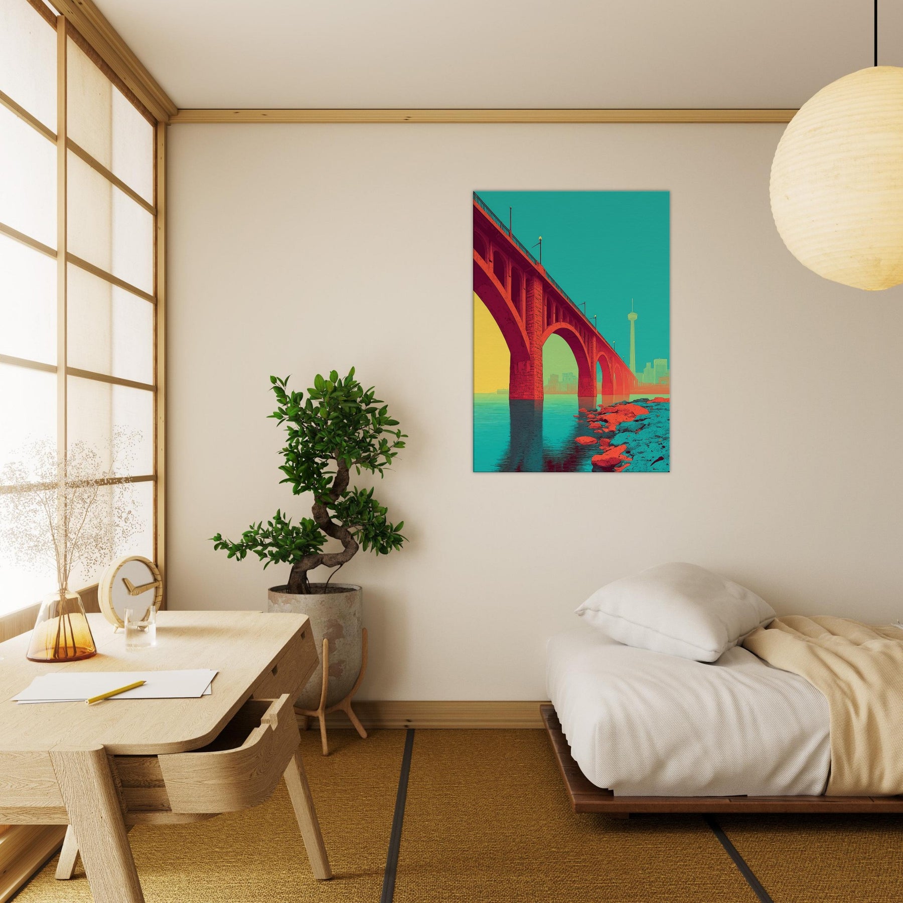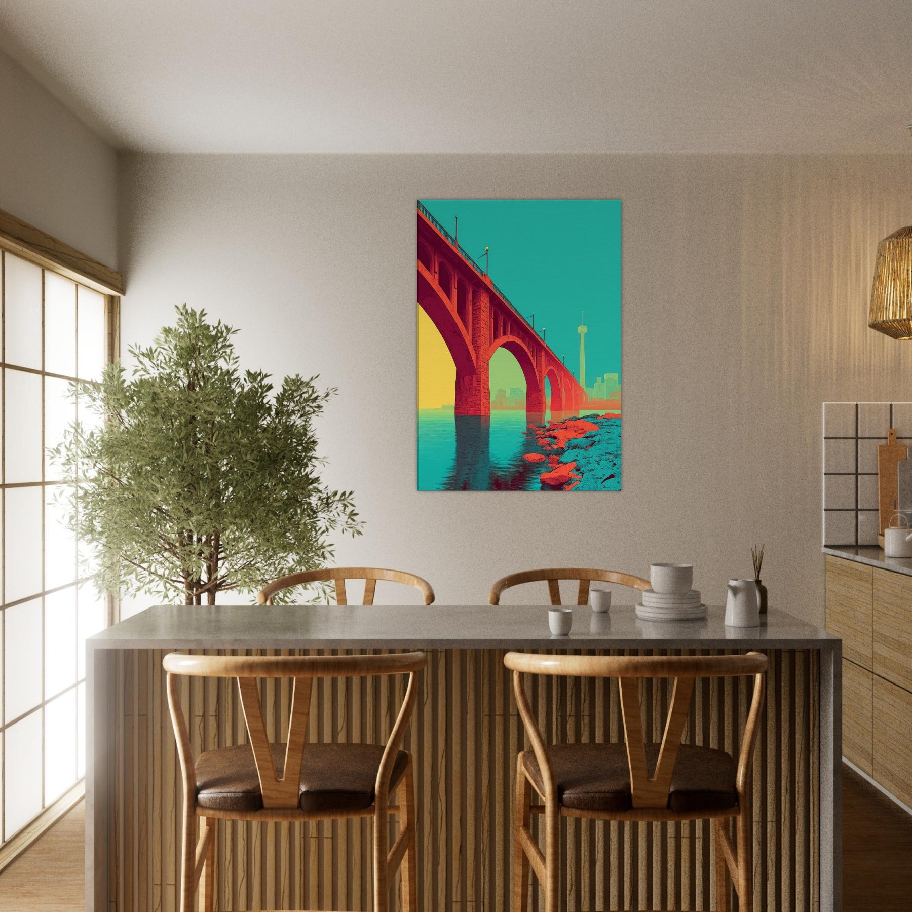 An Arched Stone Bridge sweeps across a dreamlike waterfront, its sandstone arches rendered in radiant, unexpected hues. The abstract composition dissolves edges between water, sky, and skyline, creating a mood of quiet urban reverie. Warm reds contrast with a turquoise expanse, inviting warmth into a living room or workspace. This piece anchors space with architectural rhythm and a soft energy that travels with you balanced, bold, and endlessly evocative of cities you can feel rather than see.