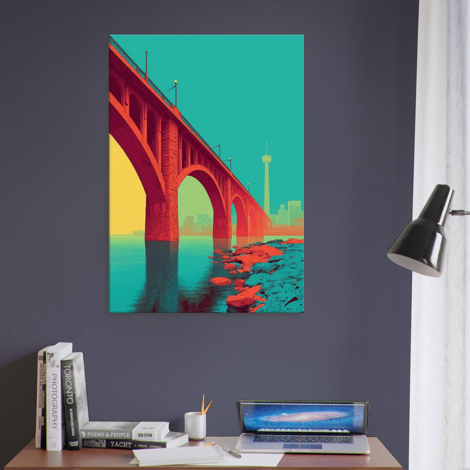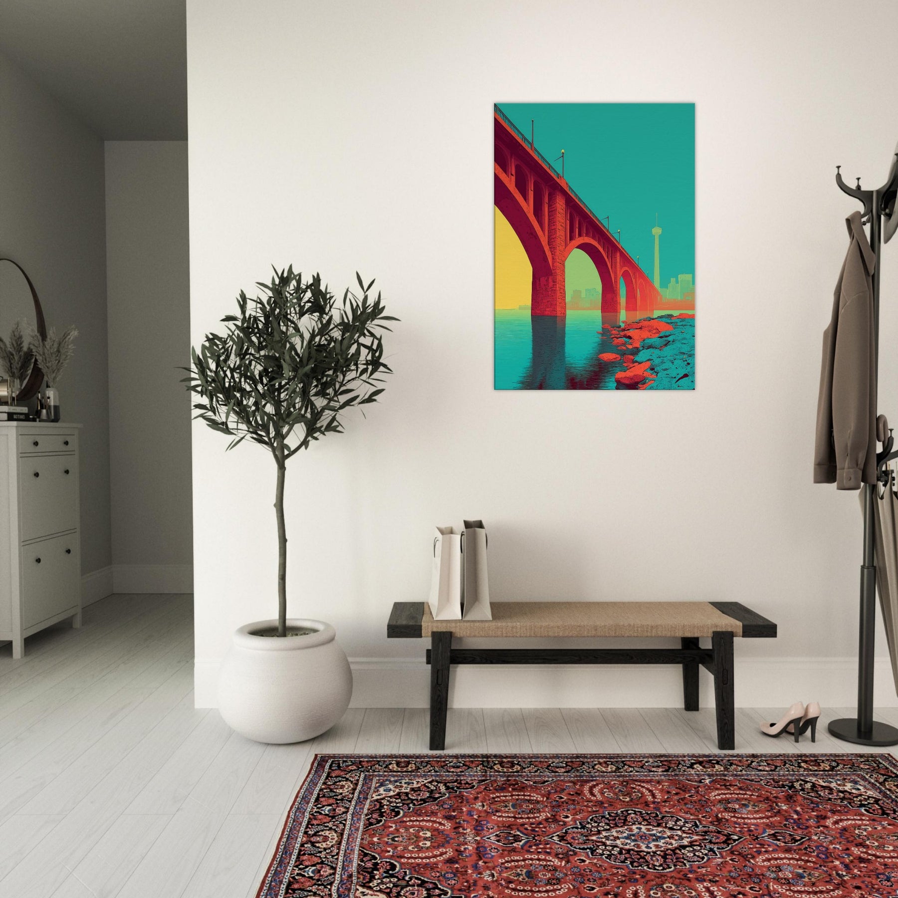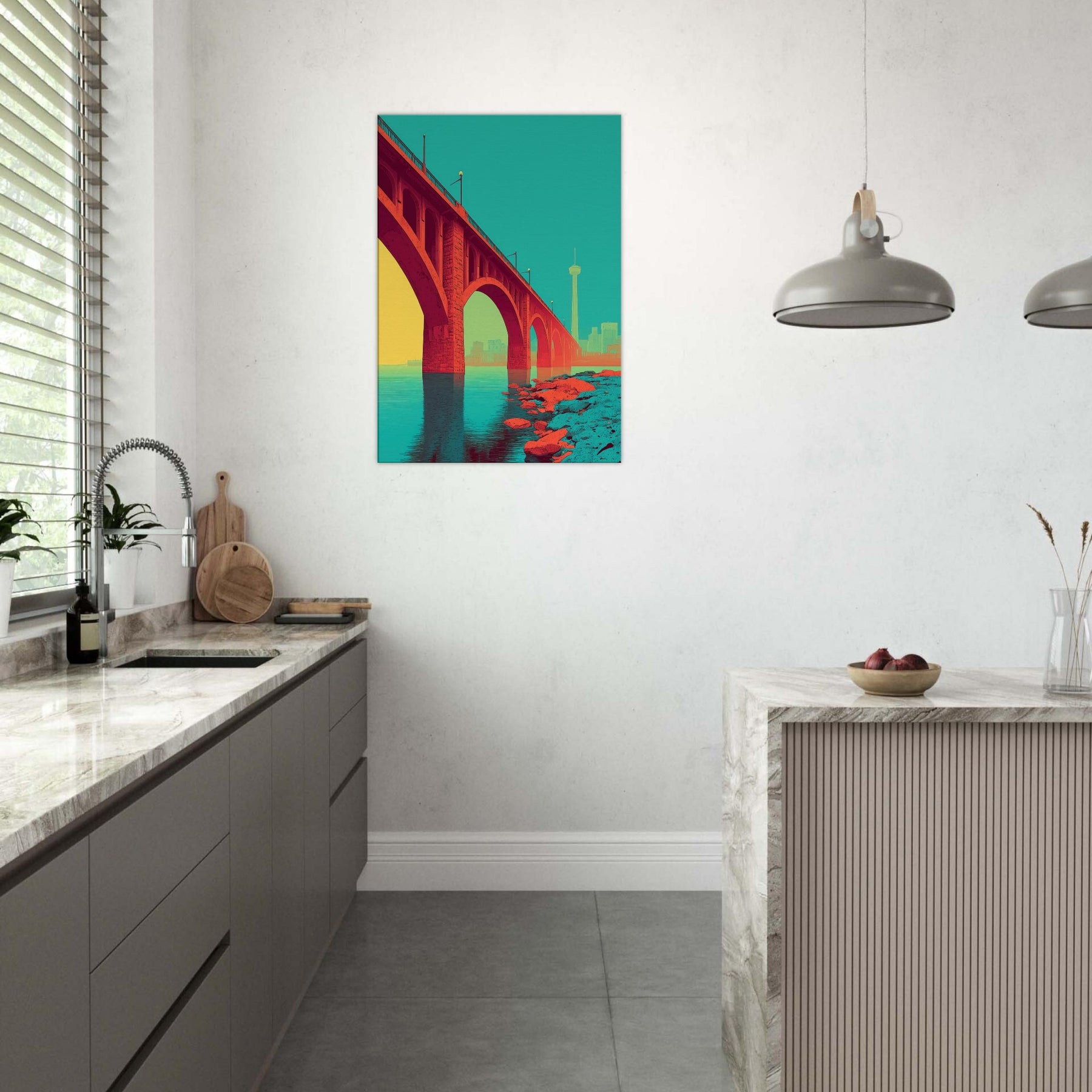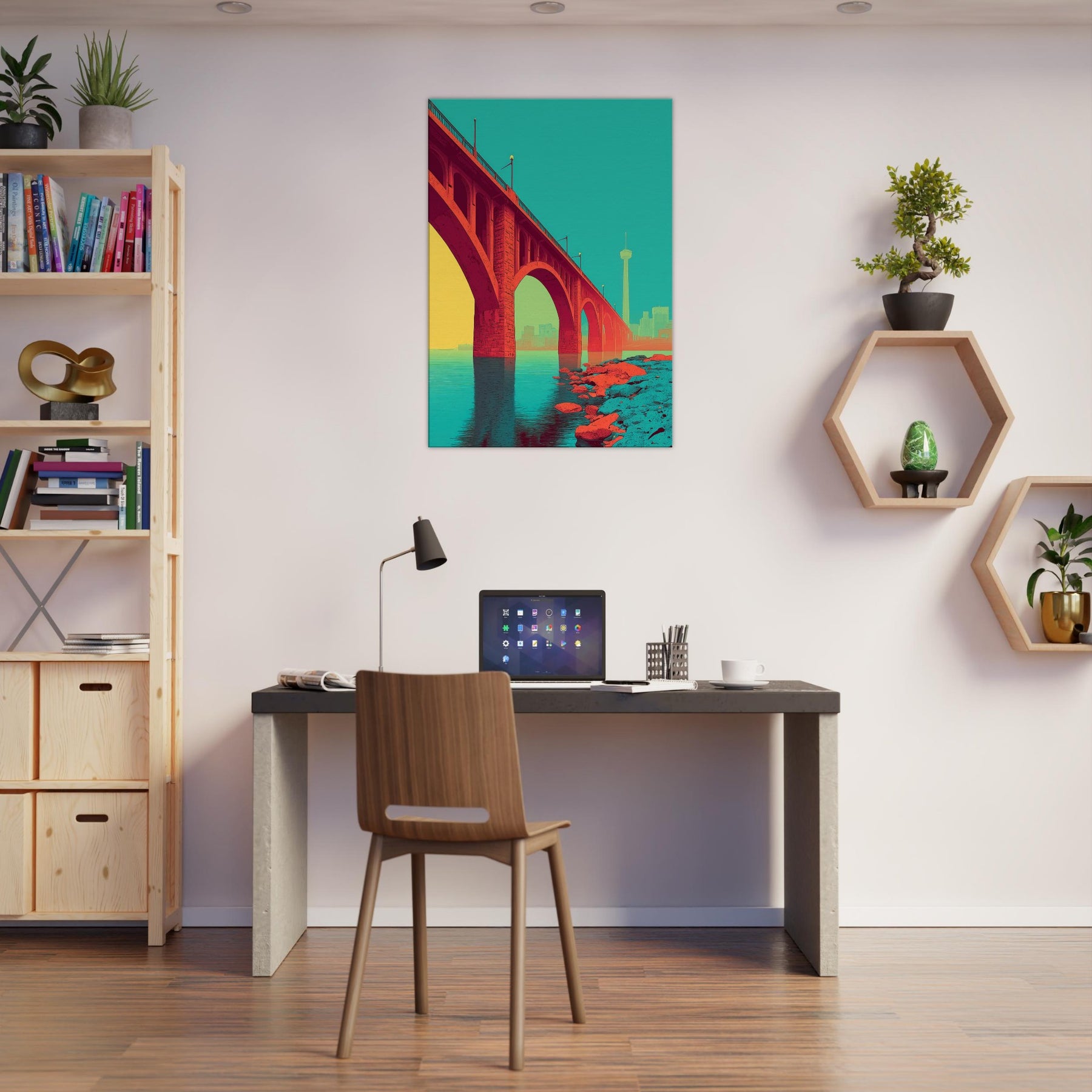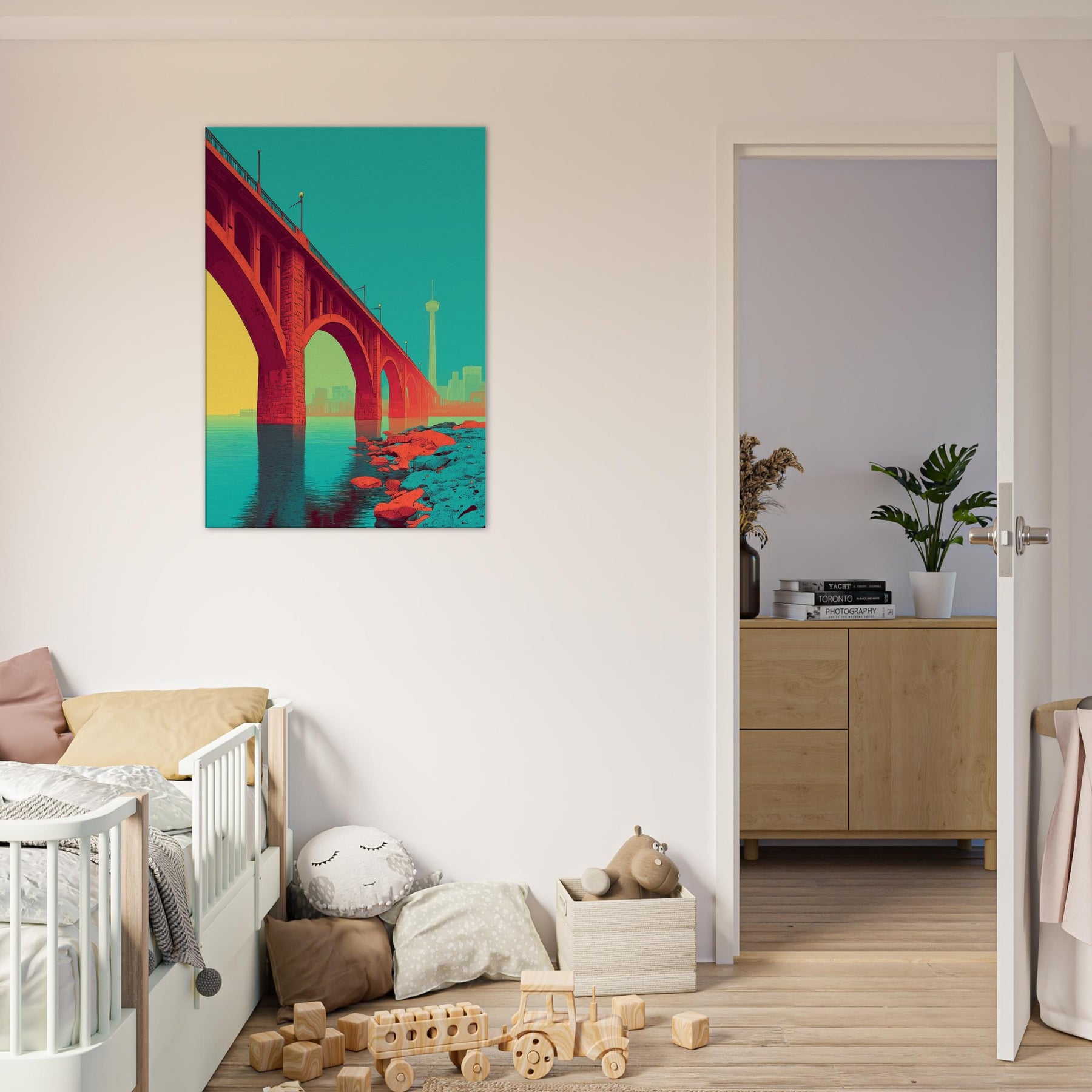 An Arched Stone Bridge sweeps across a dreamlike waterfront, its sandstone arches rendered in radiant, unexpected hues. The abstract composition dissolves edges between water, sky, and skyline, creating a mood of quiet urban reverie. Warm reds contrast with a turquoise expanse, inviting warmth into a living room or workspace. This piece anchors space with architectural rhythm and a soft energy that travels with you balanced, bold, and endlessly evocative of cities you can feel rather than see.