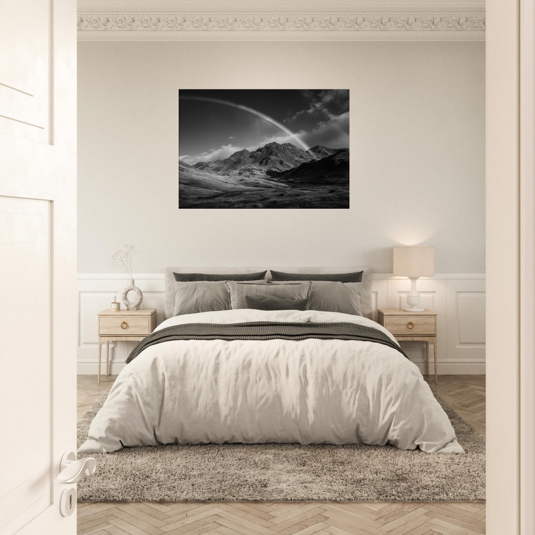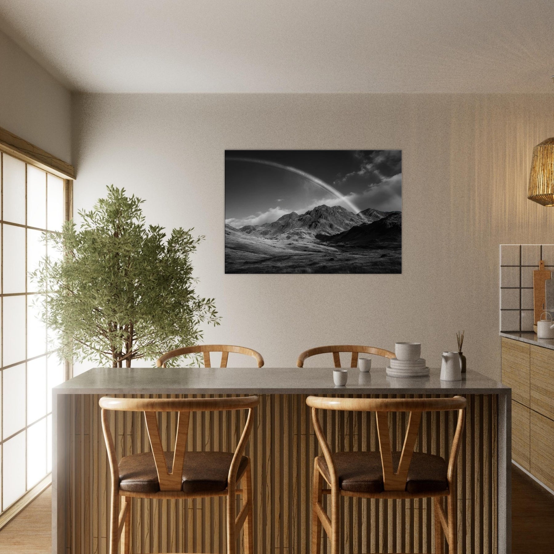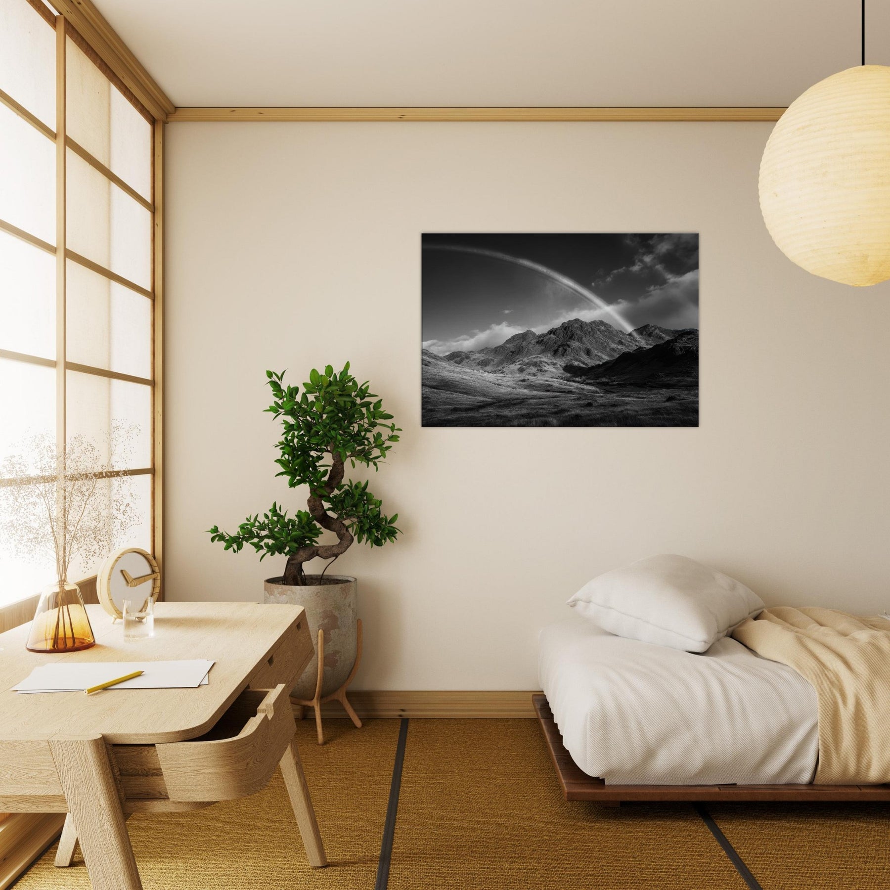Rainbow Minimal, the Primary Subject, unfolds in black and white as a quiet symphony of light and shadow. The arc of a distant rainbow hovers above rugged mountains, turning a stark into a contemplative backdrop for living spaces. This print invites calm, focus, and breath perfect above a sofa, desk, or bed where monochrome textures and subtle gradients create timeless elegance. Elevate the room with a sense of serenity and wonder, turning everyday moments into artful stillness.