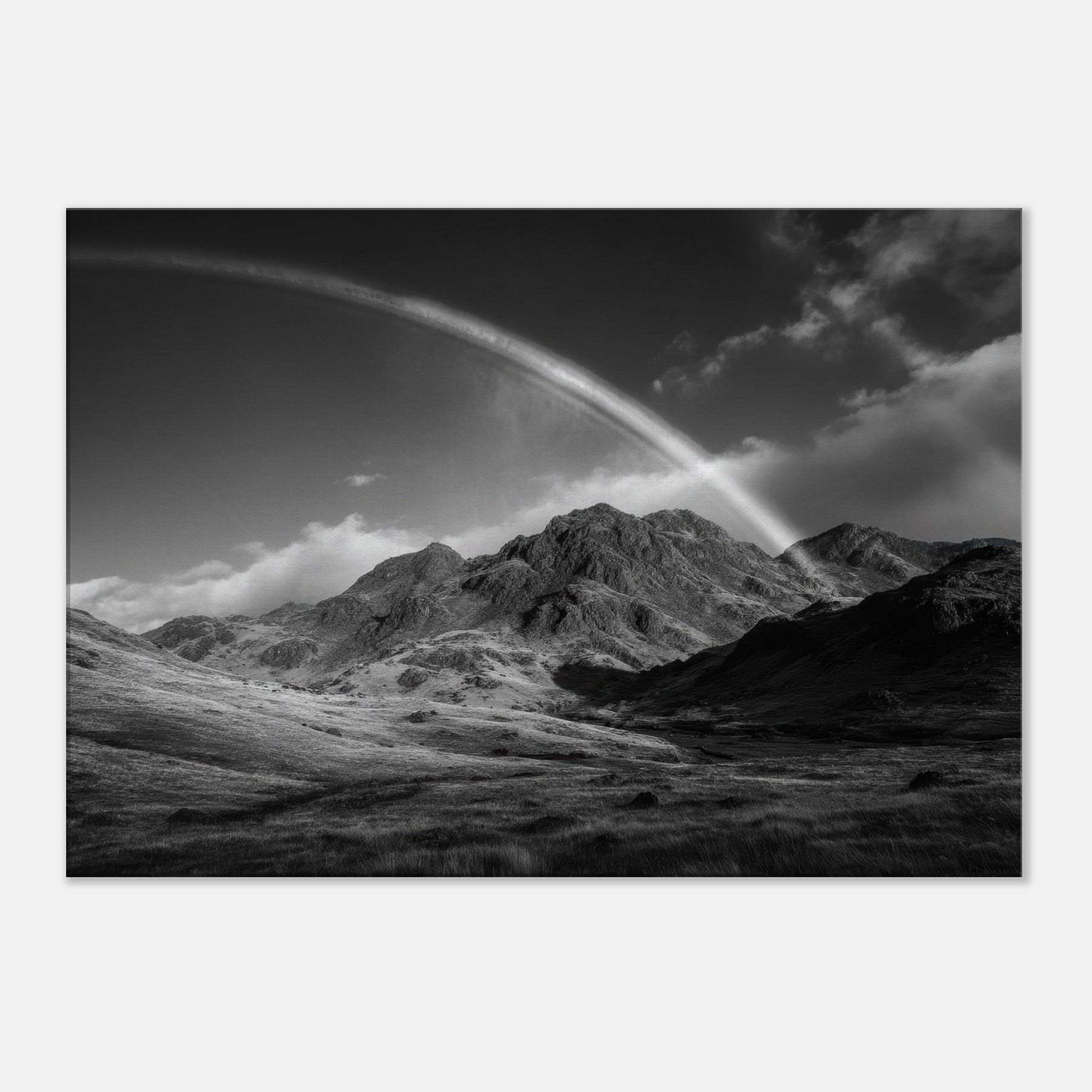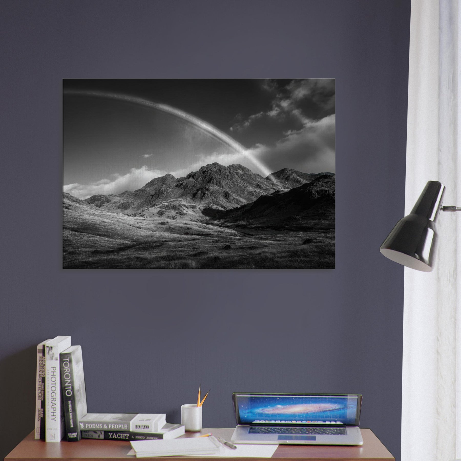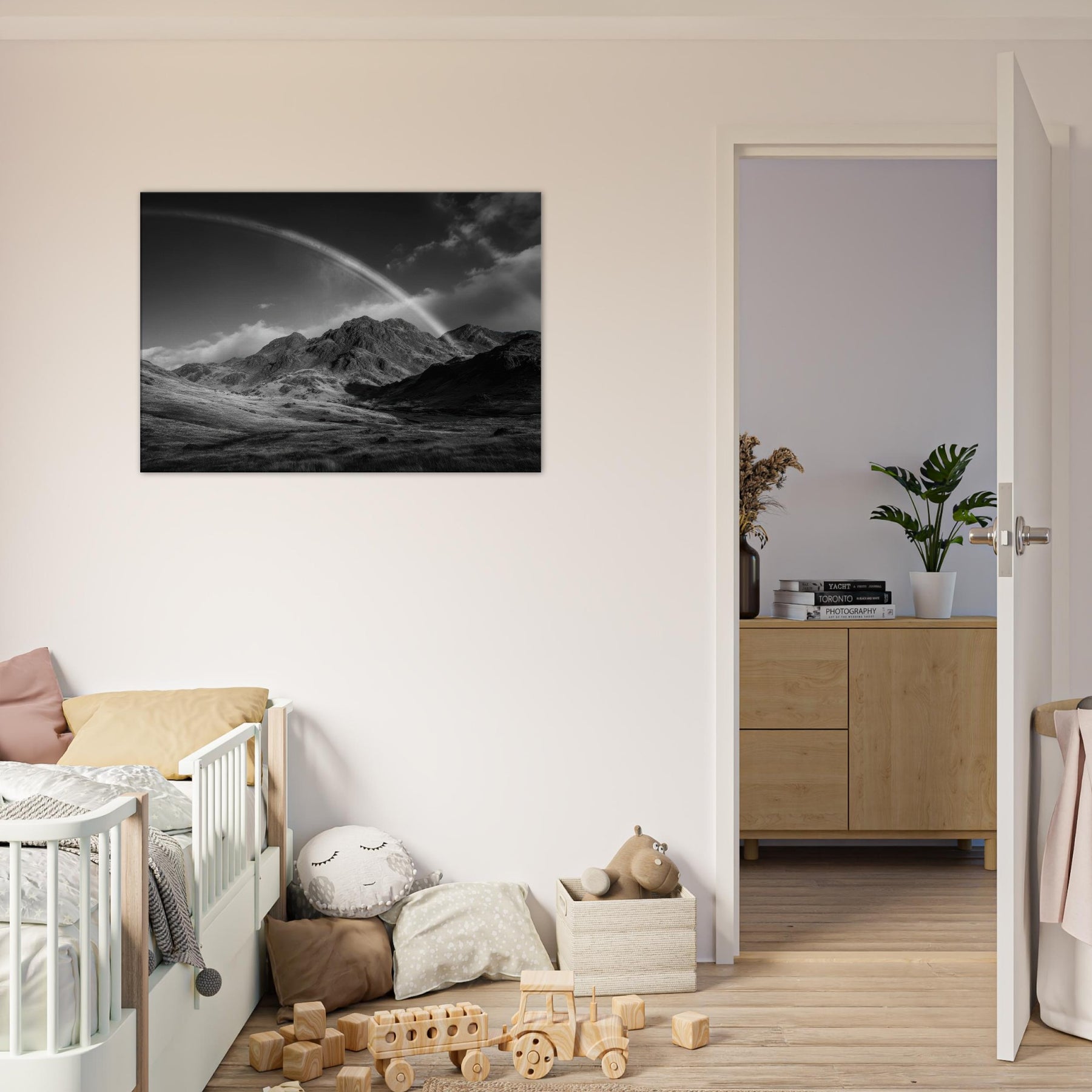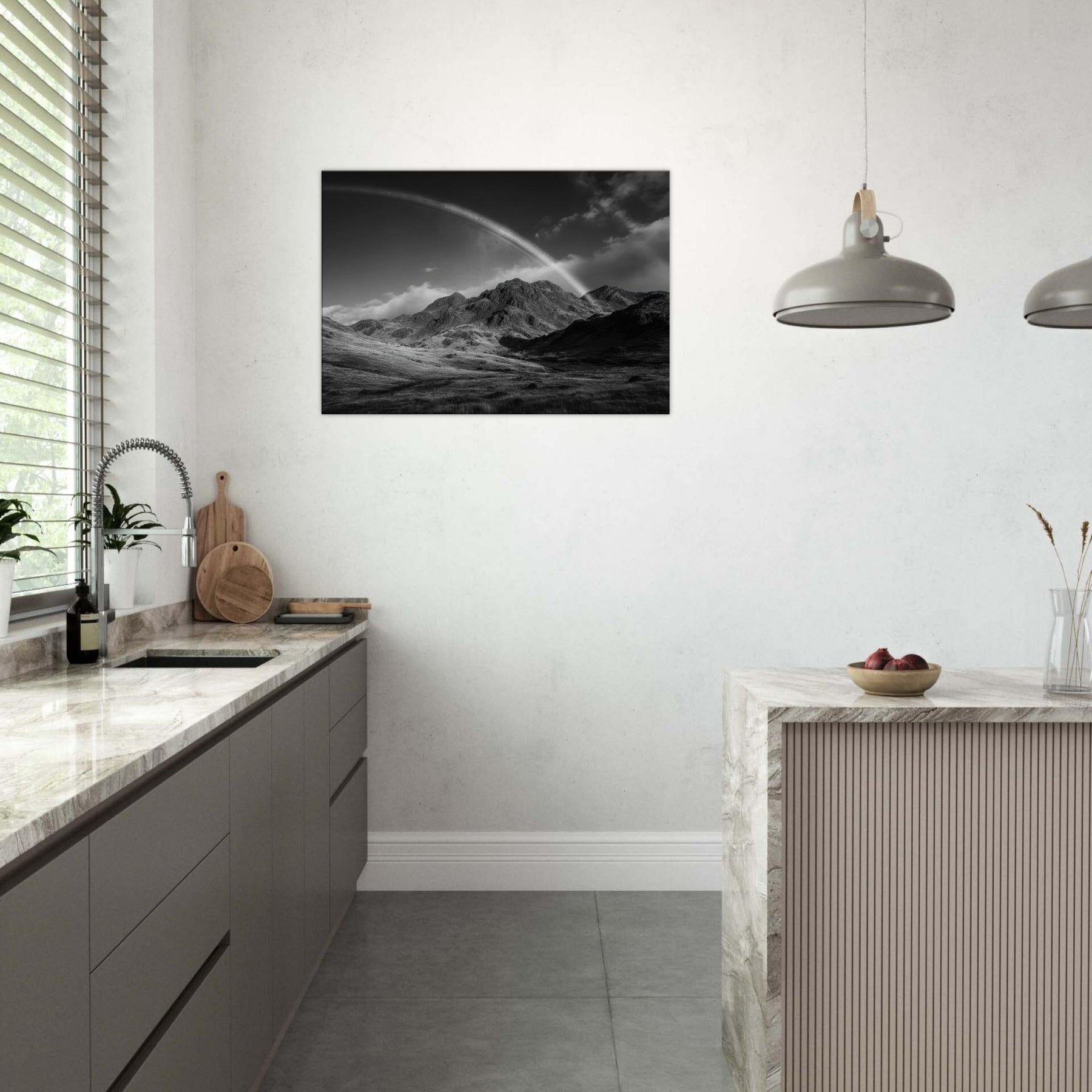 Rainbow Minimal, the Primary Subject, unfolds in black and white as a quiet symphony of light and shadow. The arc of a distant rainbow hovers above rugged mountains, turning a stark into a contemplative backdrop for living spaces. This print invites calm, focus, and breath perfect above a sofa, desk, or bed where monochrome textures and subtle gradients create timeless elegance. Elevate the room with a sense of serenity and wonder, turning everyday moments into artful stillness.