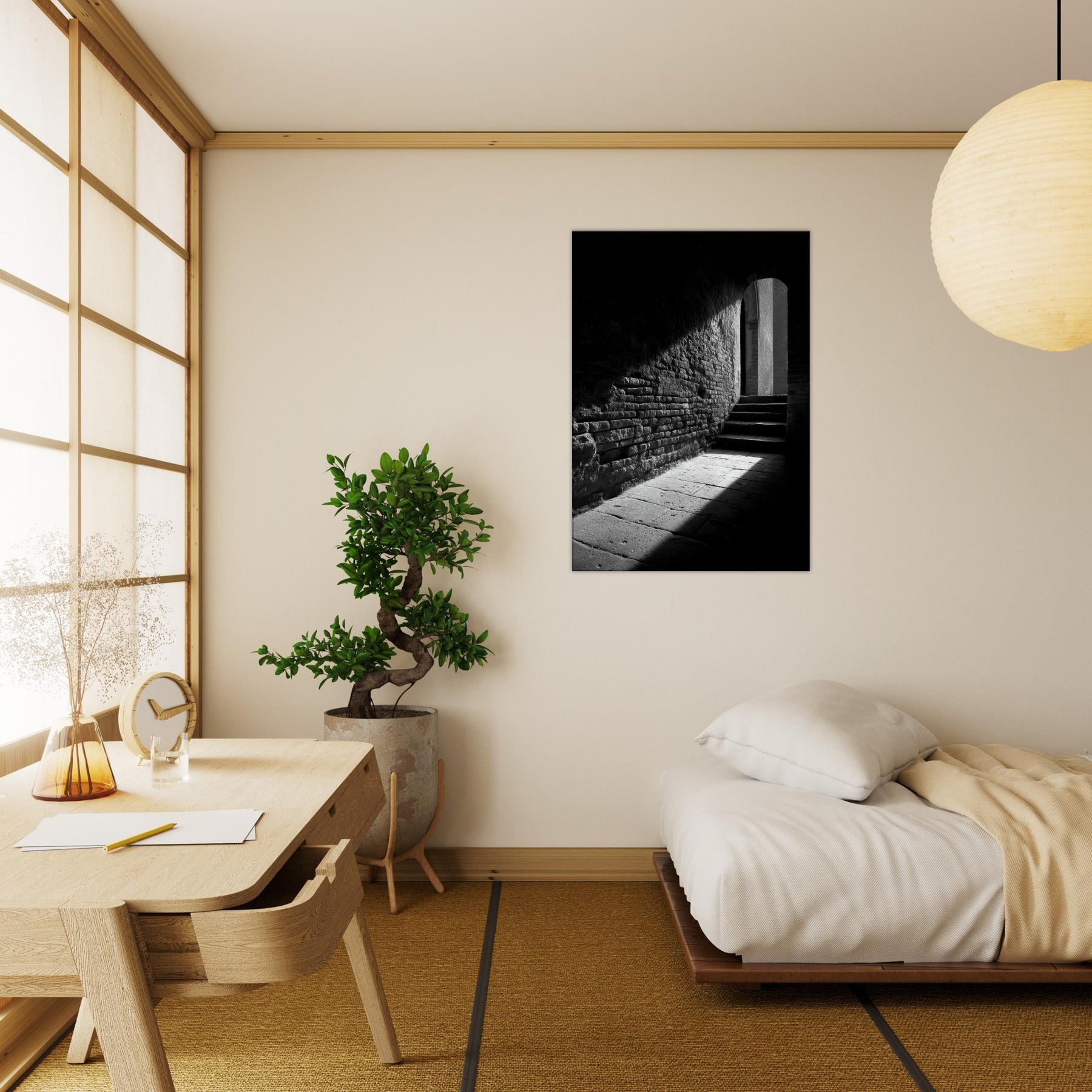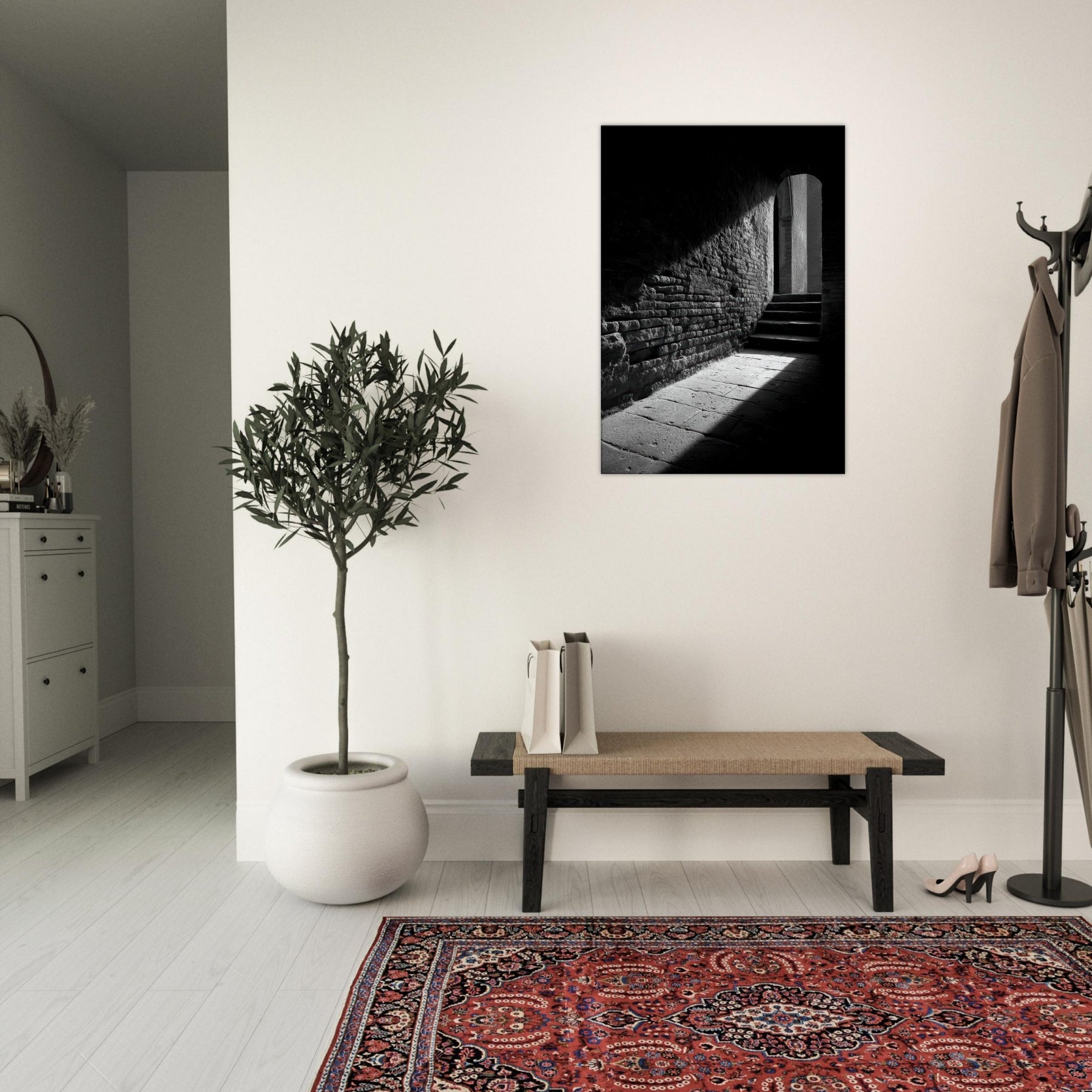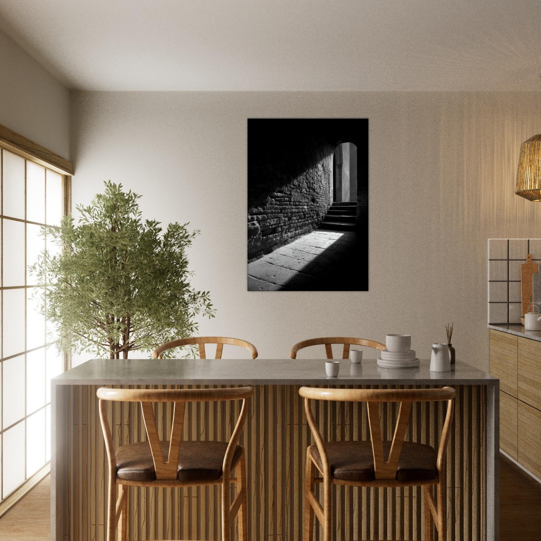 An arresting study in shadow and form, this black and white capture centers a weathered Old City Doorway where time seems to pause between sunlit steps and carved stone. The play of light against rough brick and smooth arch invites quiet reflection, turning a hallway into a story and a doorway into a focal point.