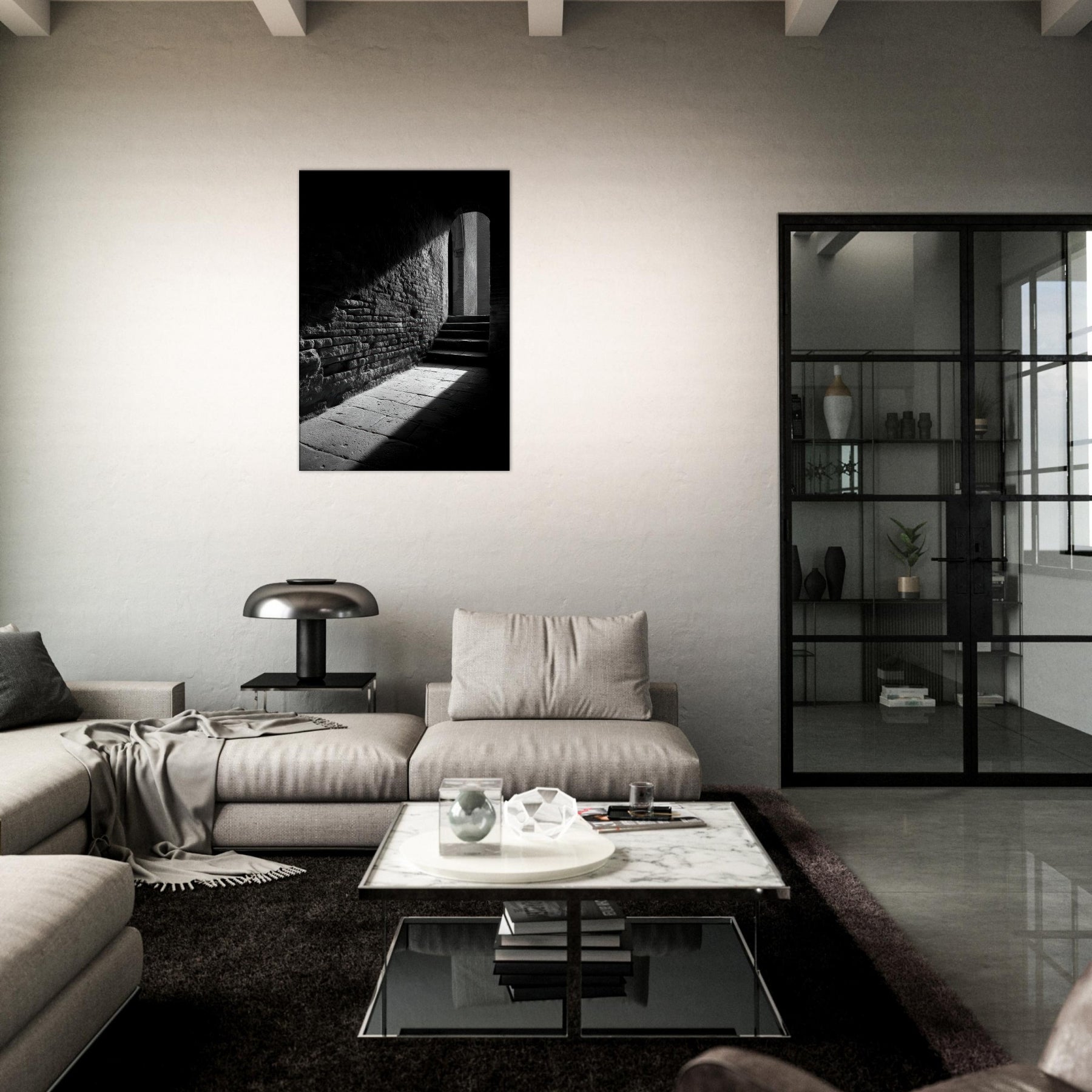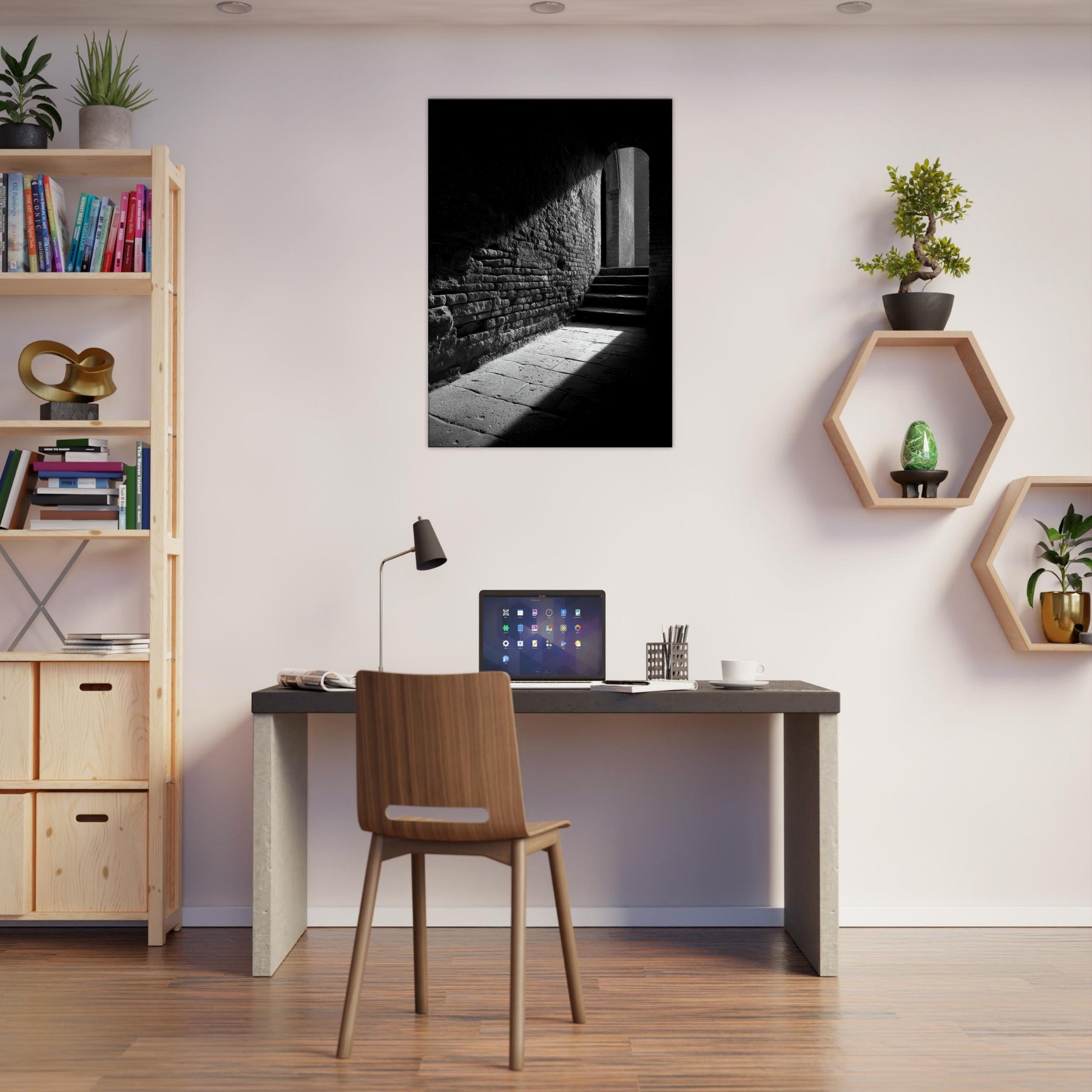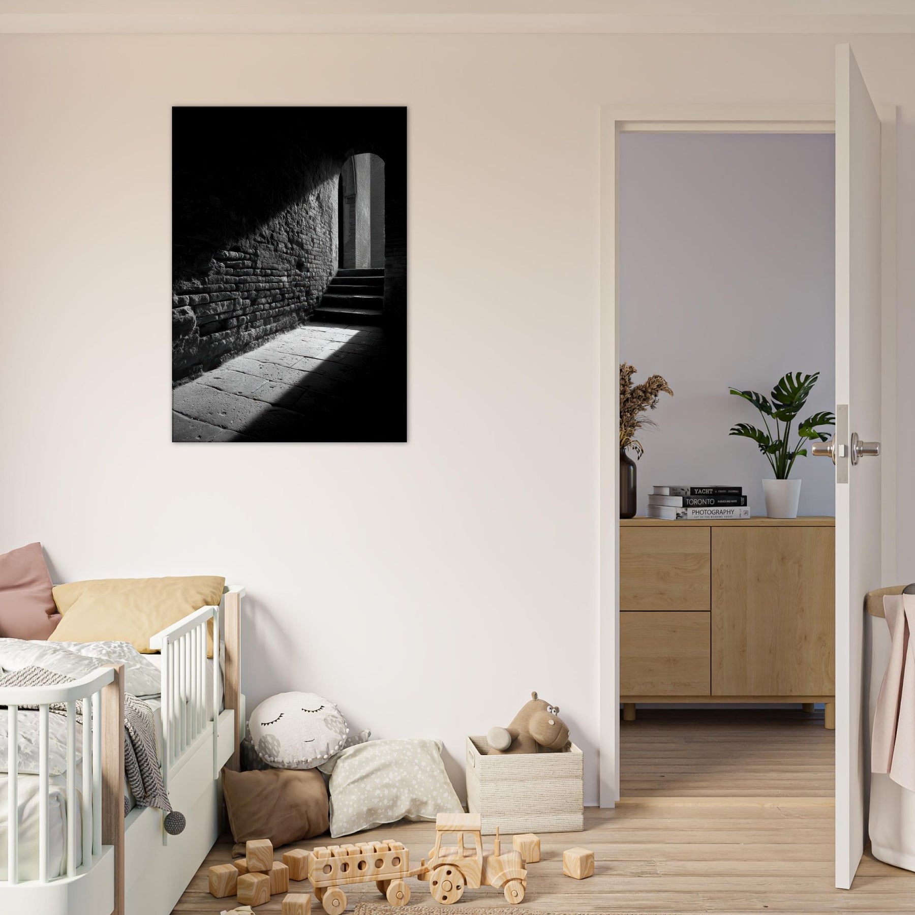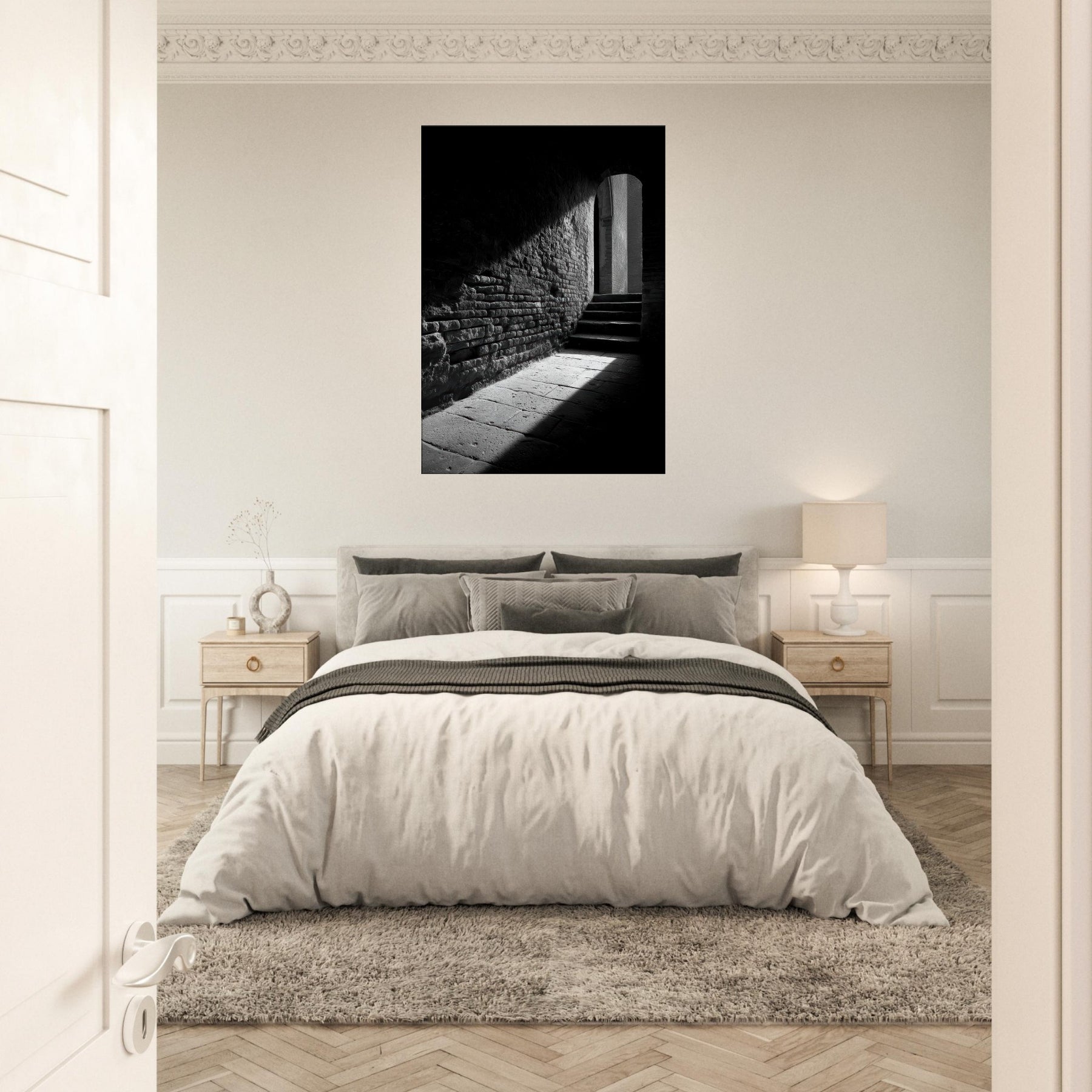 An arresting study in shadow and form, this black and white capture centers a weathered Old City Doorway where time seems to pause between sunlit steps and carved stone. The play of light against rough brick and smooth arch invites quiet reflection, turning a hallway into a story and a doorway into a focal point.