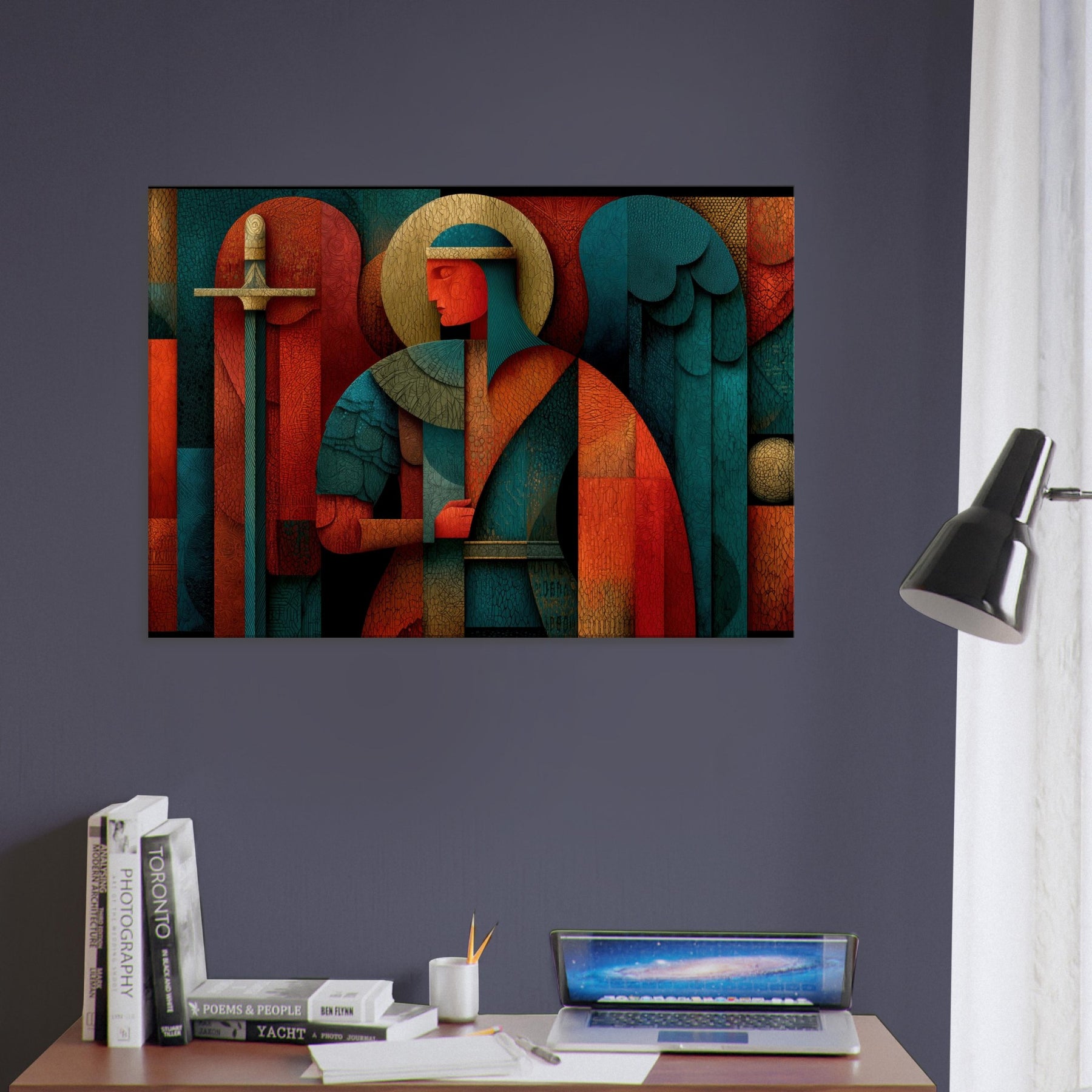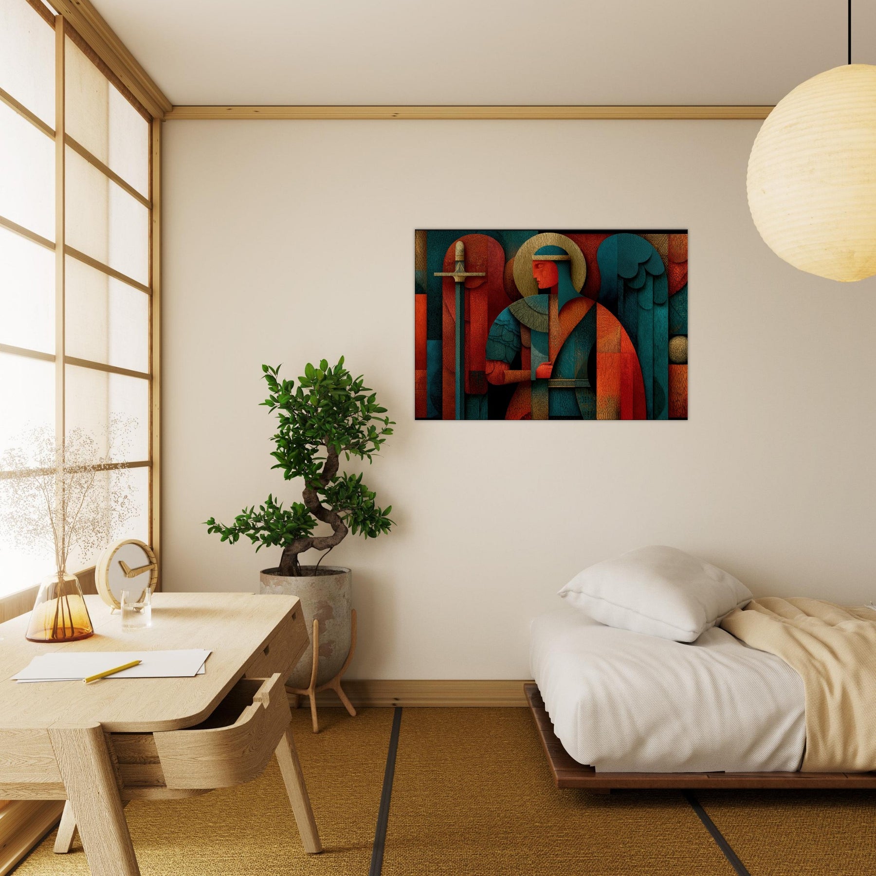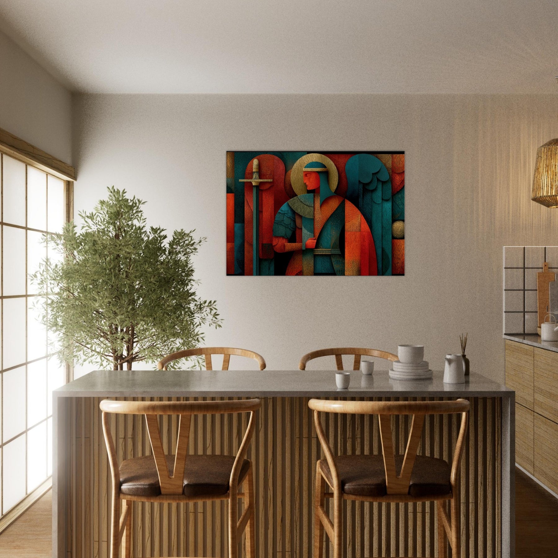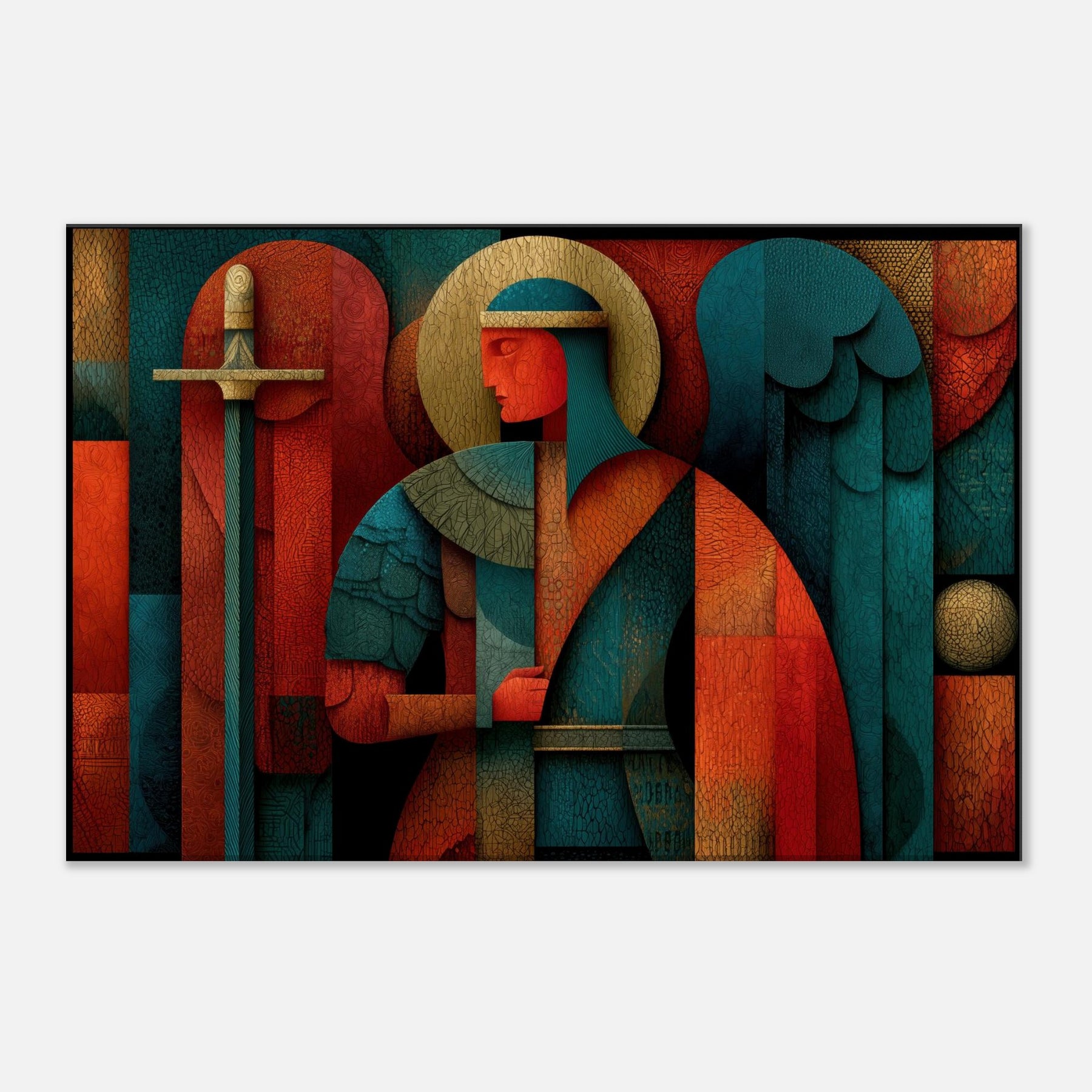 Archangel Michael leaps from the filigree of color into your room, a mystical guardian rendered in abstract geometry. The figure holds a sword and scales that glint through layers of warm copper, teal, and deep crimson, while a halo of pale gold circles above a quiet, ceremonial glow. Every crackling edge and layered surface invites touch and contemplation, turning walls into a sanctuary of presence and quiet power. This piece breathes light and perfume into a living space, guiding atmosphere with reverent grace. The central subject is Archangel Michael (Sword & Scales).