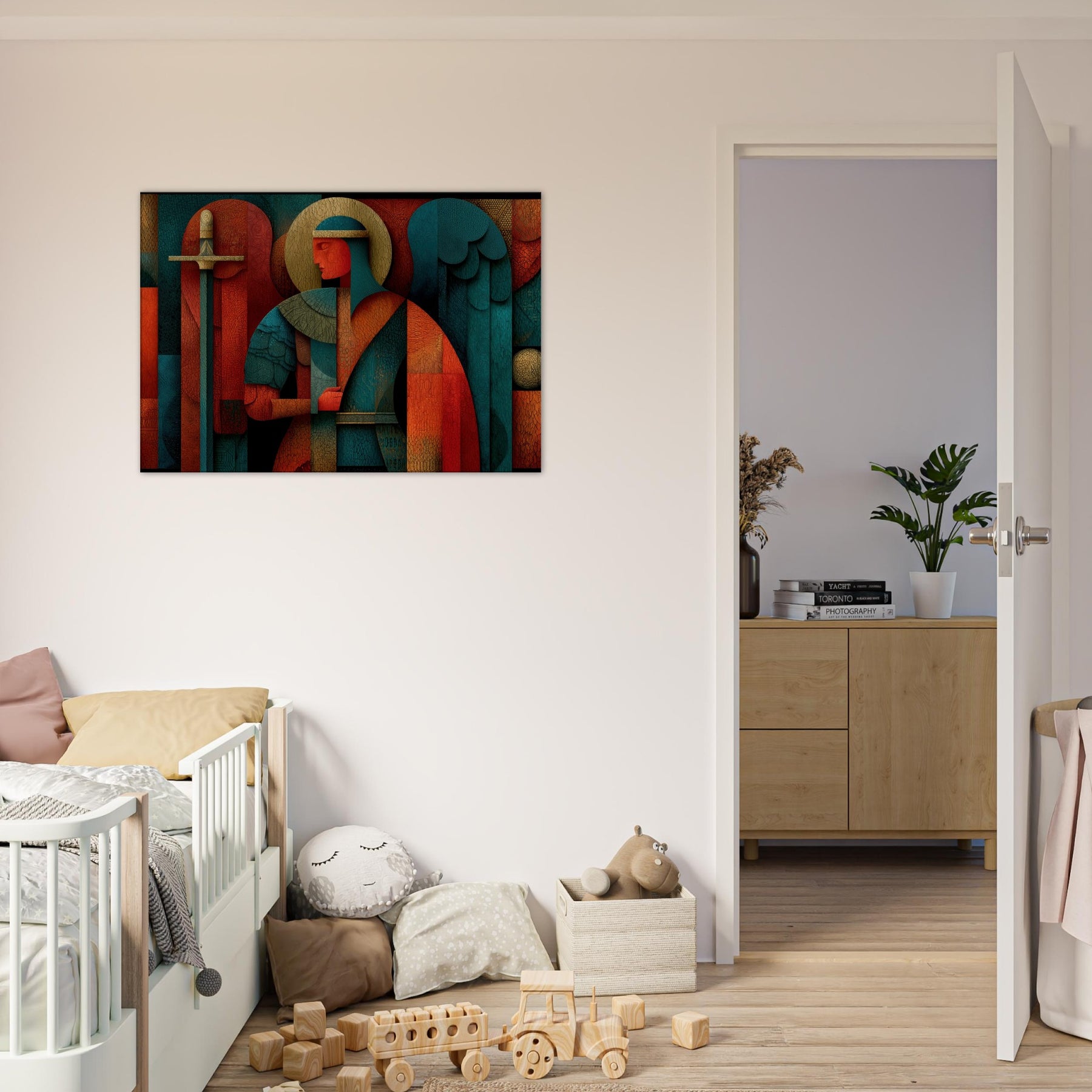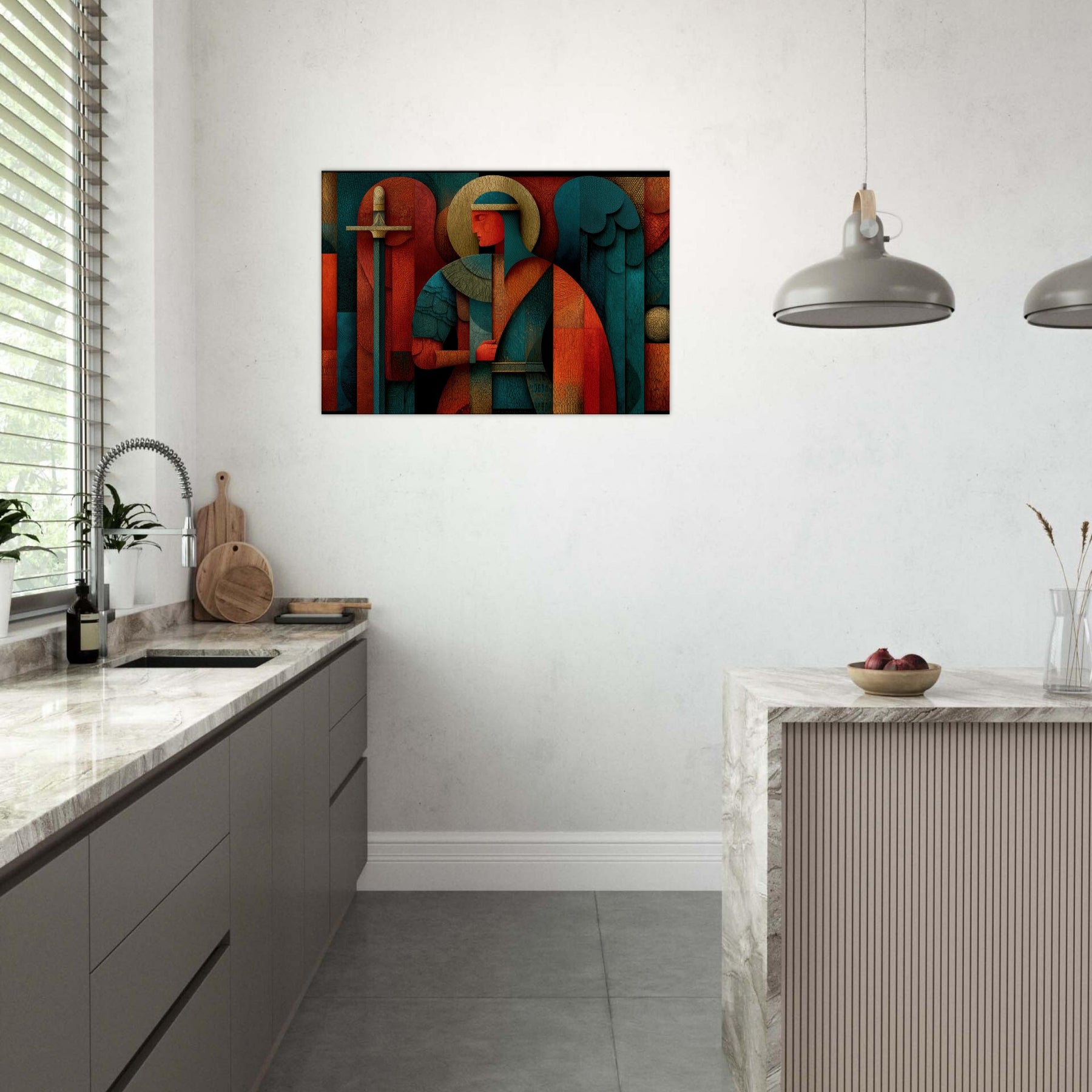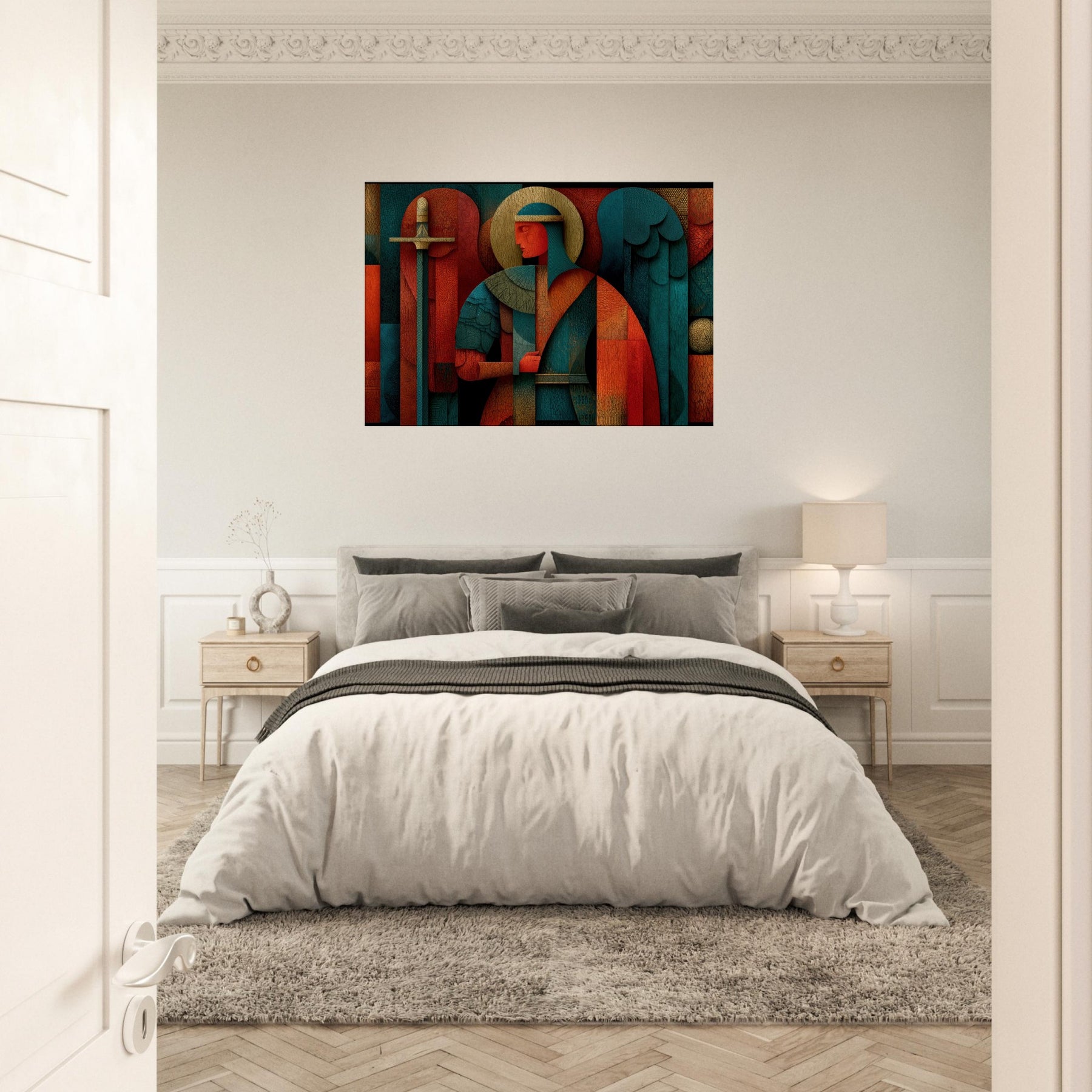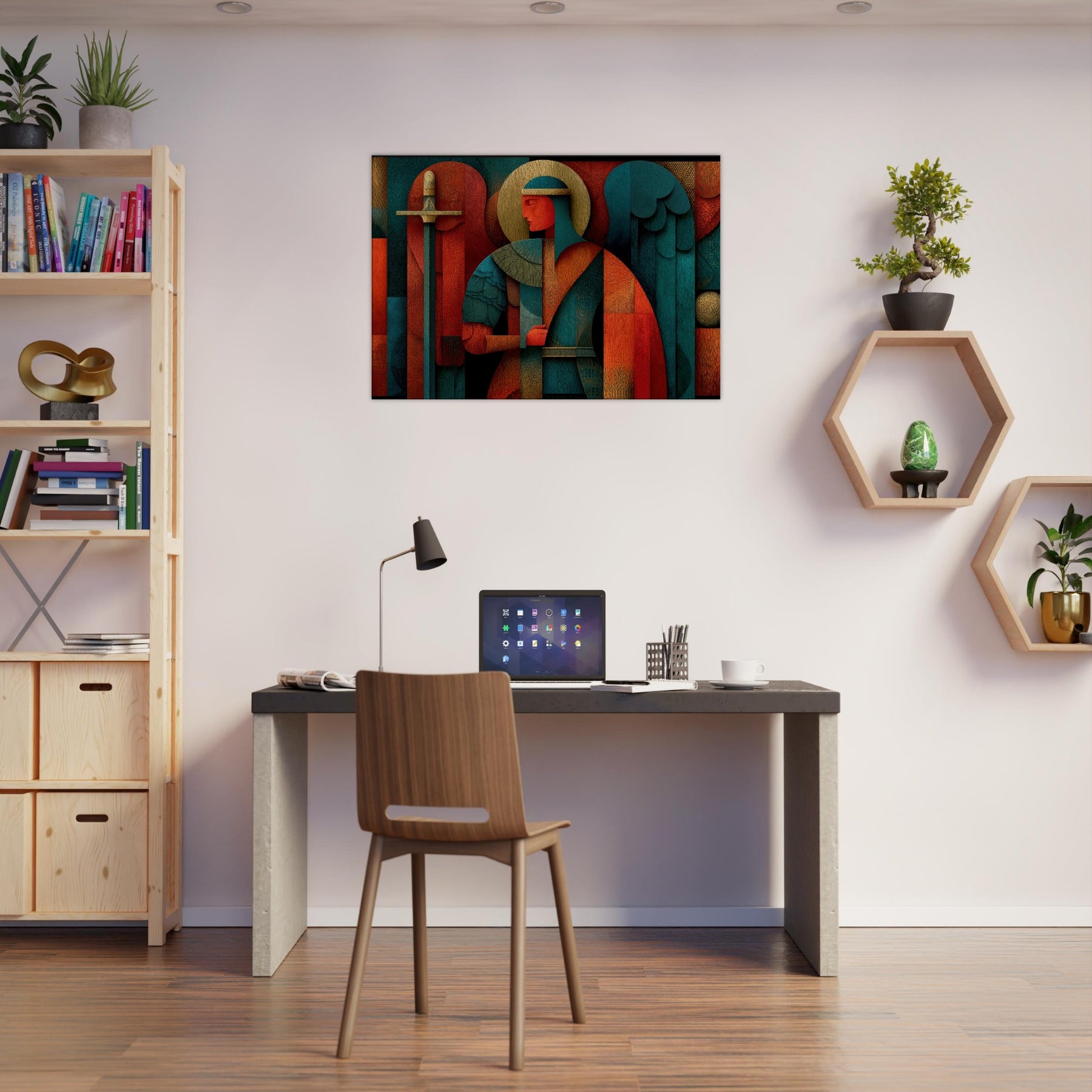 Archangel Michael leaps from the filigree of color into your room, a mystical guardian rendered in abstract geometry. The figure holds a sword and scales that glint through layers of warm copper, teal, and deep crimson, while a halo of pale gold circles above a quiet, ceremonial glow. Every crackling edge and layered surface invites touch and contemplation, turning walls into a sanctuary of presence and quiet power. This piece breathes light and perfume into a living space, guiding atmosphere with reverent grace. The central subject is Archangel Michael (Sword & Scales).