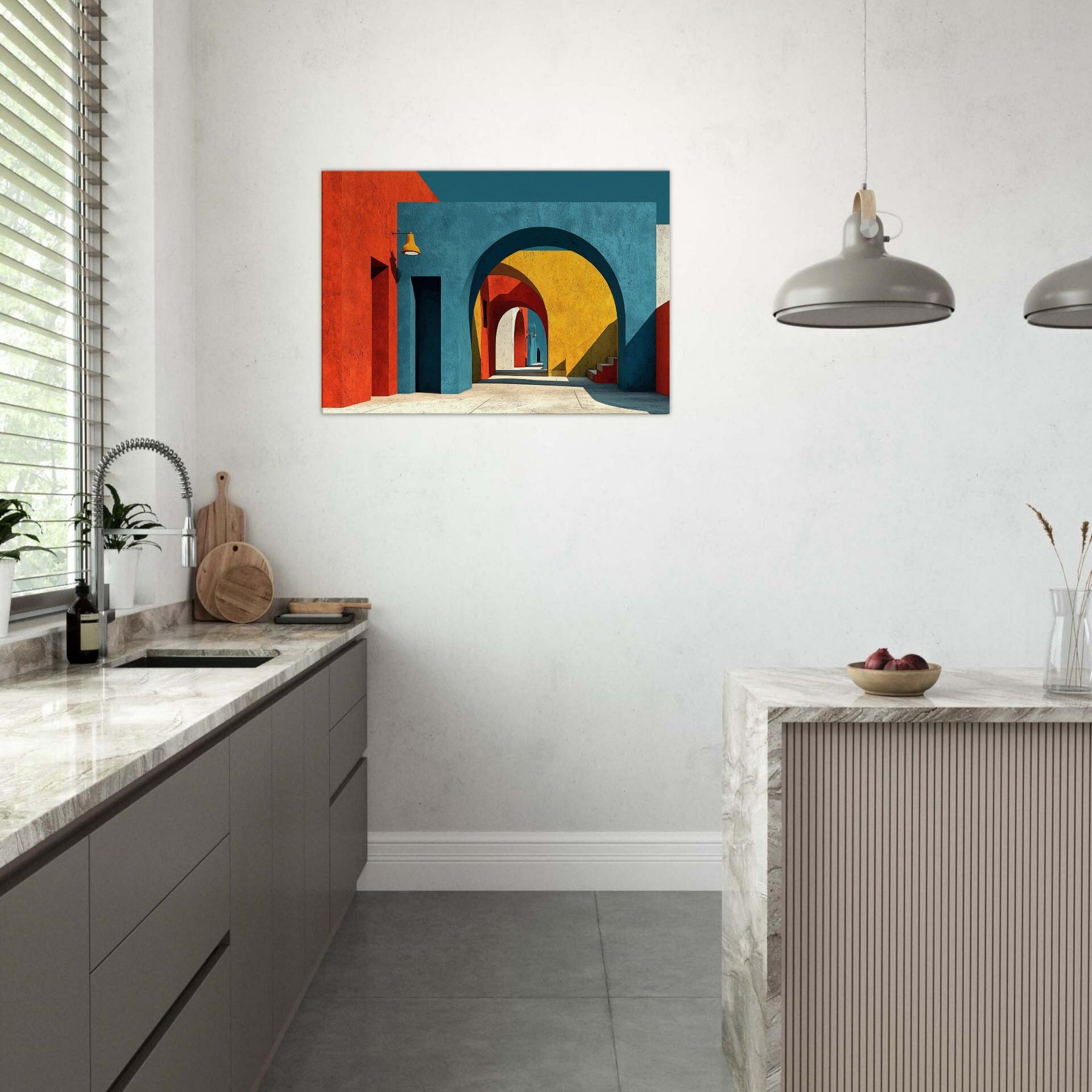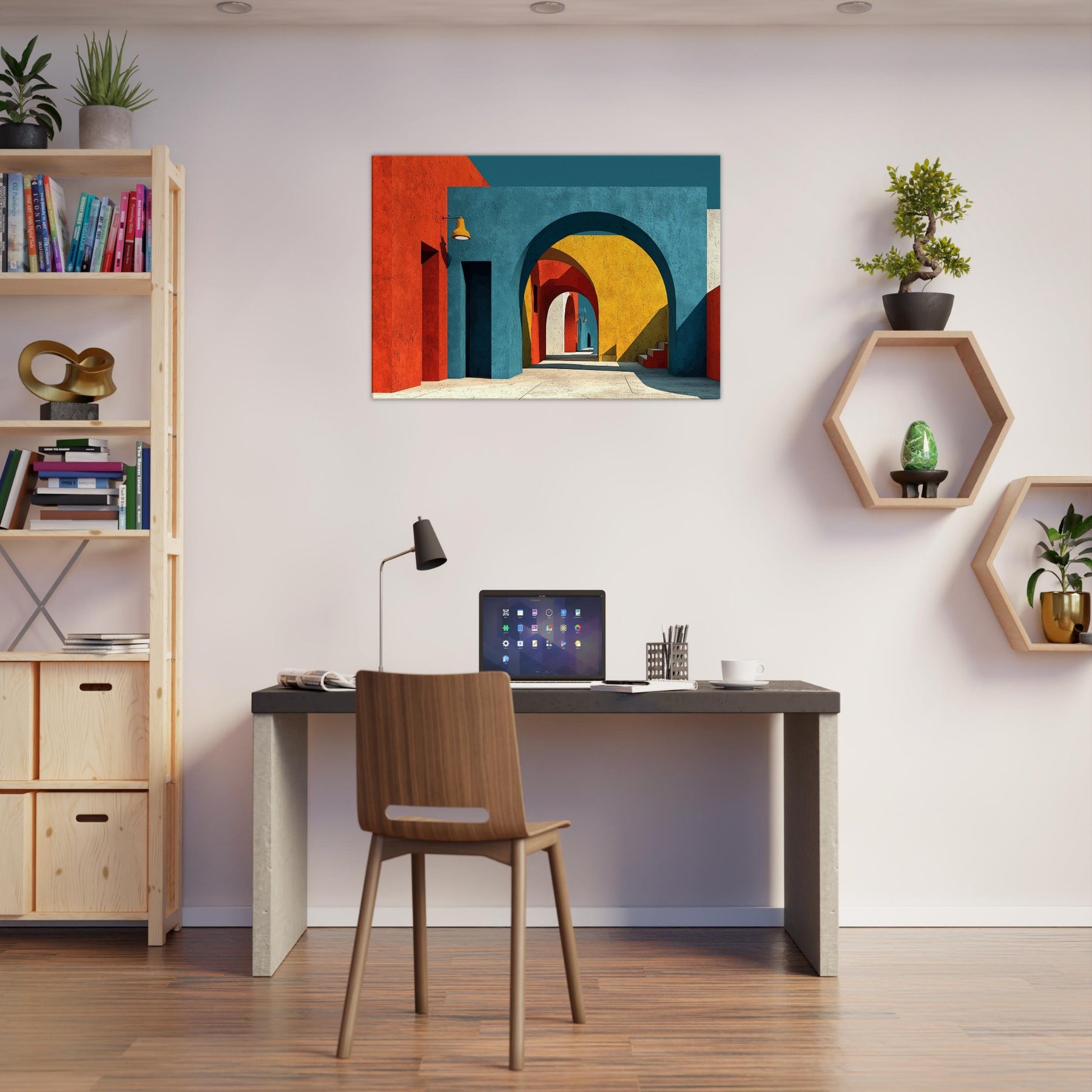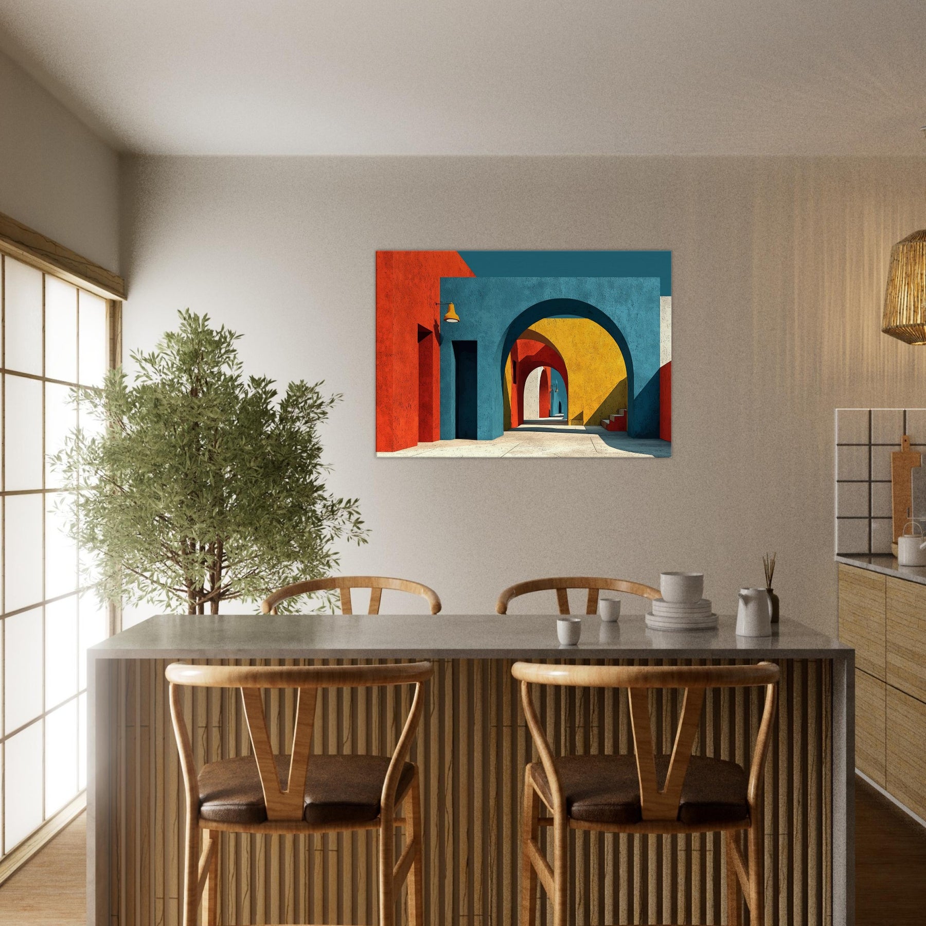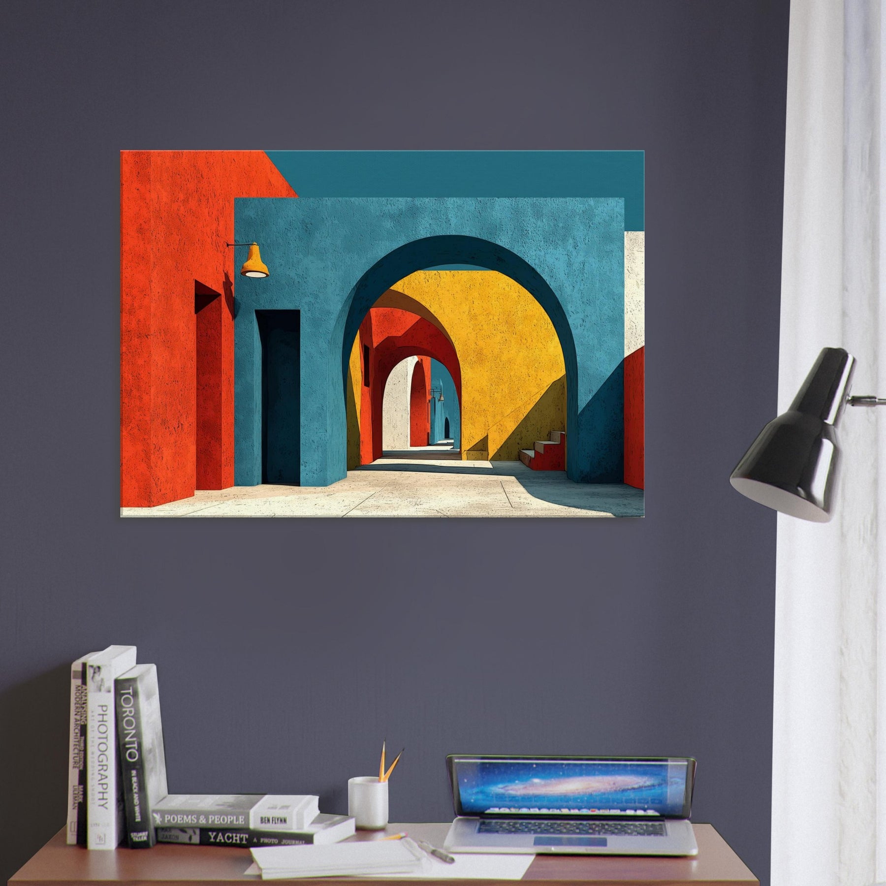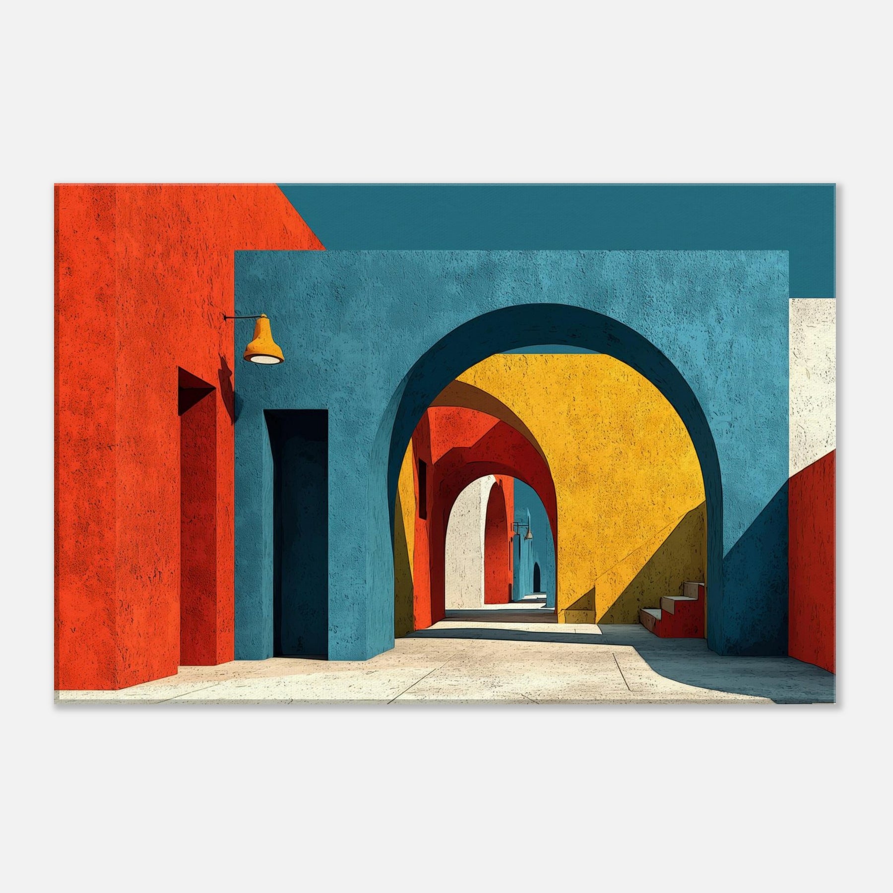 An expansive Archway unfolds in a jubilant chorus of color, where stacked arches peel back time and space. The painting bathes a quiet room in sunset blues, terracotta reds, and sunlit yellows, inviting the eye to drift along a shadowed corridor that never ends. Perfect for a living space, it adds atmosphere, depth, and a sense of movement like a gentle promenade through a cityscape creating a kinetic calm that nourishes conversation and imagination.
