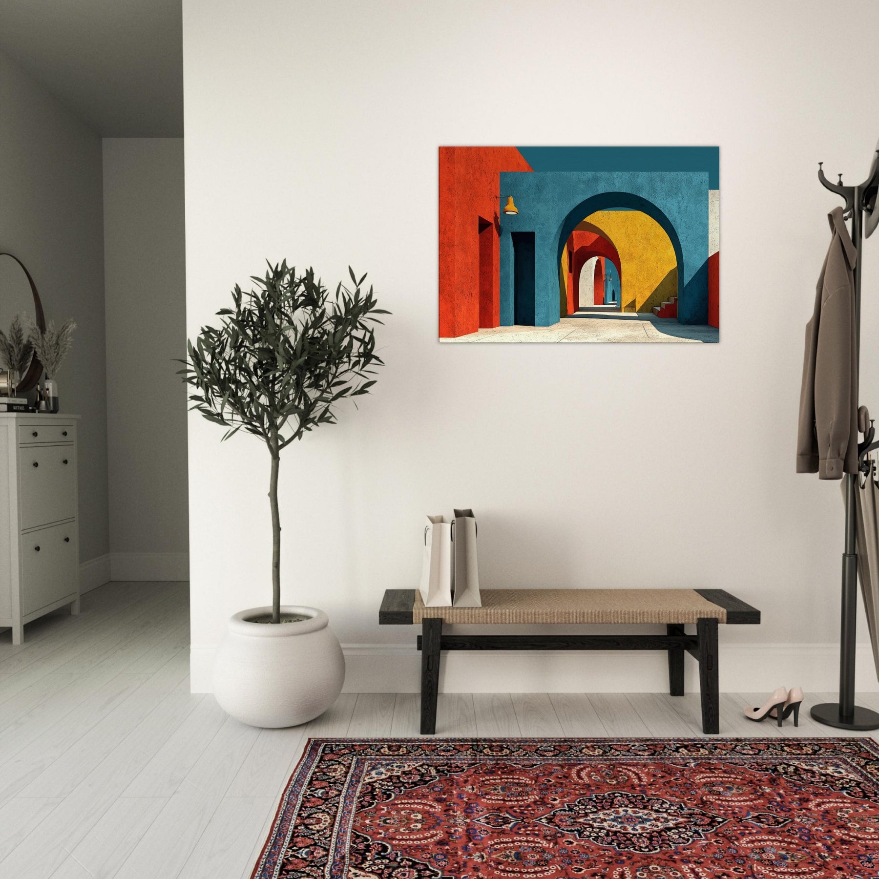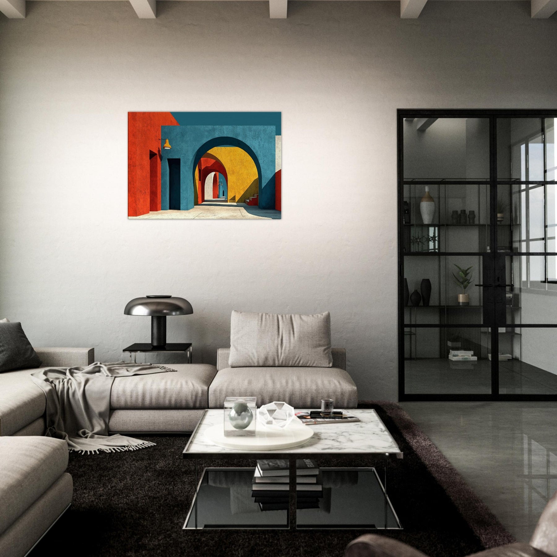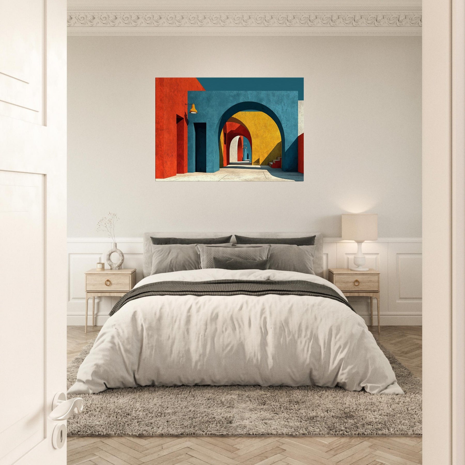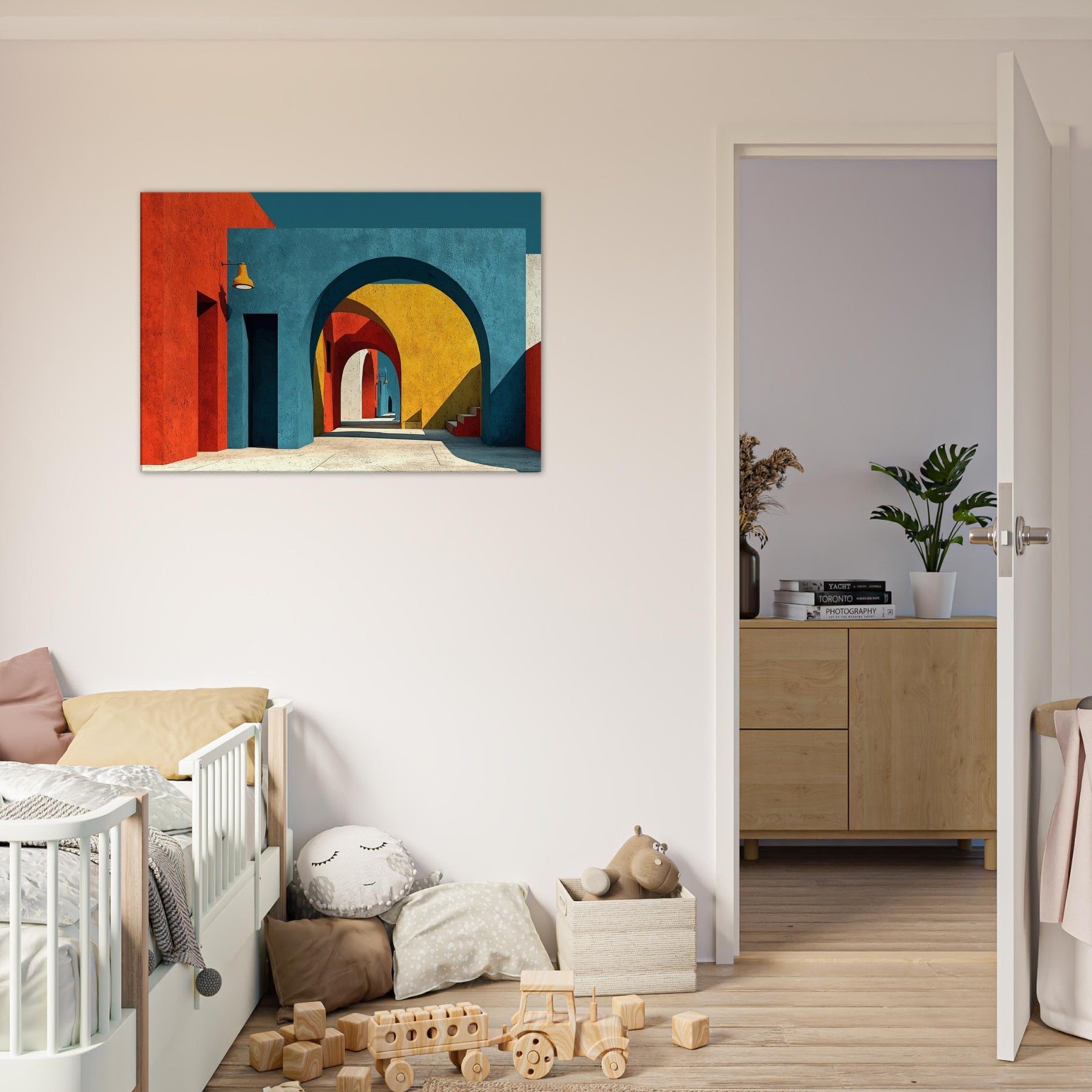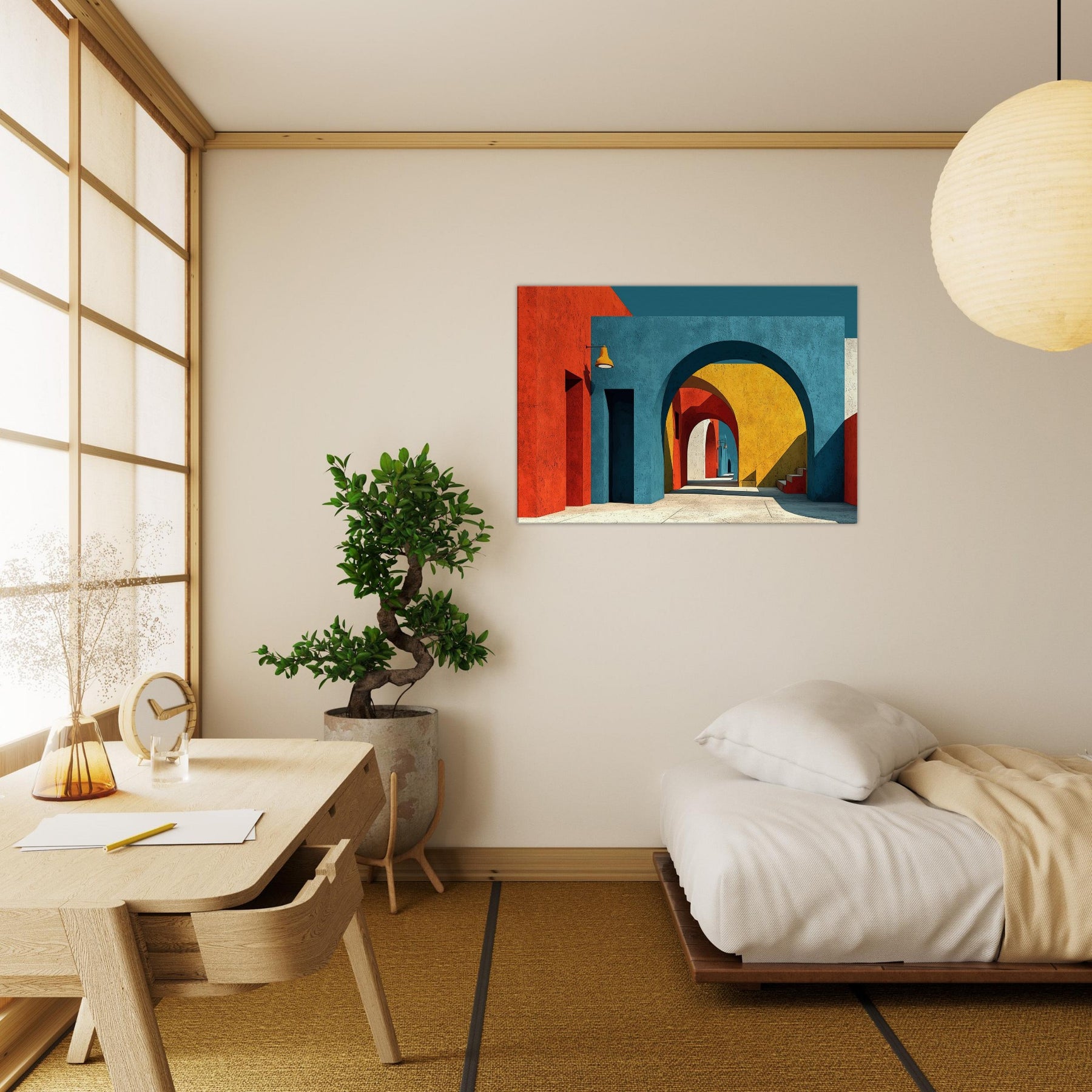 An expansive Archway unfolds in a jubilant chorus of color, where stacked arches peel back time and space. The painting bathes a quiet room in sunset blues, terracotta reds, and sunlit yellows, inviting the eye to drift along a shadowed corridor that never ends. Perfect for a living space, it adds atmosphere, depth, and a sense of movement like a gentle promenade through a cityscape creating a kinetic calm that nourishes conversation and imagination.