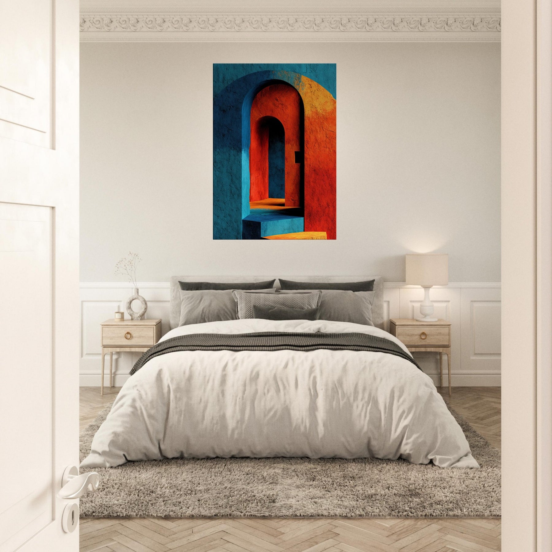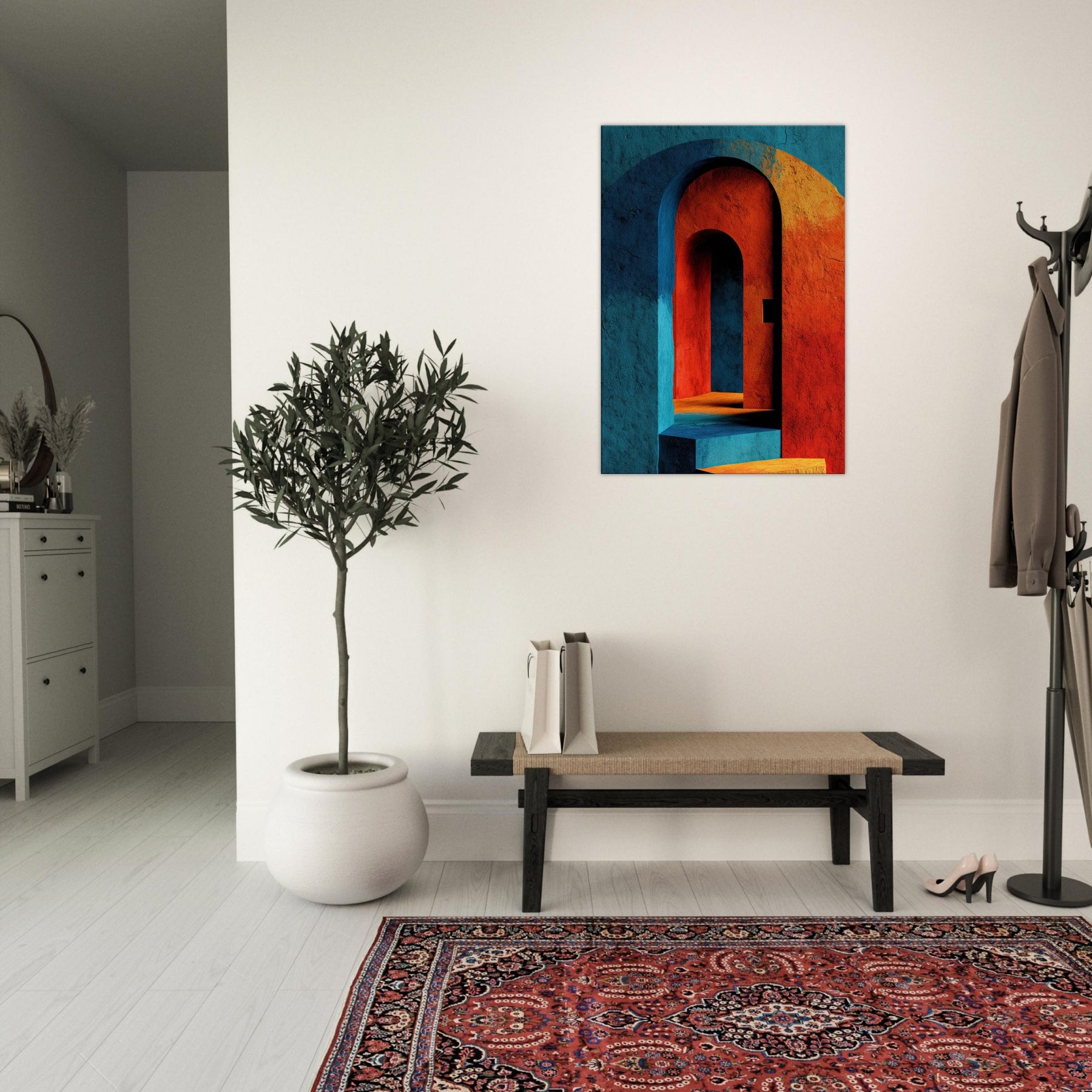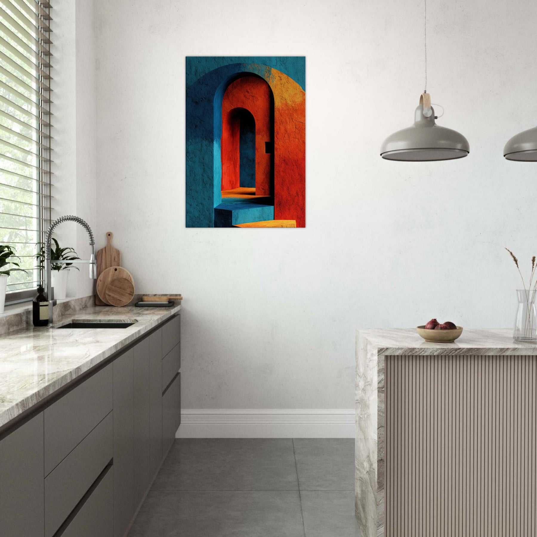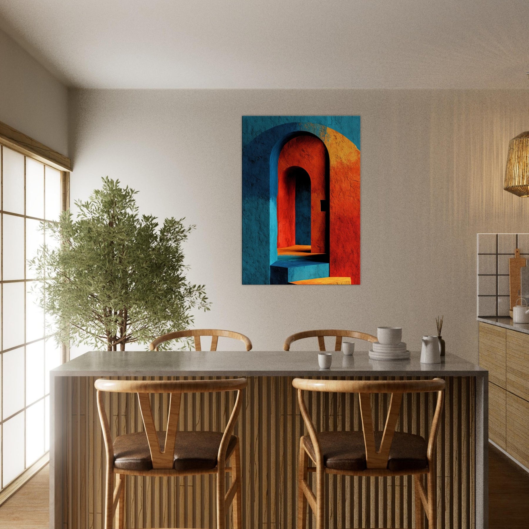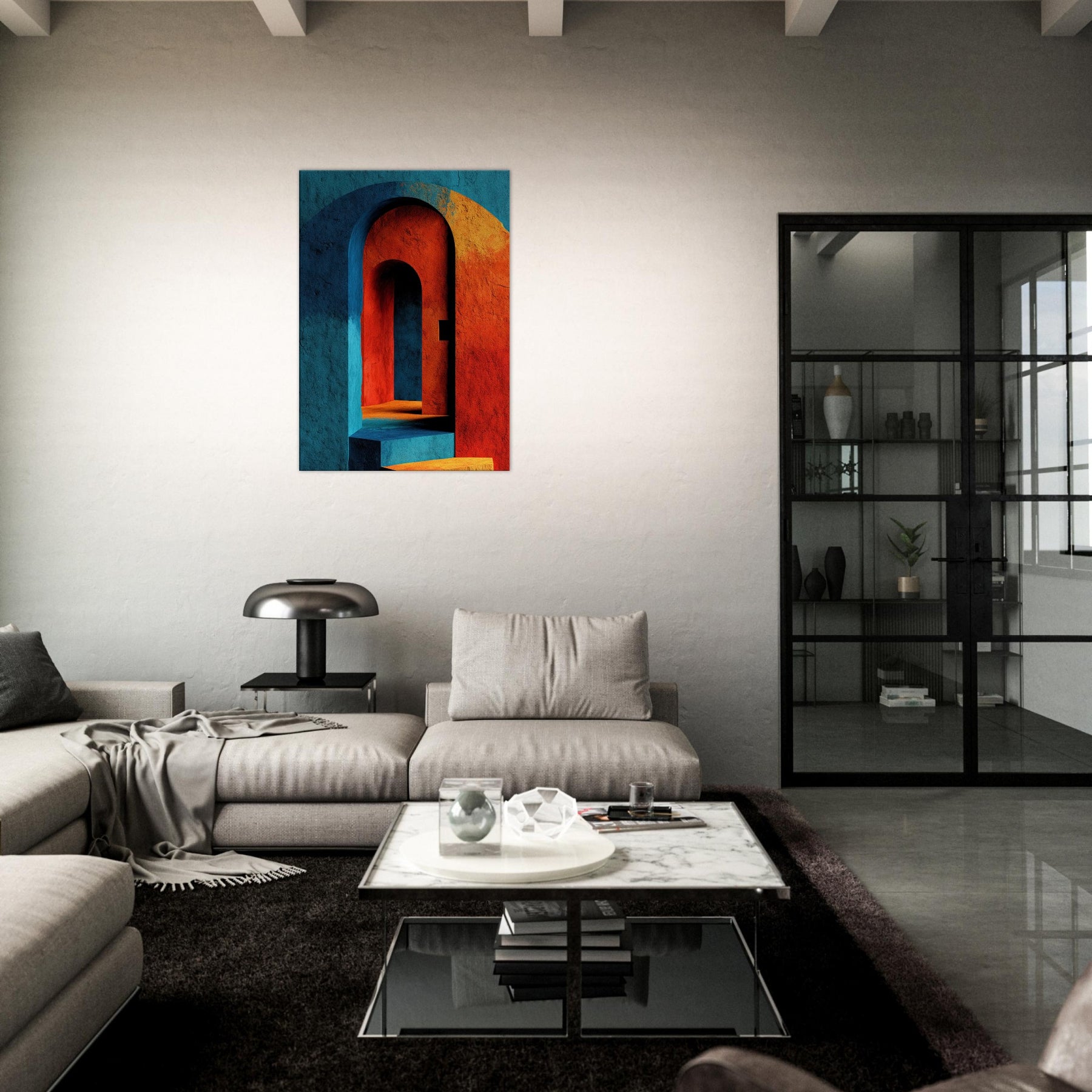 This Archway invites the eye to travel inward, where turquoise shadows give way to blazing orange light. The forms glide in an abstract rhythm, suggesting city arches and quiet avenues at dusk. The piece exudes a cool, contemplative energy that anchors a living room with drama and grace, turning walls into a horizon. Its tactile depth invites a gentle touch of sunlight across surfaces, while the warm accents echo in cushions or a rug. A bold, sculptural moment for modern interiors.