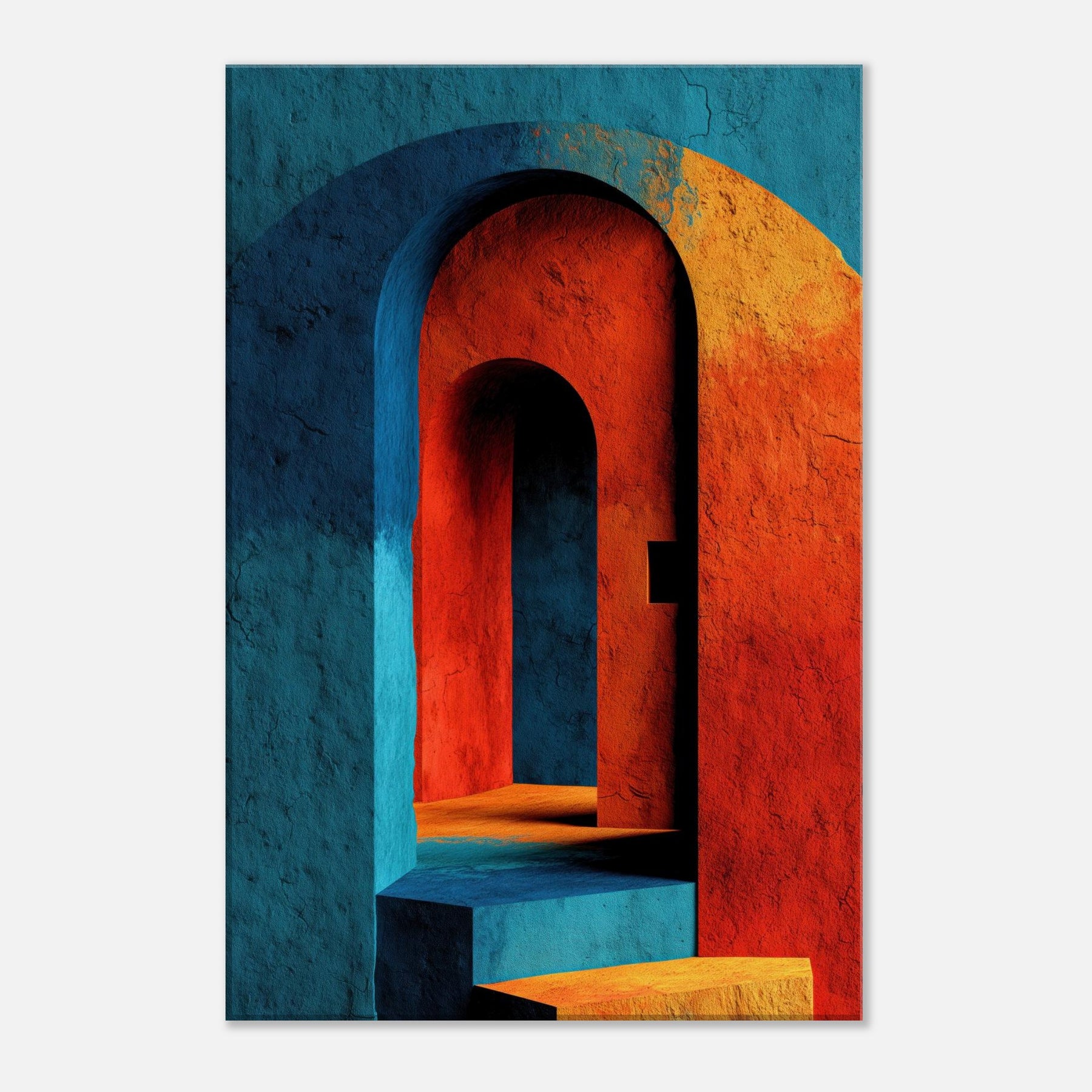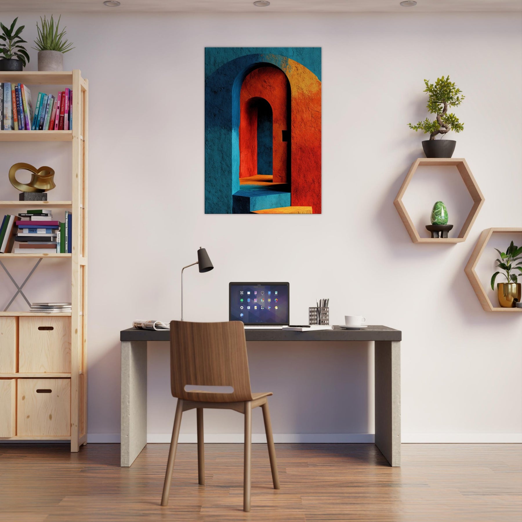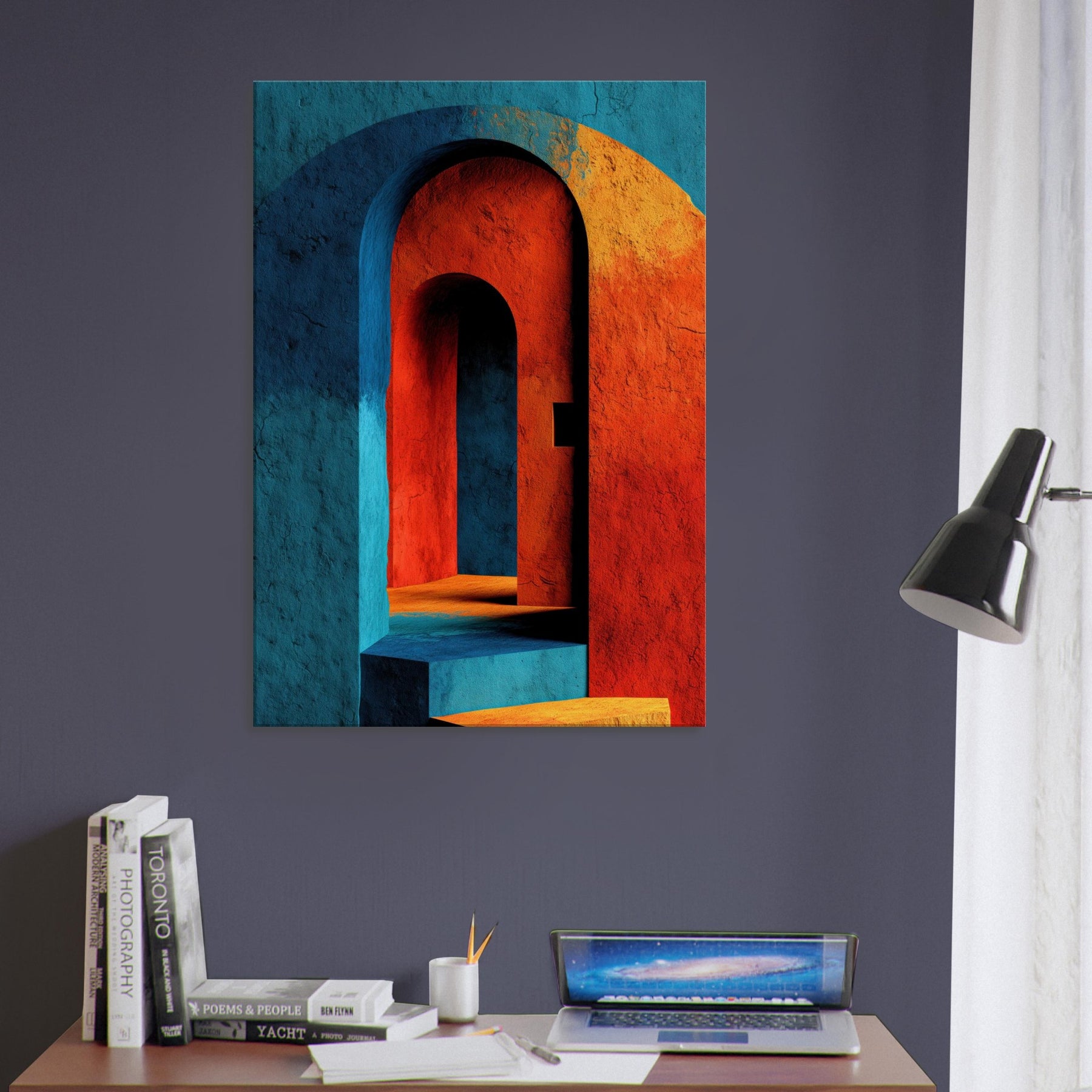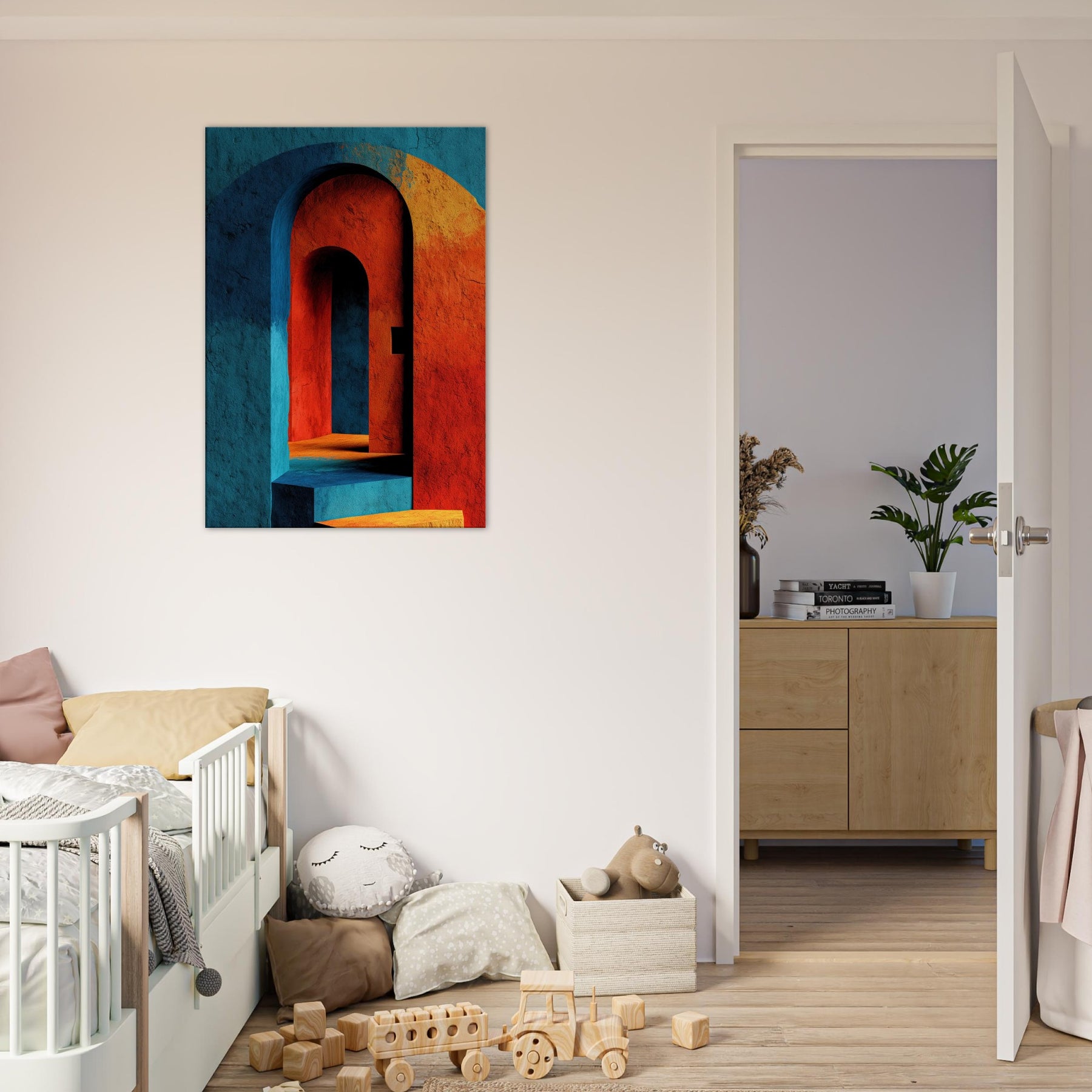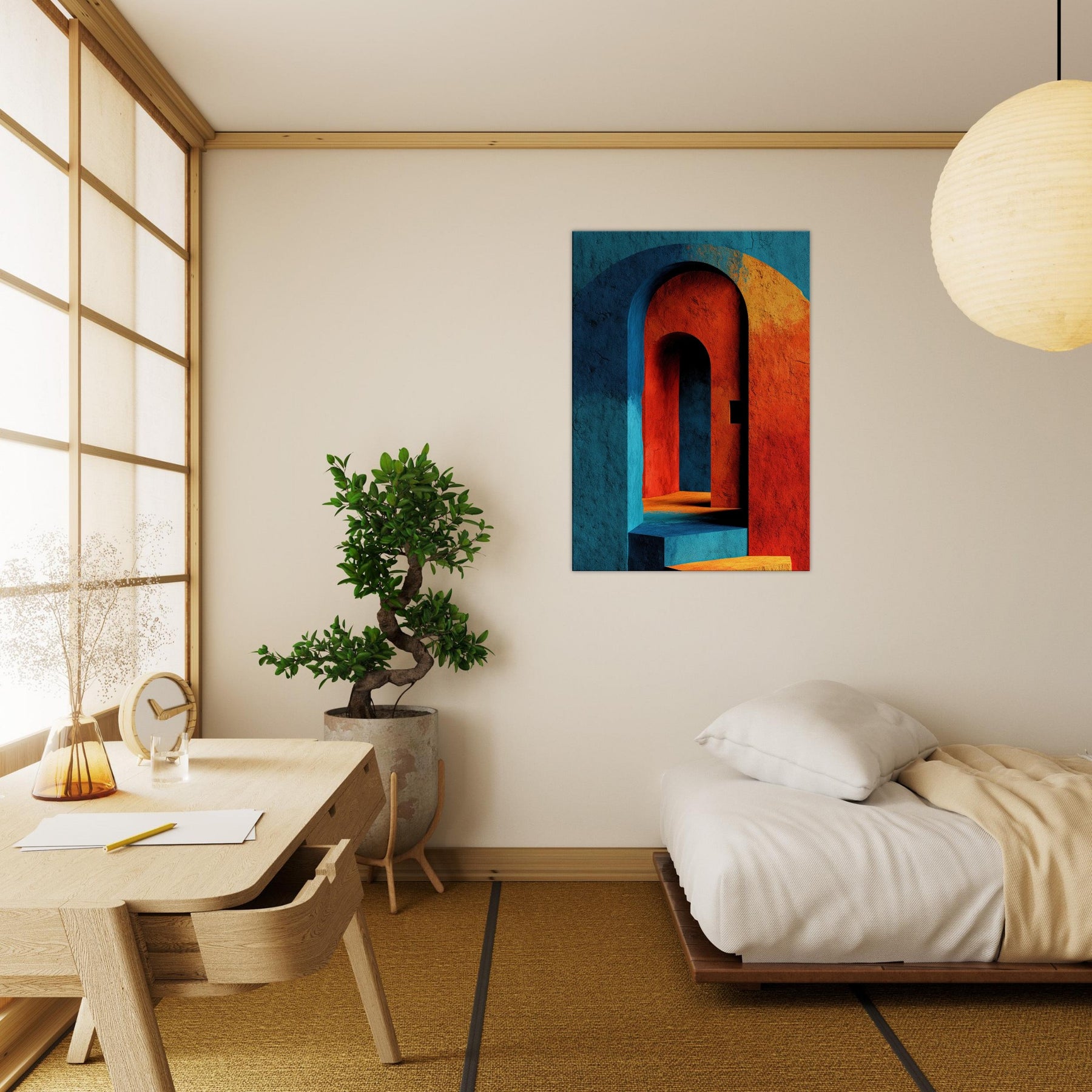 This Archway invites the eye to travel inward, where turquoise shadows give way to blazing orange light. The forms glide in an abstract rhythm, suggesting city arches and quiet avenues at dusk. The piece exudes a cool, contemplative energy that anchors a living room with drama and grace, turning walls into a horizon. Its tactile depth invites a gentle touch of sunlight across surfaces, while the warm accents echo in cushions or a rug. A bold, sculptural moment for modern interiors.