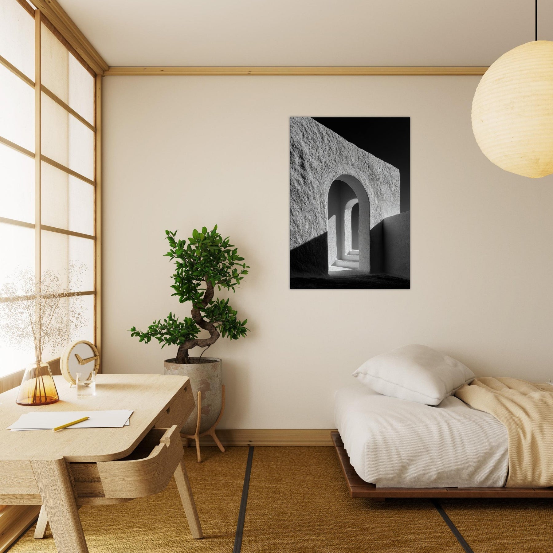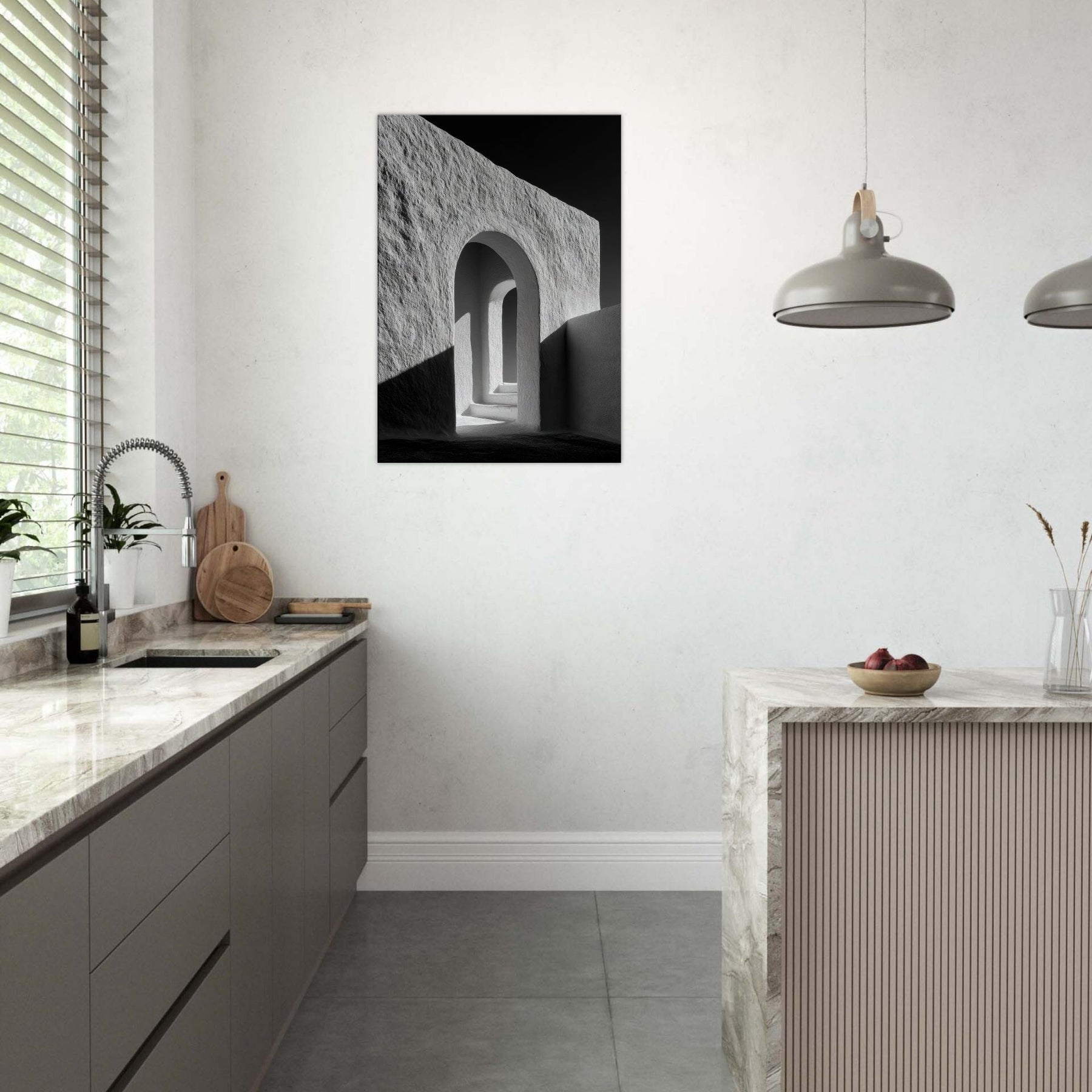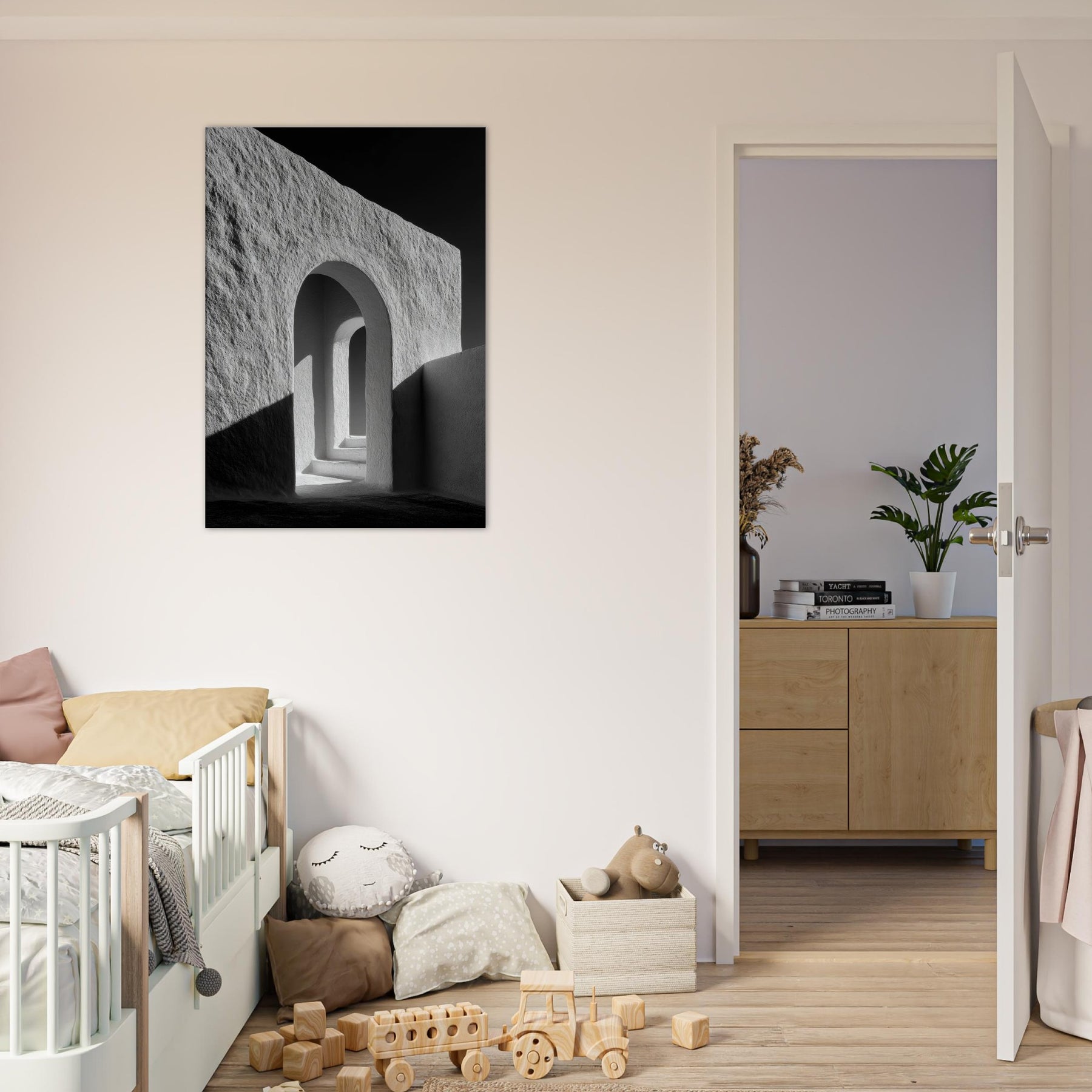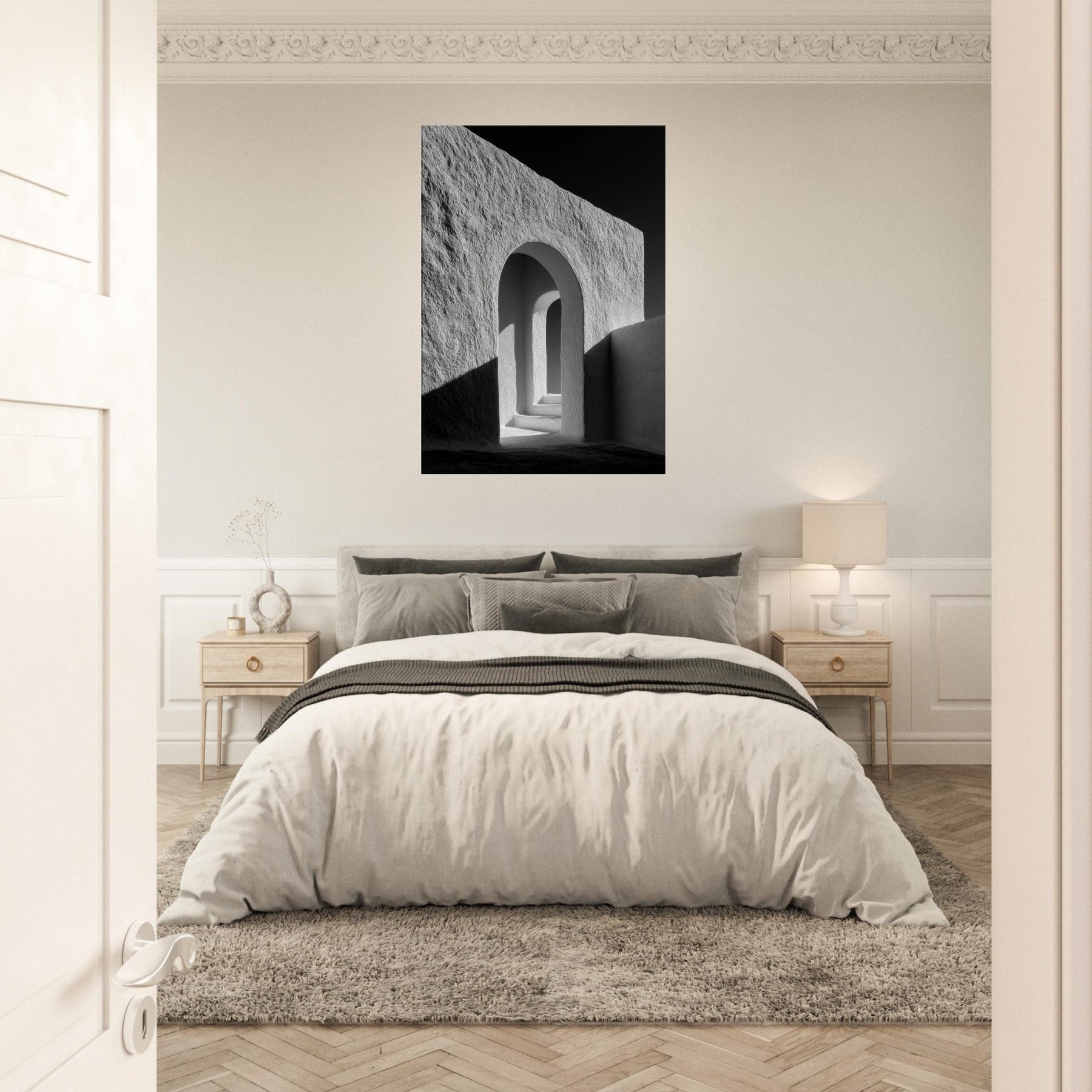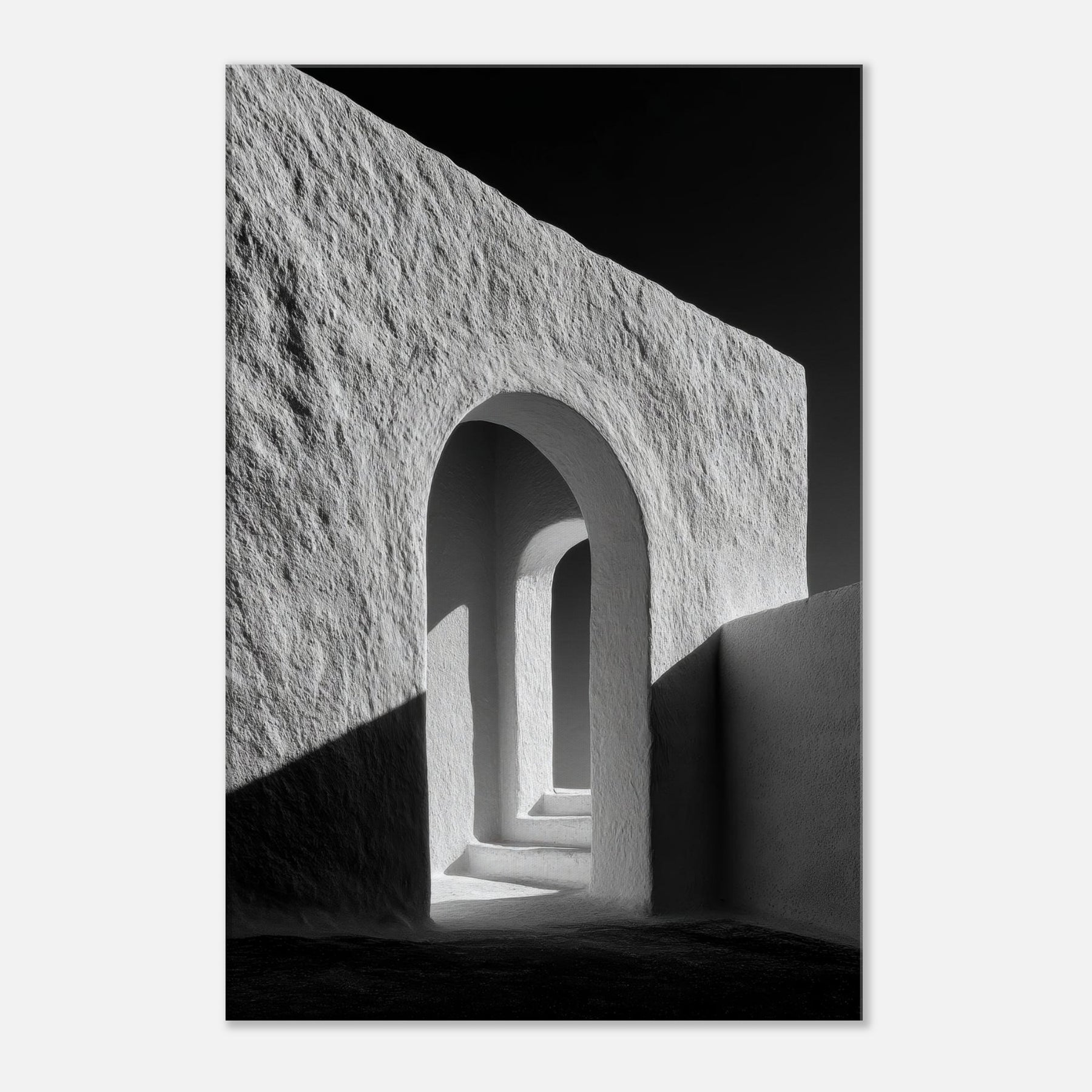 Stepping through the Archway, this black and white study distills architecture to light and form. The smooth plaster textures, deep shadows, and precise curves invite quiet reflection, turning a corridor into a contemplative vignette.