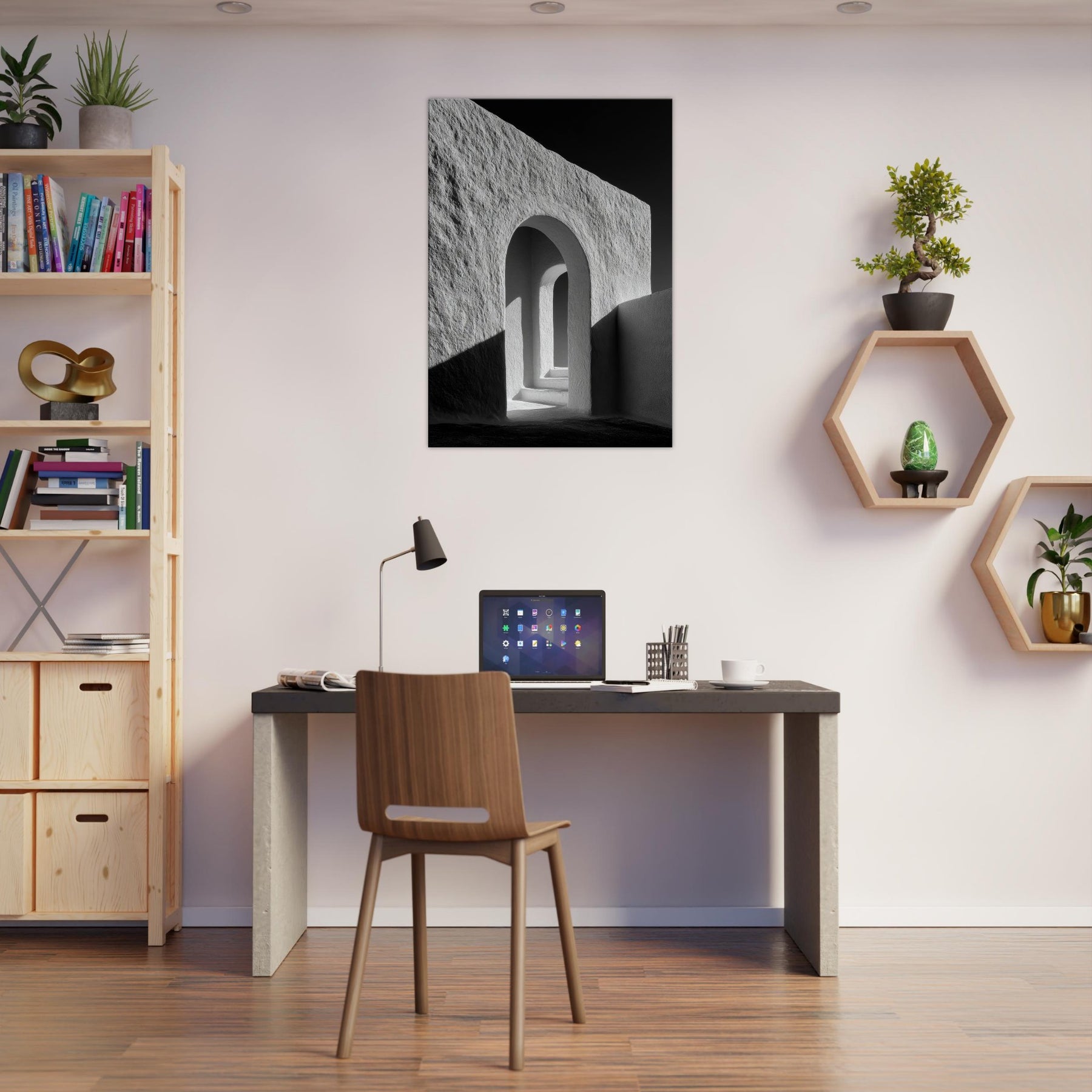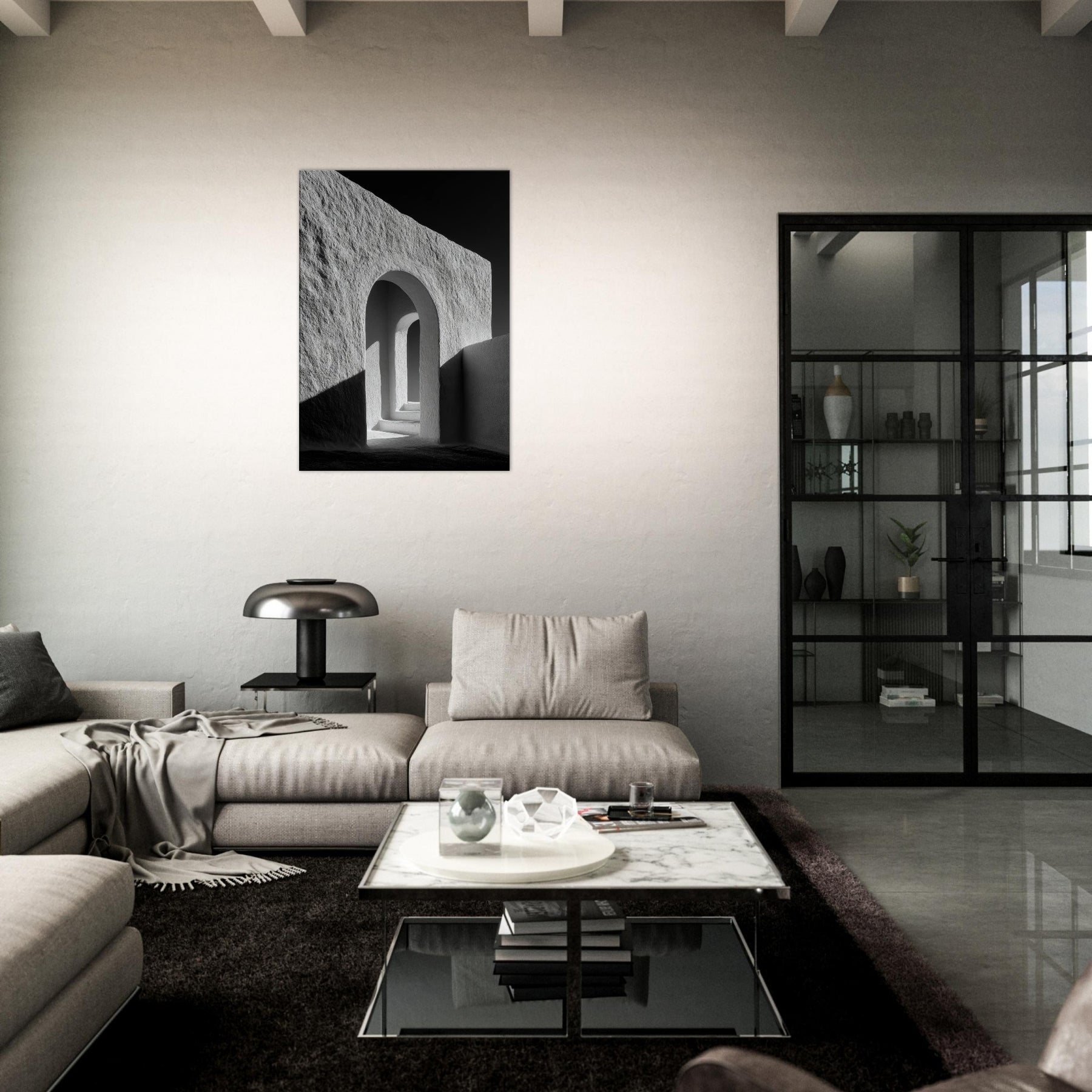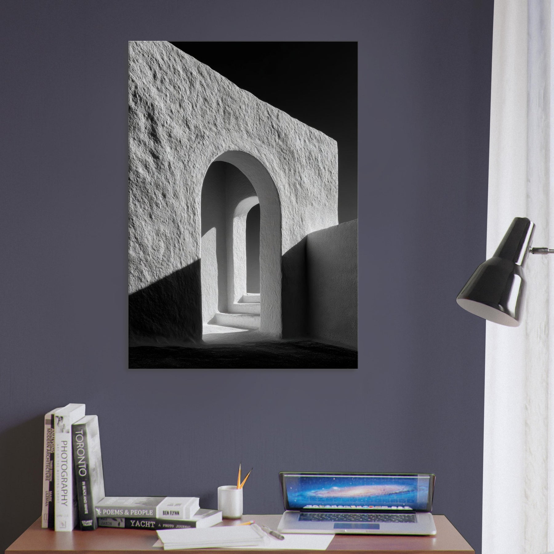 In a living room, it becomes a window to the city's pulse minimal, timeless, endlessly cinematic. The contrast stone white against ink dark corners offers balance and focus, pairing well with metal, wood, or plush tones. A single image that widens perception and elevates everyday spaces.