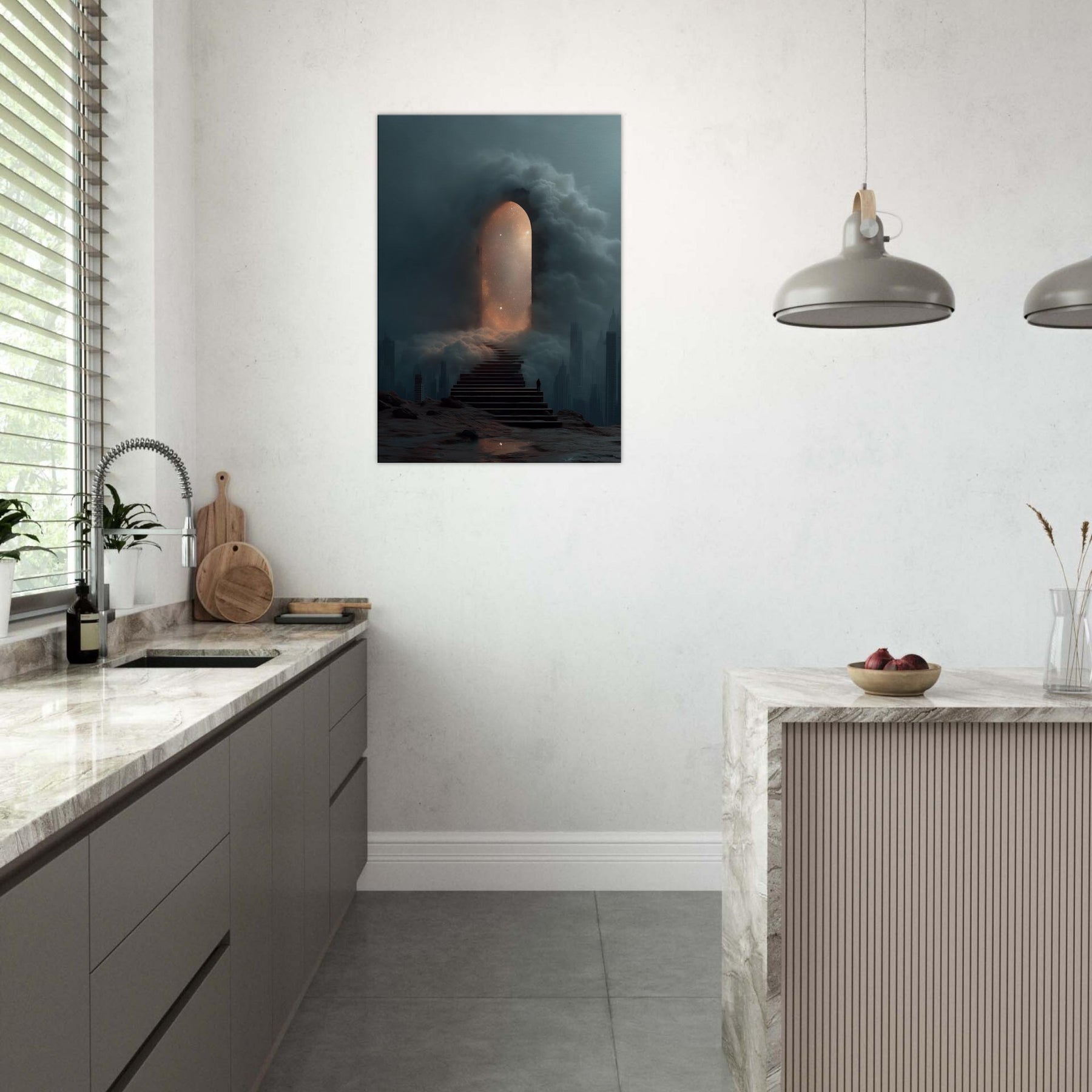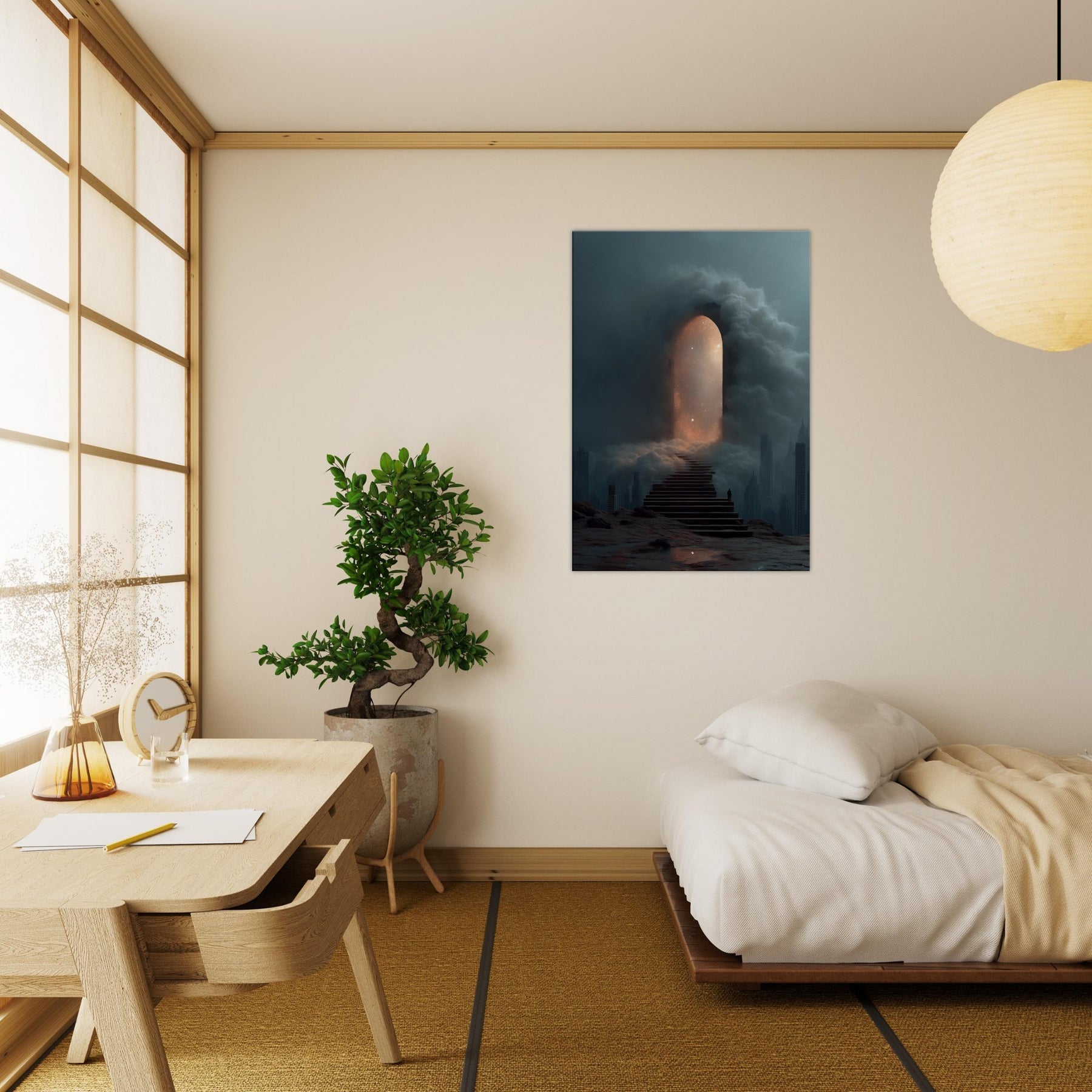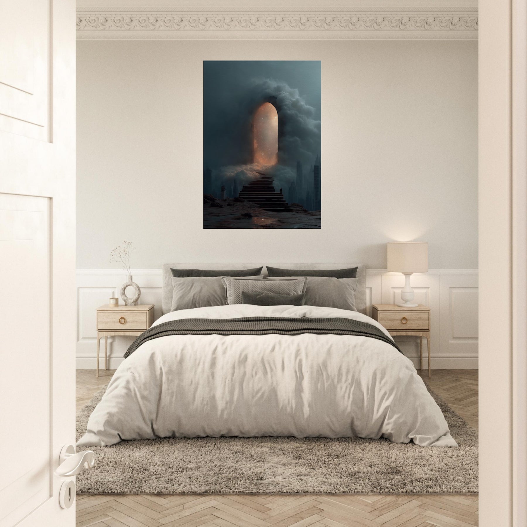 Arched Stone Bridge draws you upward into a velvet dusk, where a stairway climbs through mist toward a radiant arch opening onto a star flecked horizon. This surreal cityscape hums with quiet wonder, blending cool urban blues with a warm, solar glow. The piece invites pause, turning any living space into a doorway between dream and memory, a serene anchor for reflection on busy days. Let it soften walls and invite conversations without shouting.