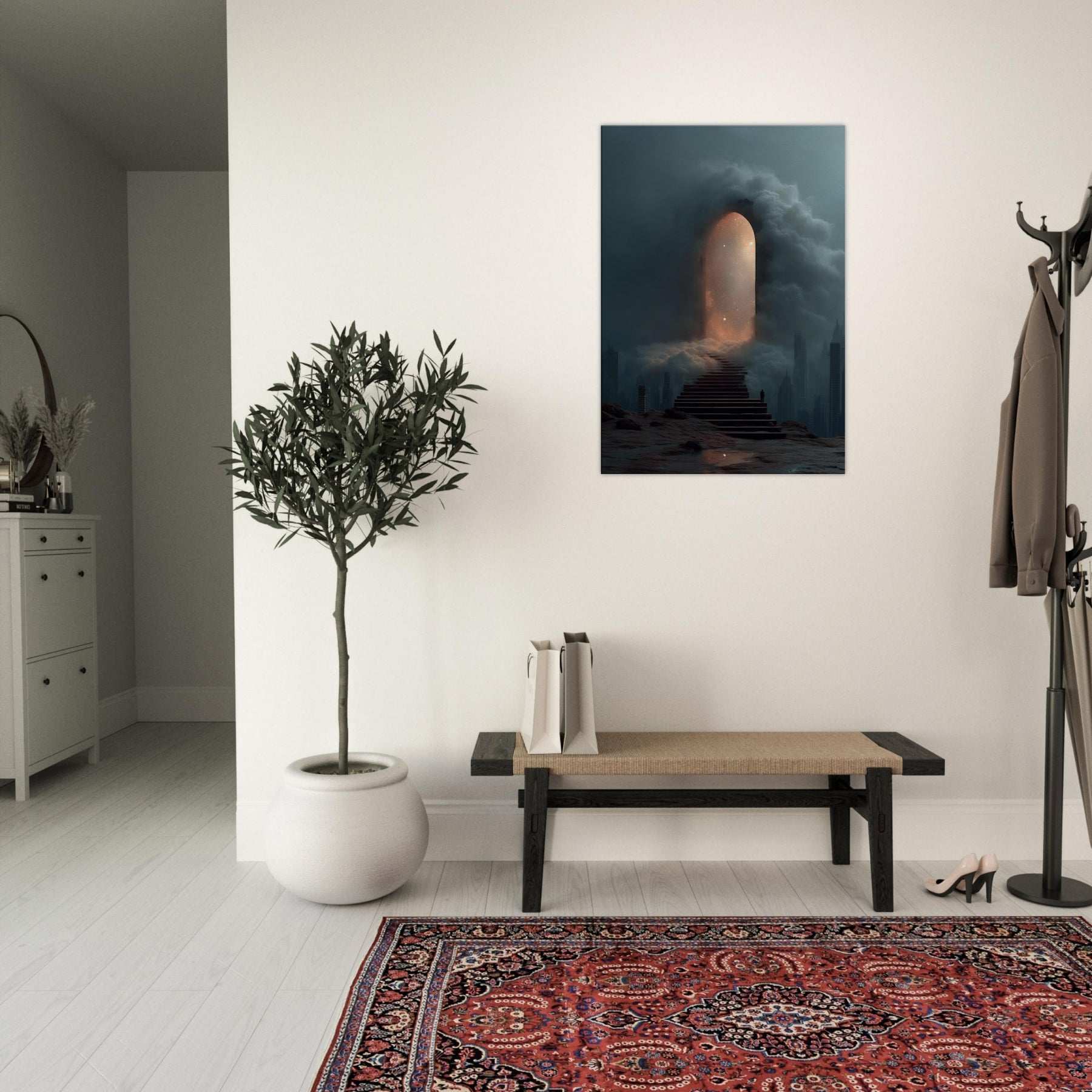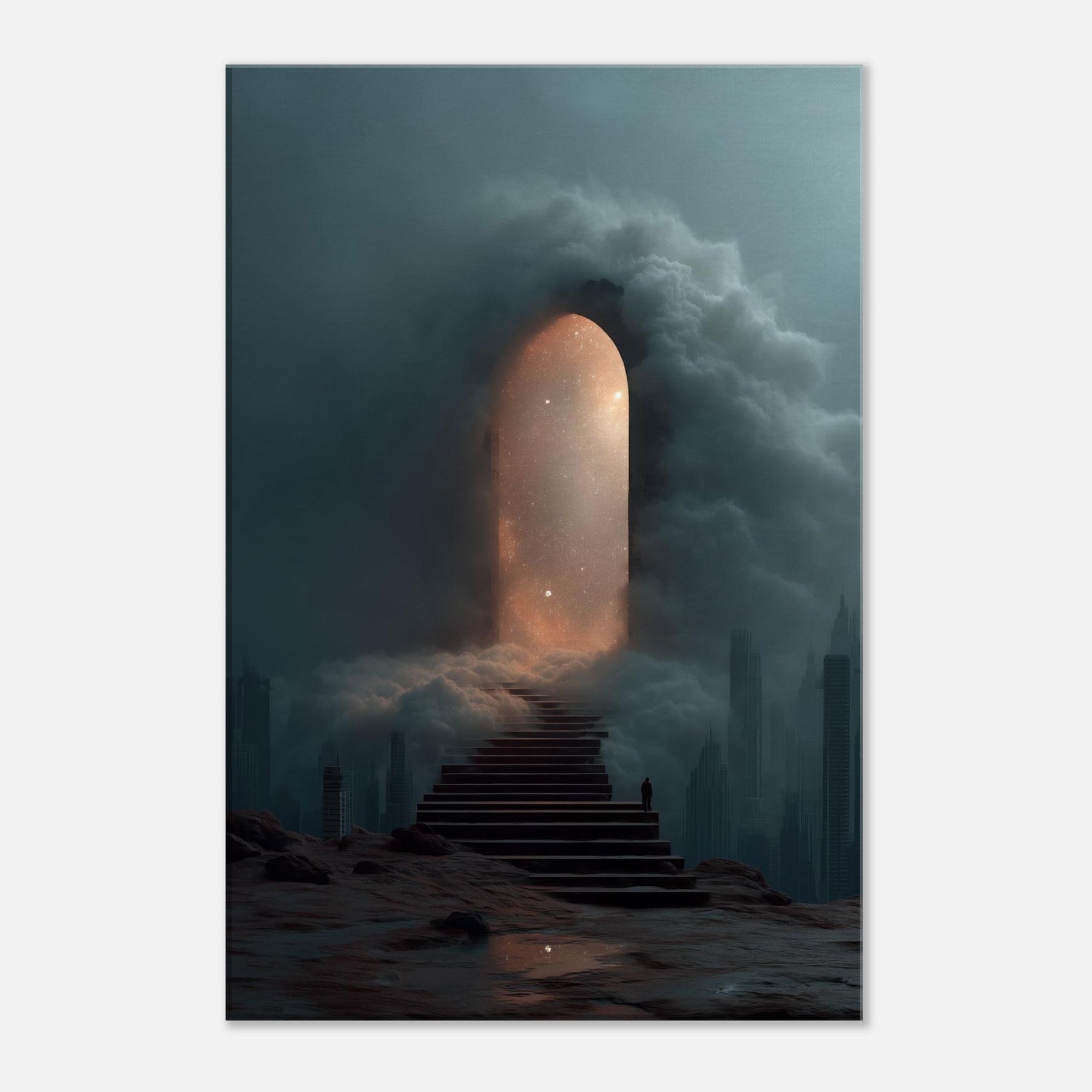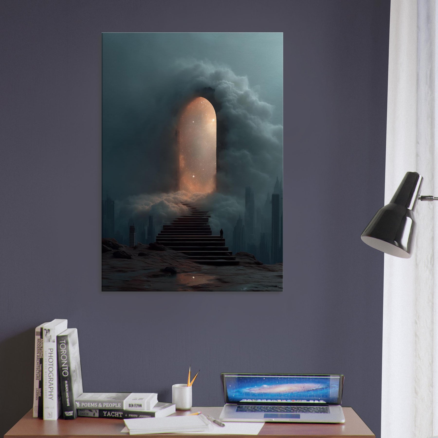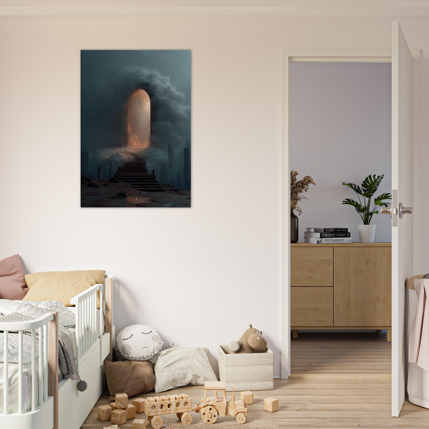 Arched Stone Bridge draws you upward into a velvet dusk, where a stairway climbs through mist toward a radiant arch opening onto a star flecked horizon. This surreal cityscape hums with quiet wonder, blending cool urban blues with a warm, solar glow. The piece invites pause, turning any living space into a doorway between dream and memory, a serene anchor for reflection on busy days. Let it soften walls and invite conversations without shouting.