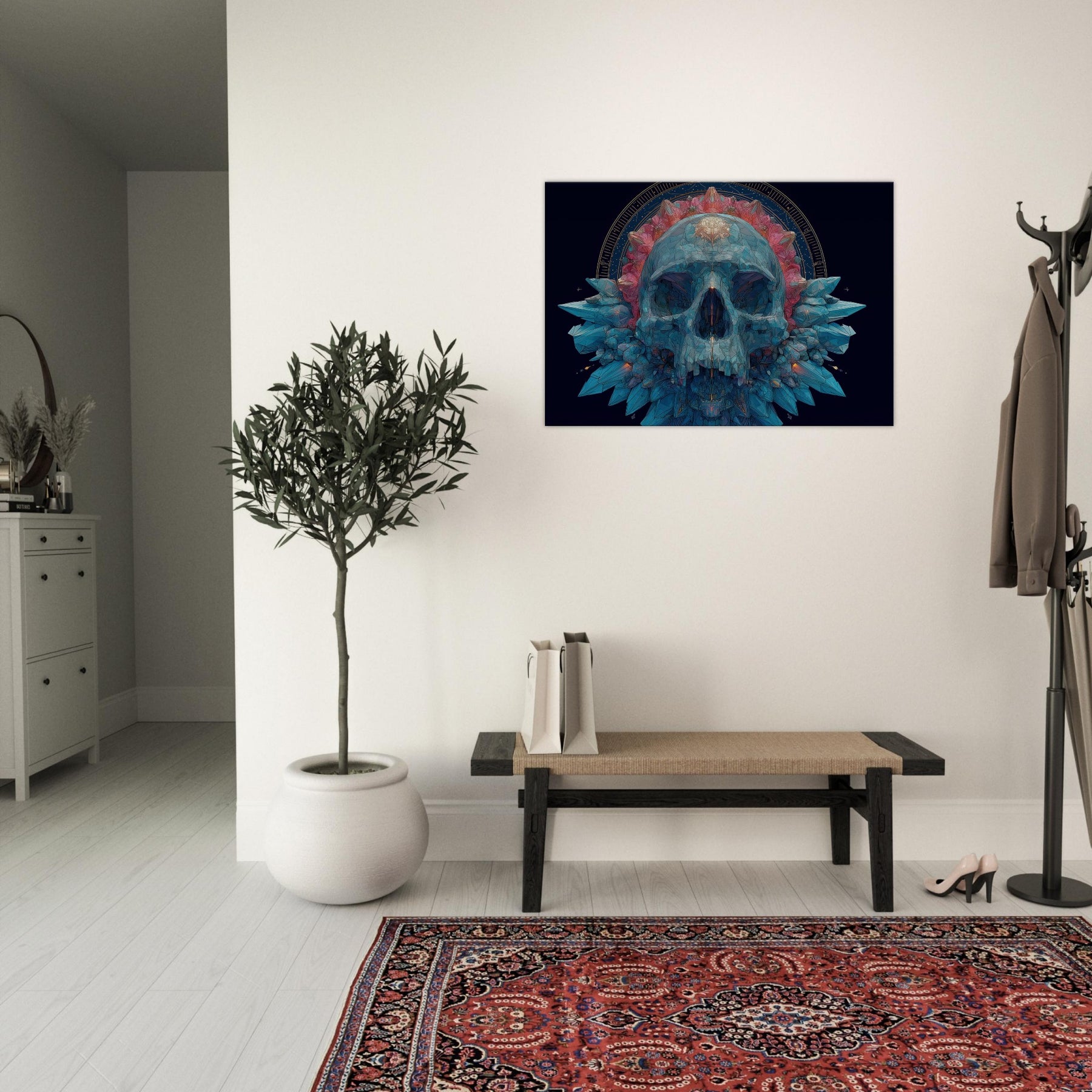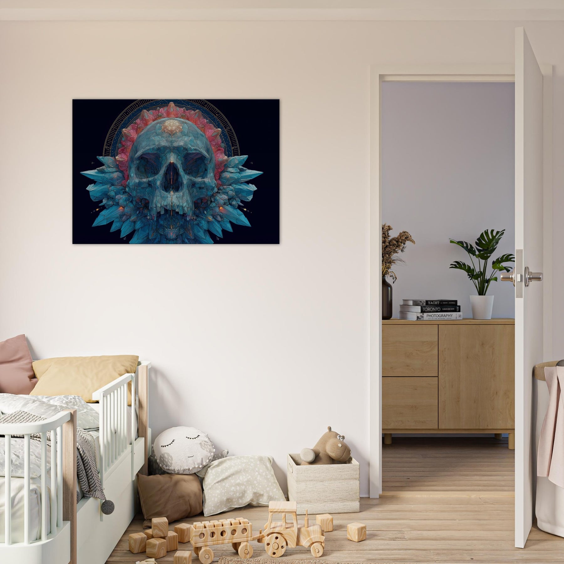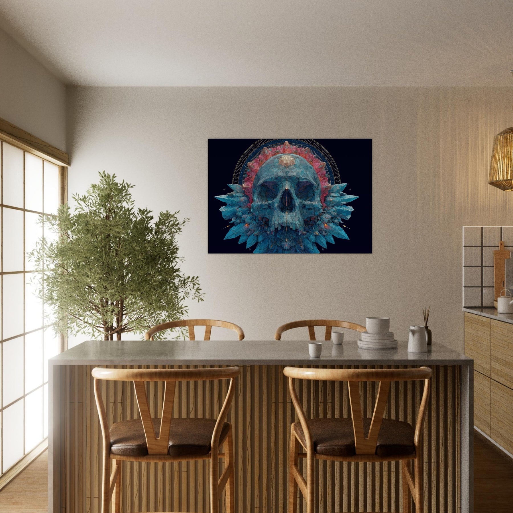Mystical Skull rises from a velvet midnight, a sculpted beacon of color and quiet intensity. Its facets glow in teal and cobalt, with a pink crystalline halo breathing above, inviting the eye to wander. This enigmatic centerpiece transforms a living space into a sanctuary of mood and imagination, where light plays on jagged edges and soft shadows alike. Pair it with warm textiles or a sleek frame, and the room feels both grounded and transcendent. The Mystical Skull becomes a whisper of arcane beauty in any modern home.