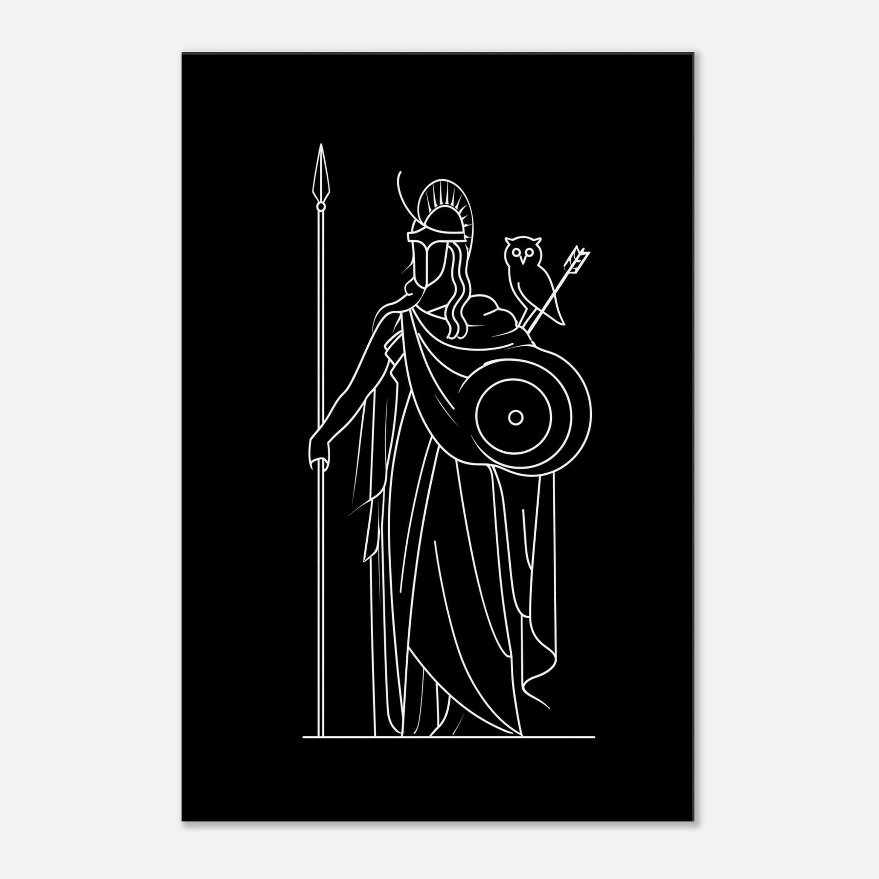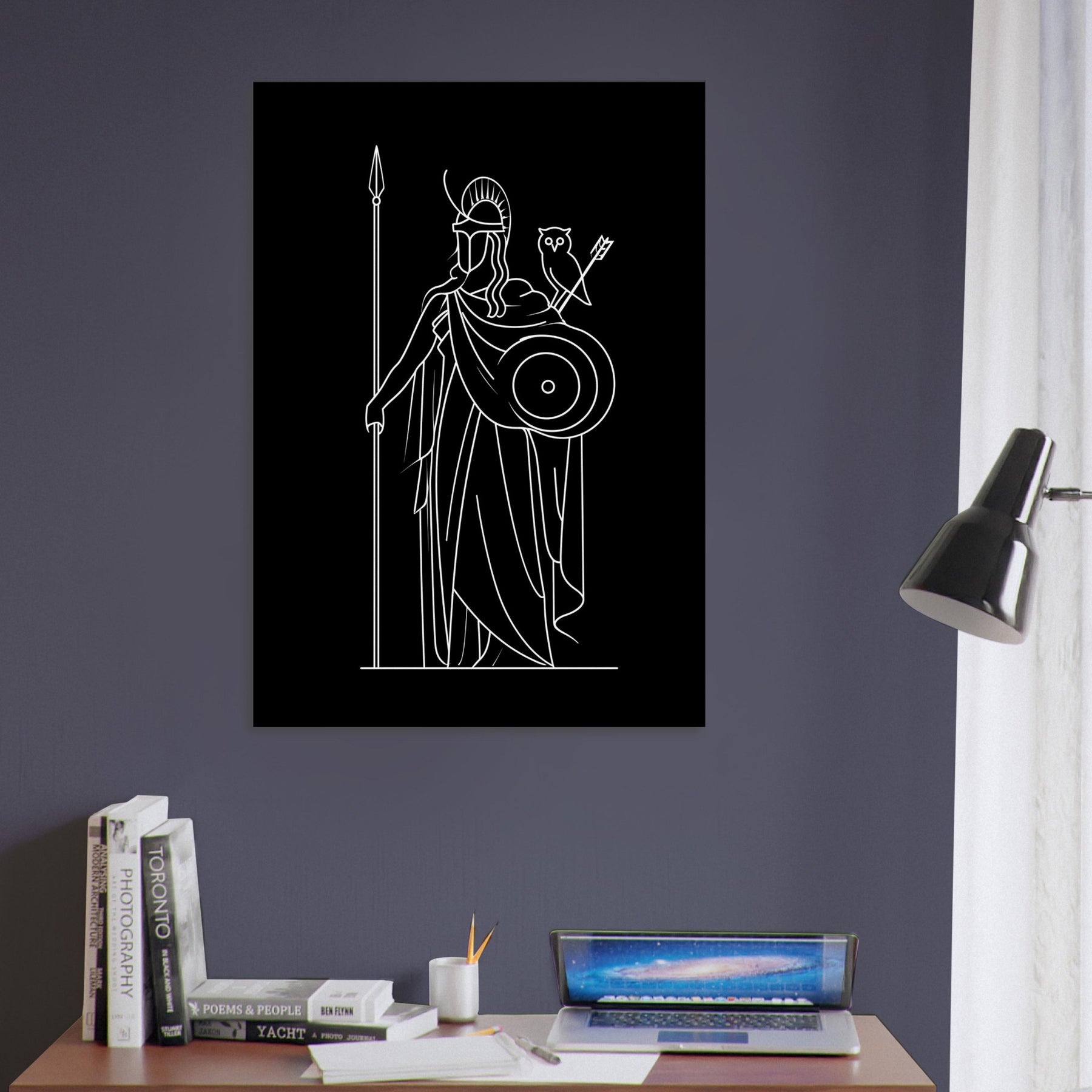 A refined silhouette of Athena, Goddess of Wisdom and Strategy, strides with spear and shield, her cloak tracing arcs of light. An owl perches beside her, a quiet witness to strategy and insight. Rendered in crisp line art against a black canvas, the piece exudes timeless clarity, inviting contemplation and focus. Perfect above a sofa or chic study wall, it lends a mythic calm, guiding conversations and creating a sanctuary of thought.