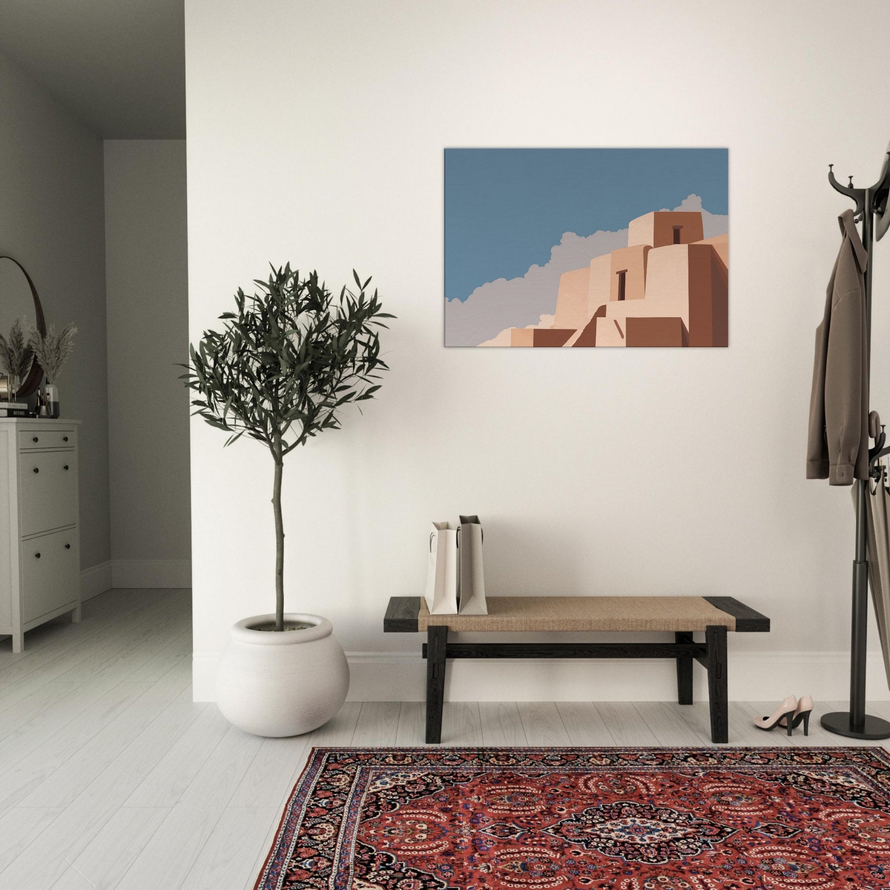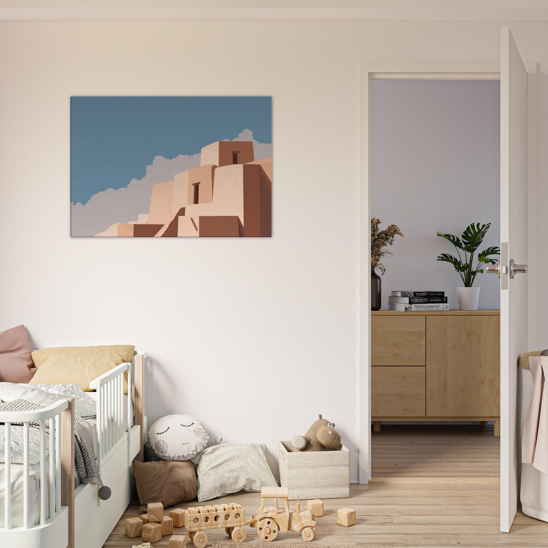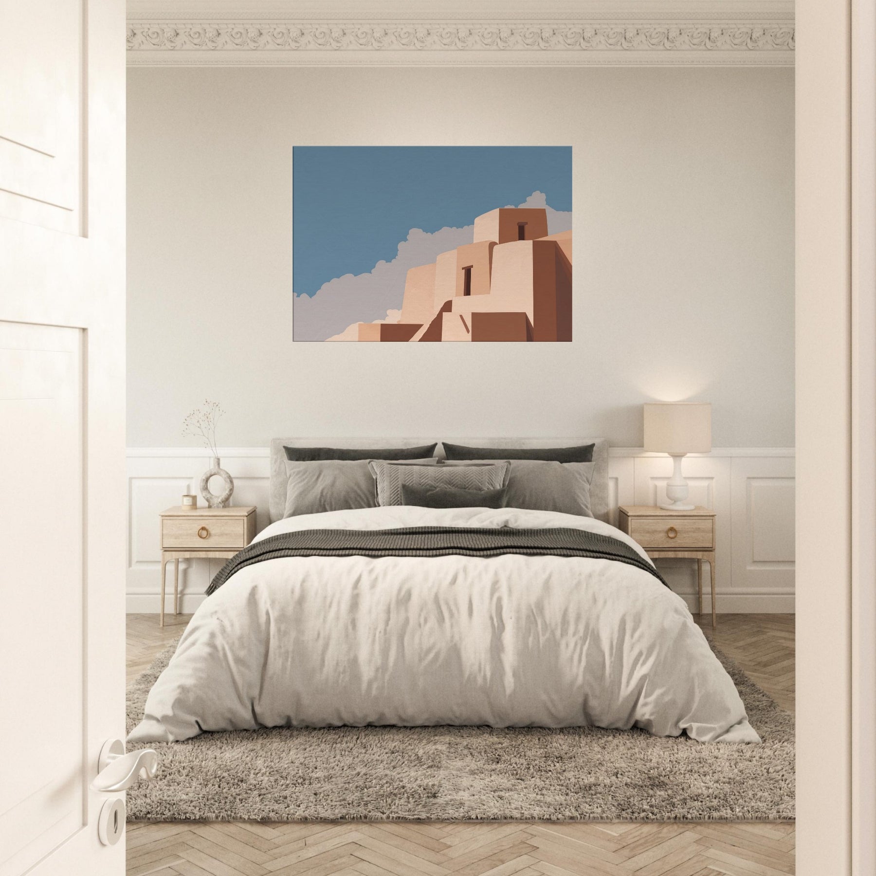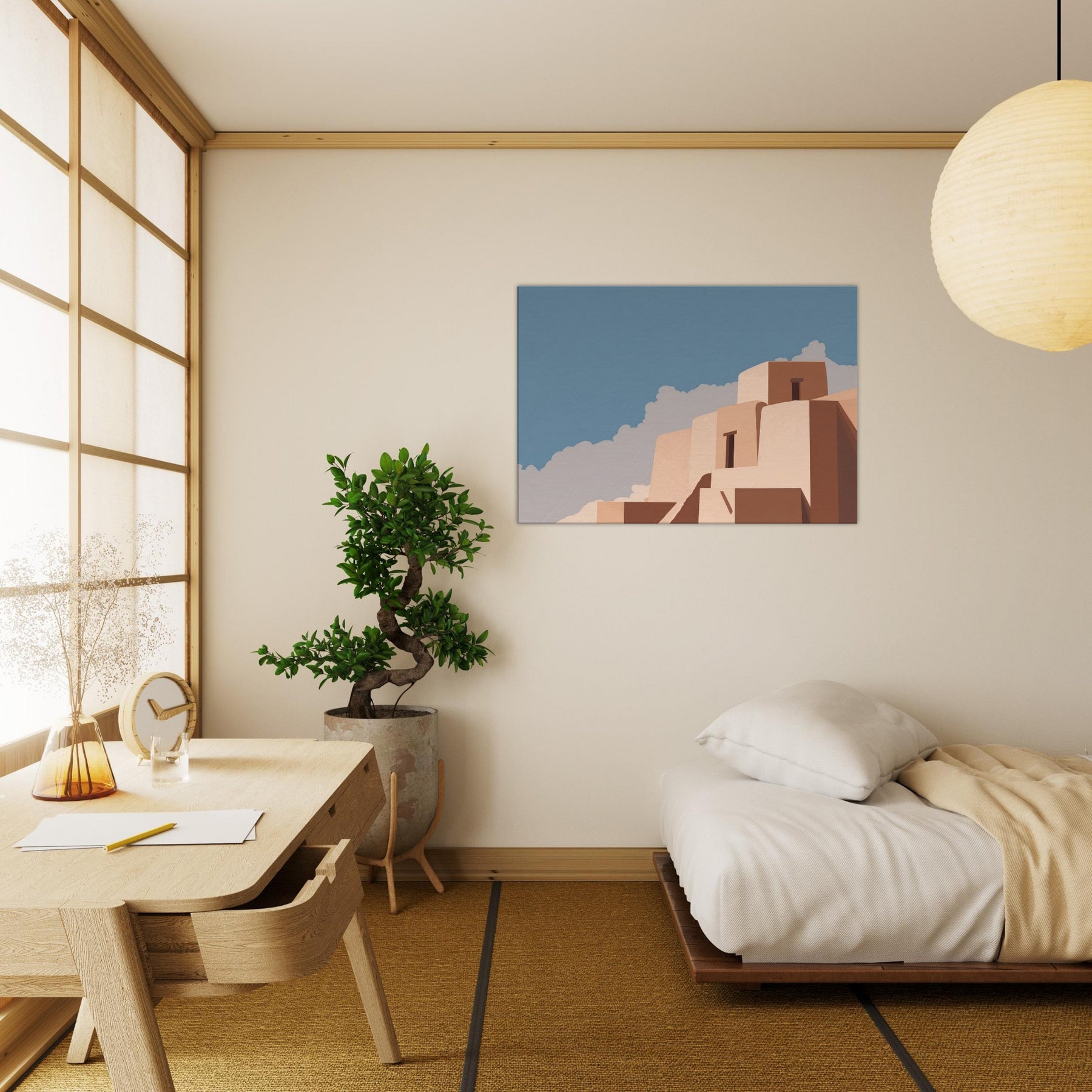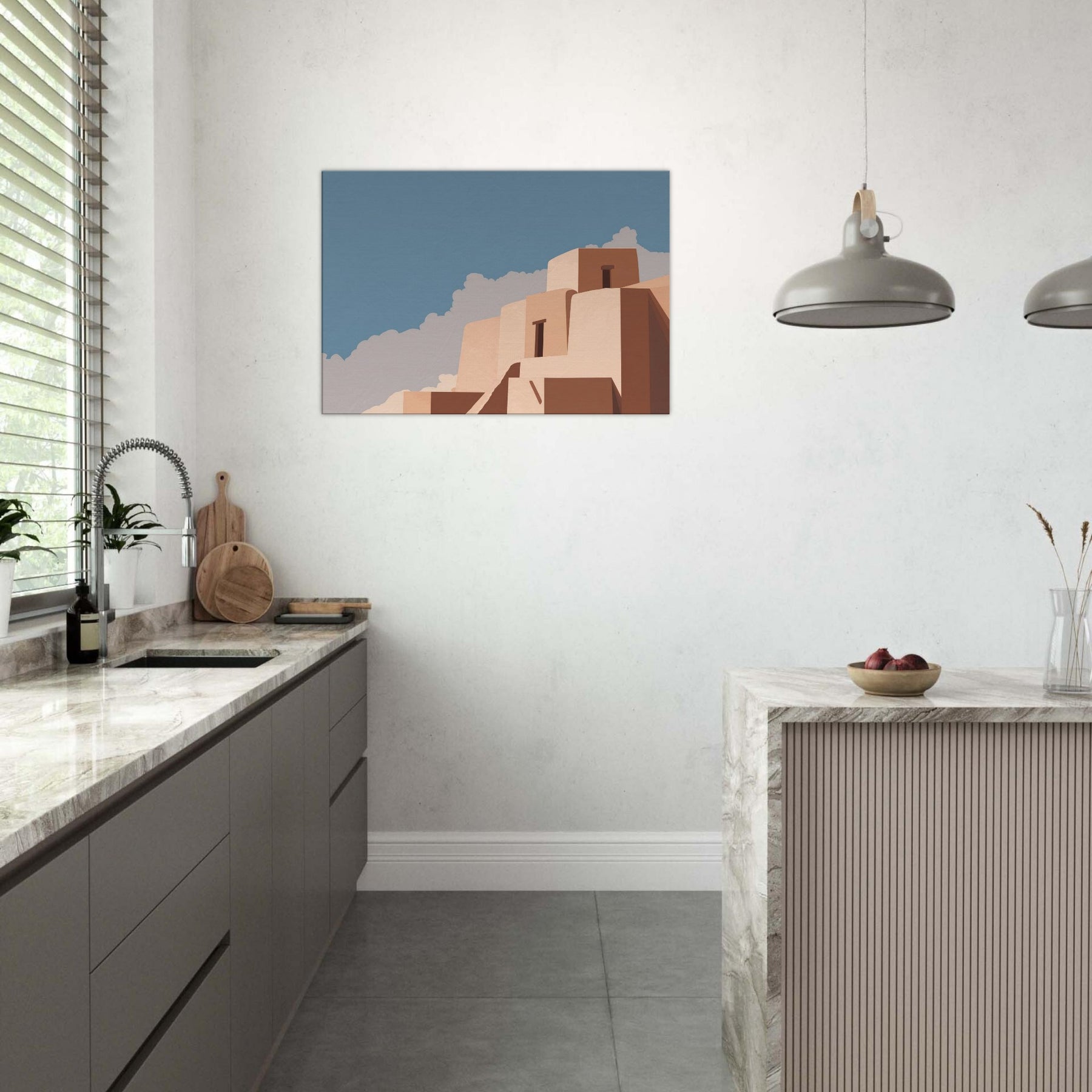 Athens unfolds in quiet geometric lines and pale marble tones, as if the city itself exhaled a measured breath. This minimalist composition captures the essence of Athens with clean blocks, softened edges, and a clear blue sky, inviting stillness into the room. Hang it above a sofa or desk to wash the space in warm light and subtle texture; the art becomes a daily reminder of timeless skies, sun filled courtyards, and the quiet grandeur of city architecture.