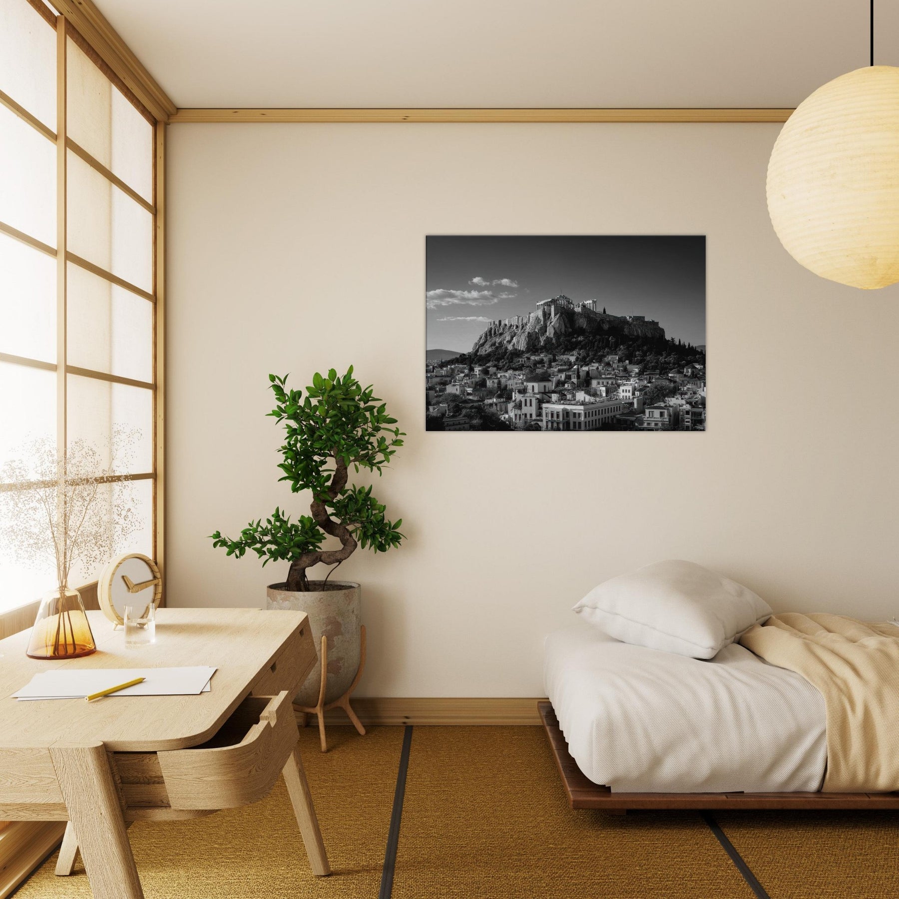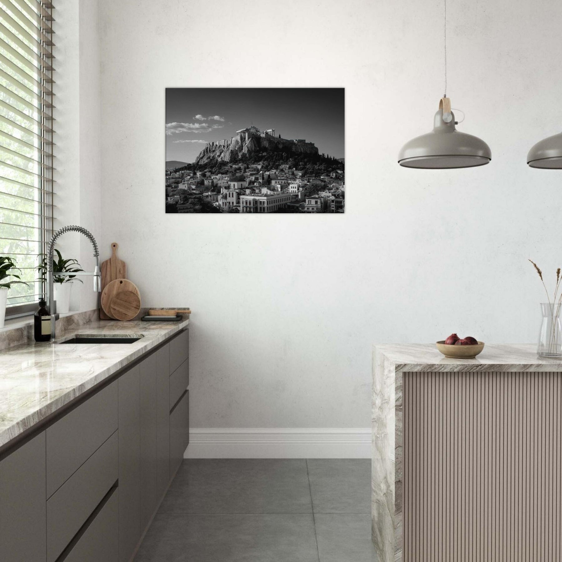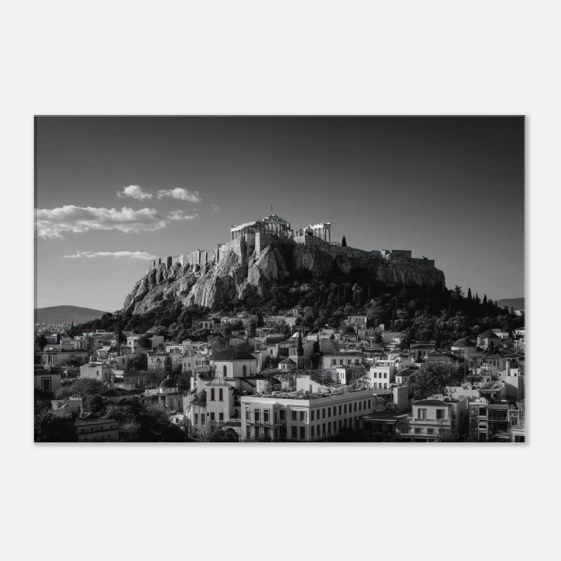 An elegant skyline unfolds in black and white, where ancient rock meets modern roofline. This intimate view of Athens dissolves into soft shadows and crisp lines, inviting quiet reflection as light gathers along stone contours. Hang this piece where you want a city's heartbeat to steady your day, above a sofa, in a hallway, or near a study; its restrained contrast turning every glance into a moment of calm, timelessly echoing the rhythm of the streets below.