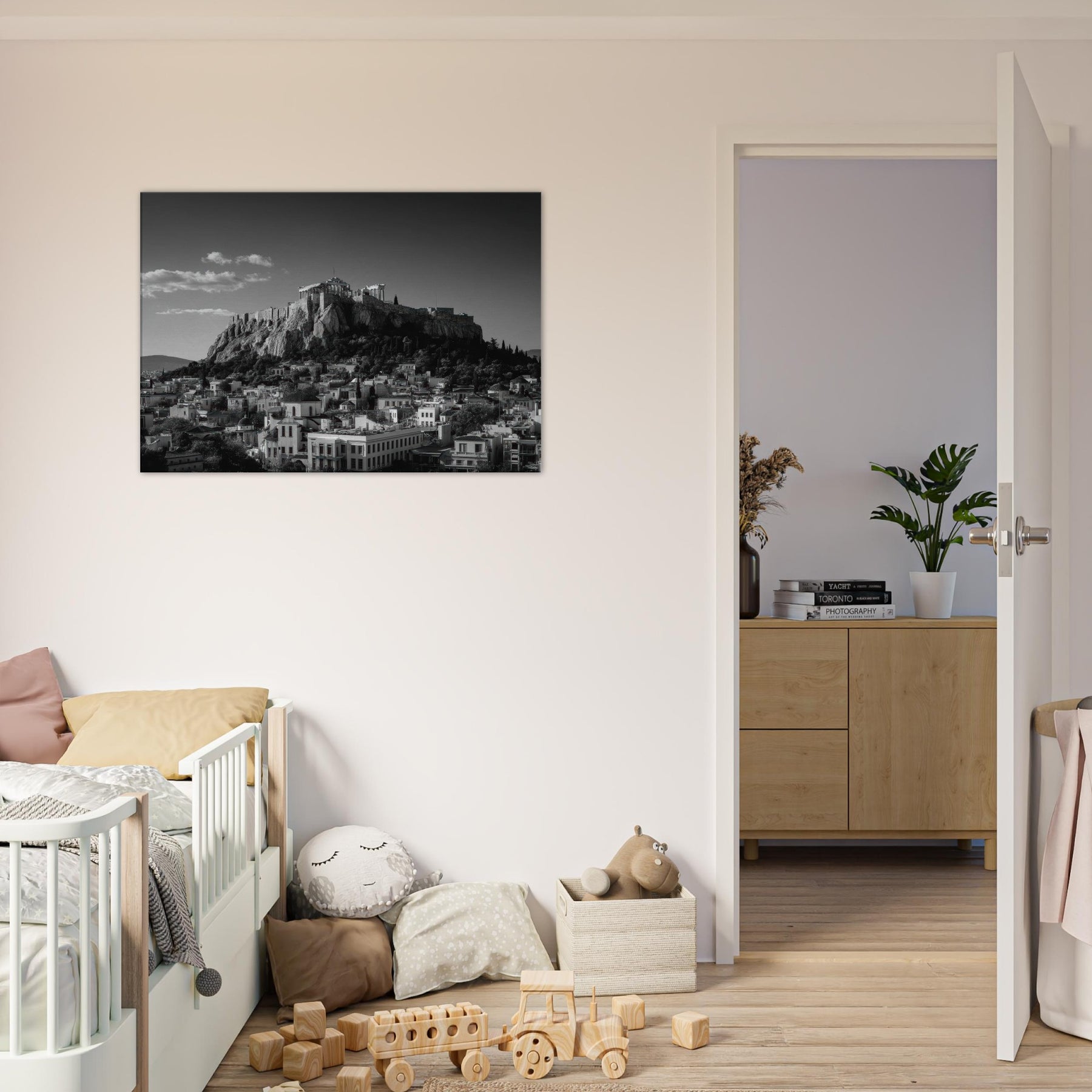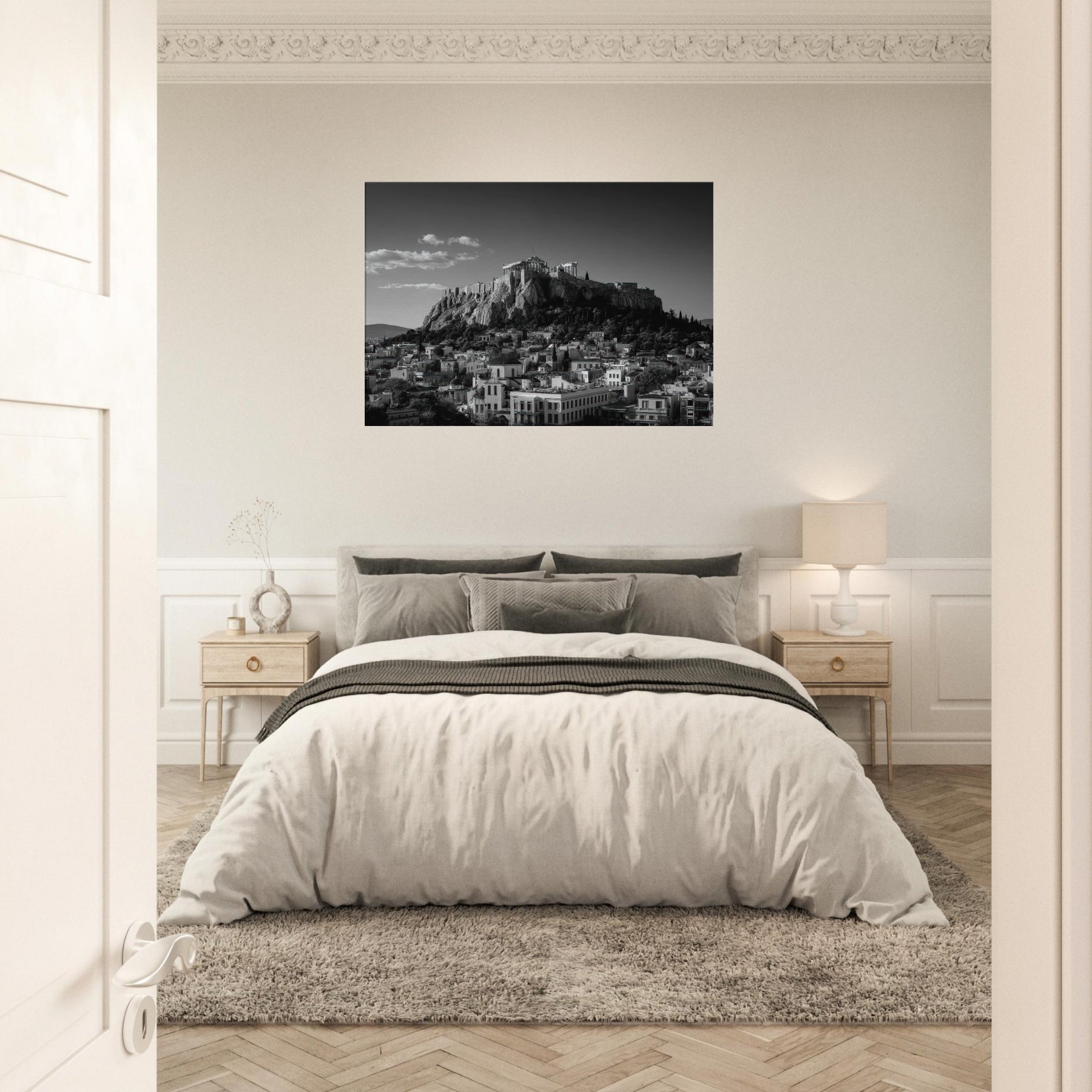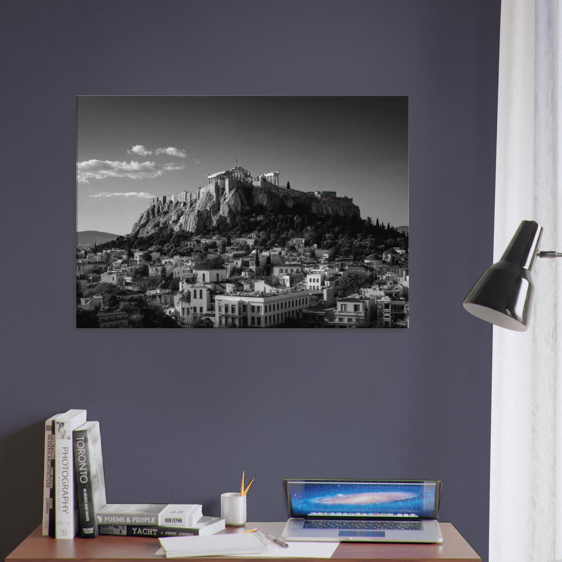 An elegant skyline unfolds in black and white, where ancient rock meets modern roofline. This intimate view of Athens dissolves into soft shadows and crisp lines, inviting quiet reflection as light gathers along stone contours. Hang this piece where you want a city's heartbeat to steady your day, above a sofa, in a hallway, or near a study; its restrained contrast turning every glance into a moment of calm, timelessly echoing the rhythm of the streets below.