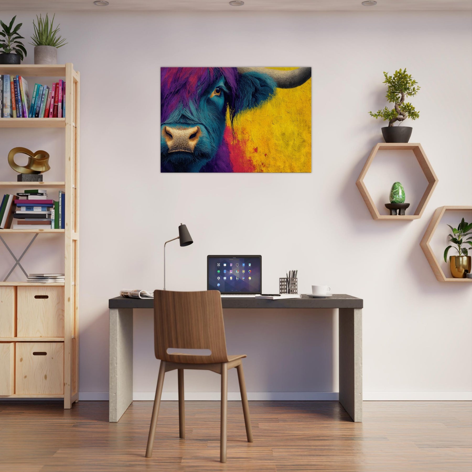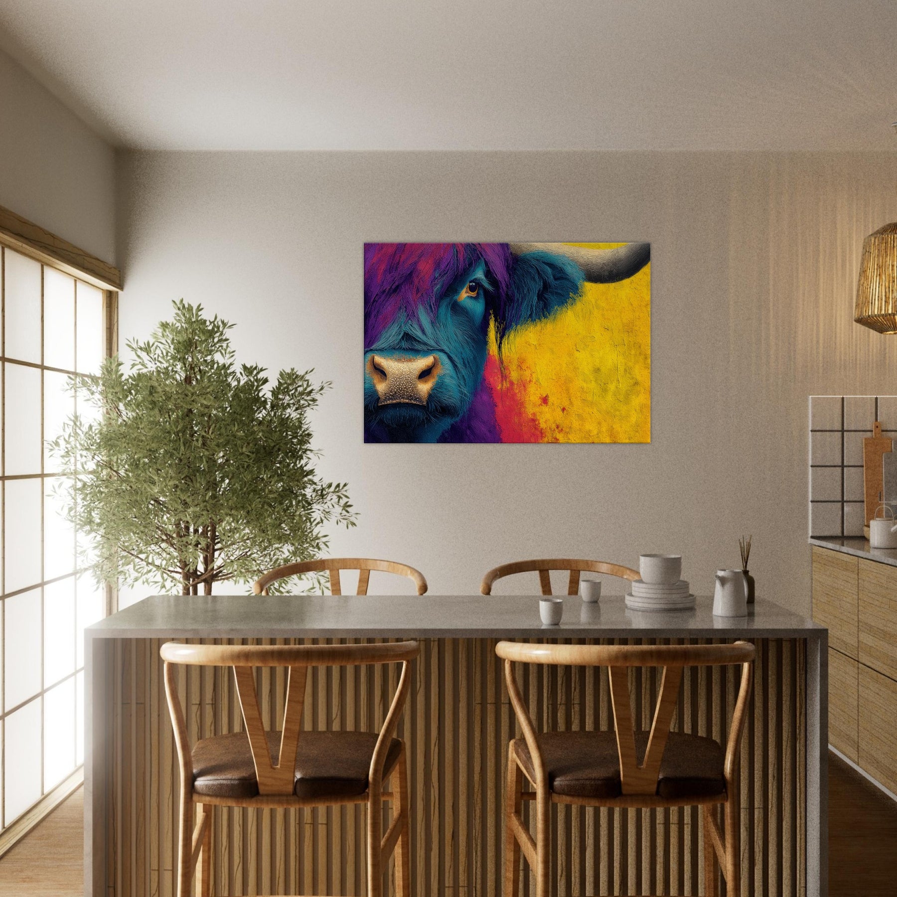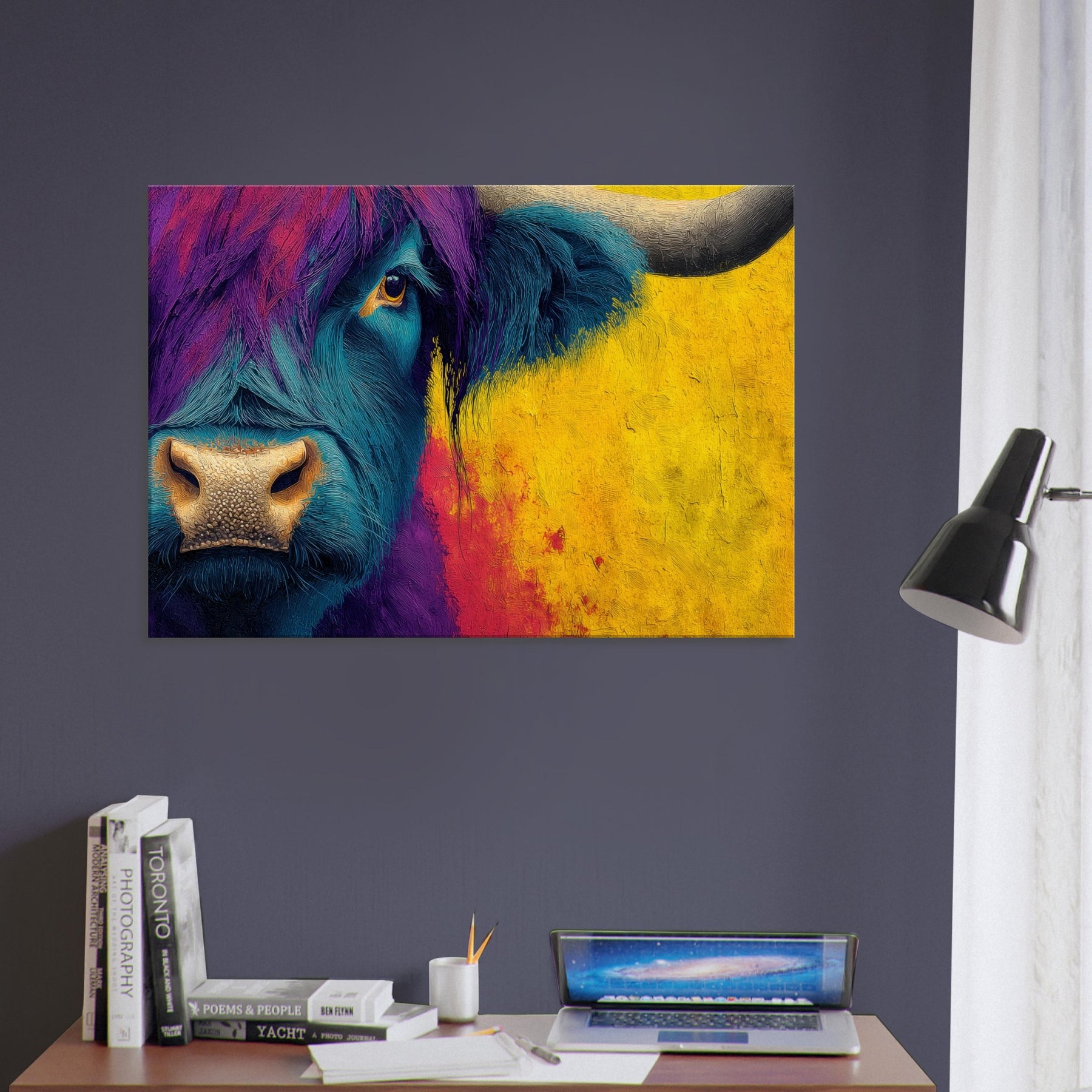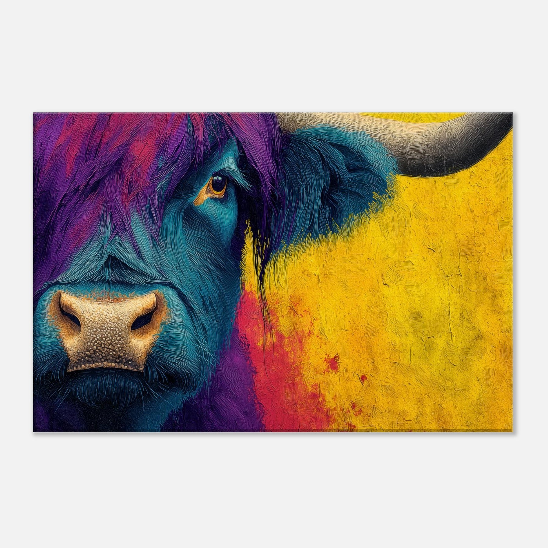 Let this bold Highland Cow invite a pulse of color into your room. The abstracted swirls of teal and purple across the beast’s fur mingle with a sunlit wash of ochre that warms the space, turning a quiet corner into a gallery of mood and memory. The subject stands calm and intimate, its eye bright with quiet curiosity, as if listening to your daily rhythms. Hang this piece to create a living room that feels spacious, soulful, and wonderfully untamed.
