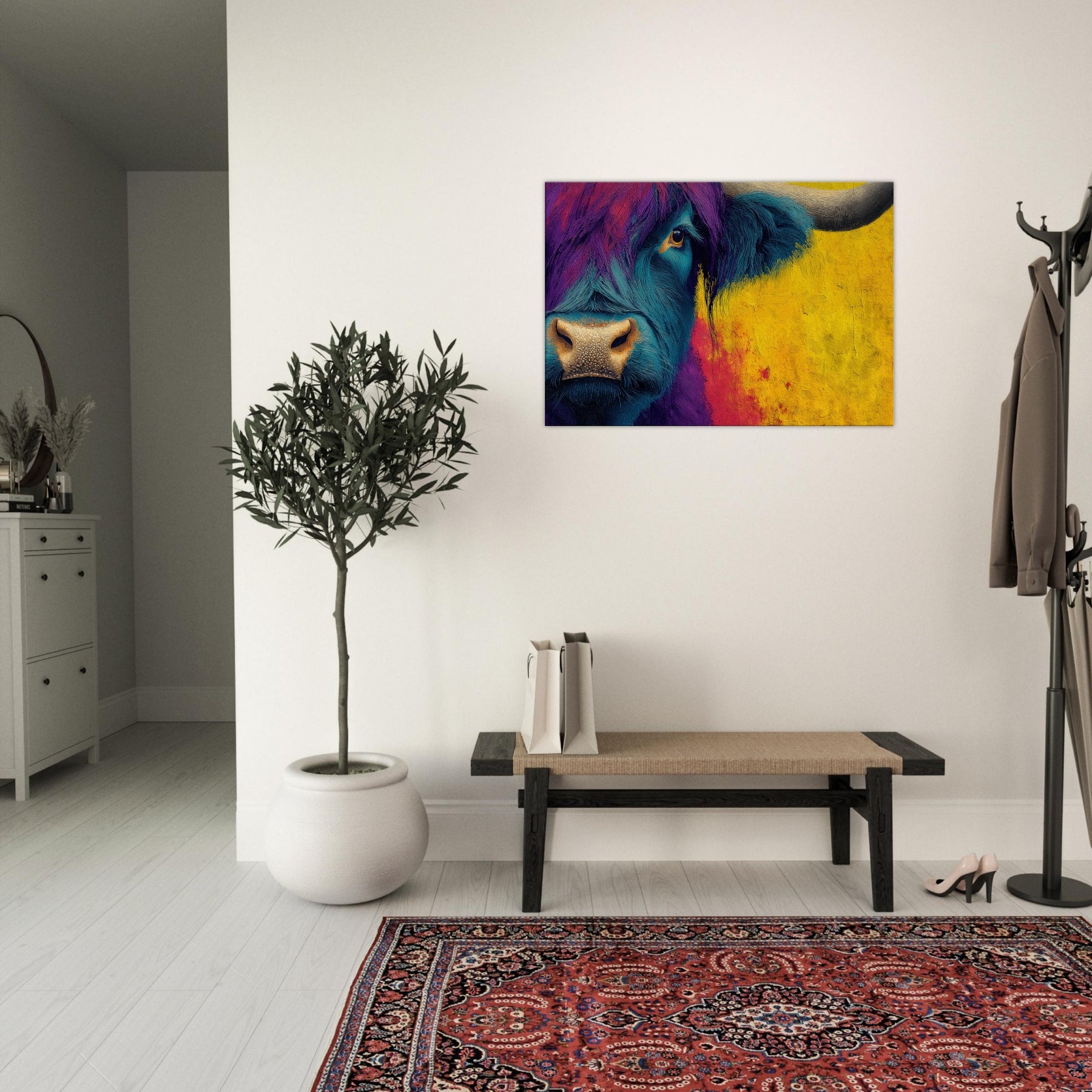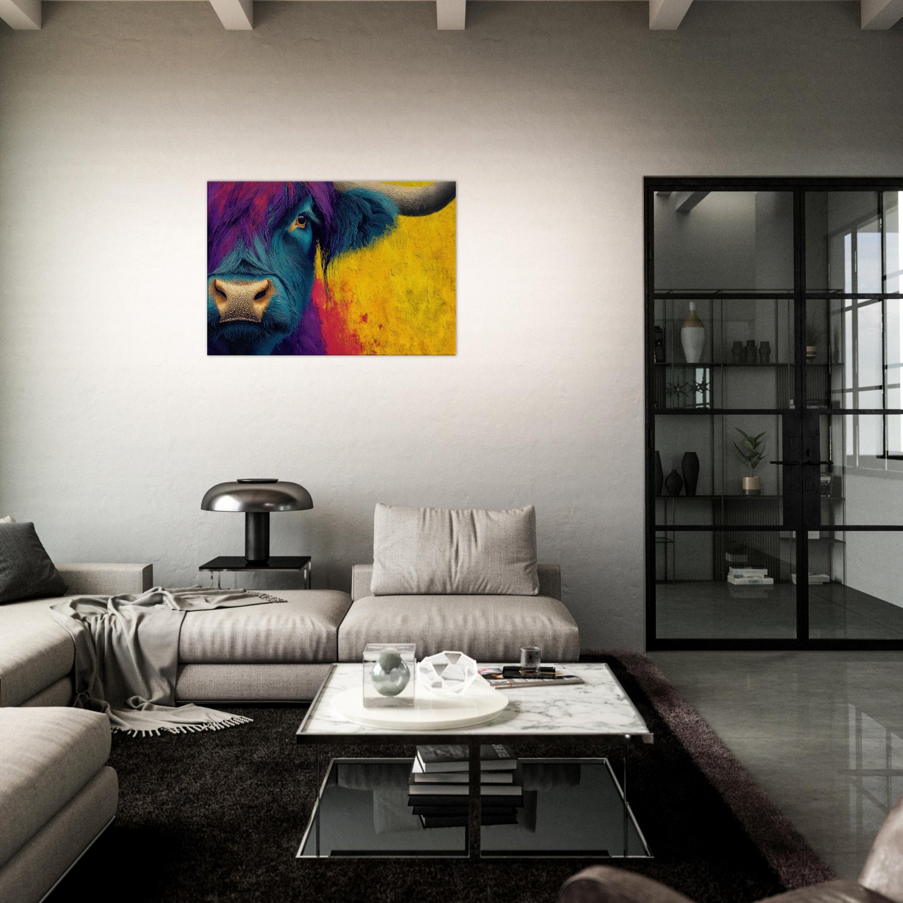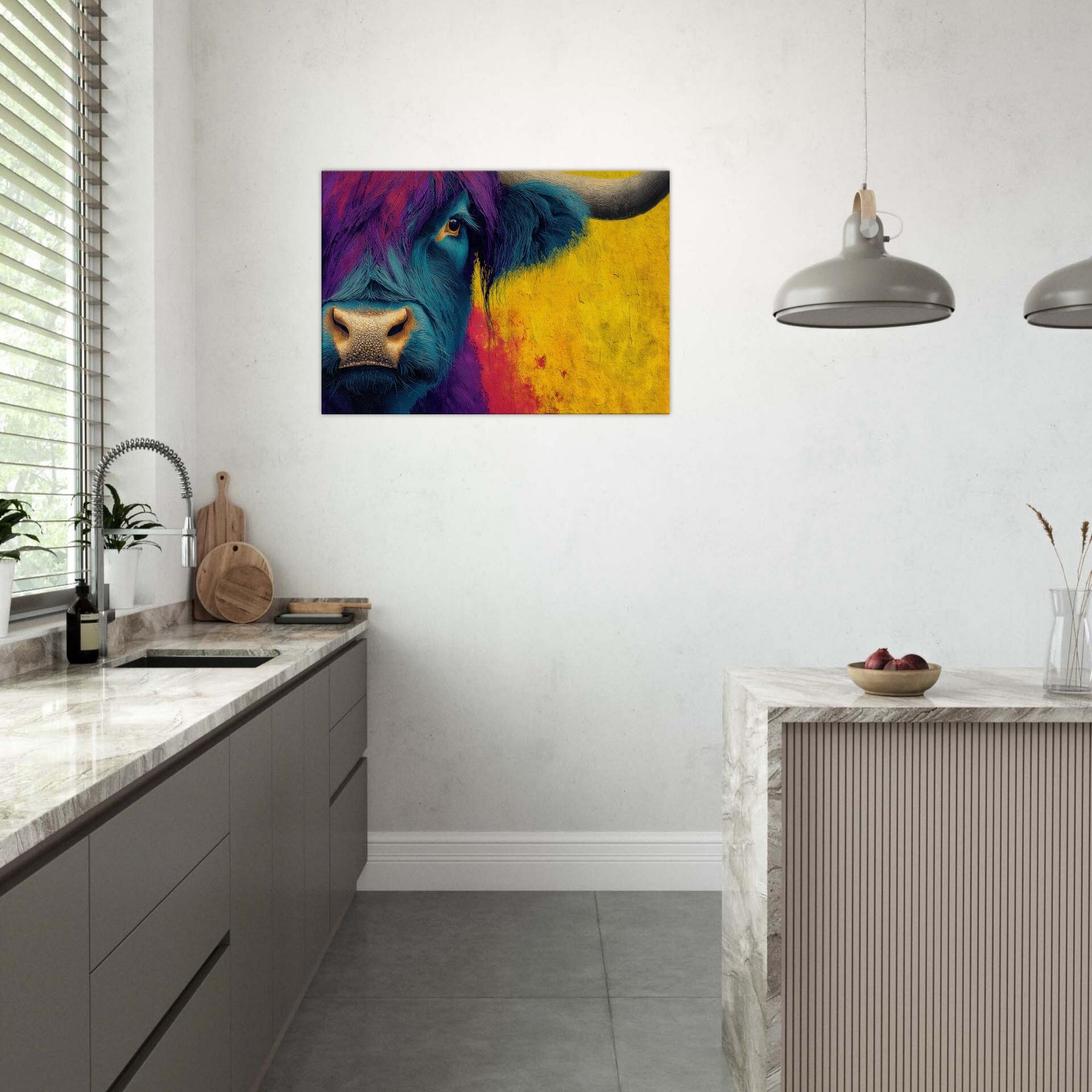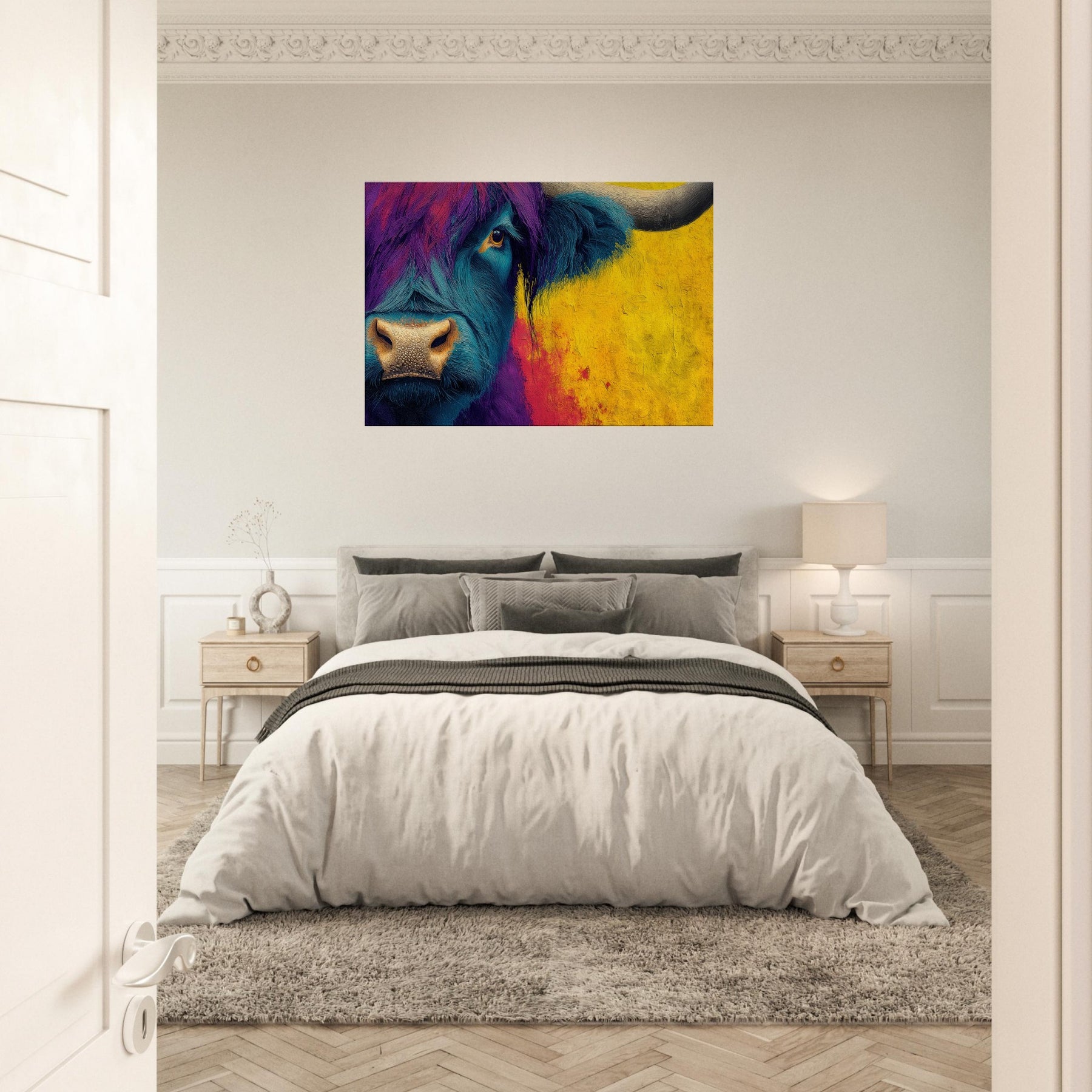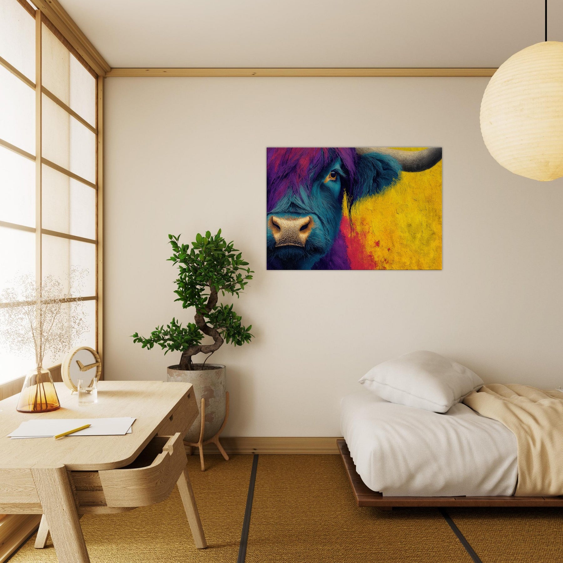 Let this bold Highland Cow invite a pulse of color into your room. The abstracted swirls of teal and purple across the beast’s fur mingle with a sunlit wash of ochre that warms the space, turning a quiet corner into a gallery of mood and memory. The subject stands calm and intimate, its eye bright with quiet curiosity, as if listening to your daily rhythms. Hang this piece to create a living room that feels spacious, soulful, and wonderfully untamed.
