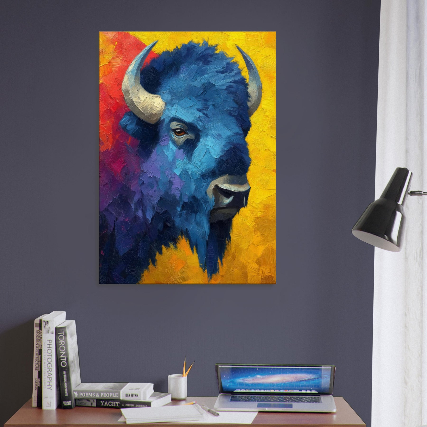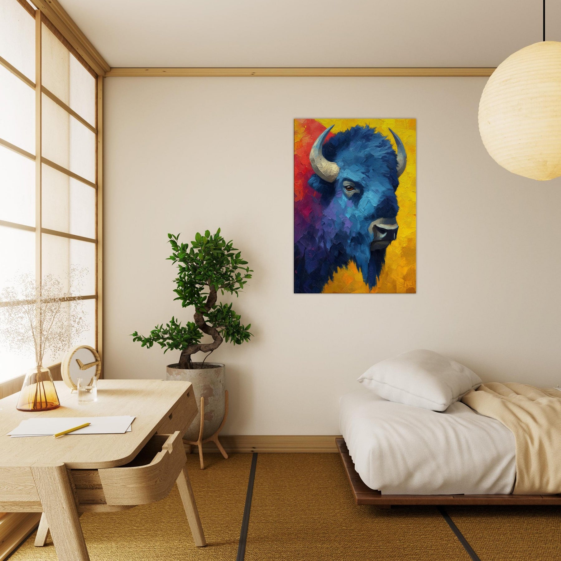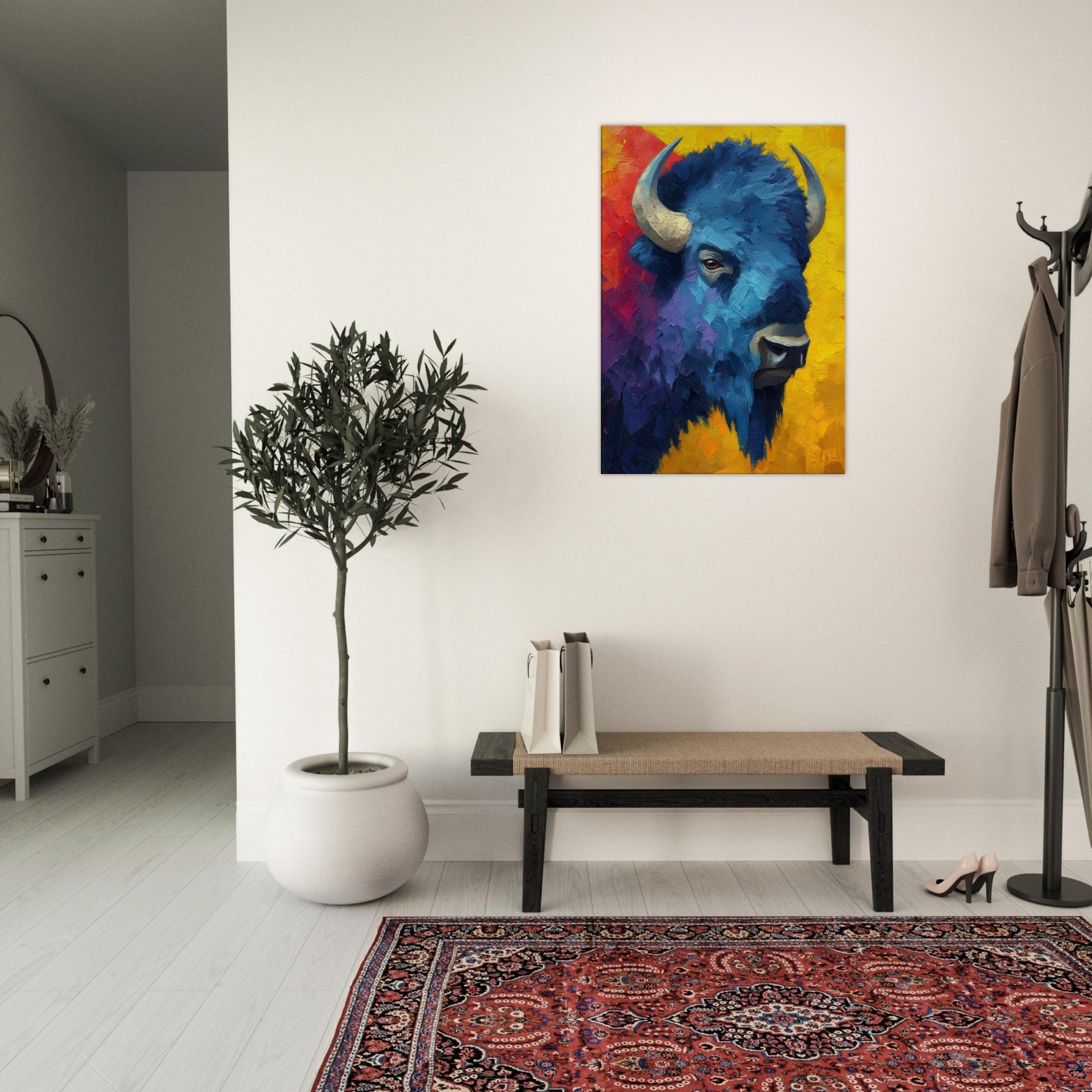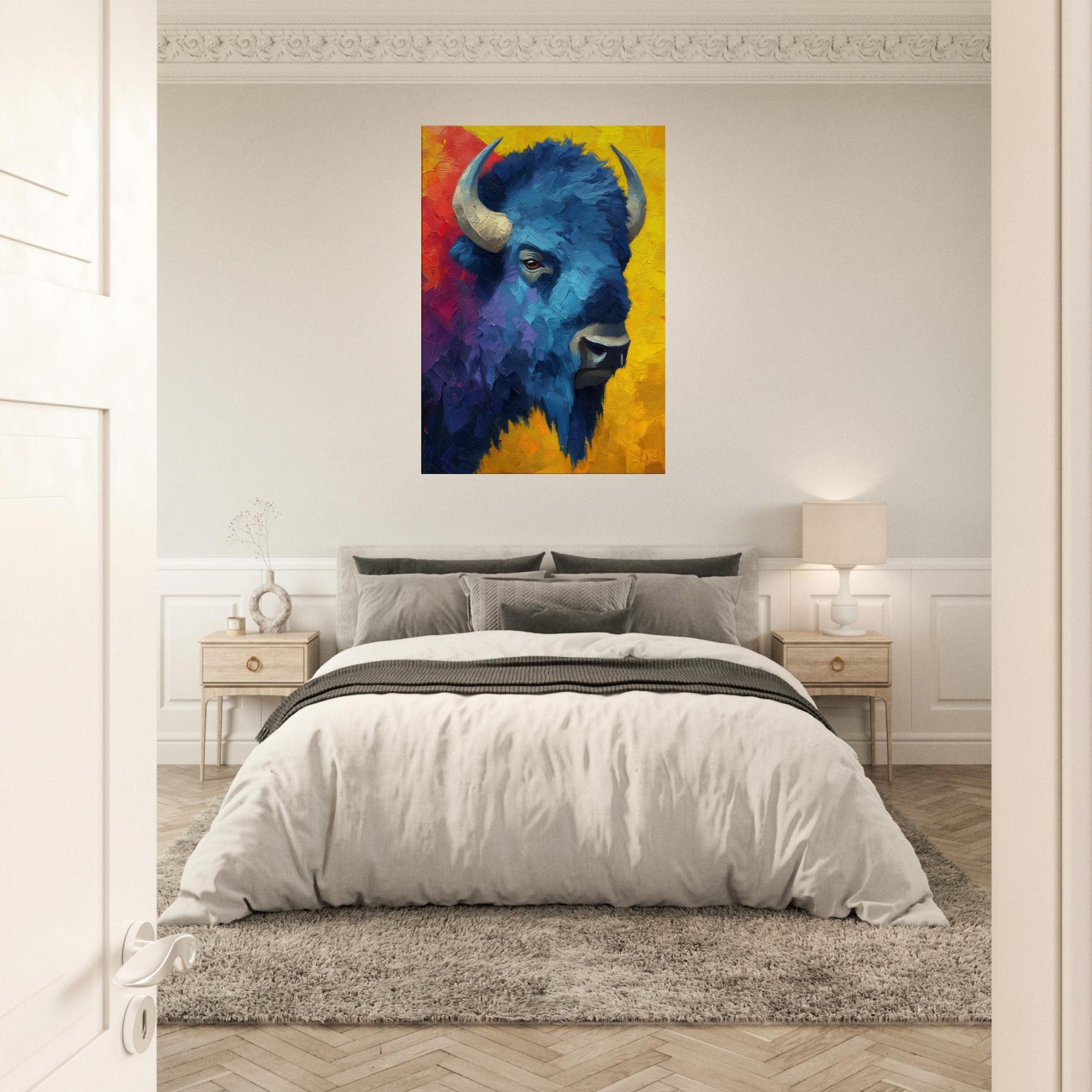 Let the Bison, rendered in electric blues and violet shadows, stride into your living room and shift the mood with unexpected warmth. The thick, painterly strokes catch light with a tactile rhythm, turning empty walls into a of courage and calm. Its bold color field contrasts with soft textiles, inviting quiet focus at day’s end and sparking conversation with guests. A statement piece that grounds your space while proving art can feel both wild and refined.