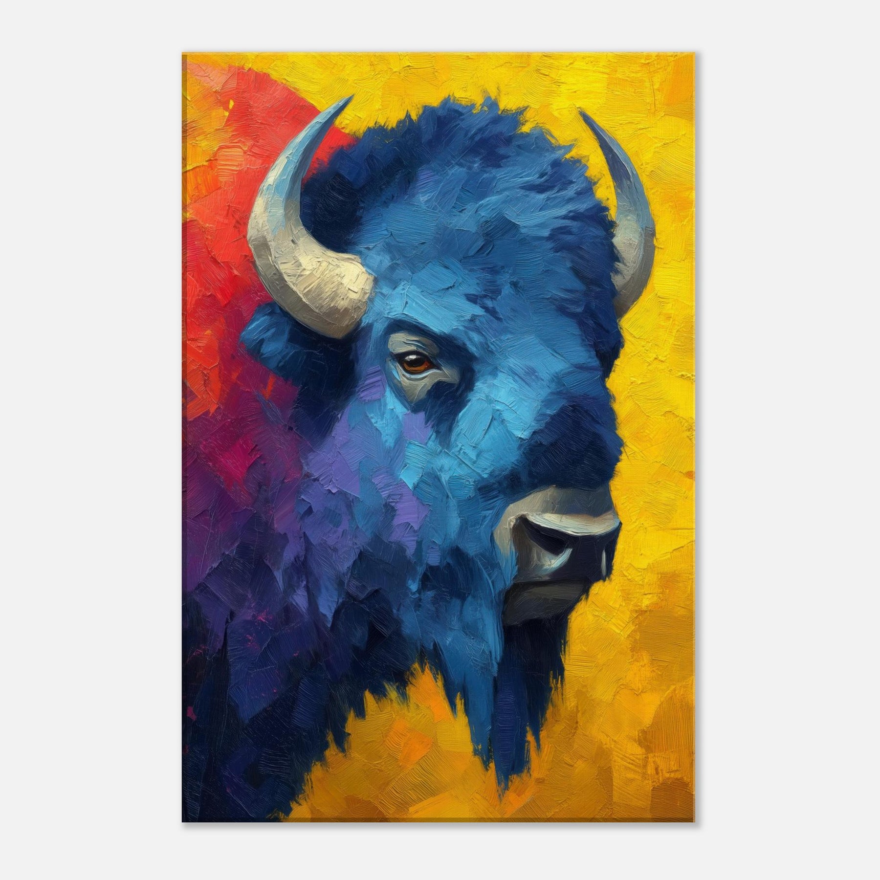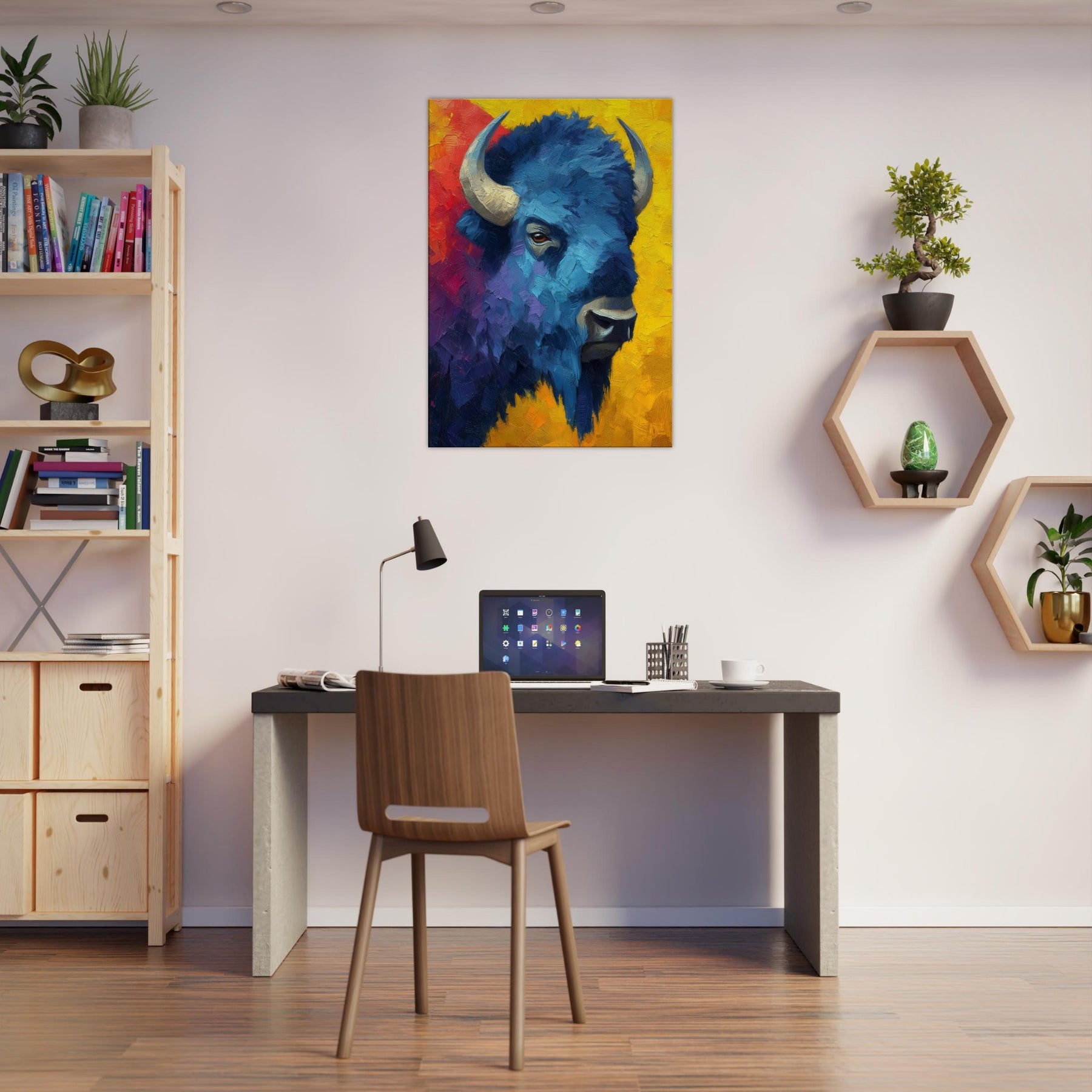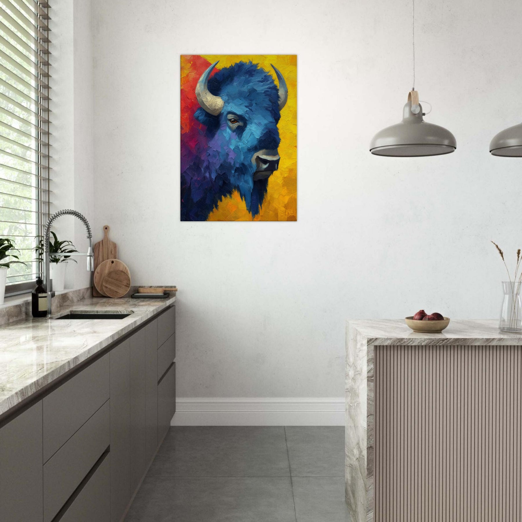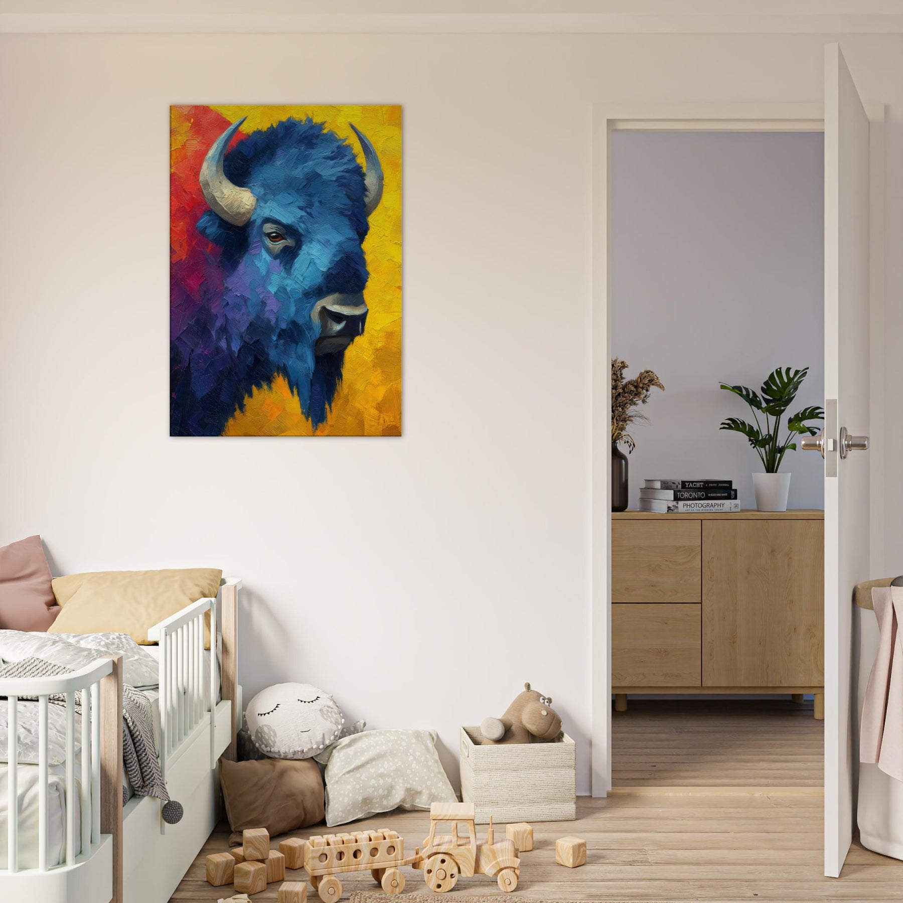 Let the Bison, rendered in electric blues and violet shadows, stride into your living room and shift the mood with unexpected warmth. The thick, painterly strokes catch light with a tactile rhythm, turning empty walls into a of courage and calm. Its bold color field contrasts with soft textiles, inviting quiet focus at day’s end and sparking conversation with guests. A statement piece that grounds your space while proving art can feel both wild and refined.