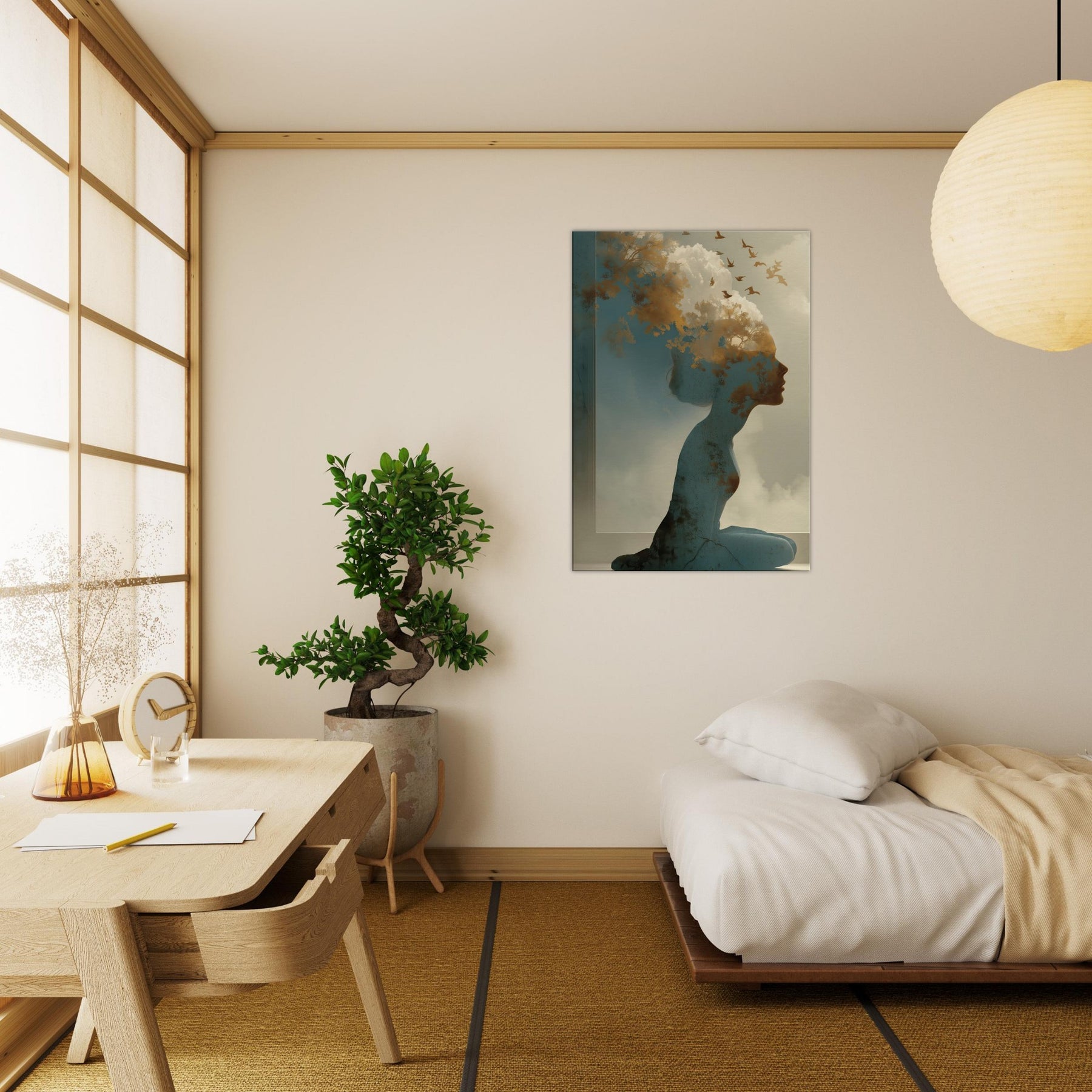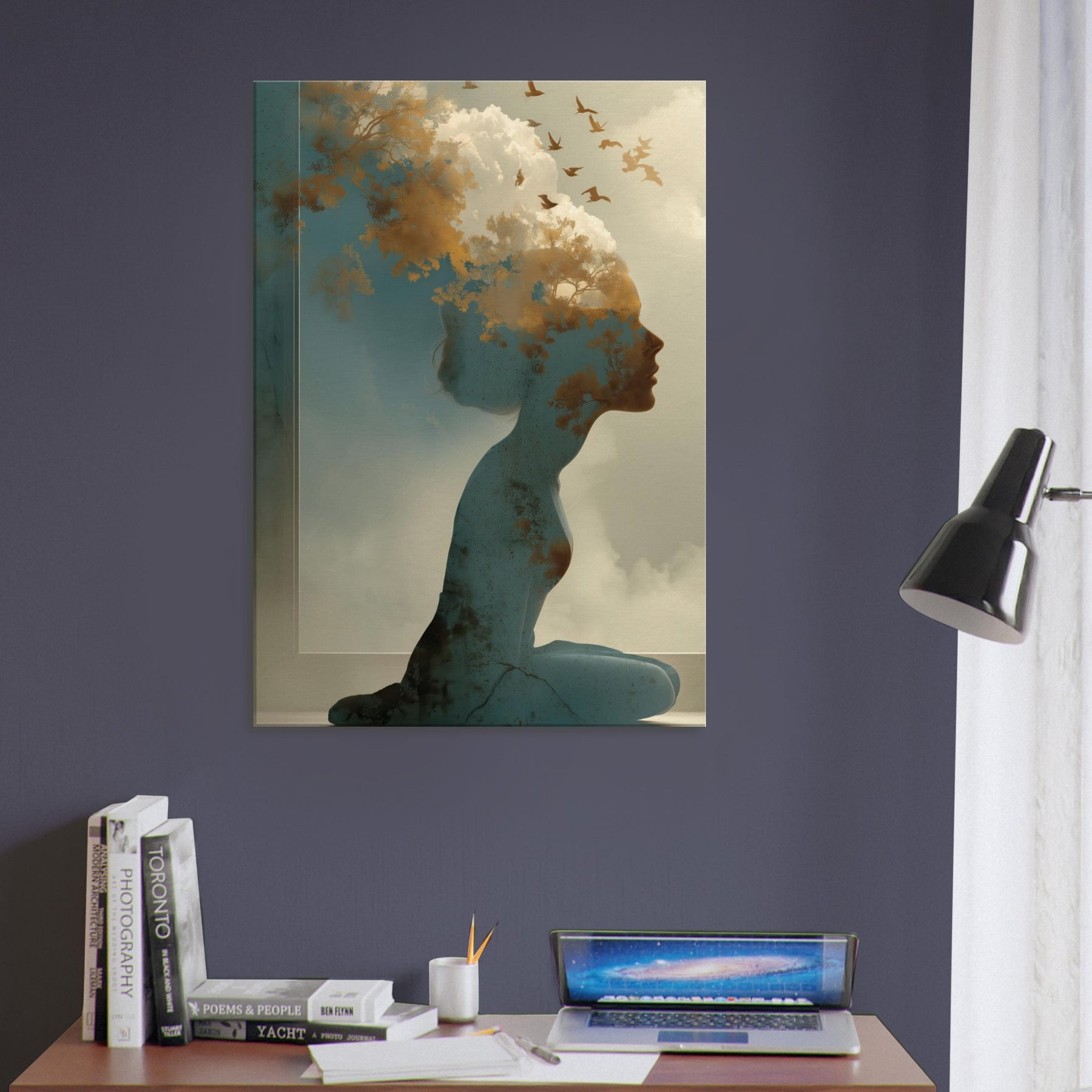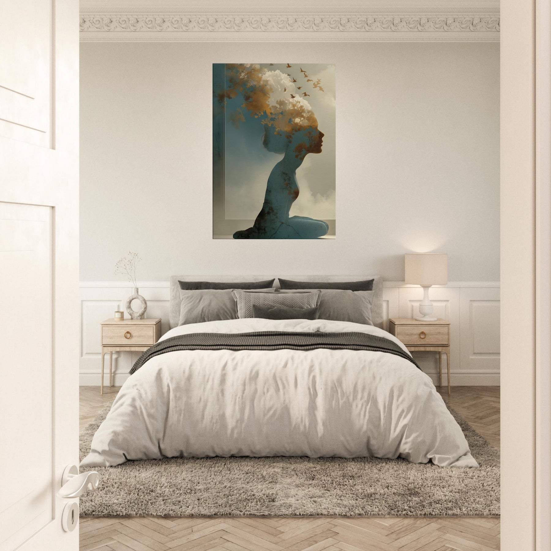 An ethereal Ballerina Silhouette rises from a mist of clouds, her form braided with birds and tree branch echoes in a single dreamlike frame. This surreal composition blurs body and sky, memory and moment, inviting a calm, expansive mood into any living space. The warm beige and teal palette glows softly, turning walls into a quiet theater of breath and movement. Hang it where morning light lingers living room, studio, or bedroom to invite imagination to linger with you as you rest and reflect.
