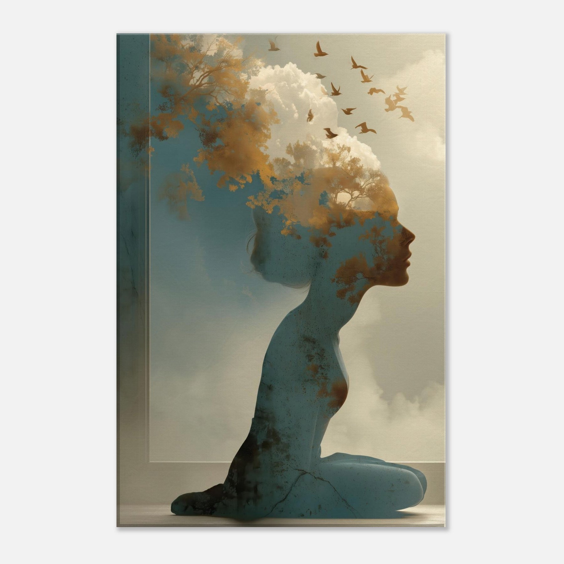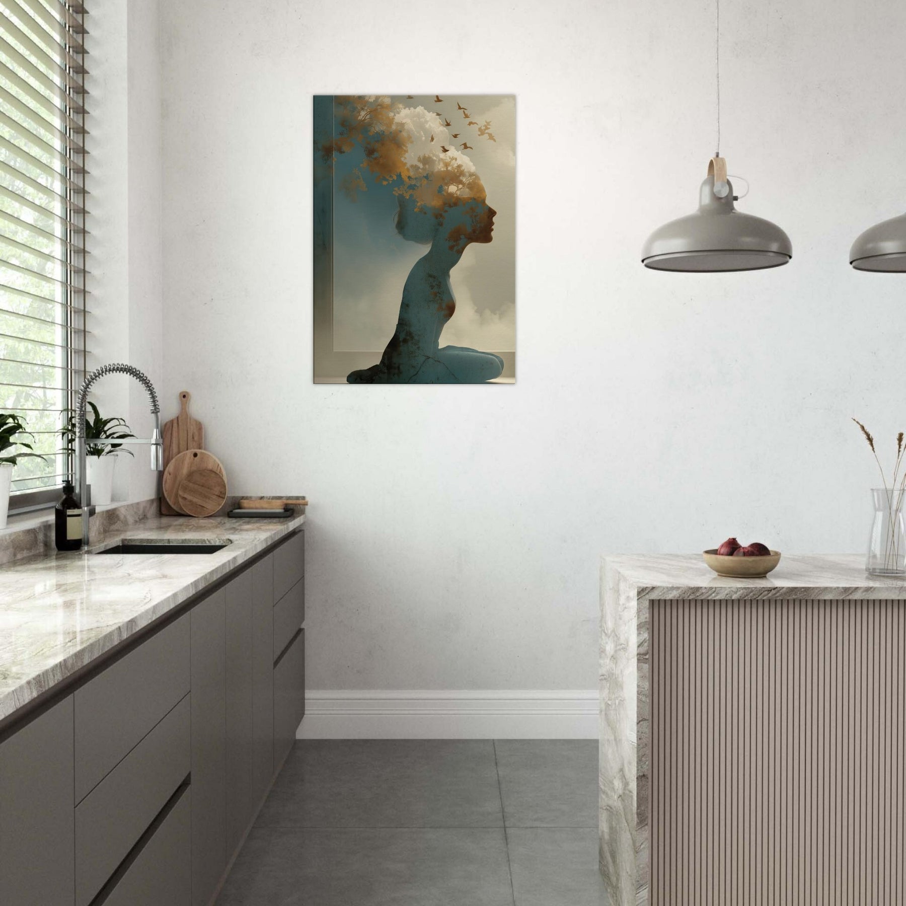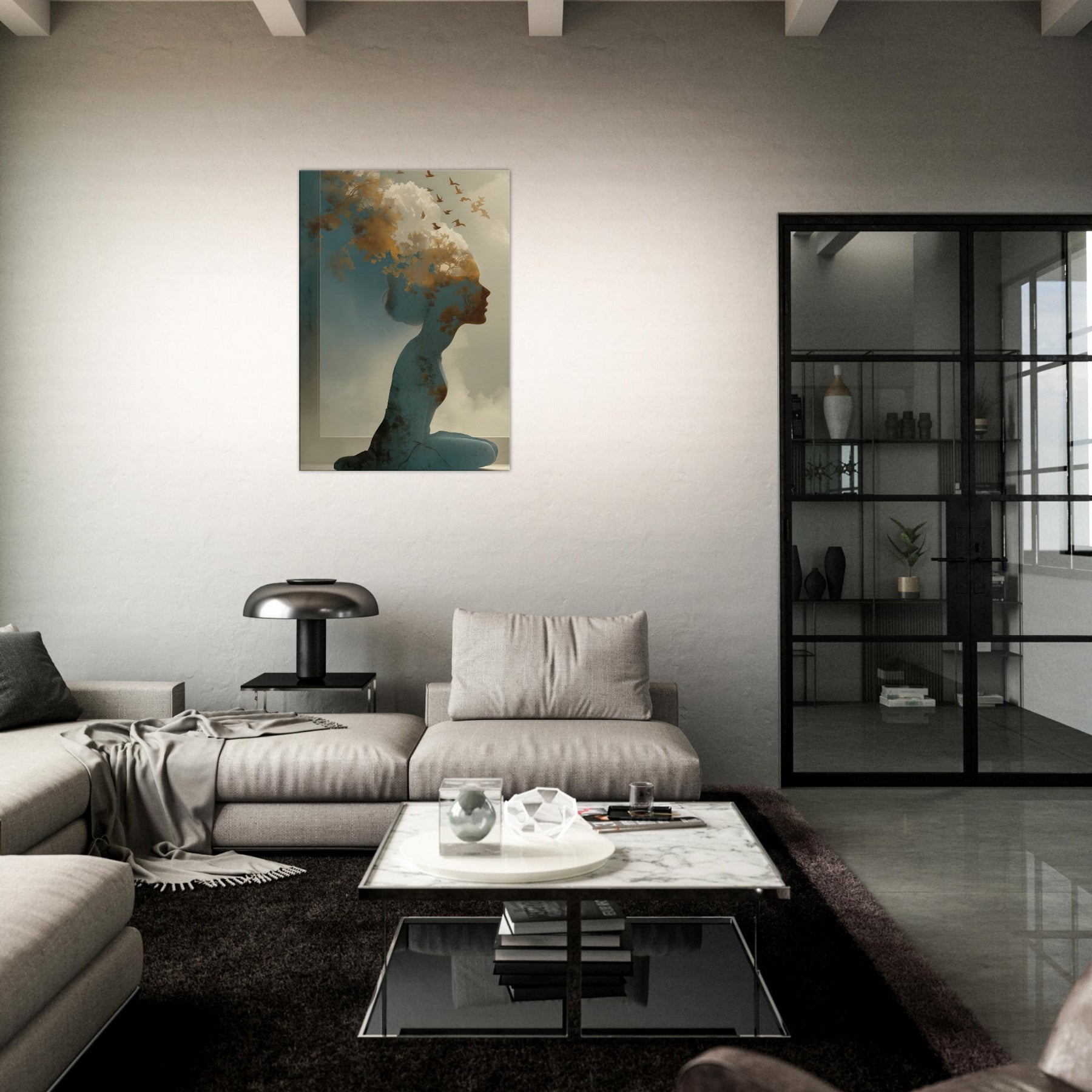 An ethereal Ballerina Silhouette rises from a mist of clouds, her form braided with birds and tree branch echoes in a single dreamlike frame. This surreal composition blurs body and sky, memory and moment, inviting a calm, expansive mood into any living space. The warm beige and teal palette glows softly, turning walls into a quiet theater of breath and movement. Hang it where morning light lingers living room, studio, or bedroom to invite imagination to linger with you as you rest and reflect.