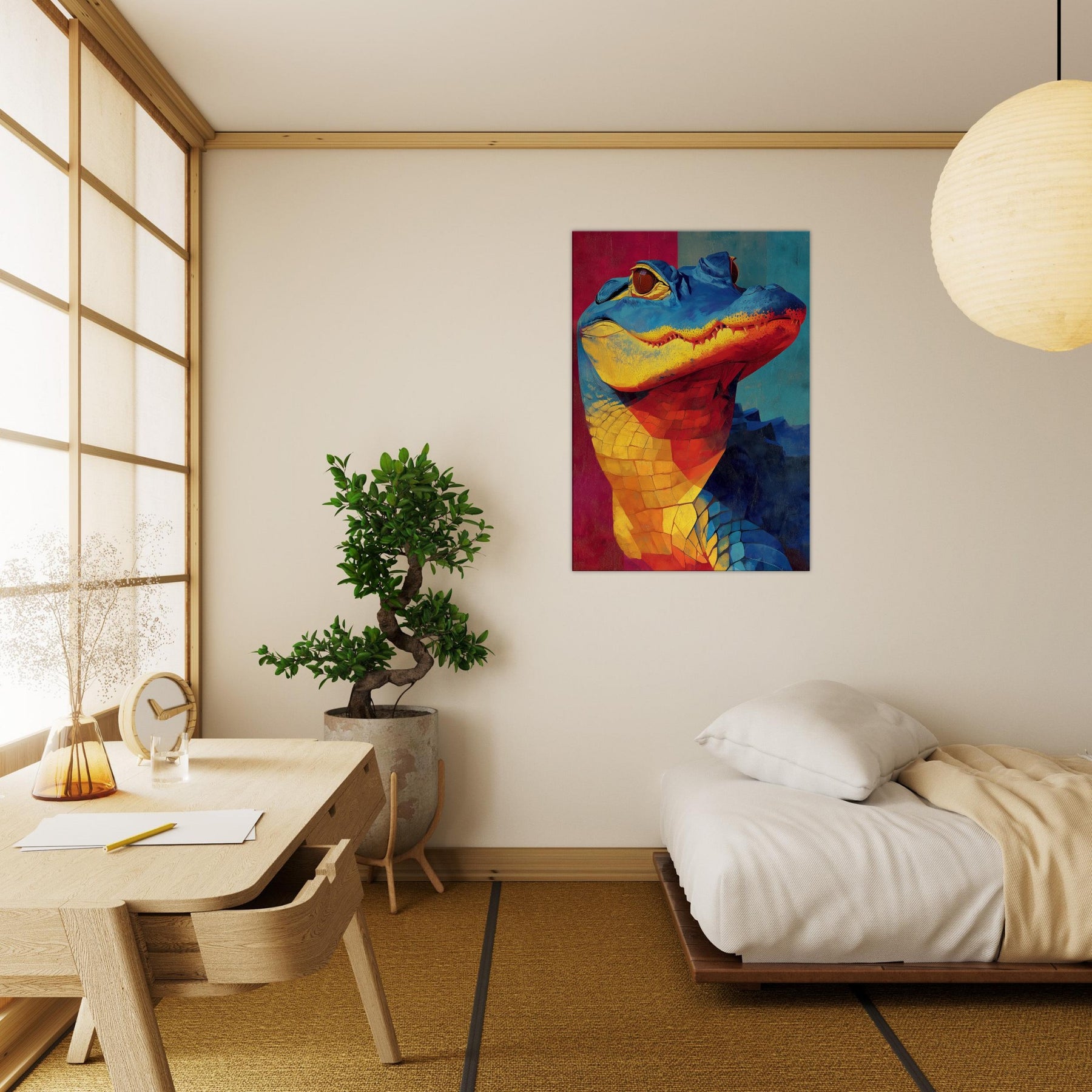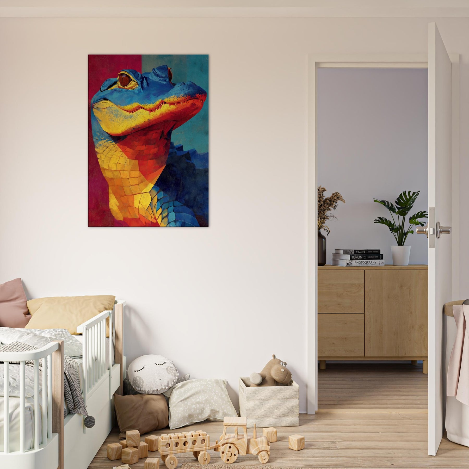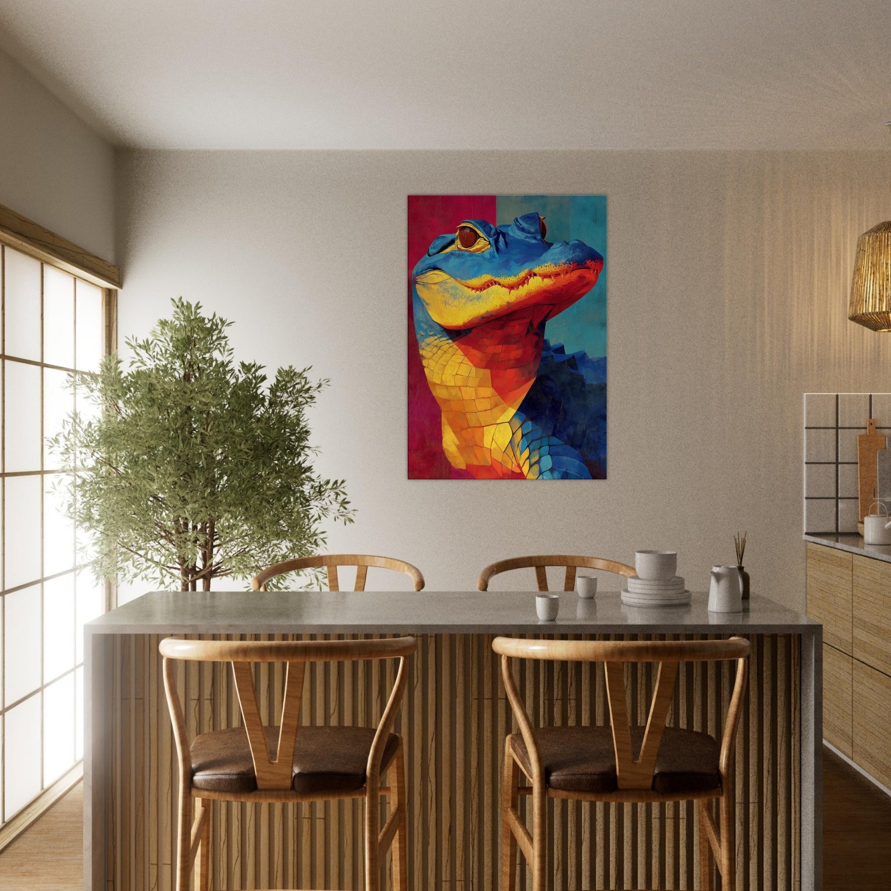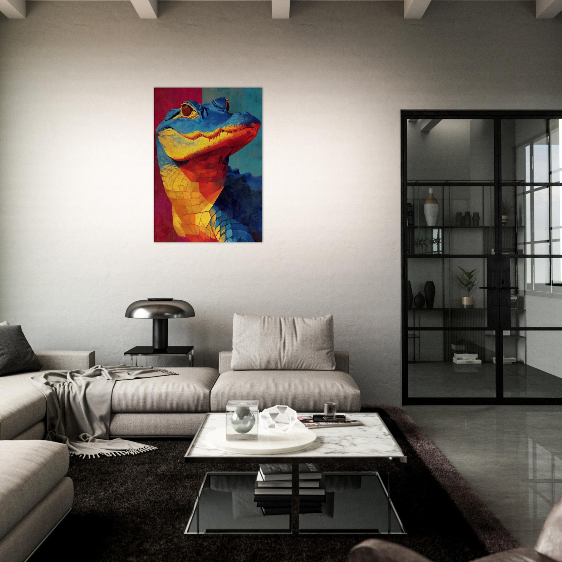 An electric fusion of scales and color, this Alligator leaps from the canvas in a tide of blues, yellows, and crimson. The abstract forms fold and shimmer, inviting the eye to wander across its armored neck and sunlit maw. In a living room or studio, it becomes a heartbeat of warmth and daring a conversation piece that threads tropical heat with modern minimalism, turning ordinary walls into a dynamic, cinematic backdrop.