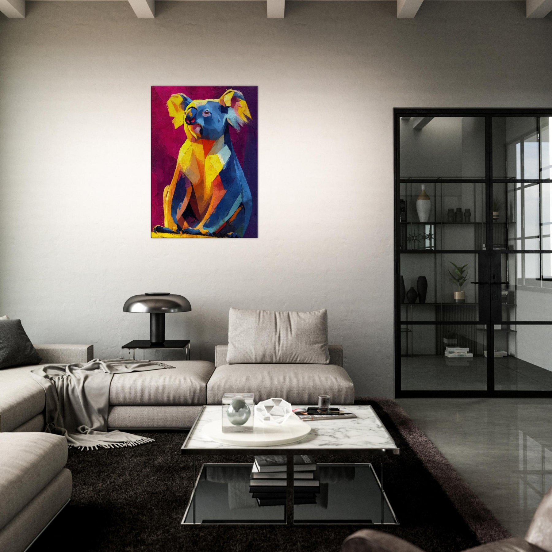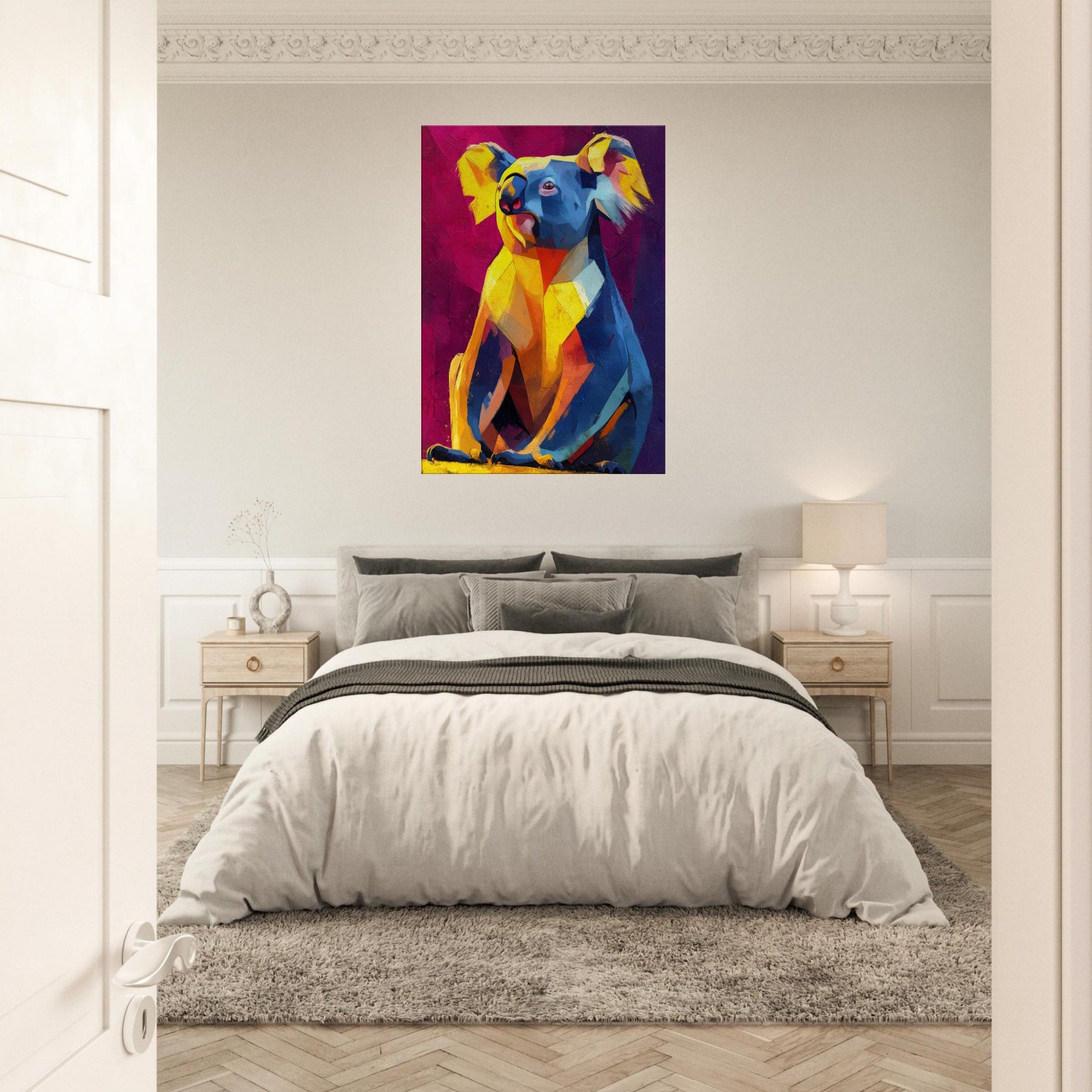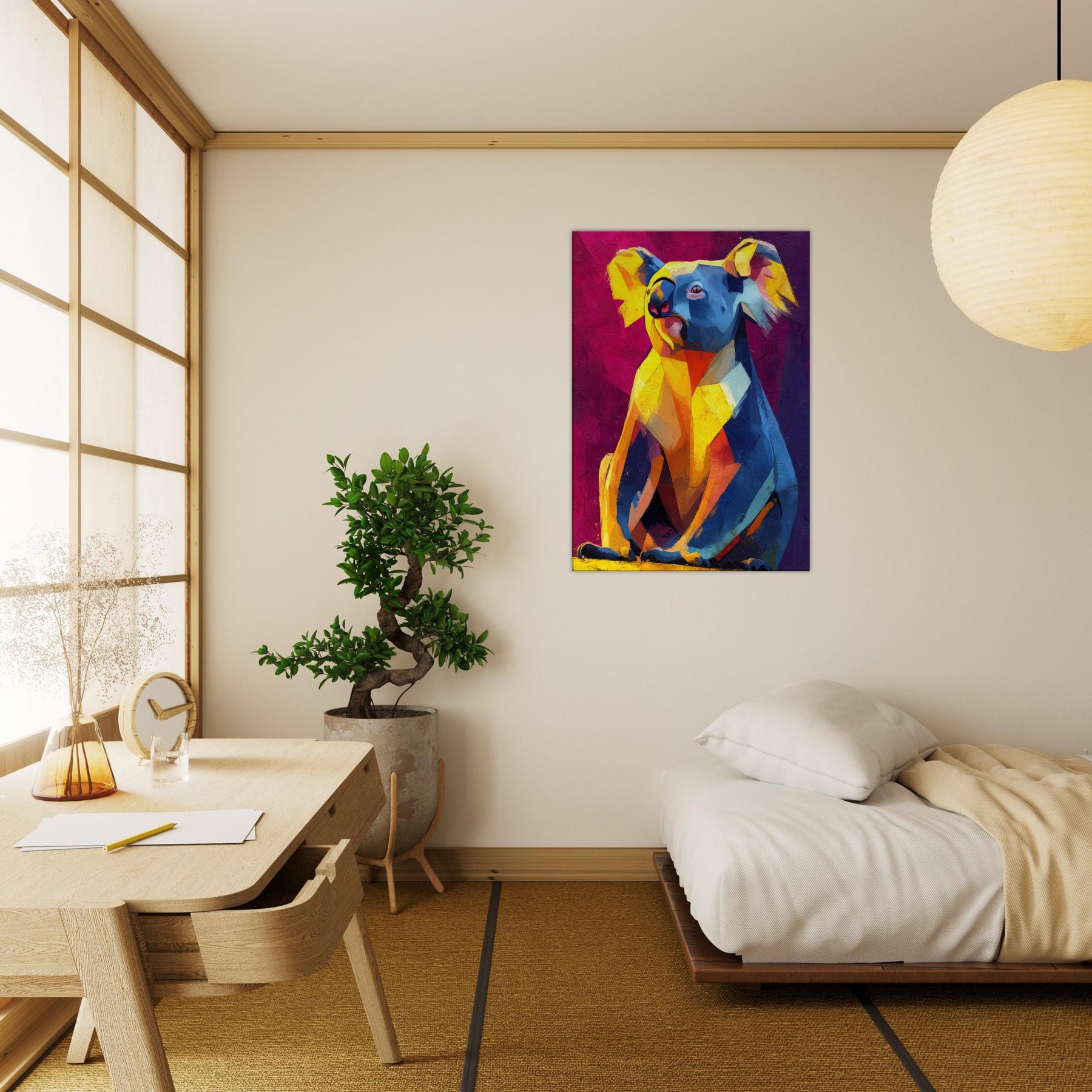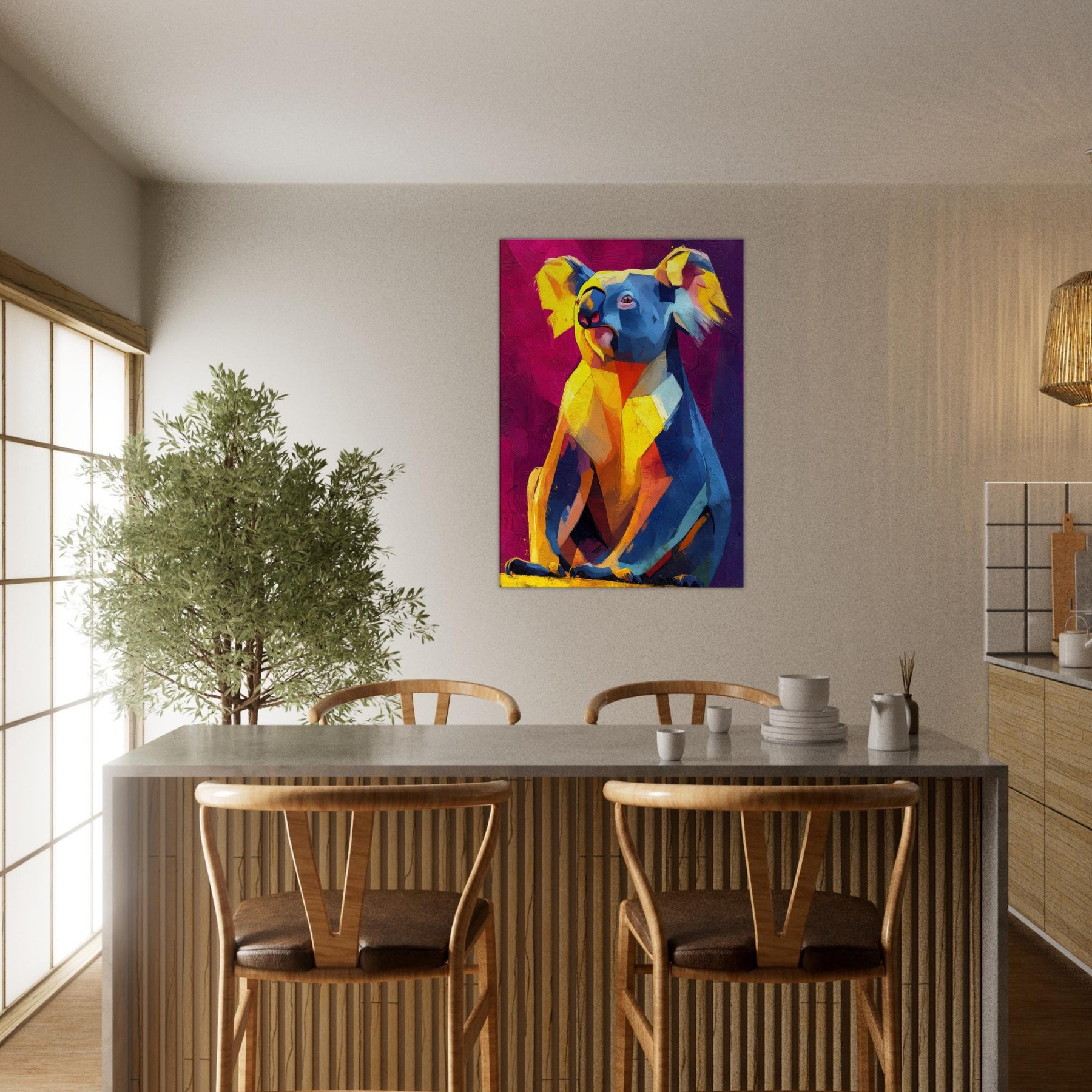 Let the Koala sit buoyant in a blaze of color, and your room becomes a warm, sunlit canopy. This abstract inspired composition glows with electric blues, radiant yellows, and smoky magentas that sweep across the walls like a heartbeat. The Koala's serene gaze anchors the space while the geometric planes ripple with energy, inviting quiet curiosity. It pairs beautifully with modern furnishings and soft textures, turning a living area into a playful refuge where conversation blooms, and art feels as comforting as a held breath.