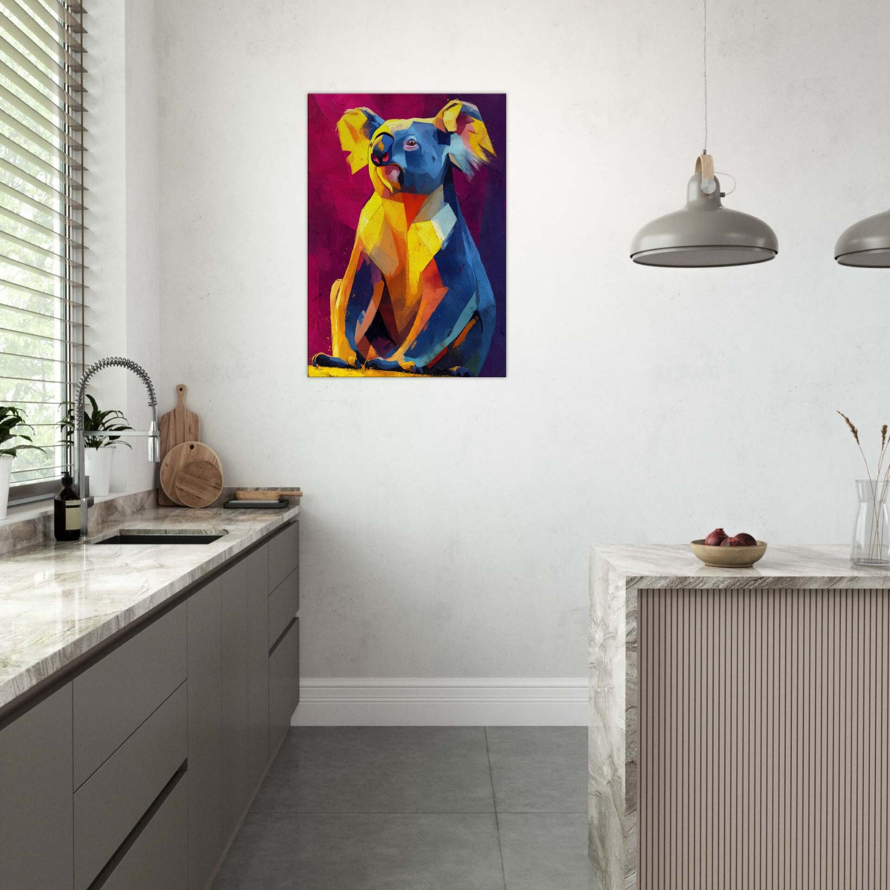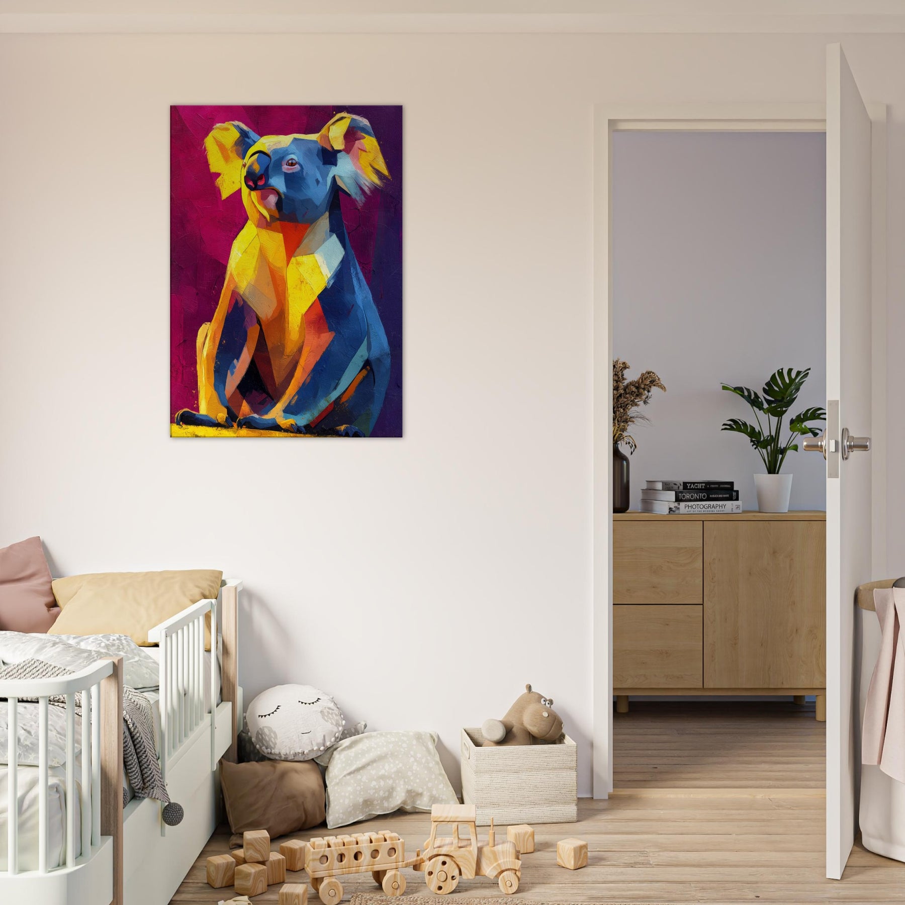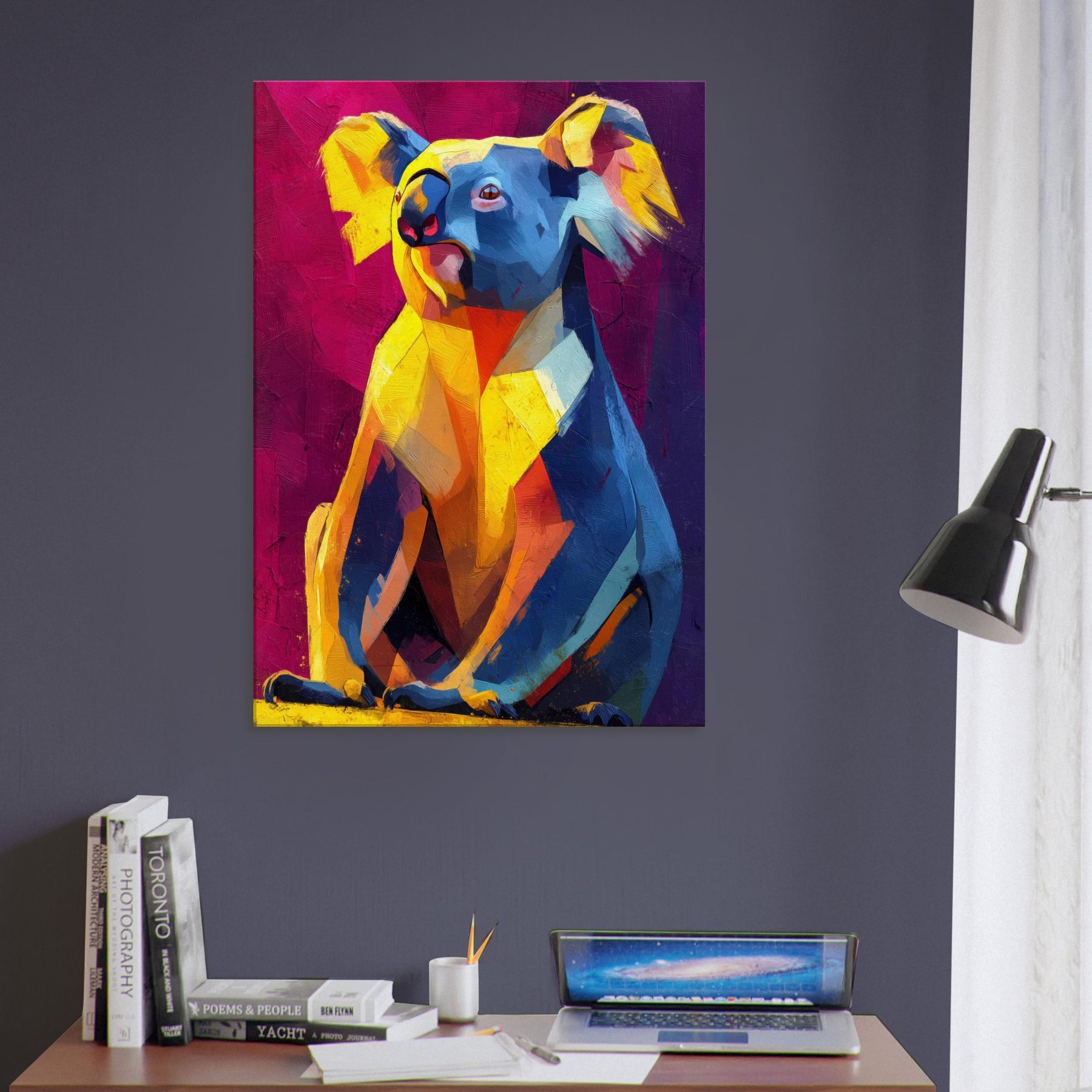 Let the Koala sit buoyant in a blaze of color, and your room becomes a warm, sunlit canopy. This abstract inspired composition glows with electric blues, radiant yellows, and smoky magentas that sweep across the walls like a heartbeat. The Koala's serene gaze anchors the space while the geometric planes ripple with energy, inviting quiet curiosity. It pairs beautifully with modern furnishings and soft textures, turning a living area into a playful refuge where conversation blooms, and art feels as comforting as a held breath.