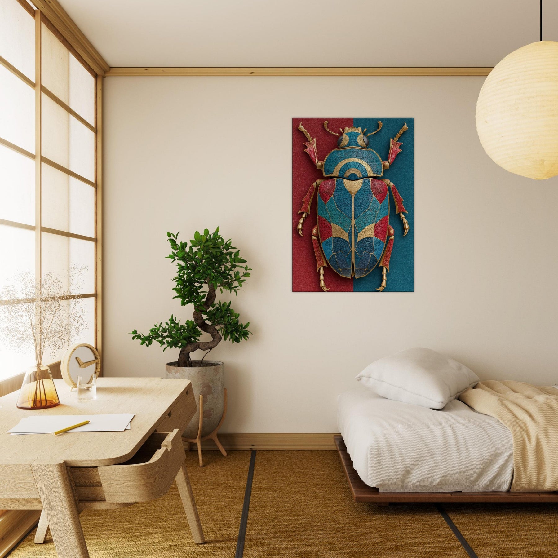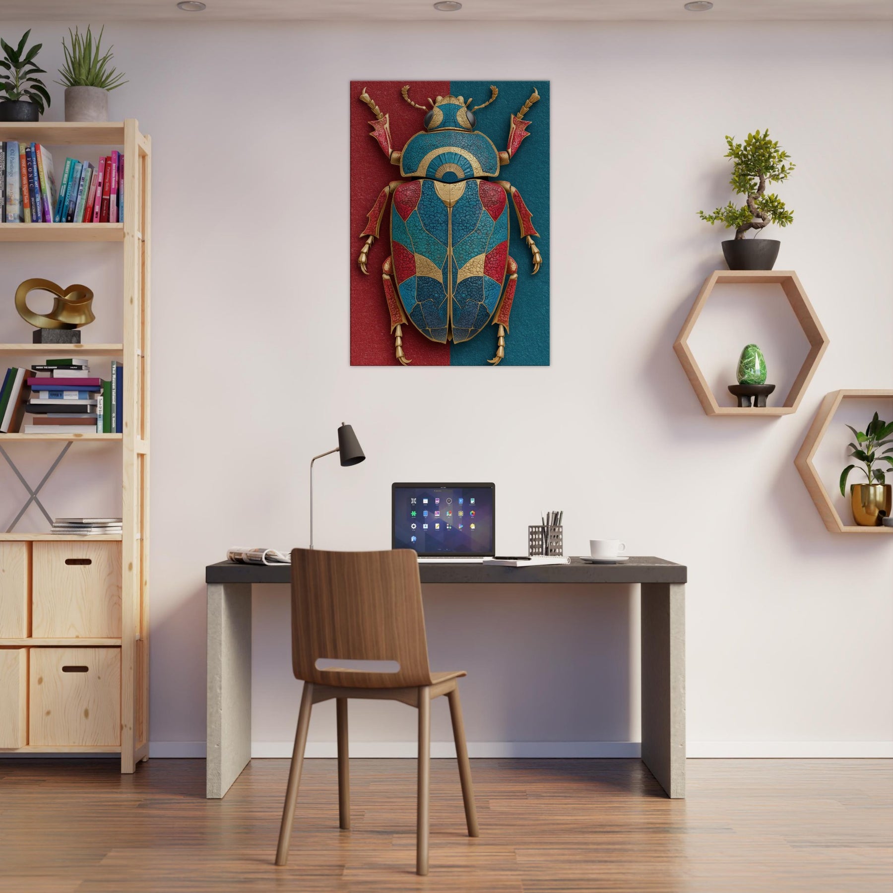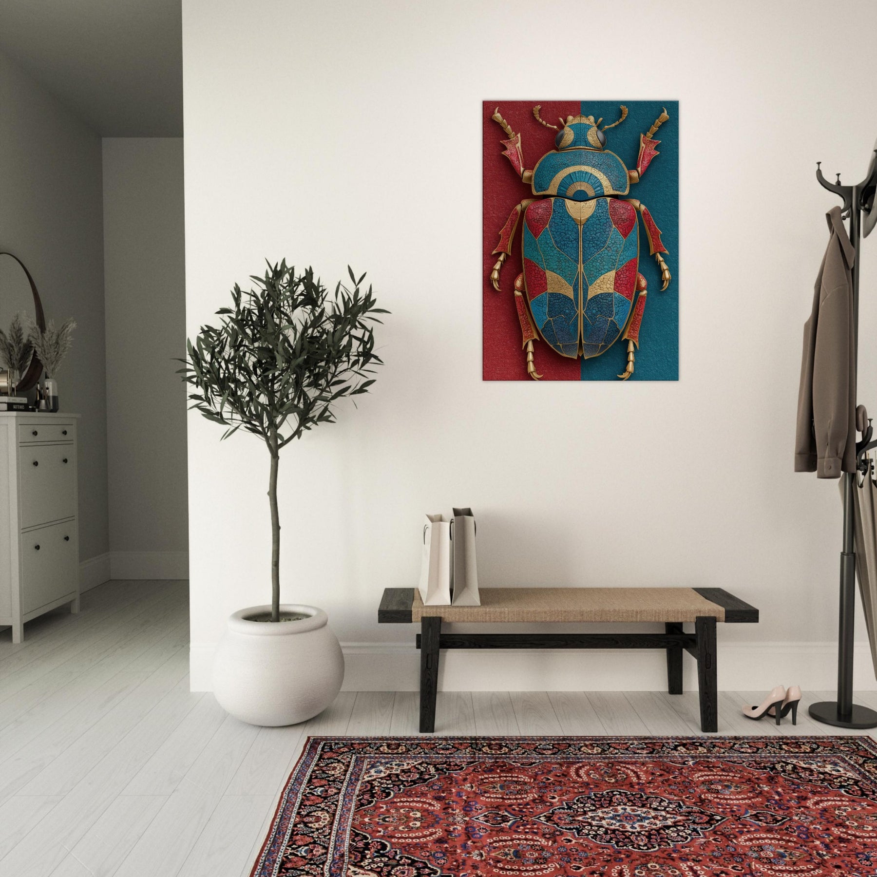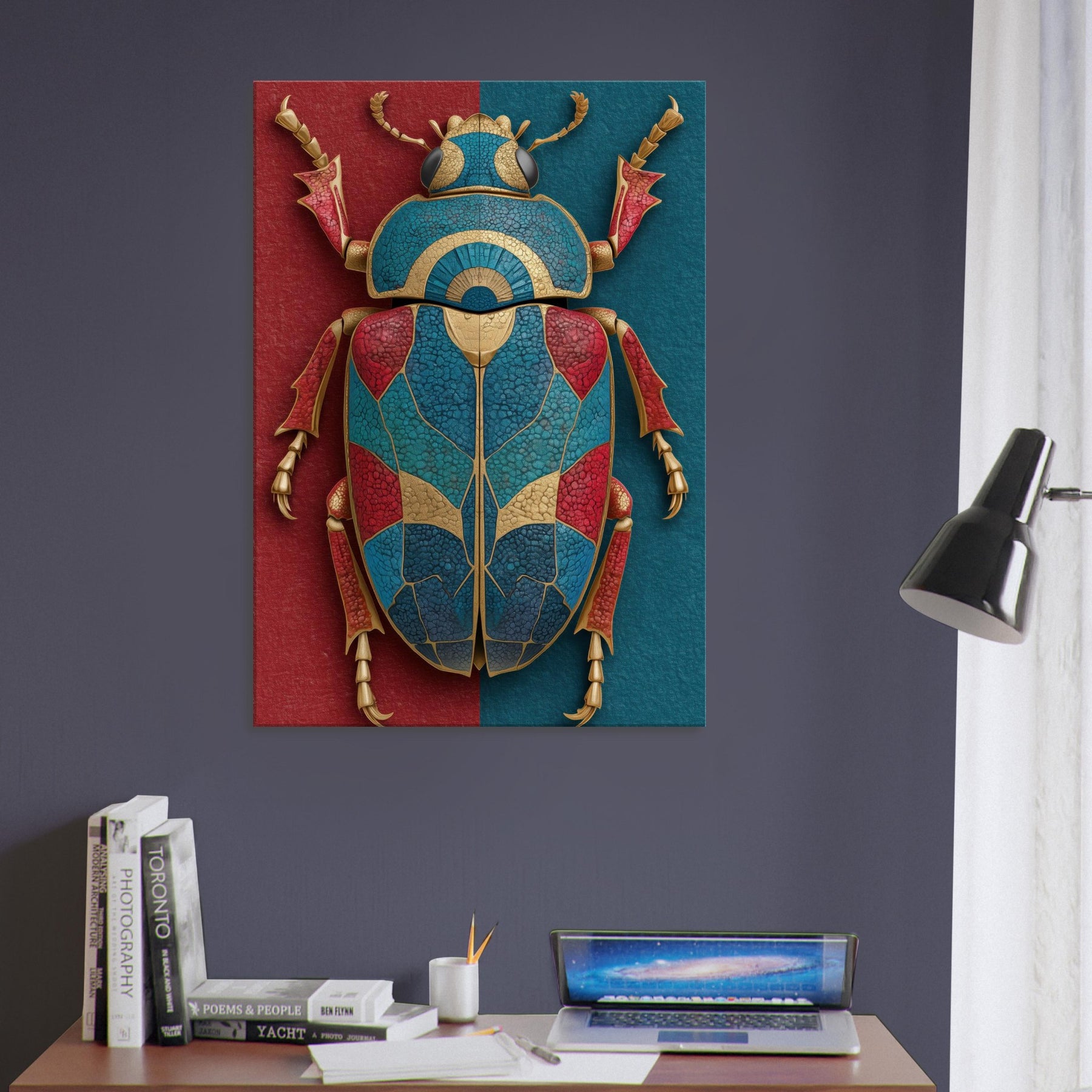Feel the pulse of a mystic horizon as the scarab unravels in mosaic radiance. This abstract vision unfolds in aqua blues, ruby reds, and gleaming gold, like a carved talisman waking on a sun warmed wall. The creature's armored silhouette hums with ancient memory, inviting calm focus and wonder into daily life. Paired with the room, it casts a shimmering gradient that shifts with light, turning a simple corner into a sanctuary of texture, color, and subtle mystique. A wearable moment of art for your living space.