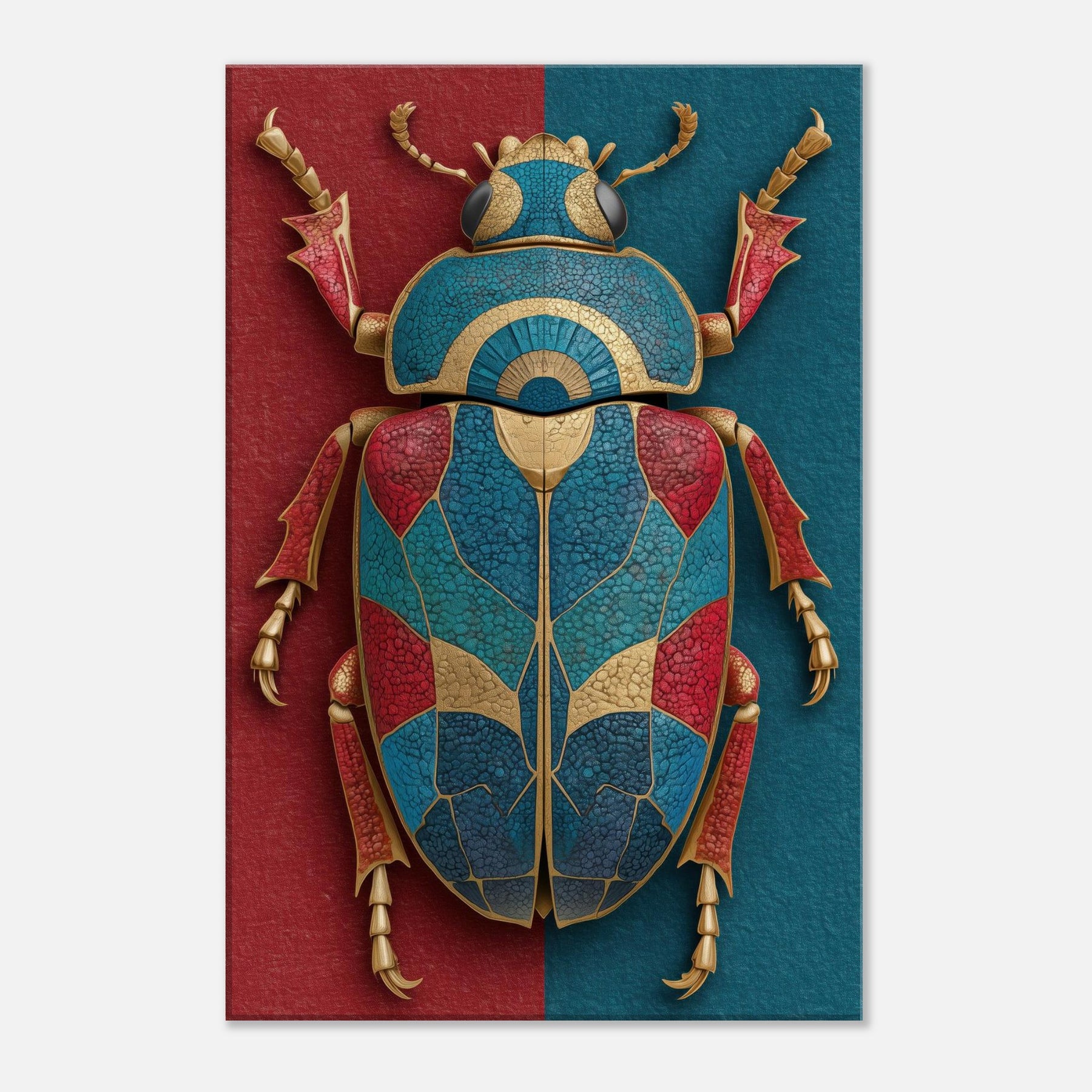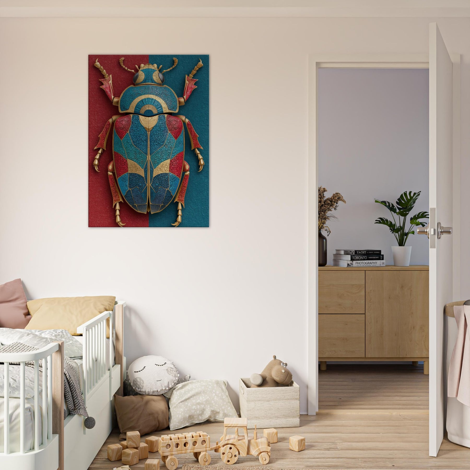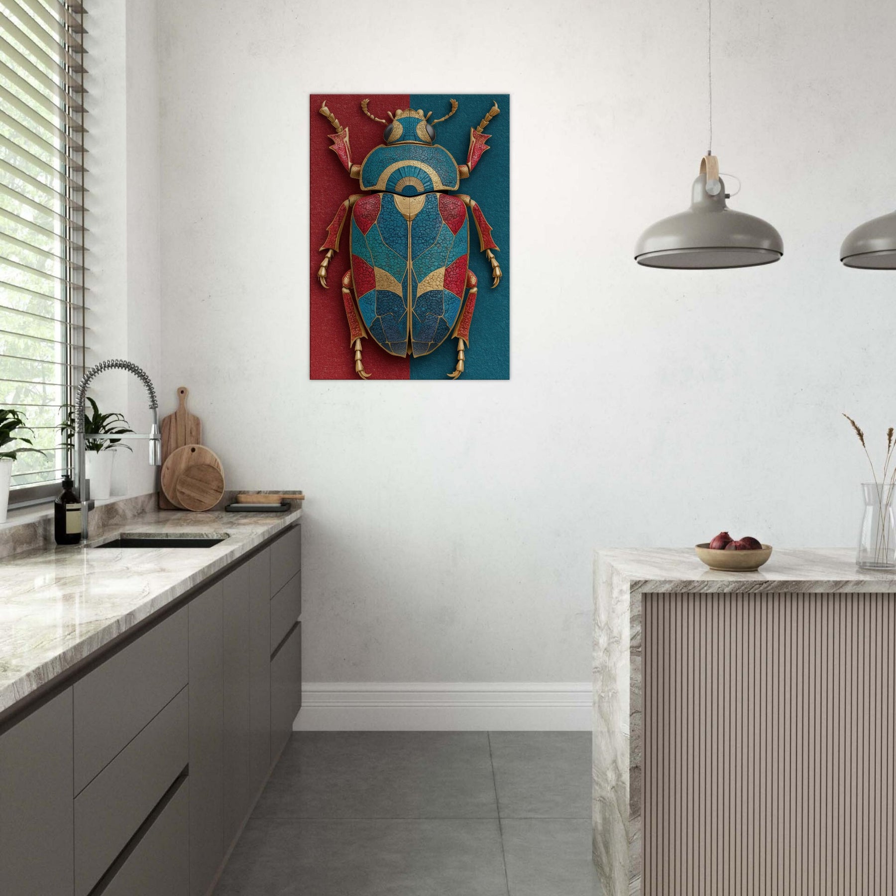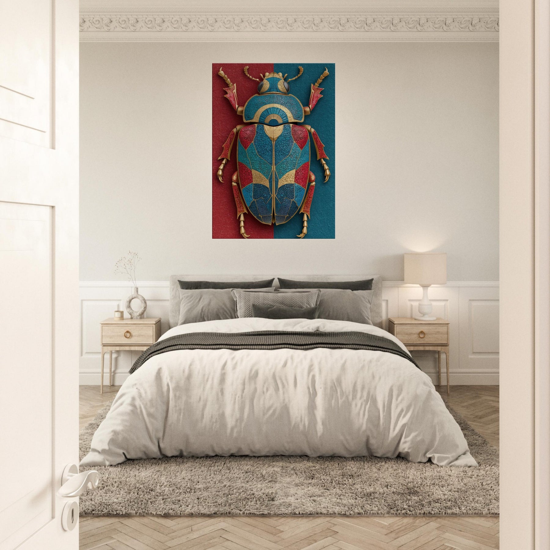 Feel the pulse of a mystic horizon as the scarab unravels in mosaic radiance. This abstract vision unfolds in aqua blues, ruby reds, and gleaming gold, like a carved talisman waking on a sun warmed wall. The creature's armored silhouette hums with ancient memory, inviting calm focus and wonder into daily life. Paired with the room, it casts a shimmering gradient that shifts with light, turning a simple corner into a sanctuary of texture, color, and subtle mystique. A wearable moment of art for your living space.