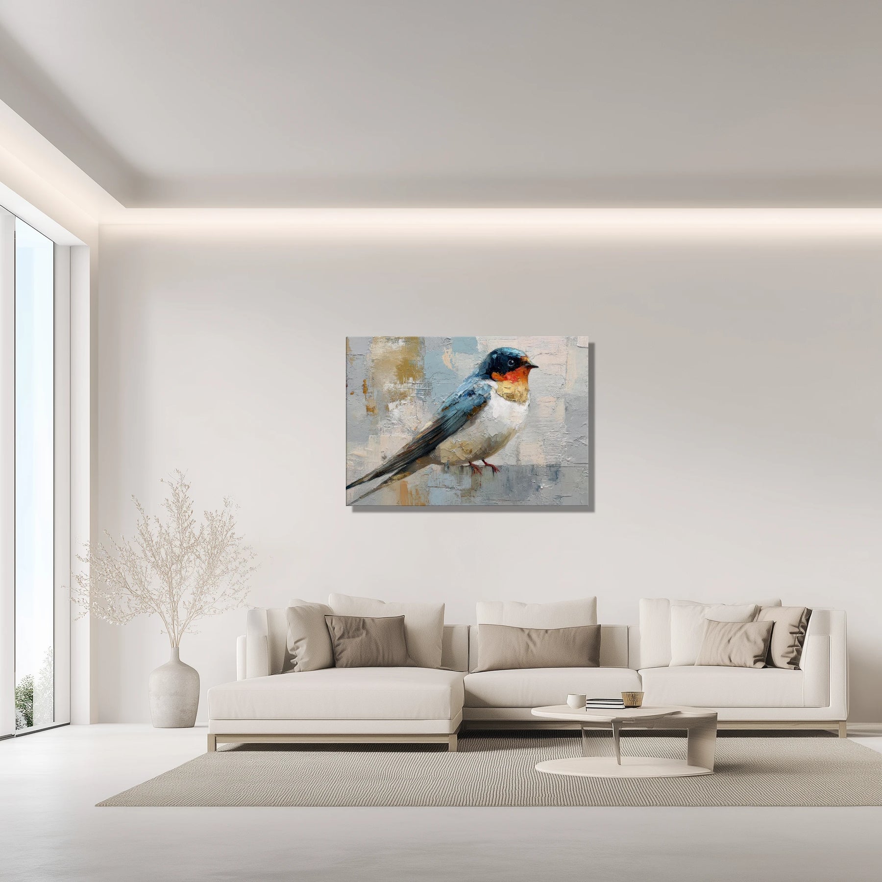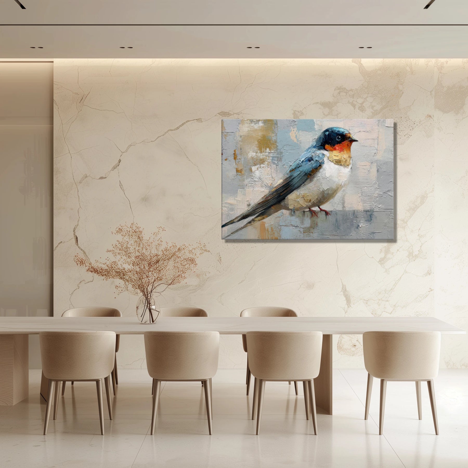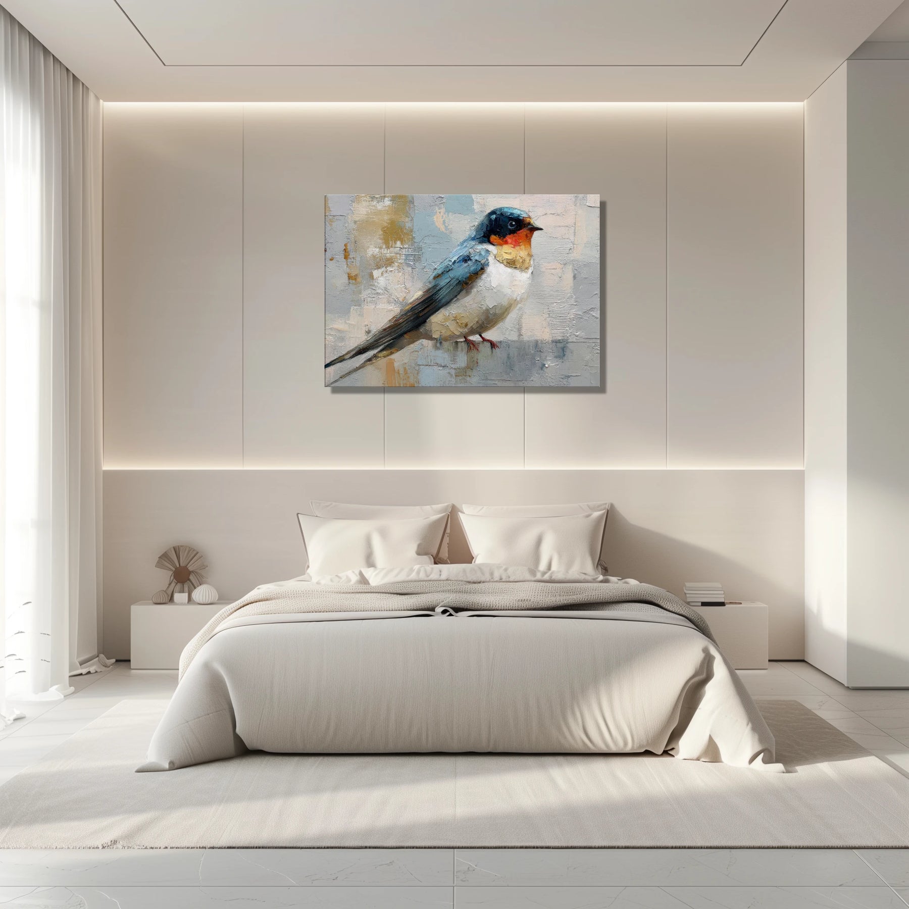 This contemporary swallow brings a quiet, airy calm to your space, like opening a window to soft morning light. Its poised presence invites you to pause, breathe, and feel a little more grounded at the start or end of your day.