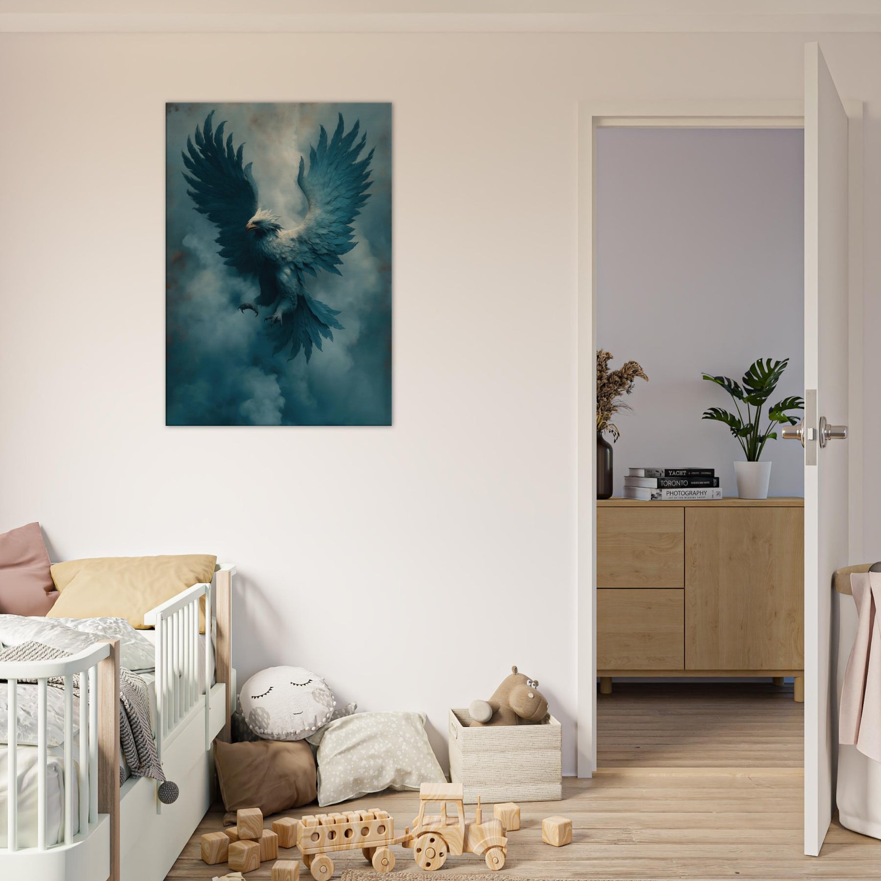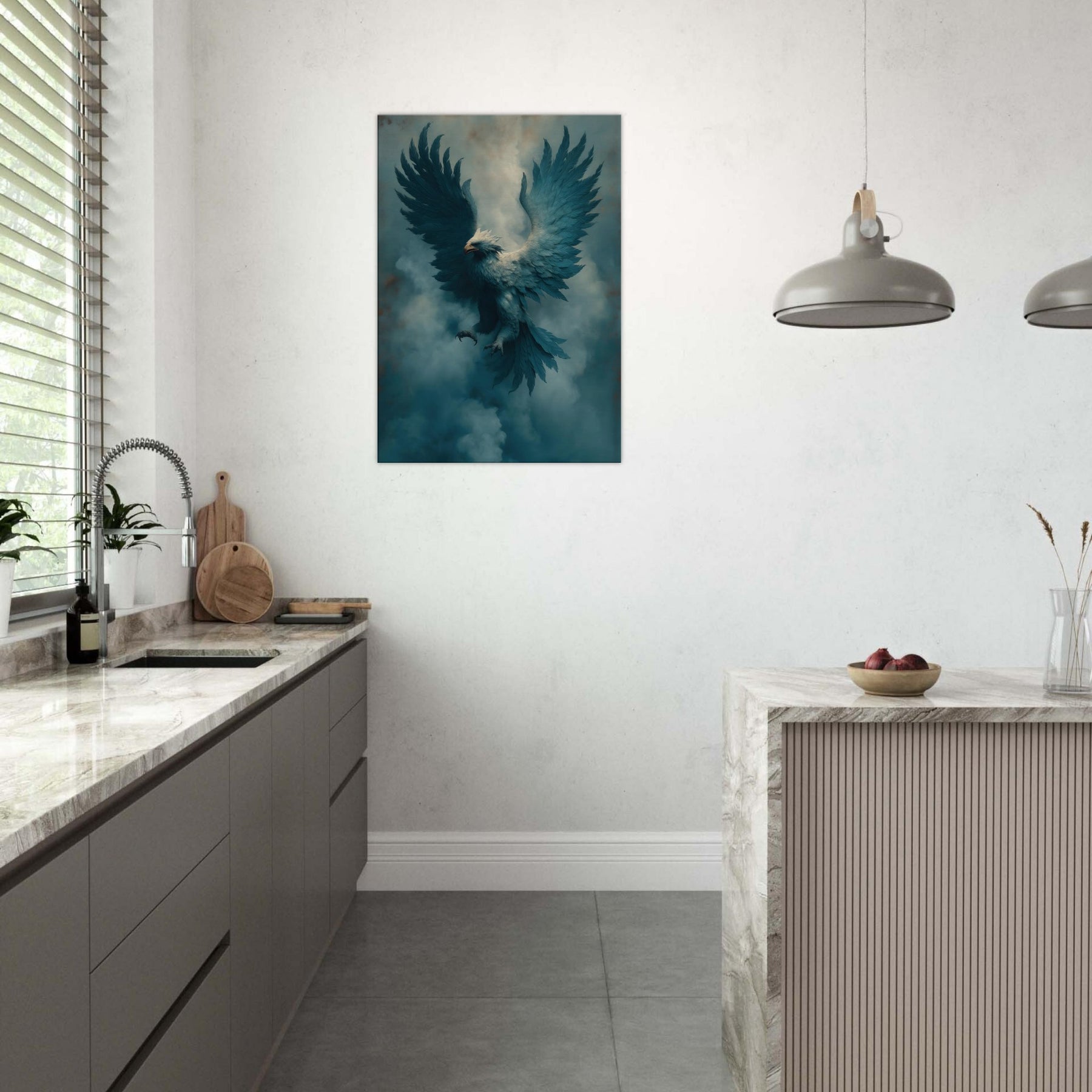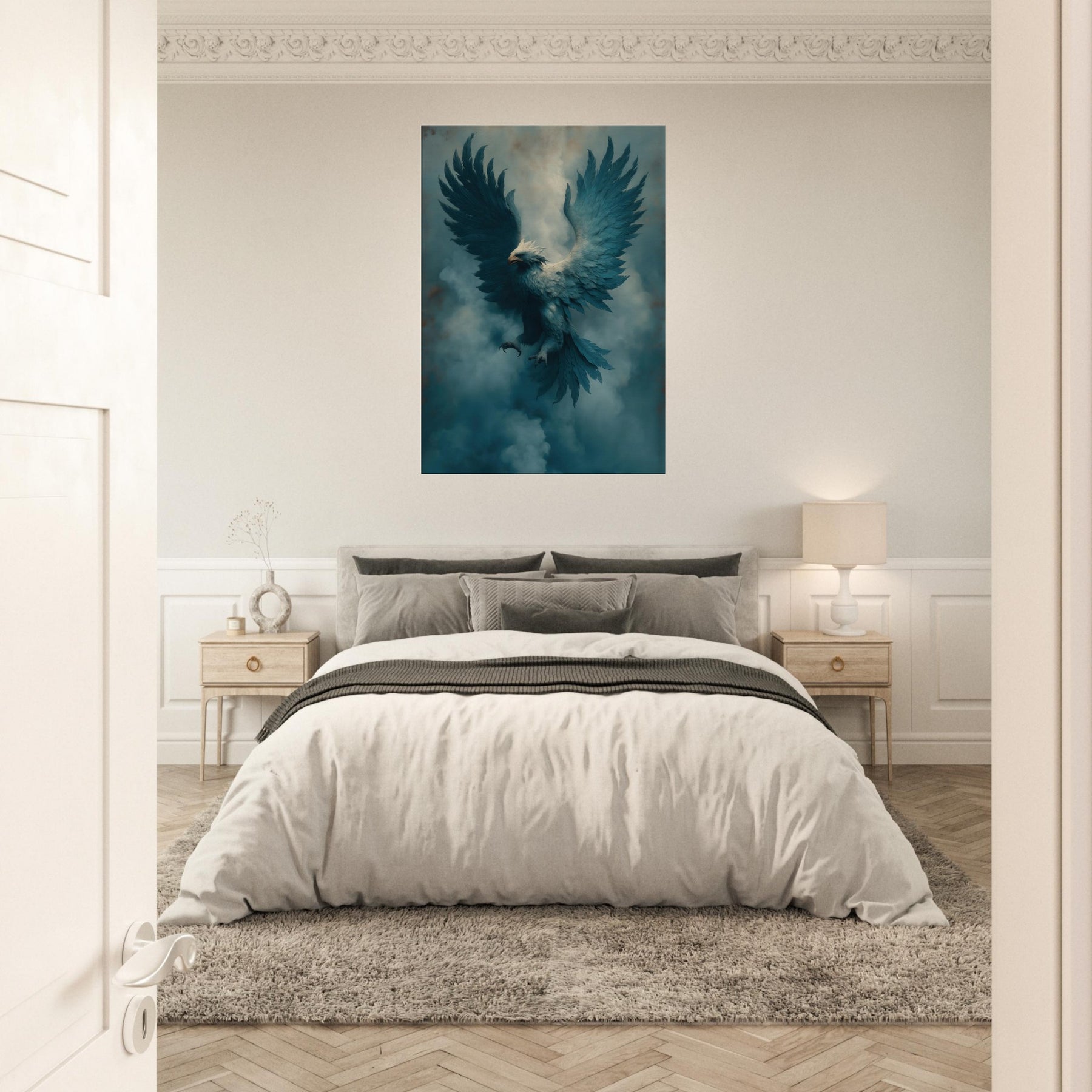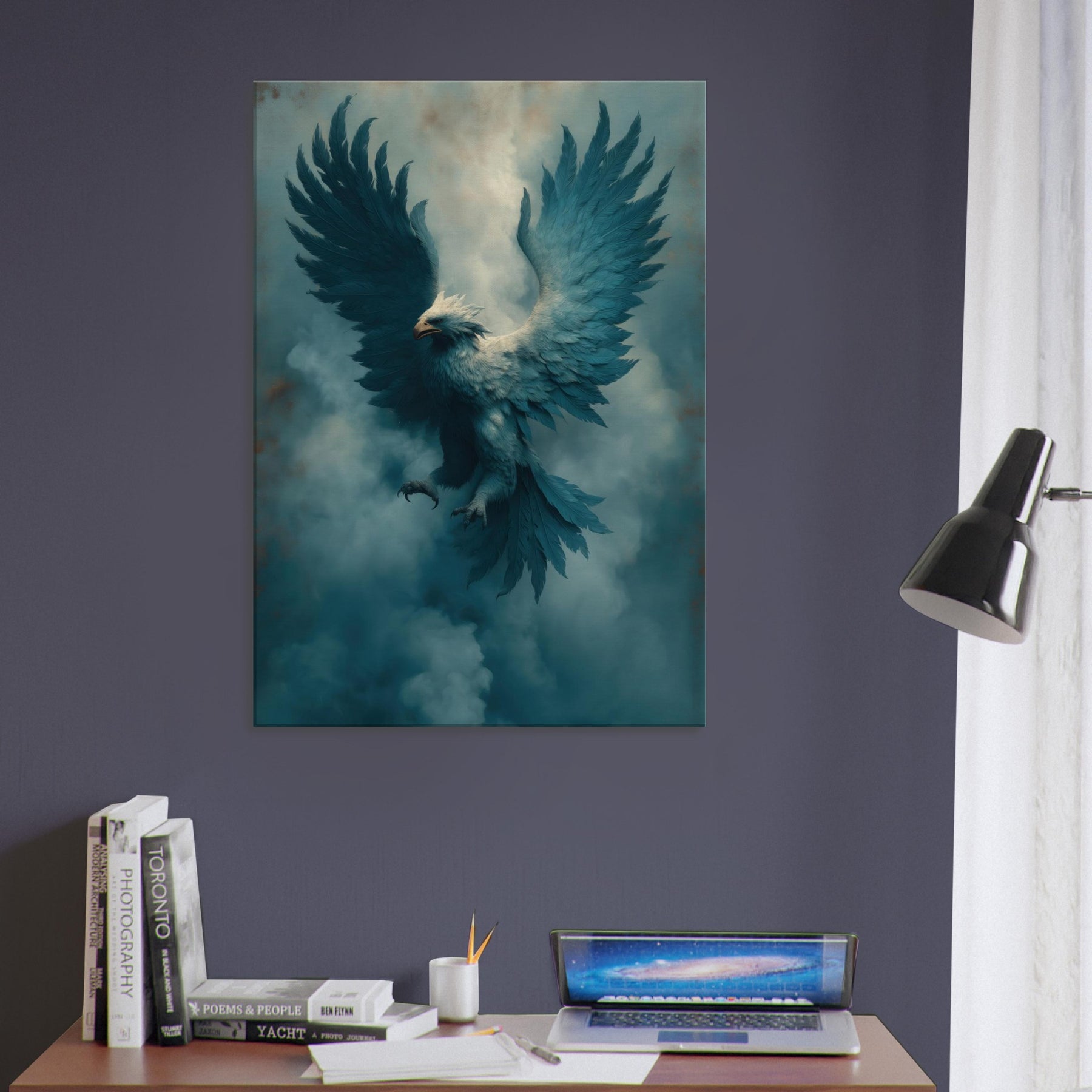 Take a breath of heavenly mists as the Noble Griffin lifts above a cobalt dawn. This surreal portrayal blends myth and atmosphere a creature of aristocratic grace suspended in velvet air. The feathers ripple with lucid blues, the gaze tempered by ancient wisdom, and the wings carry a silent music through your living room. Hang it where light drifts, and let the dreamlike presence soften corners, spark conversation, and invite a nocturnal hush of wonder into daily life.