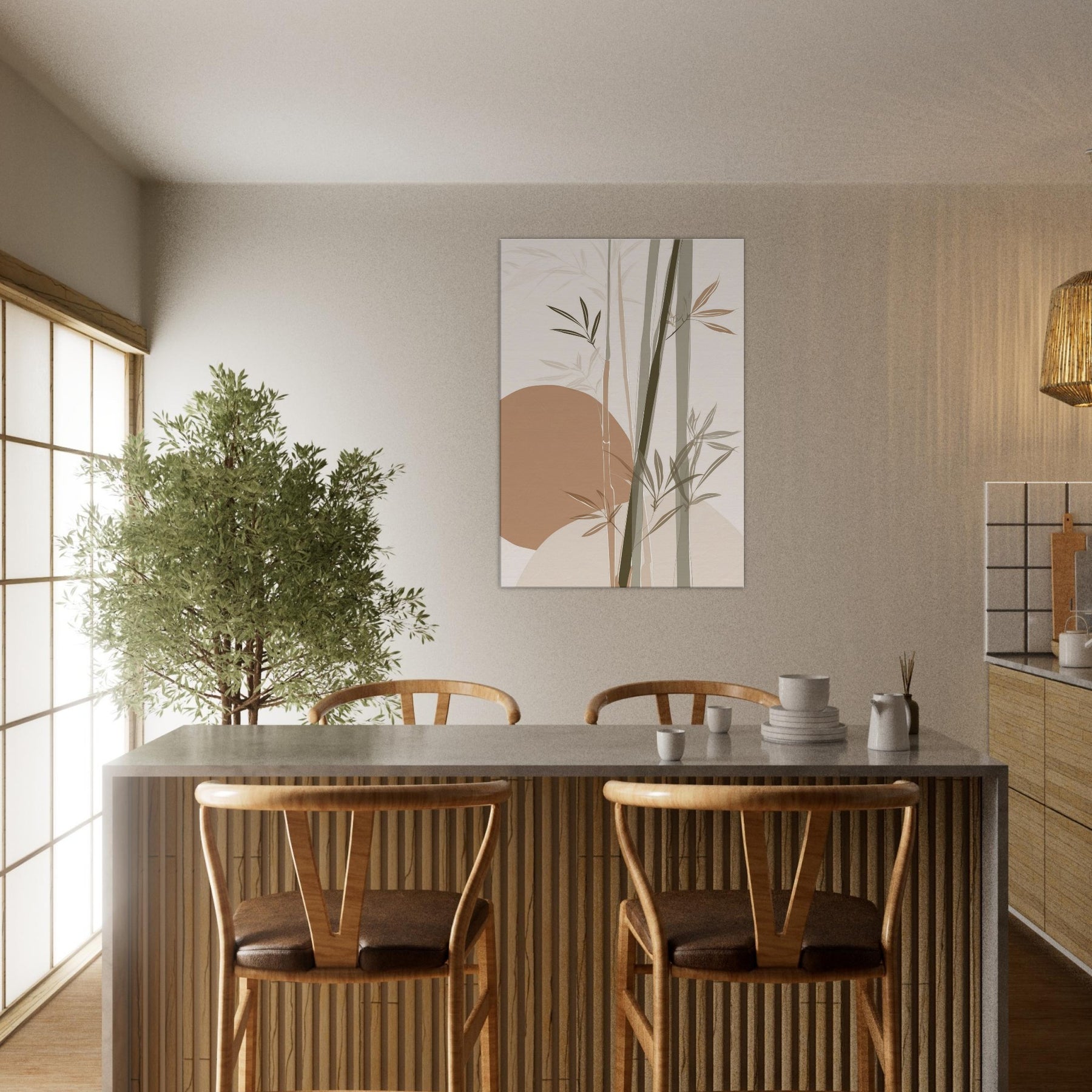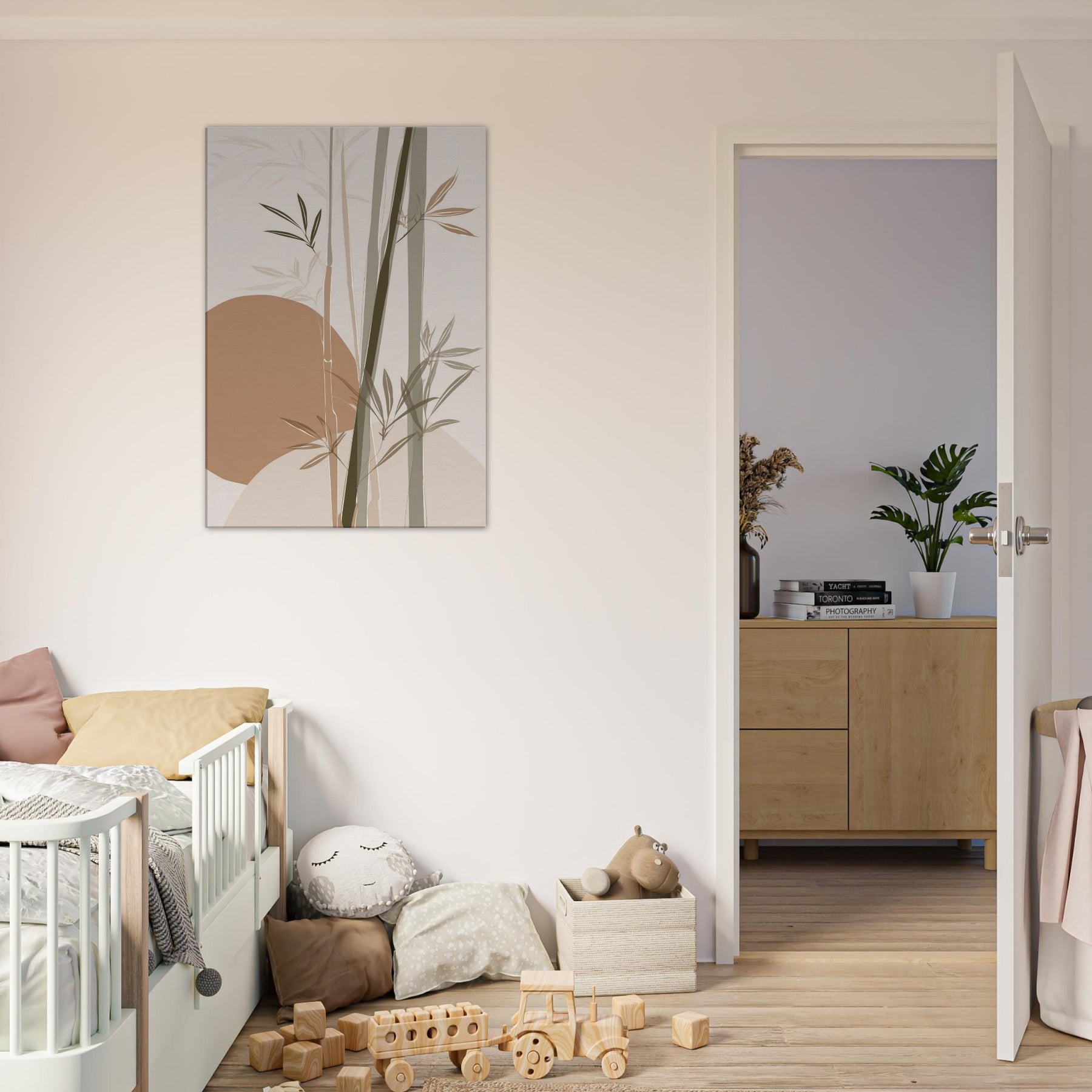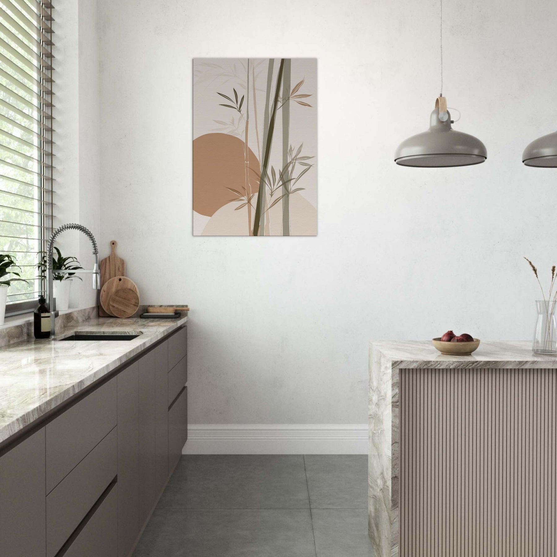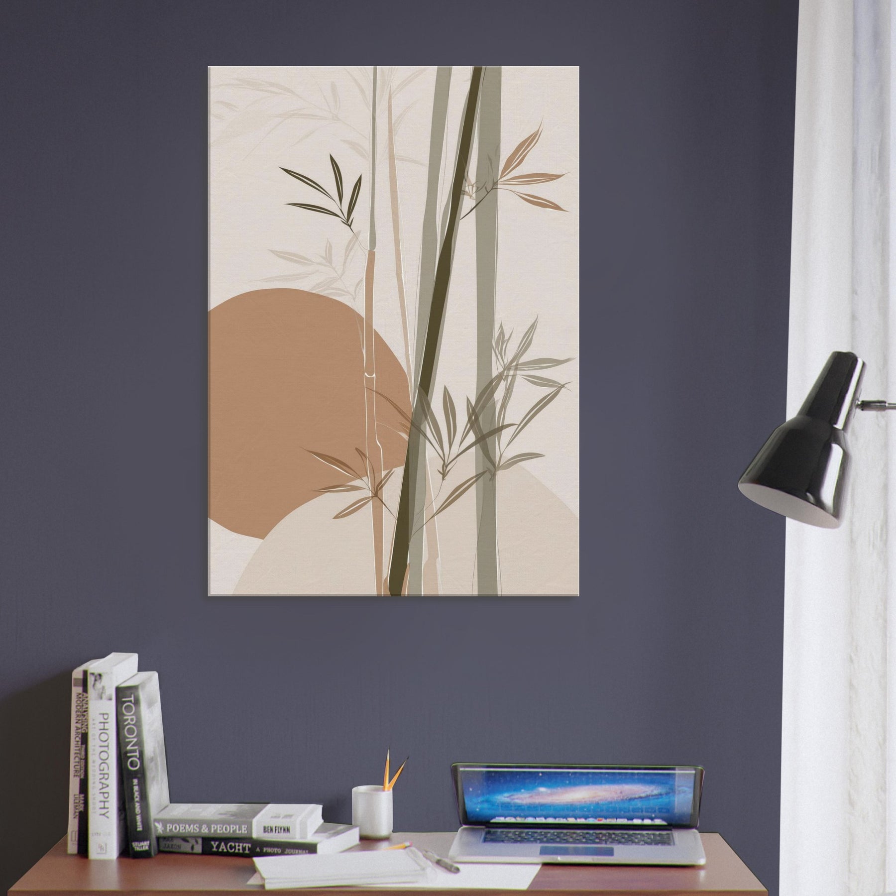 Immerse your space in the quiet resilience of Bamboo Stalks rendered in a spare, meditative palette. This minimalist composition invites the eye to travel along slender trunks and delicate leaves, like a breath you can hang on the wall. The warm taupe circle and soft beige field suggest dawn light filtering through a quiet grove, heightening calm in a living room or study. A refined focal point that pairs nature's persistence with modern simplicity.